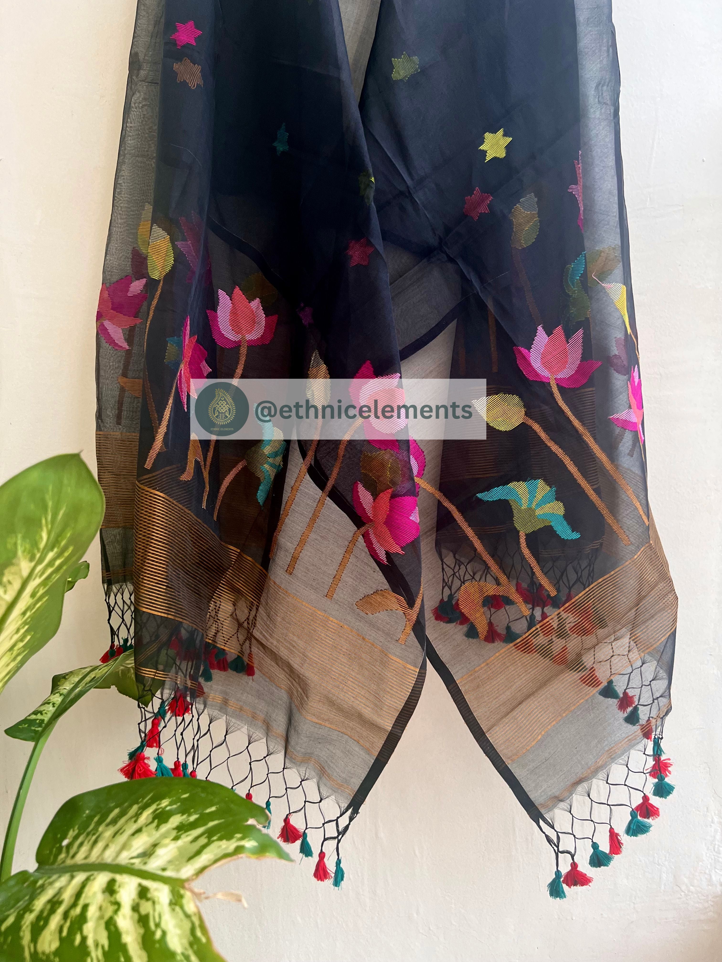 Original woven Jaal work muslin Jamdani kurta dupatta set. 3-Pcs unstitched Jamdani dress material with Pichwai themed Jaal work all over the body. Dupatta is adorned with tassels