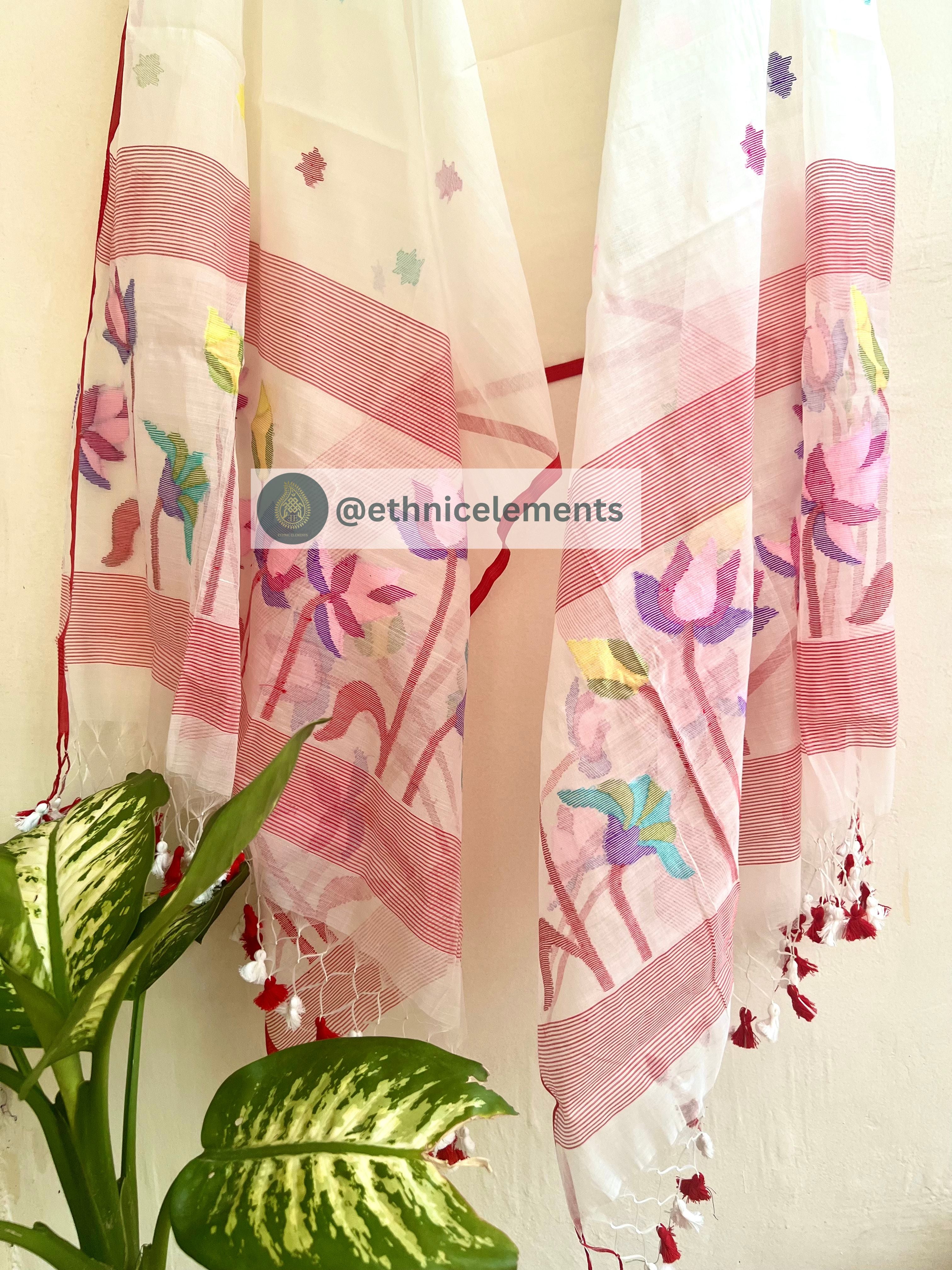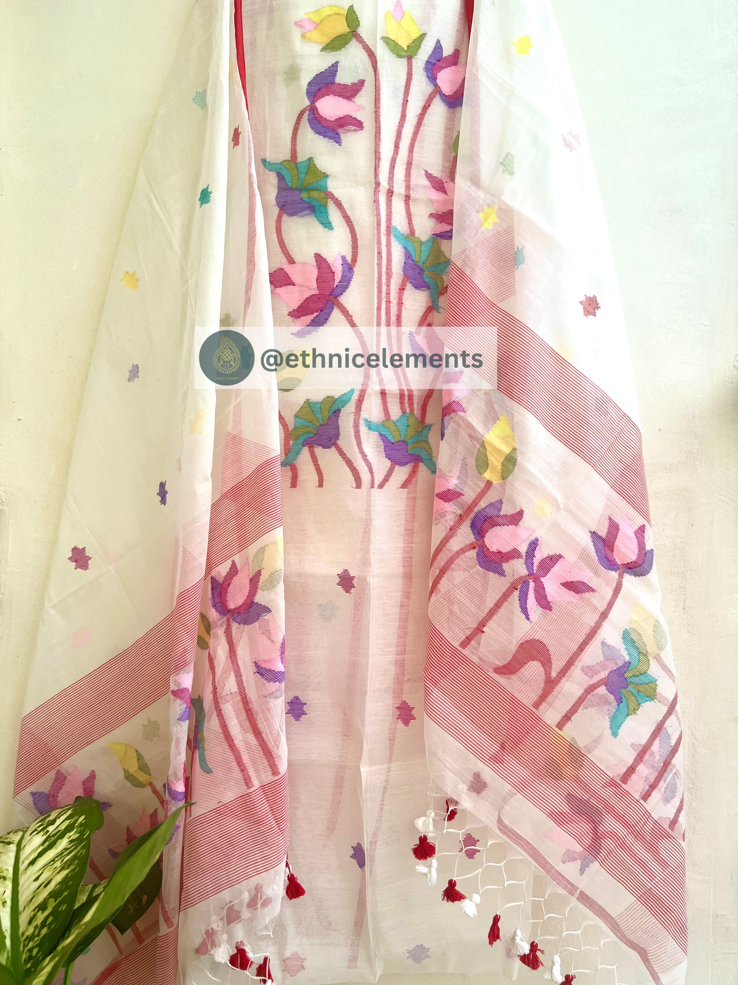 Original woven Jaal work muslin Jamdani kurta dupatta set. 3-Pcs unstitched Jamdani dress material with Pichwai themed Jaal work all over the body. Dupatta is adorned with tassels