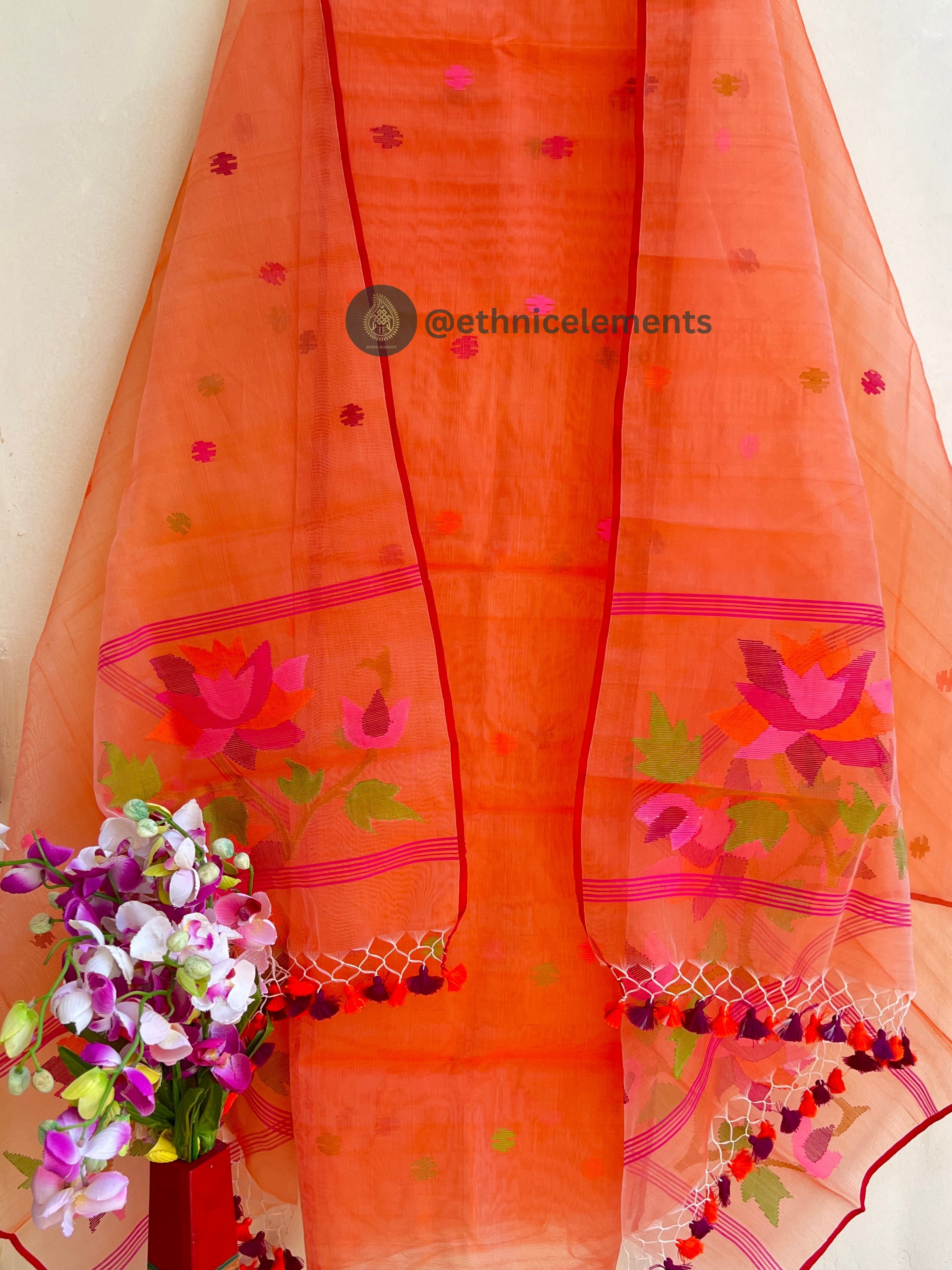 Resham Muslin Jamdani Suit Set- Candy Orange