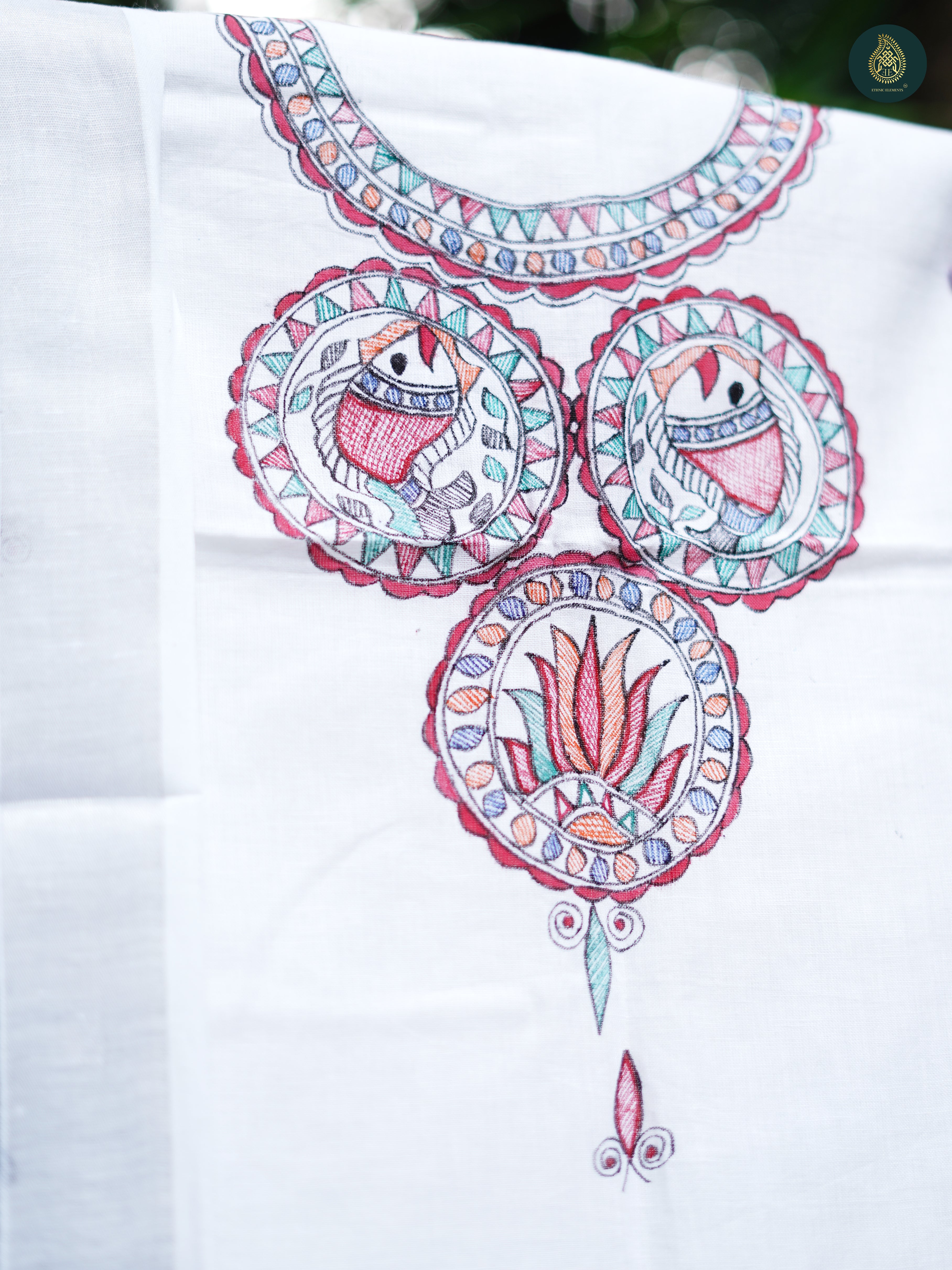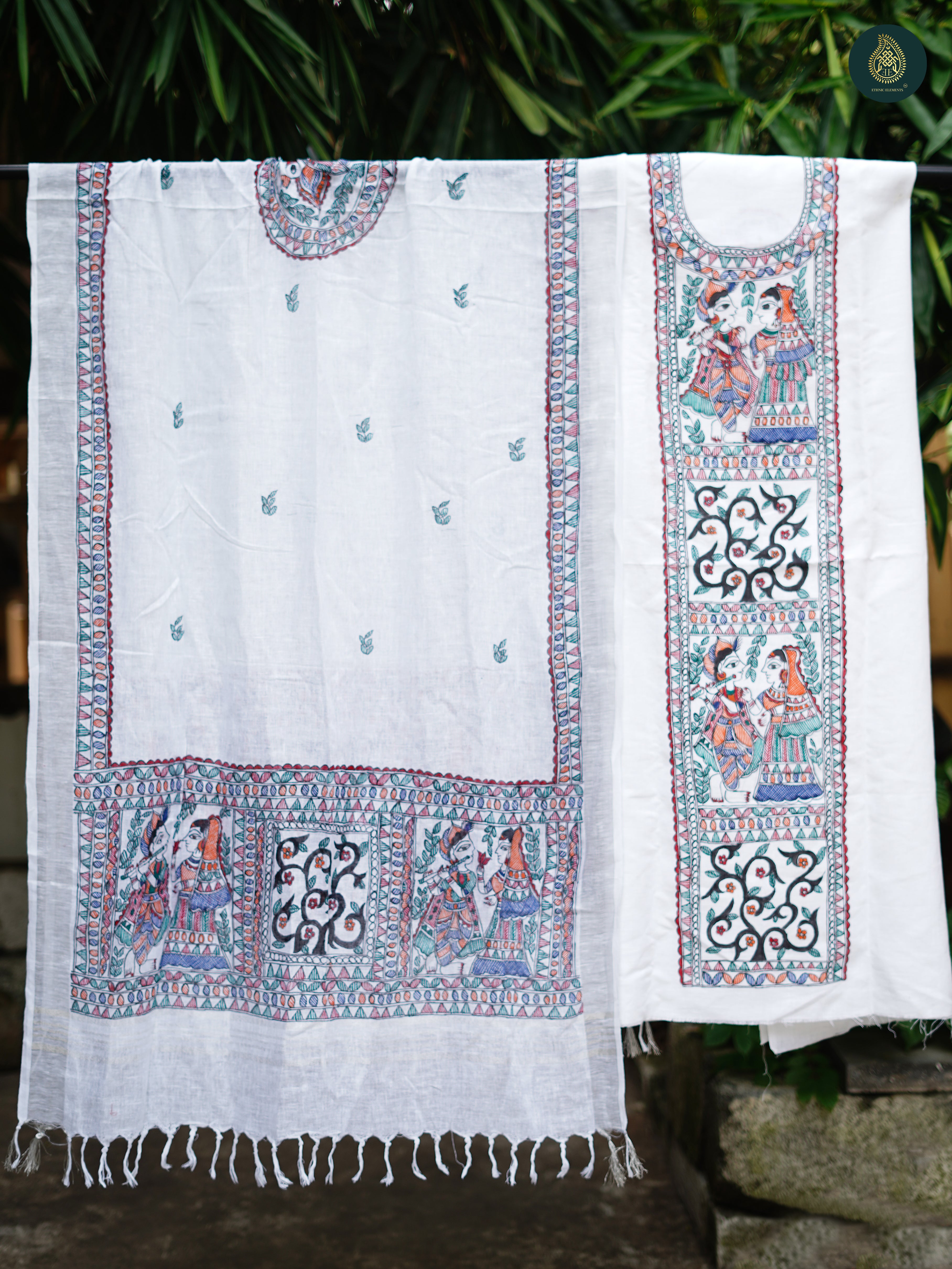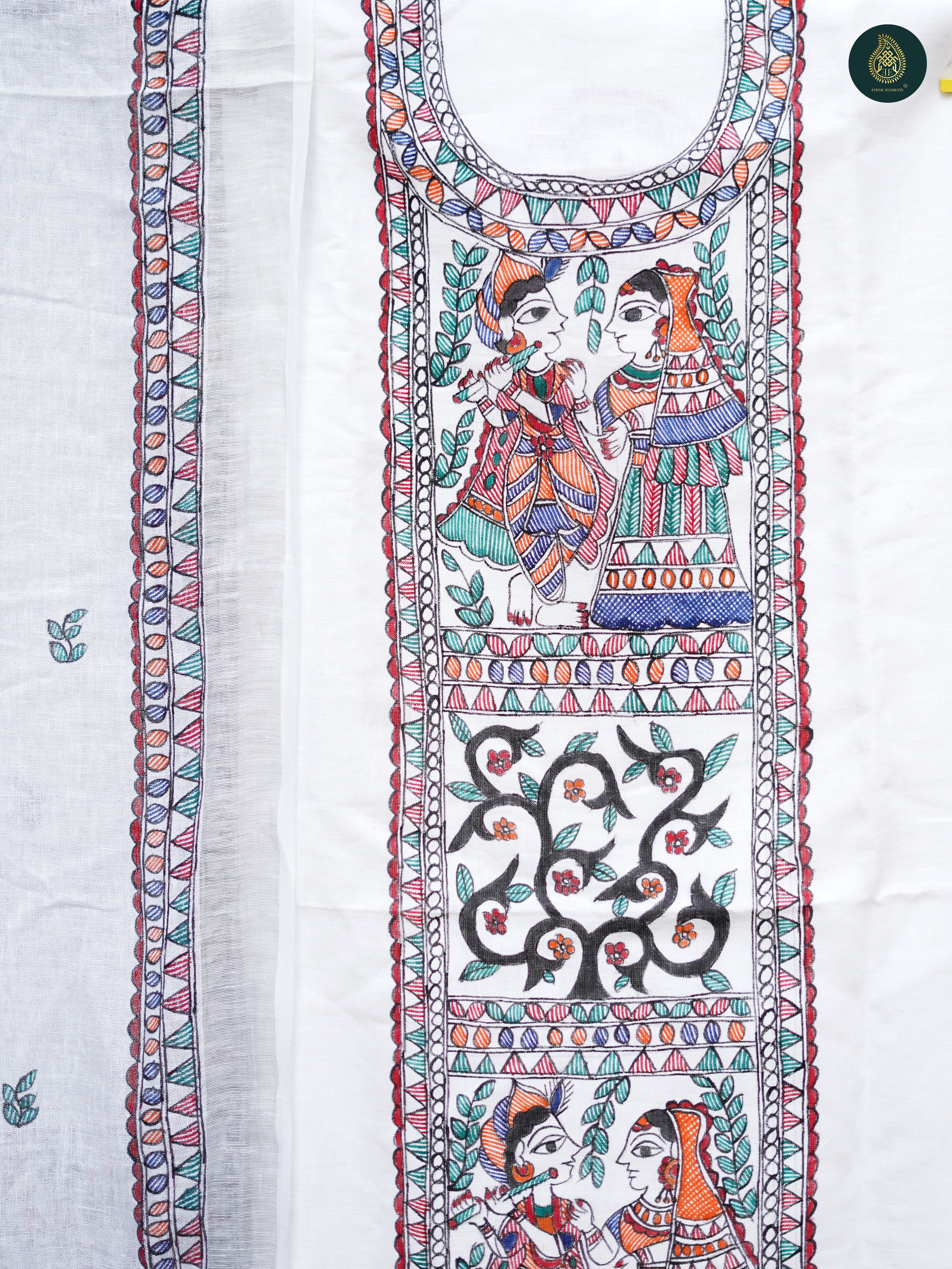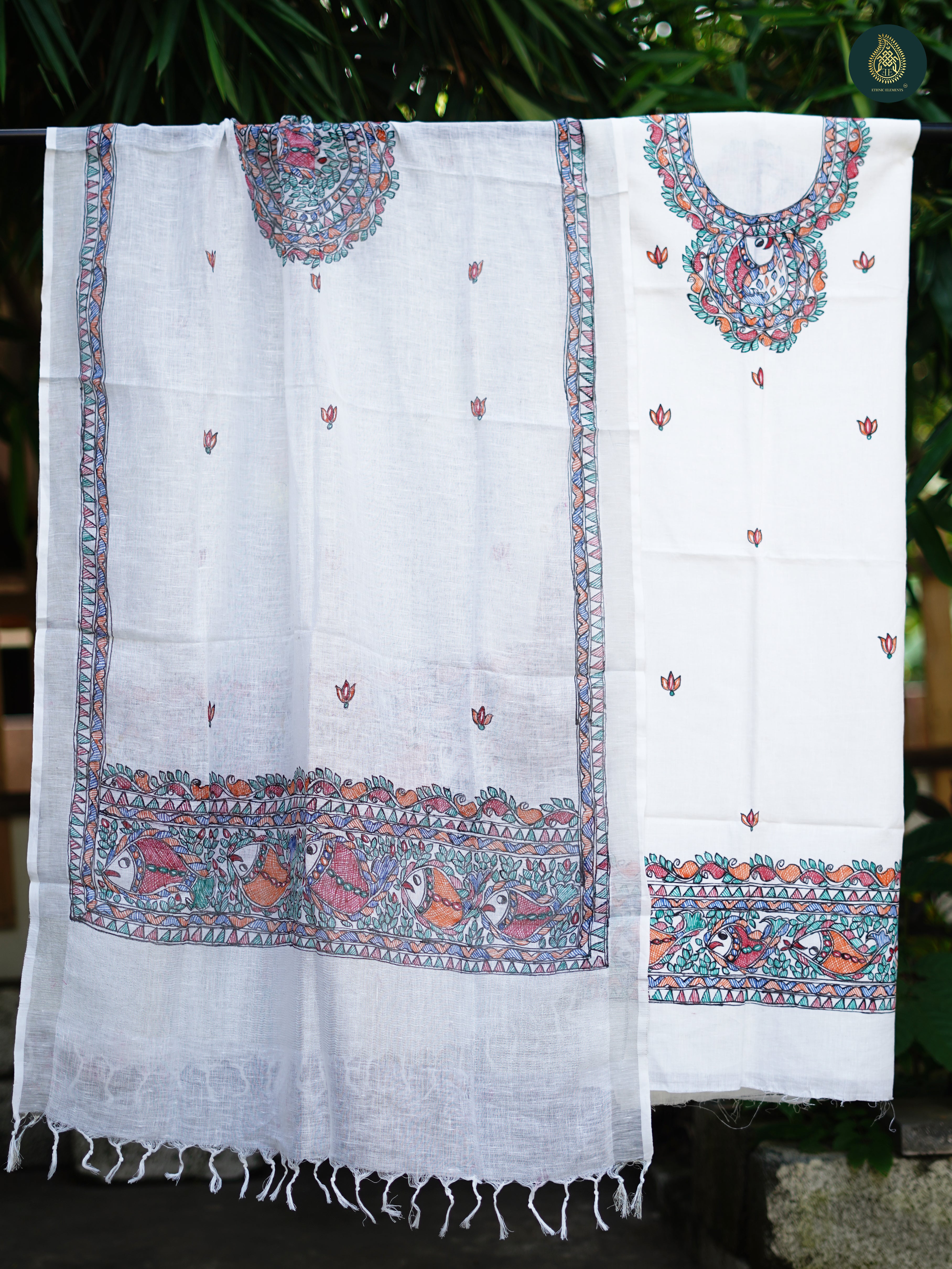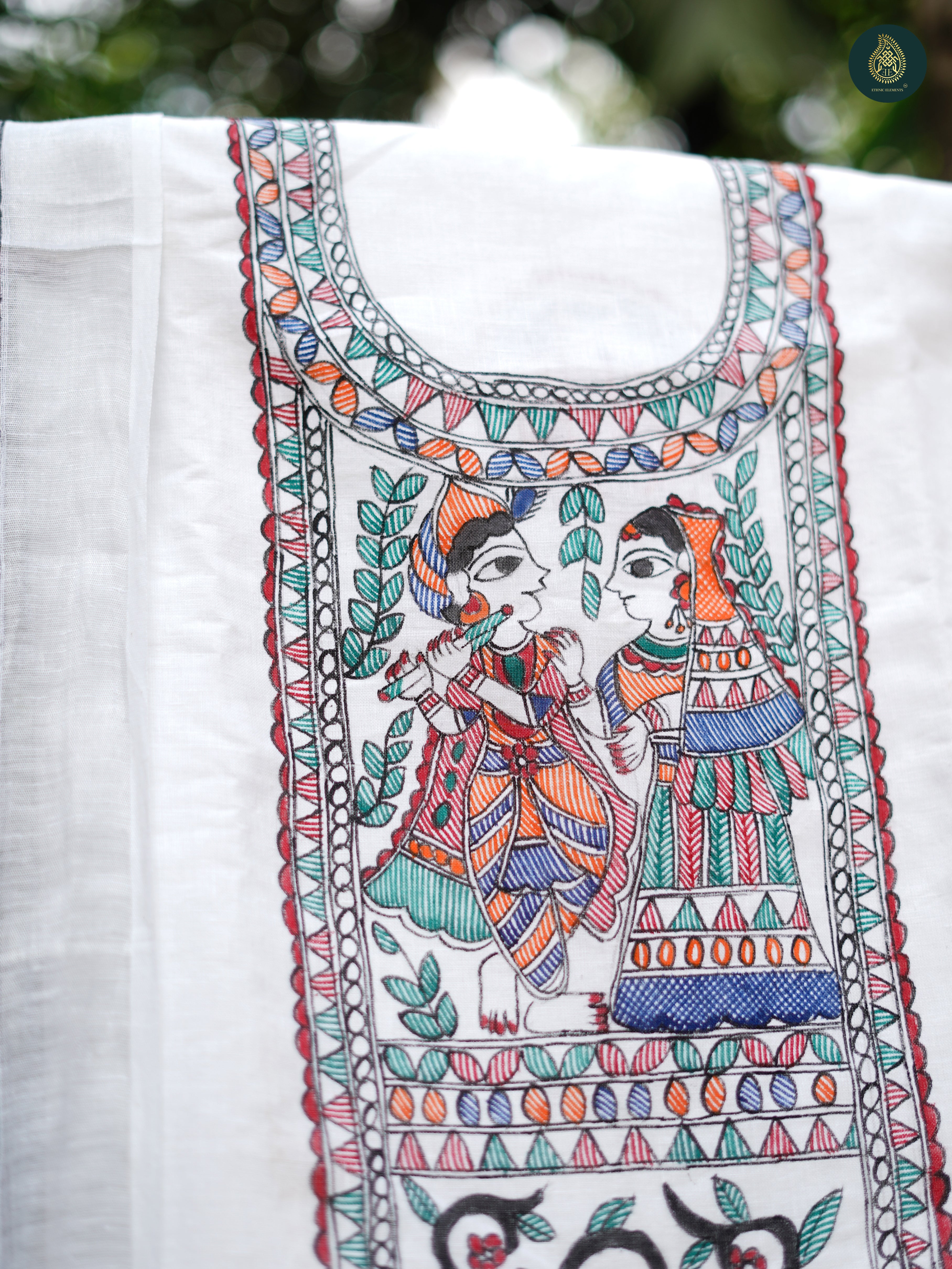 Authentic Original Hand-Painted Madhubani Suit Sets made from pure woven fabrics. Madhubani Art is a type of folk-art form. Each suit consists of line drawings filled with bright colors and contrasts or patterns. Only natural dyes and pigments are used for fabric color and painting.