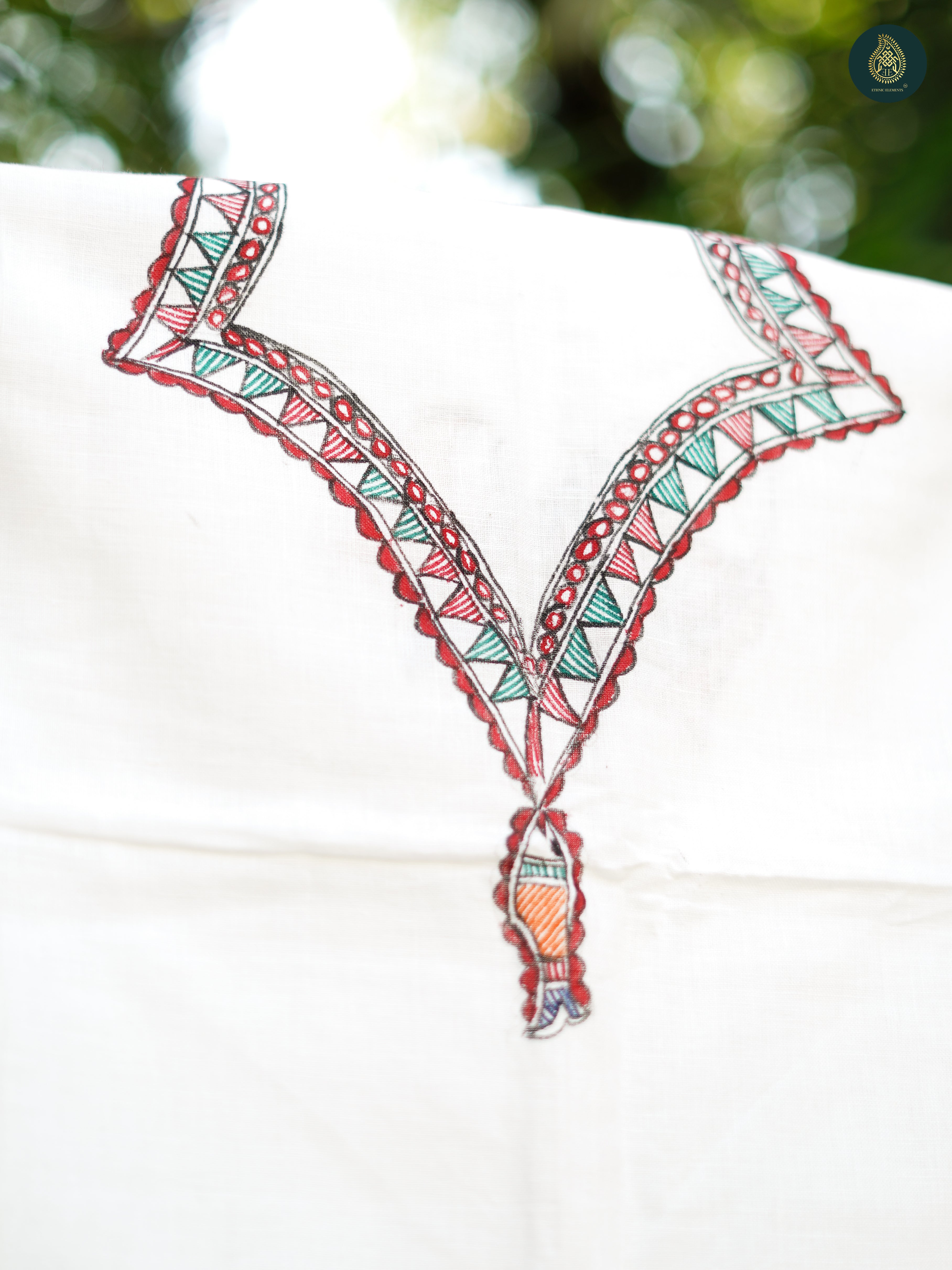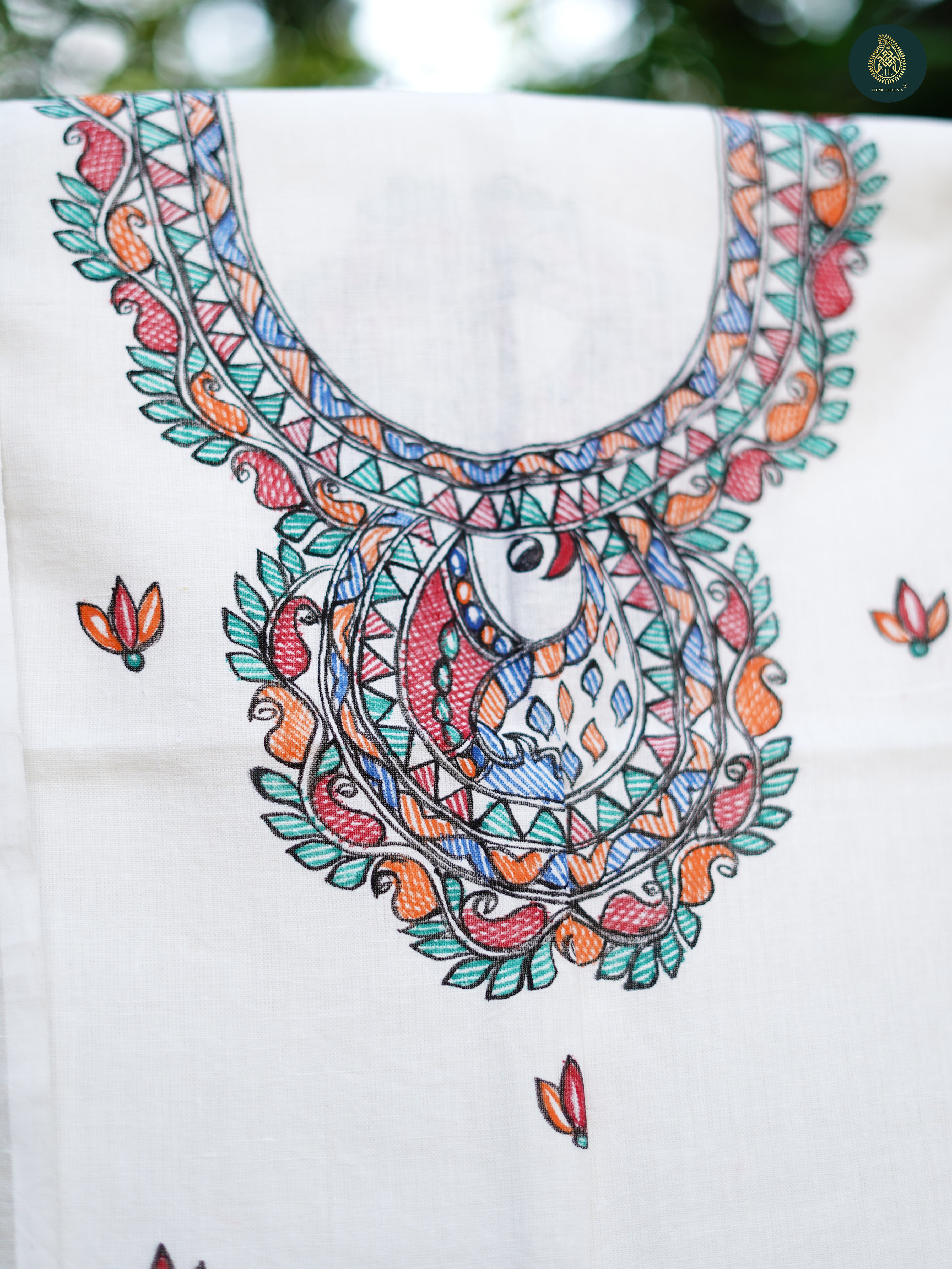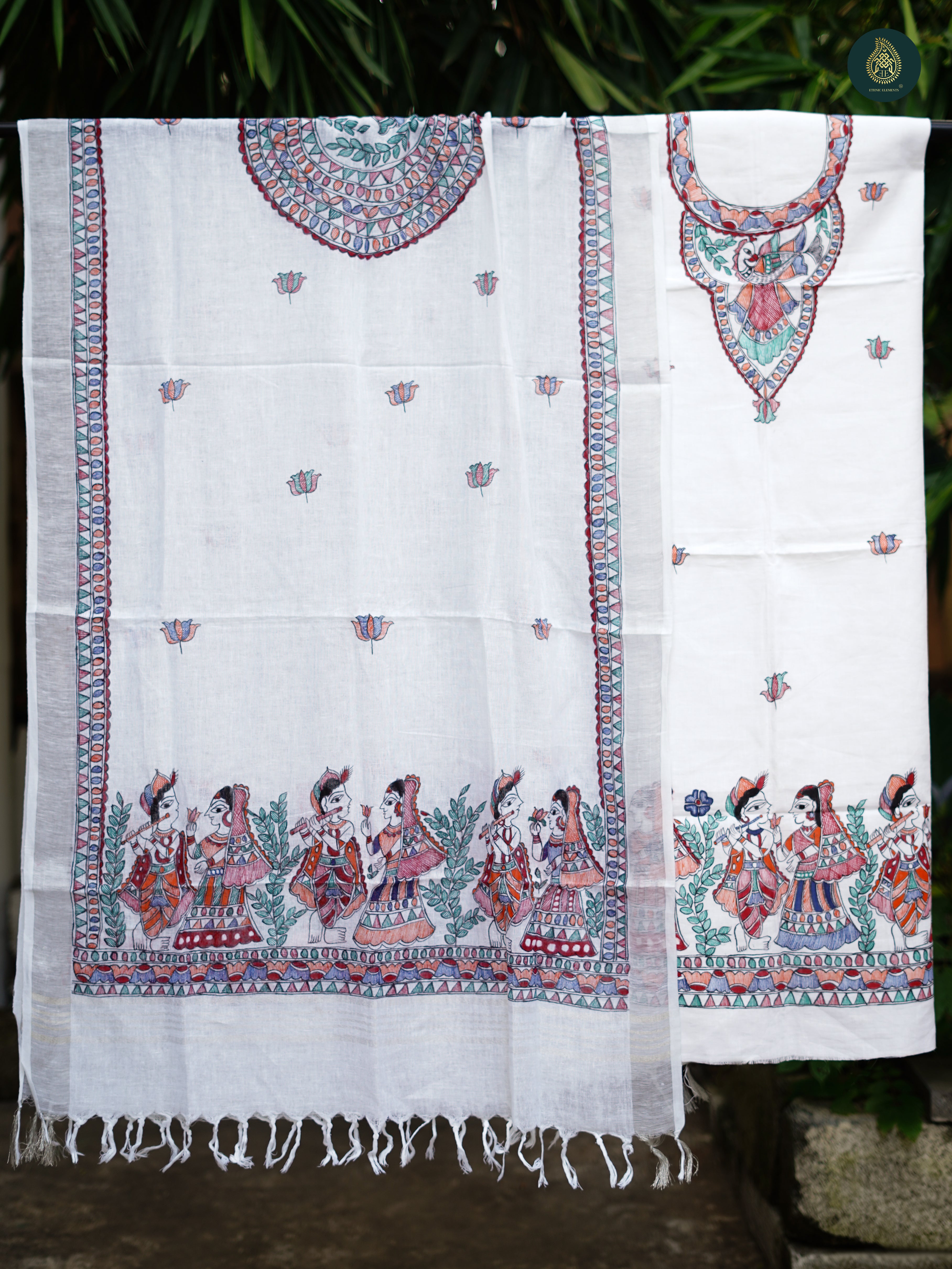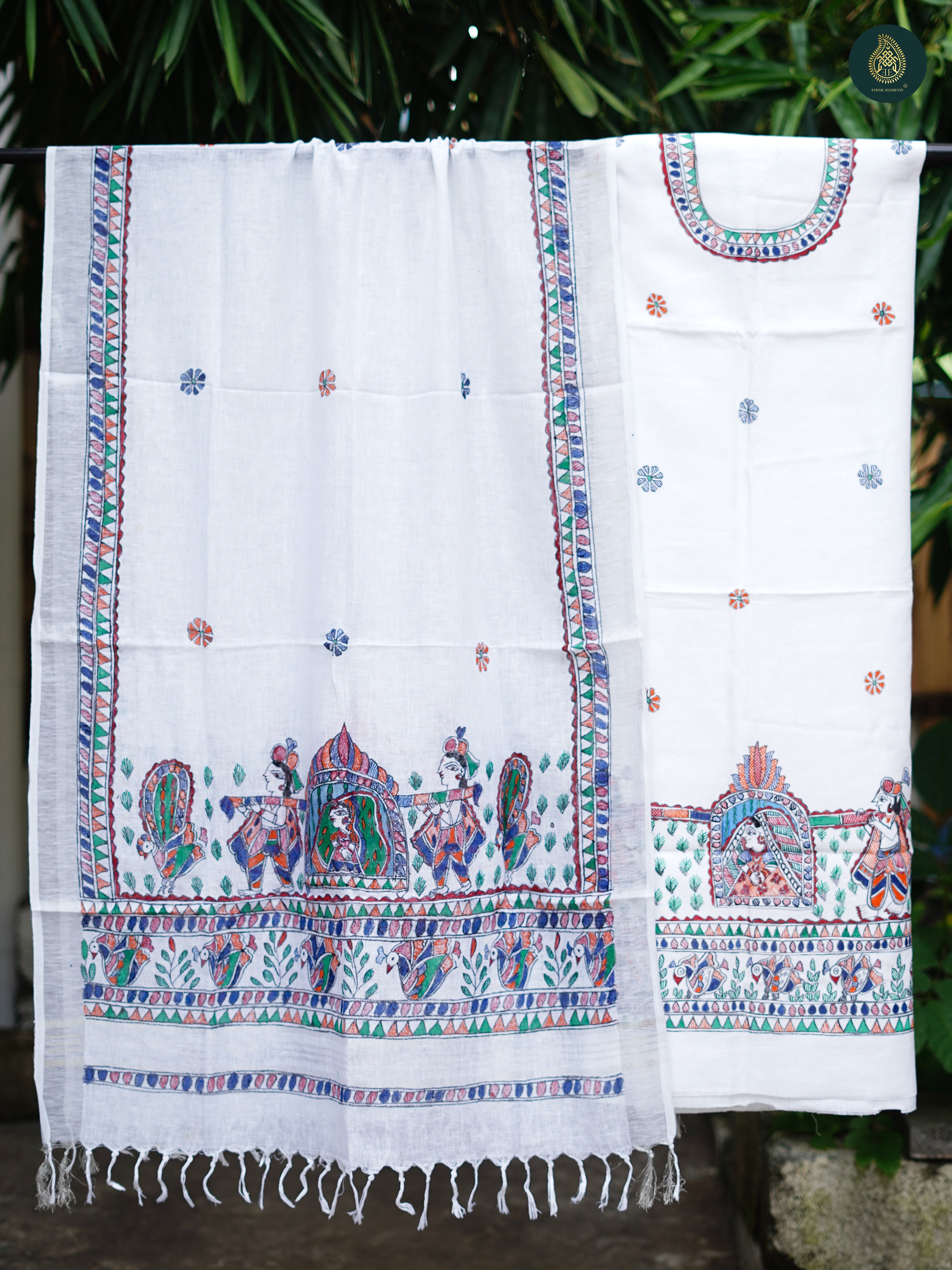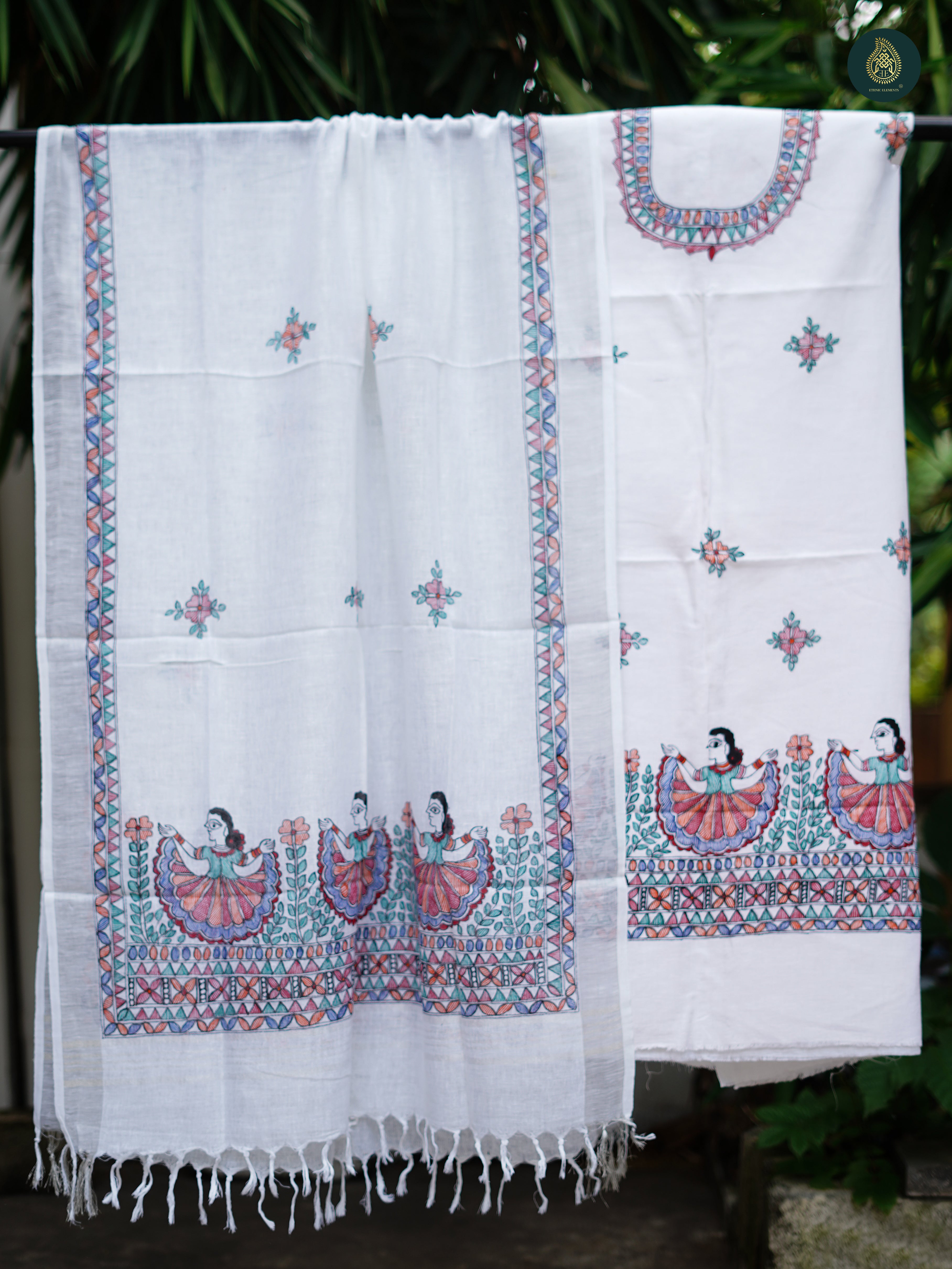 Authentic Original Hand-Painted Madhubani Suit Sets made from pure woven fabrics. Madhubani Art is a type of folk-art form. Each suit consists of line drawings filled with bright colors and contrasts or patterns. Only natural dyes and pigments are used for fabric color and painting.