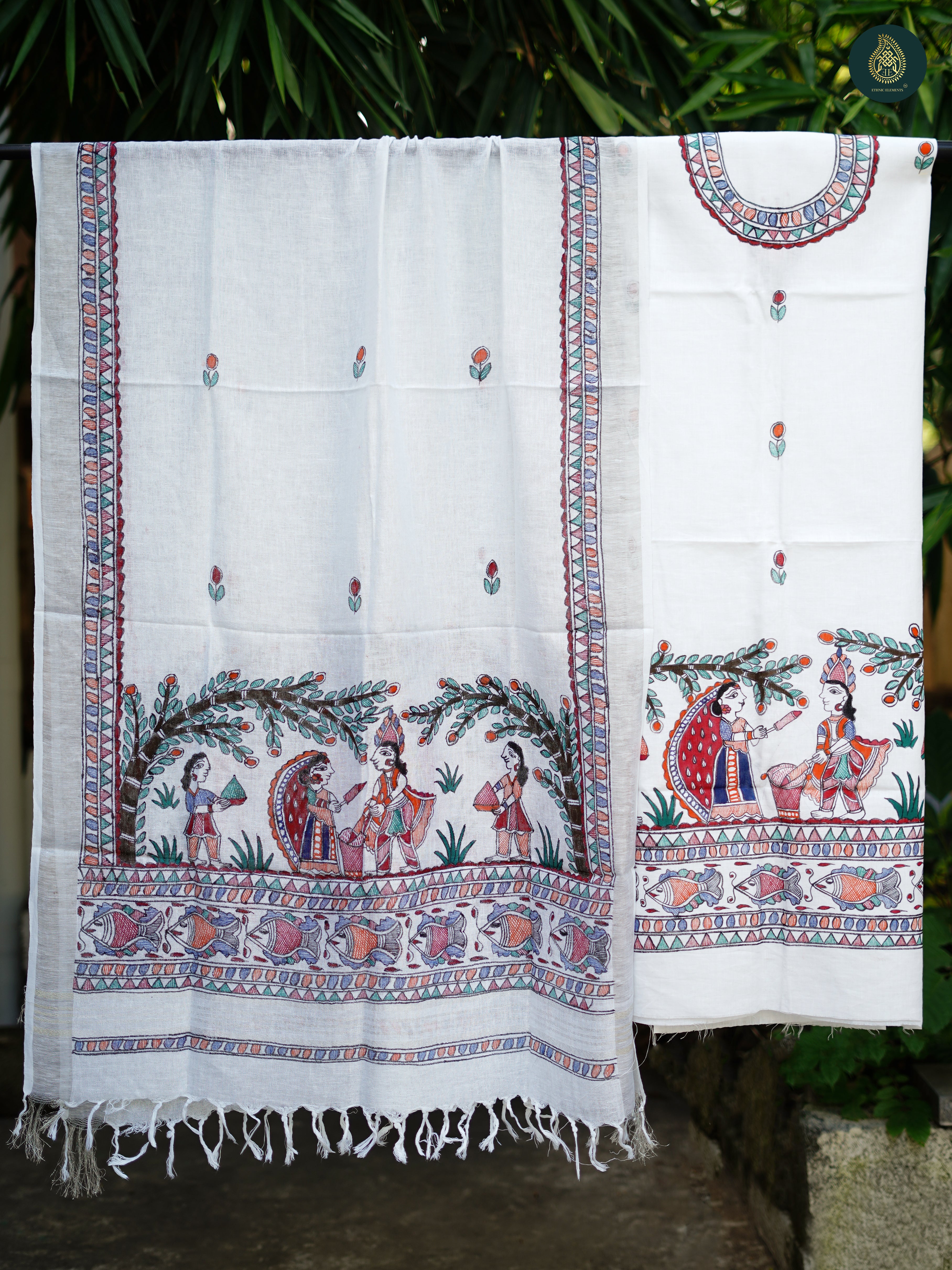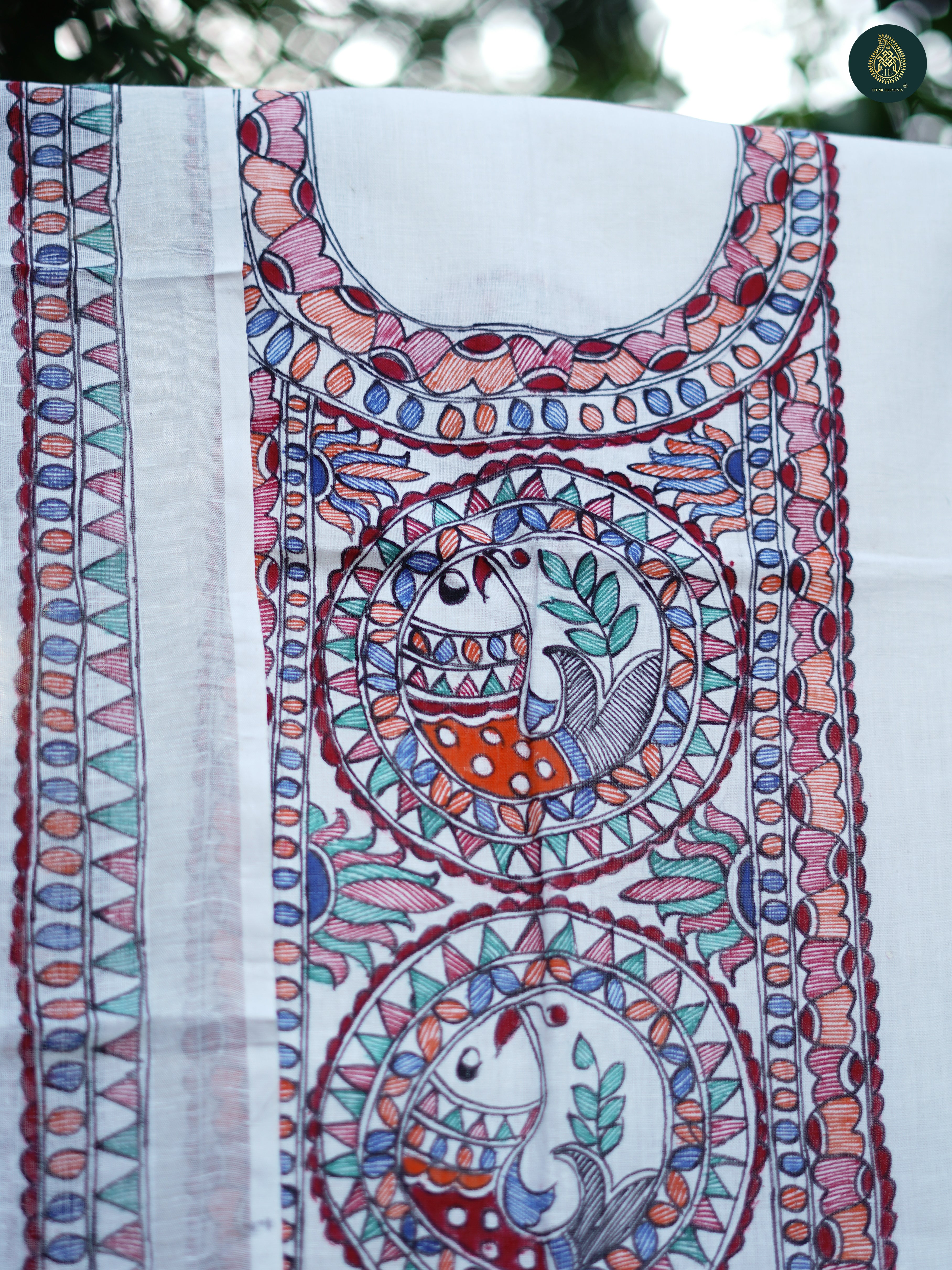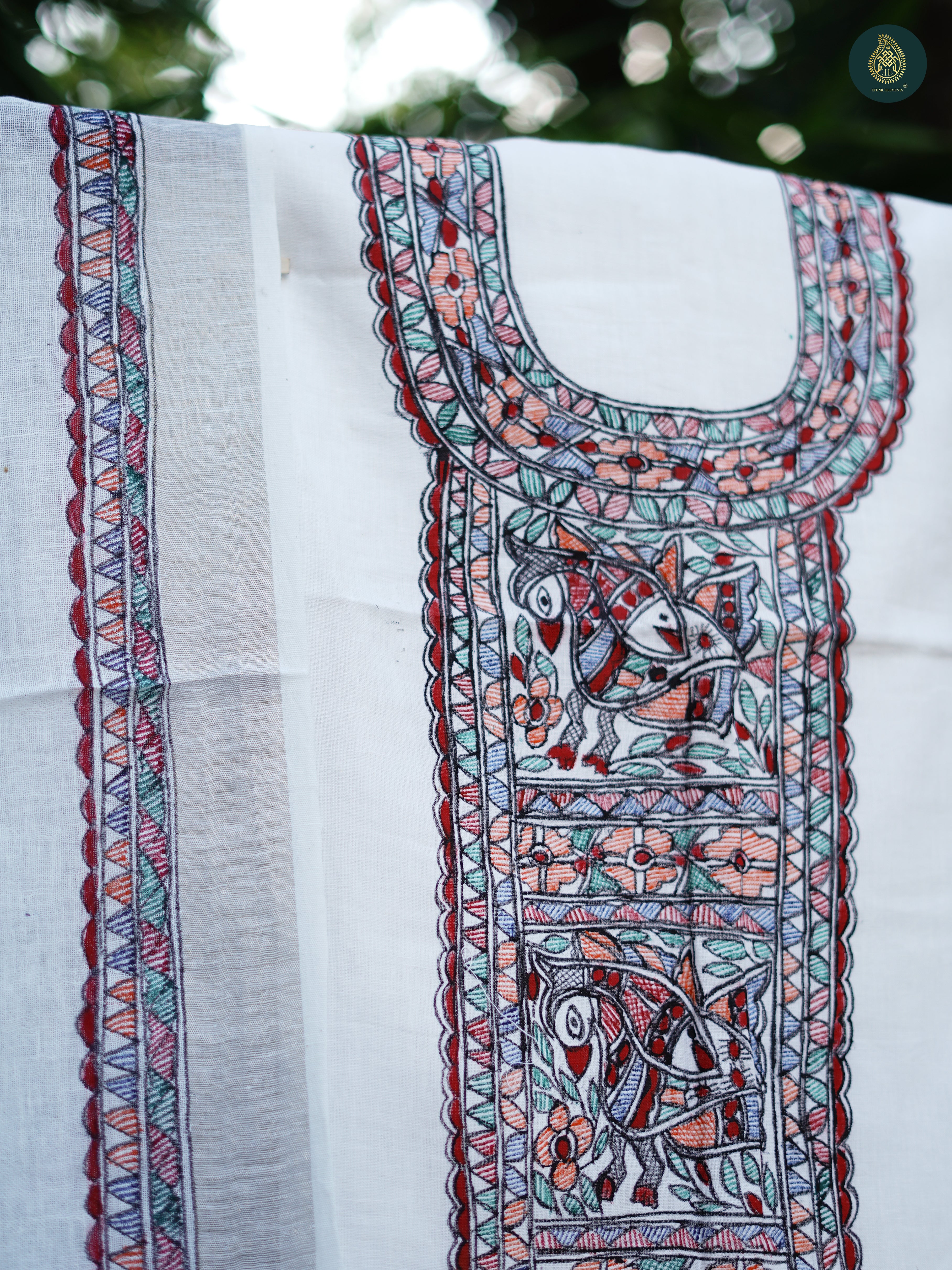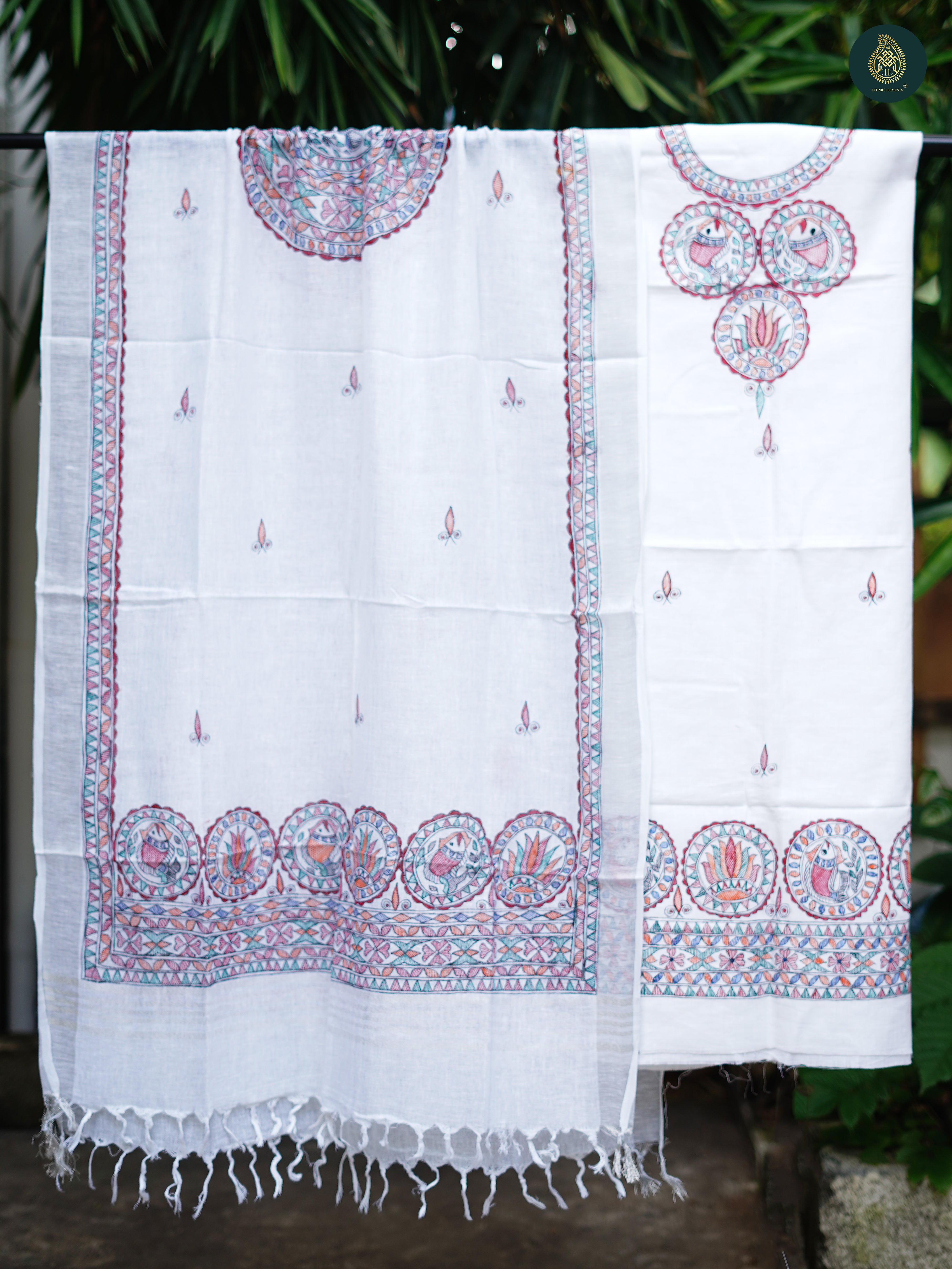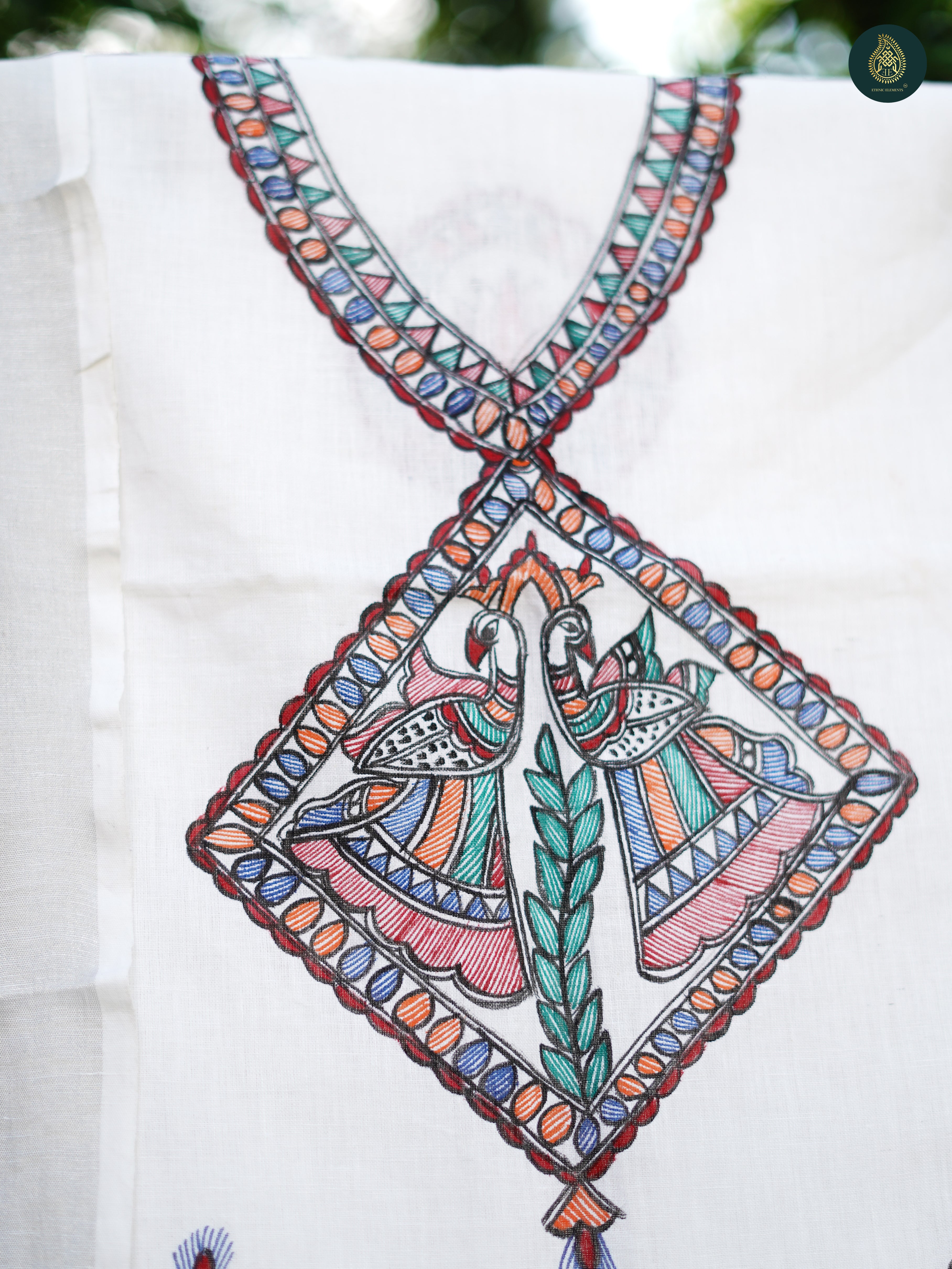 Authentic Original Hand-Painted Madhubani Suit Sets made from pure woven fabrics. Madhubani Art is a type of folk-art form. Each suit consists of line drawings filled with bright colors and contrasts or patterns. Only natural dyes and pigments are used for fabric color and painting.
