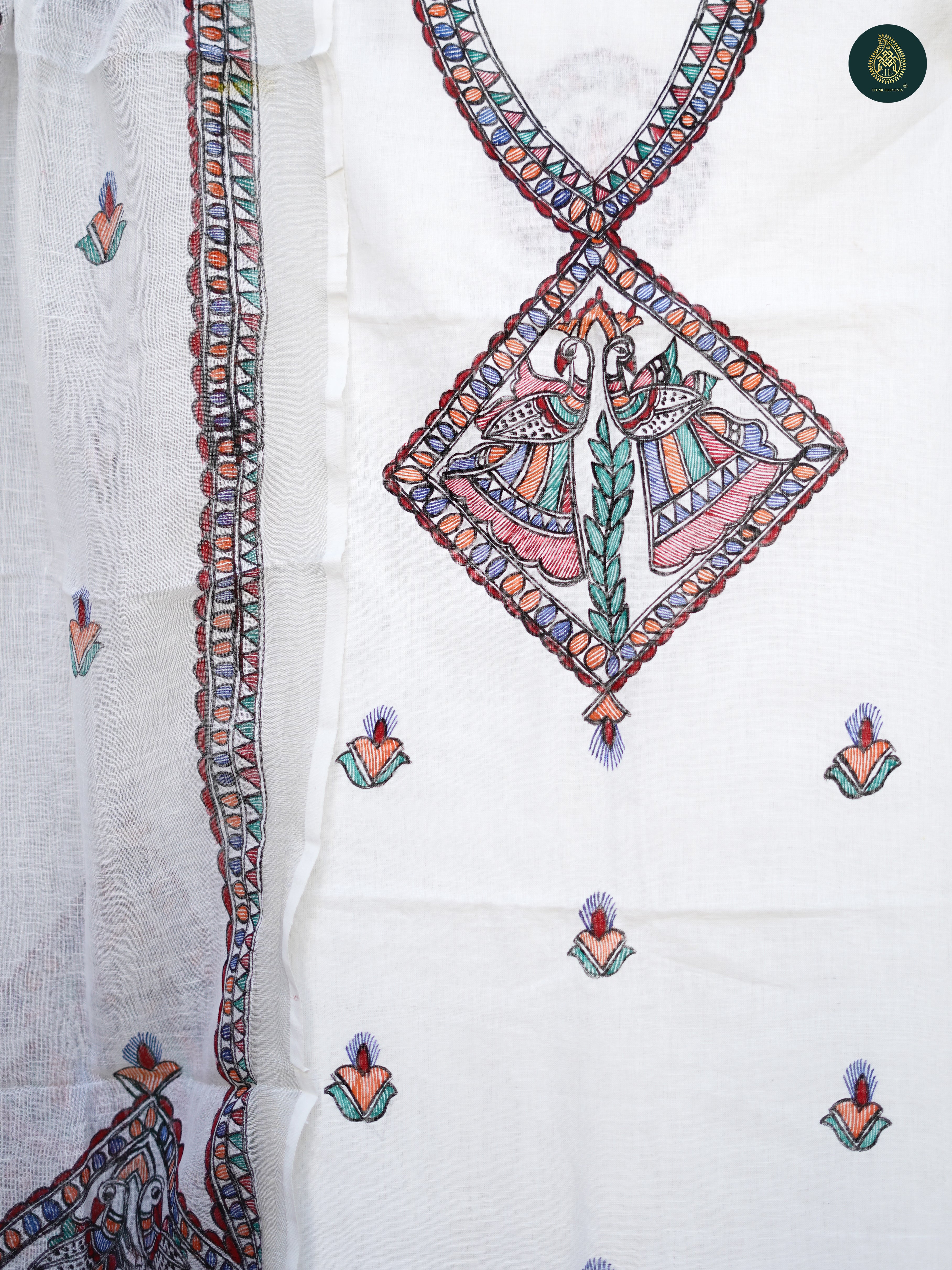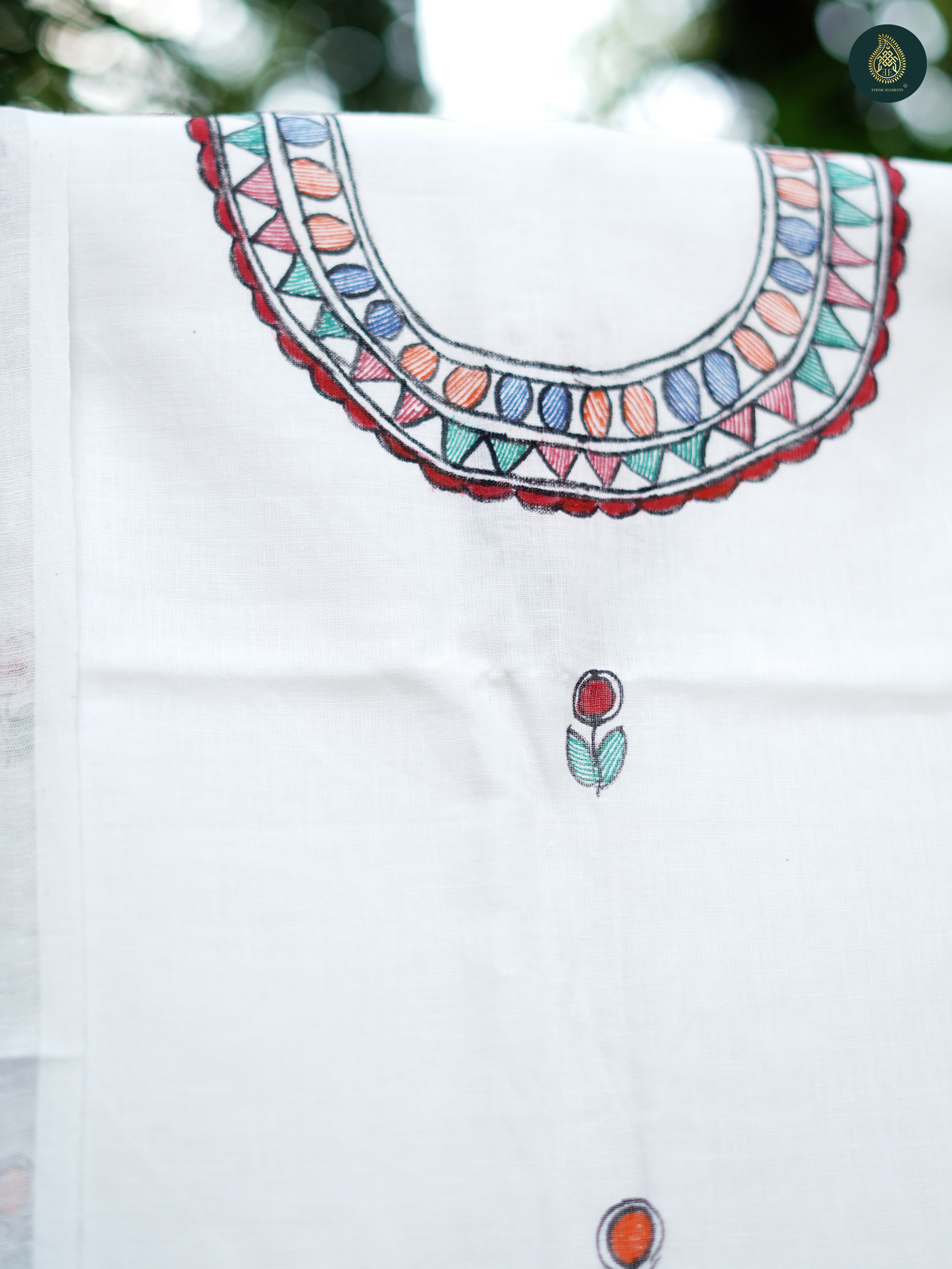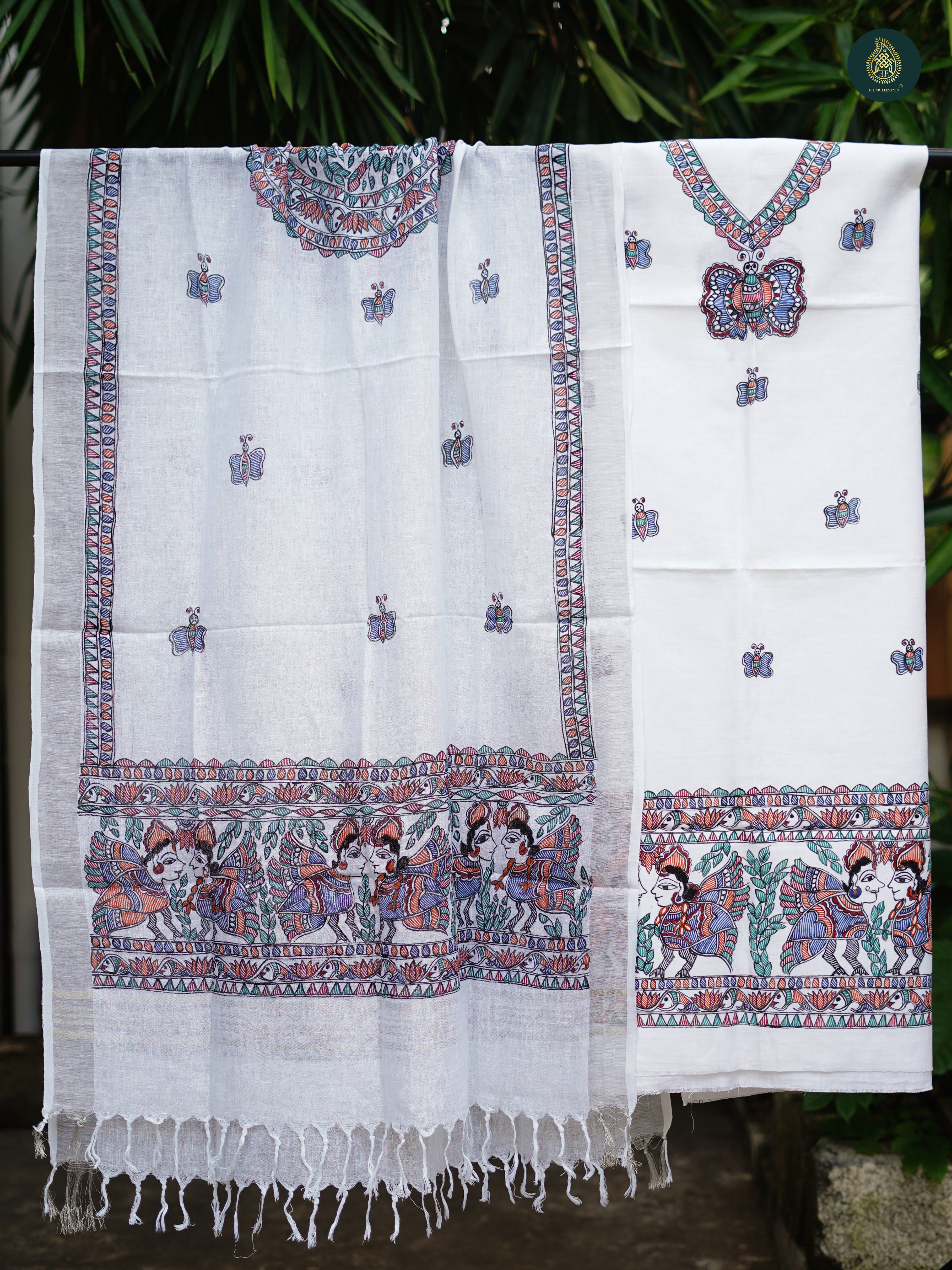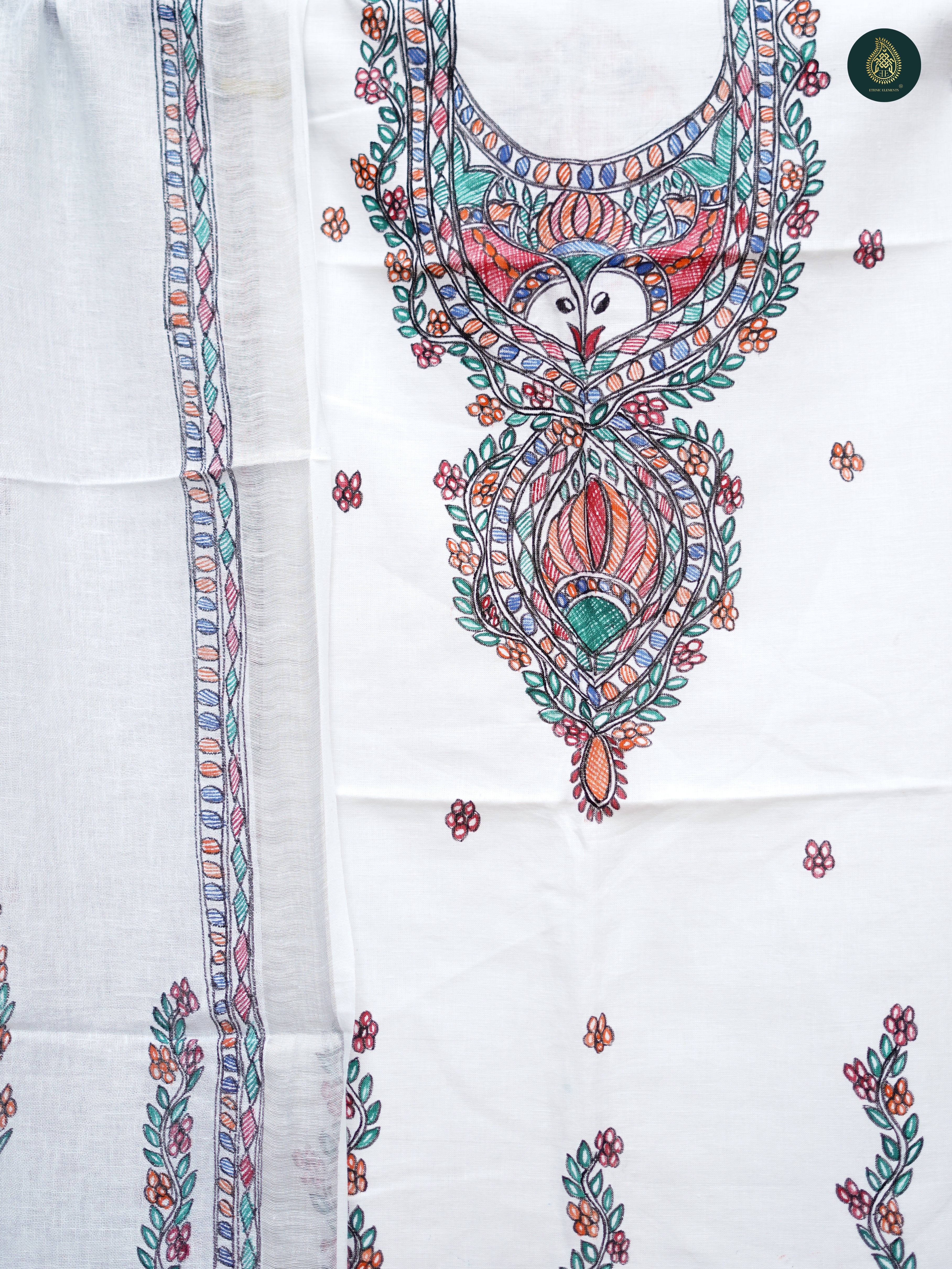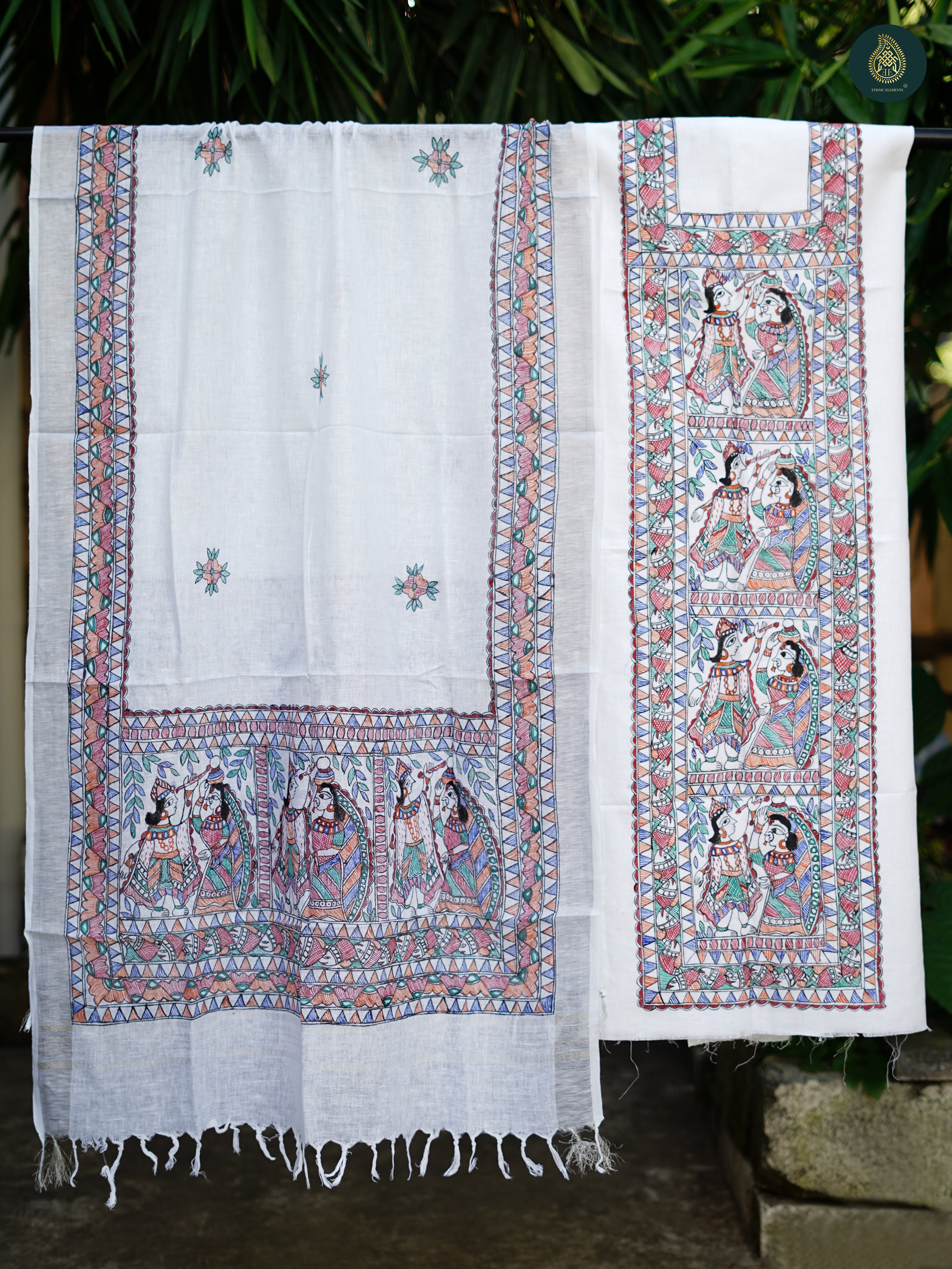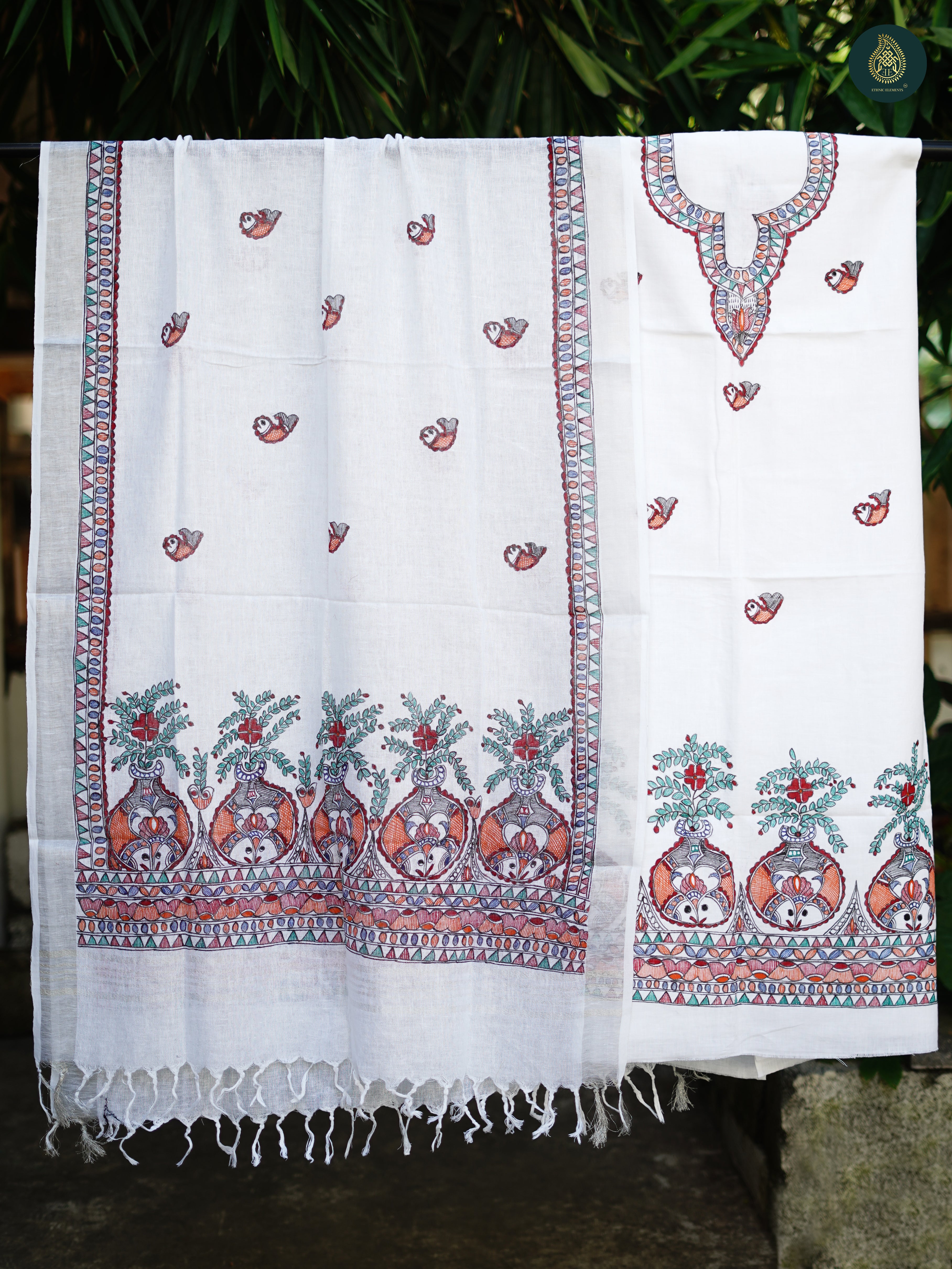 Authentic Original Hand-Painted Madhubani Suit Sets made from pure woven fabrics. Madhubani Art is a type of folk-art form. Each suit consists of line drawings filled with bright colors and contrasts or patterns. Only natural dyes and pigments are used for fabric color and painting.