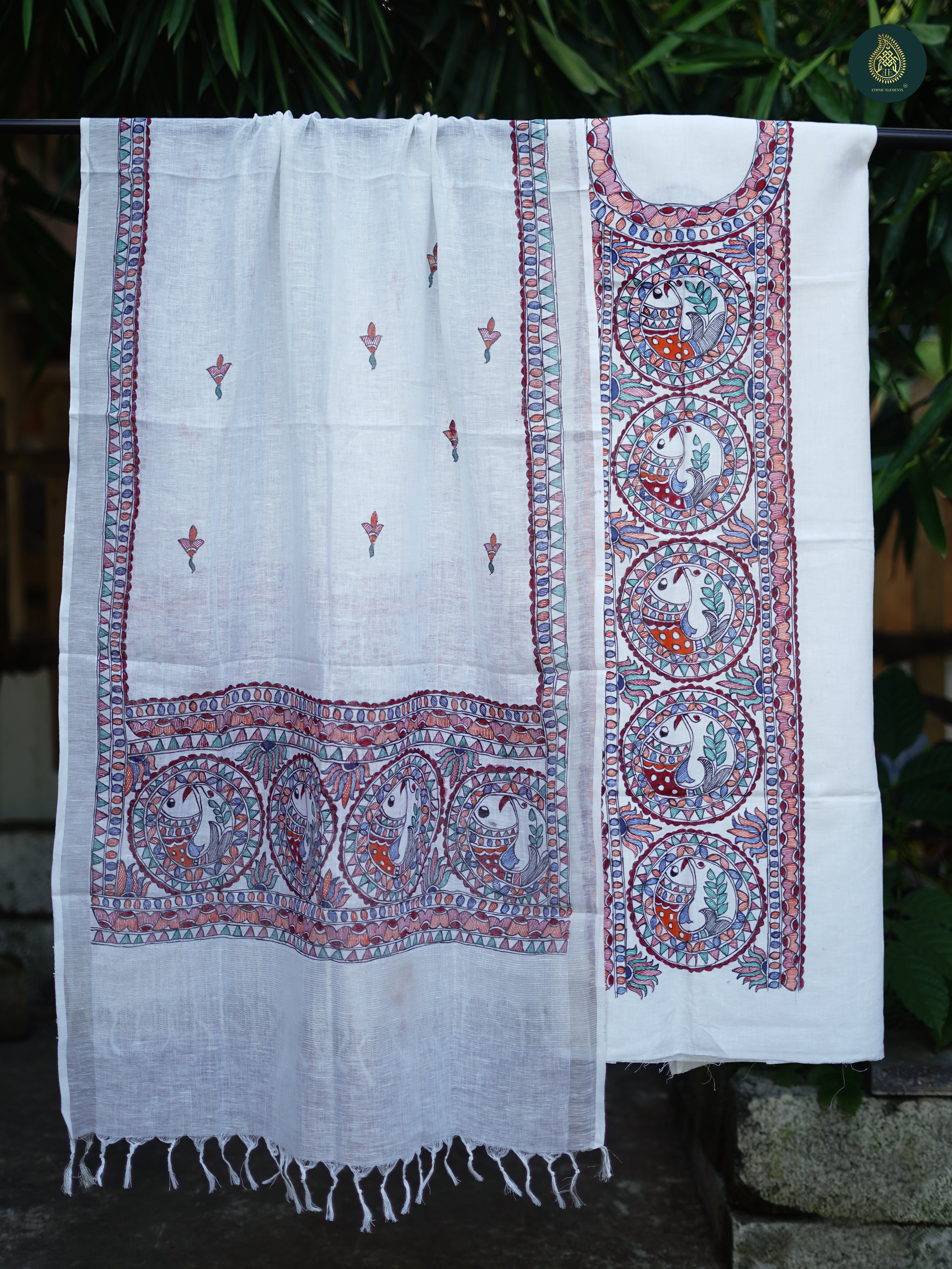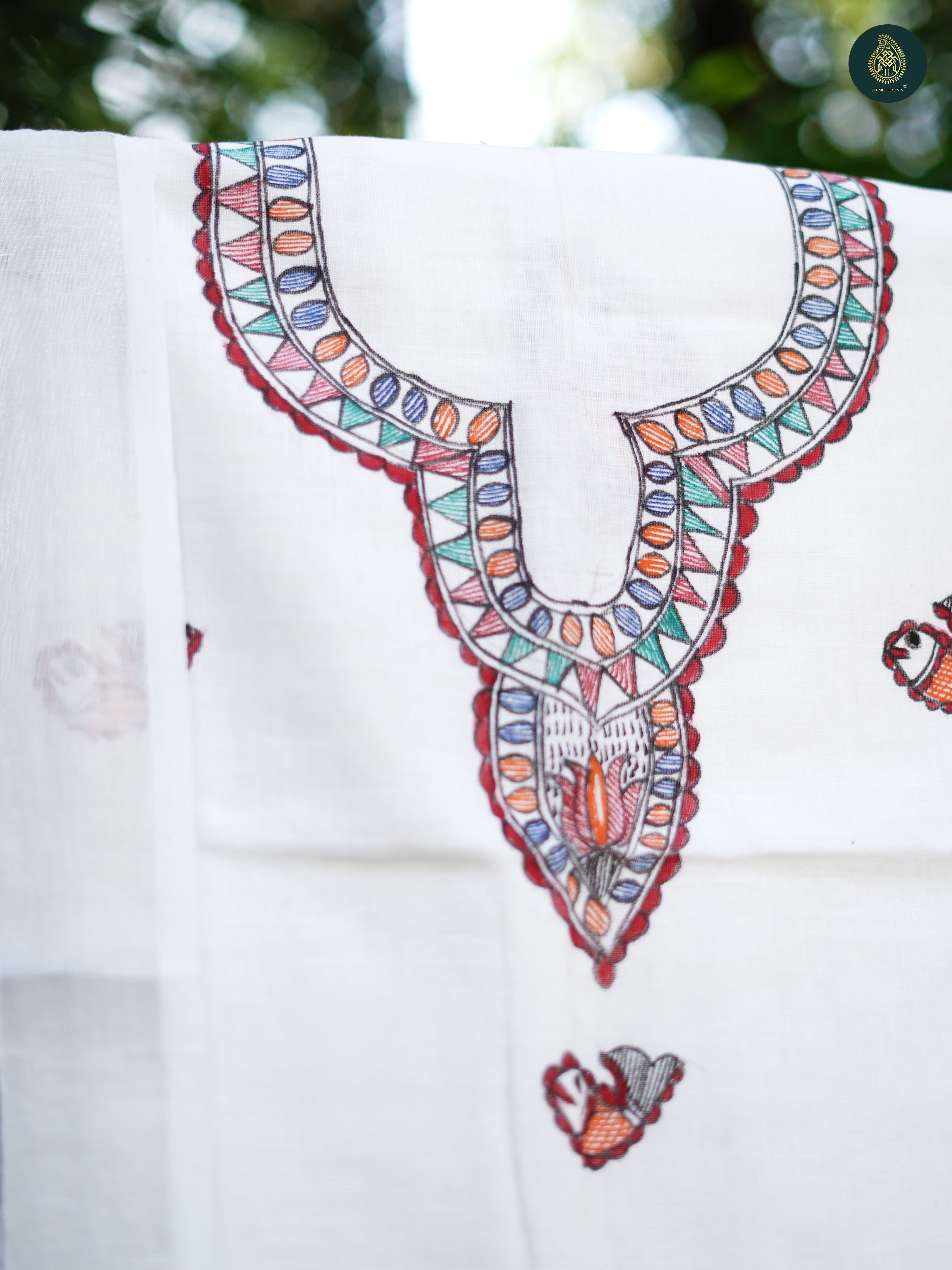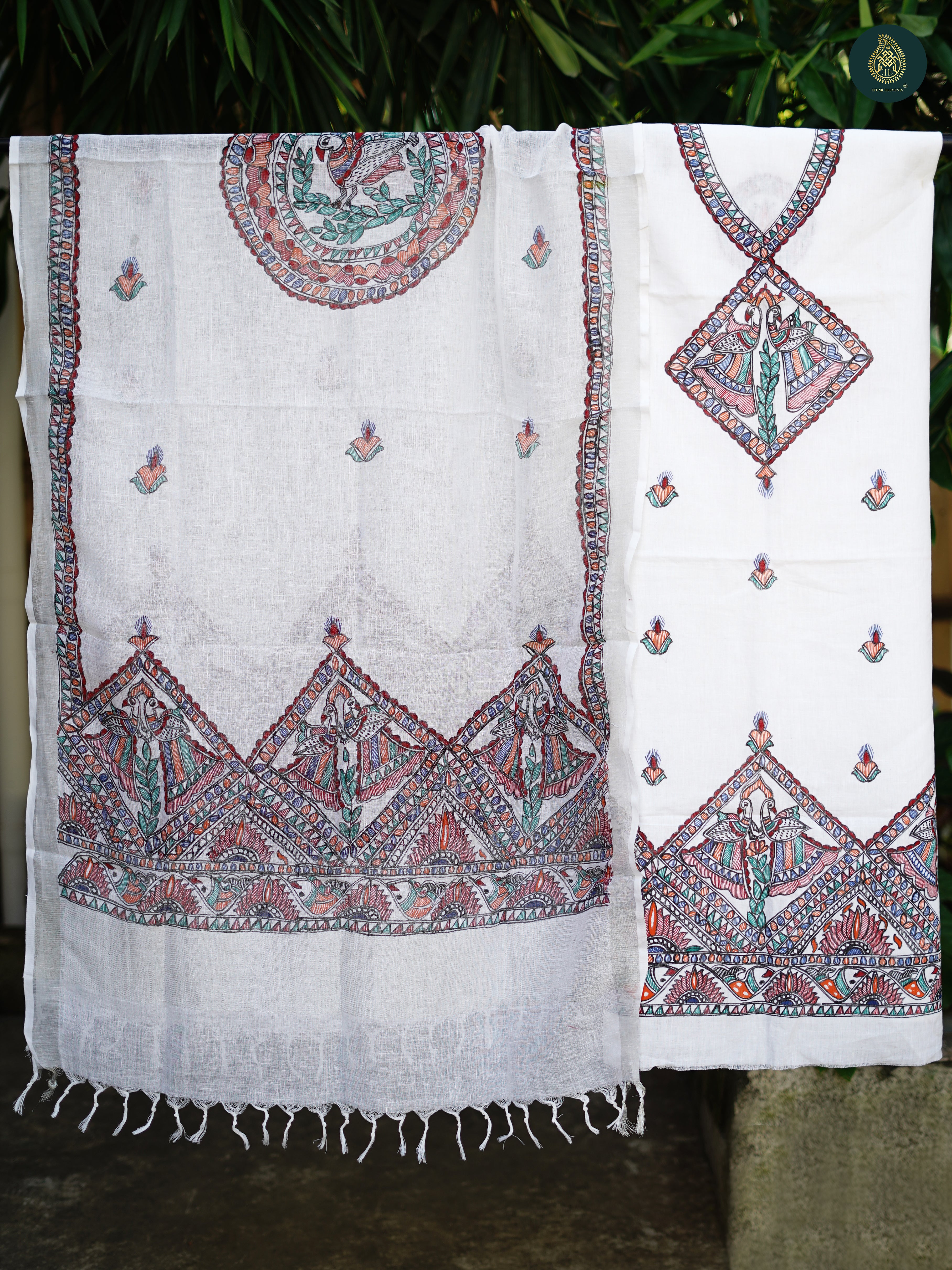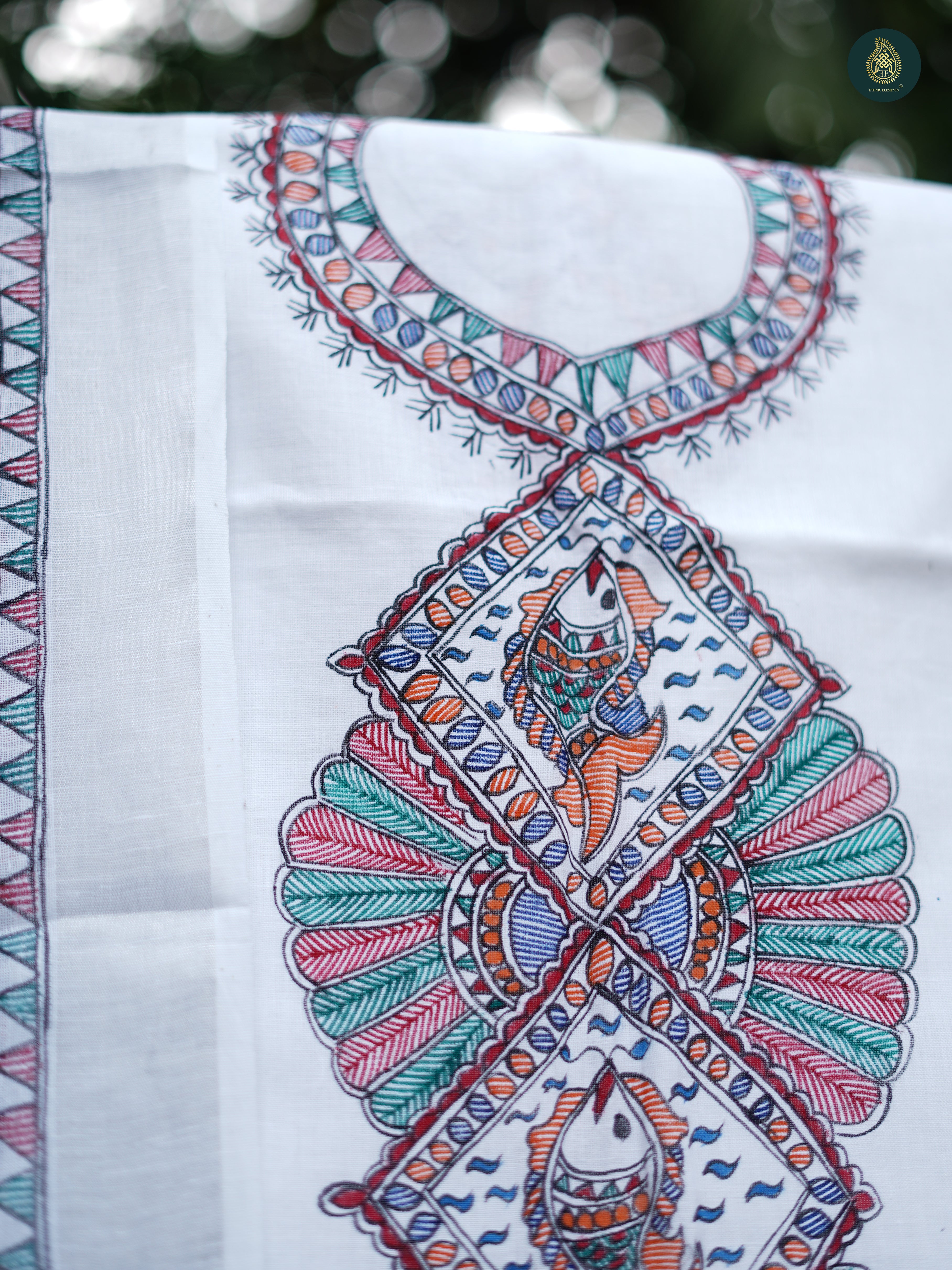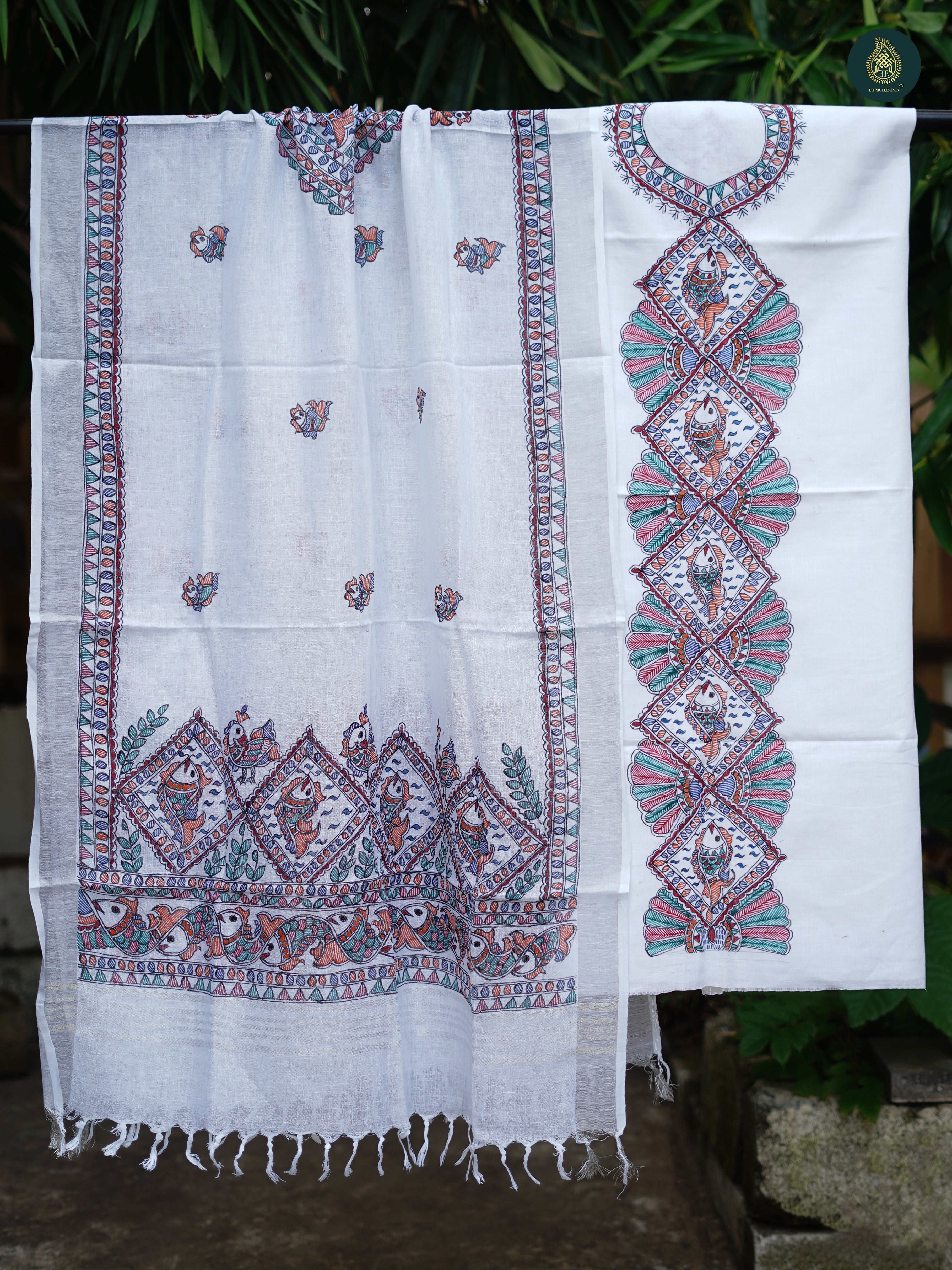 Authentic Original Hand-Painted Madhubani Suit Sets made from pure woven fabrics. Madhubani Art is a type of folk-art form. Each suit consists of line drawings filled with bright colors and contrasts or patterns. Only natural dyes and pigments are used for fabric color and painting.