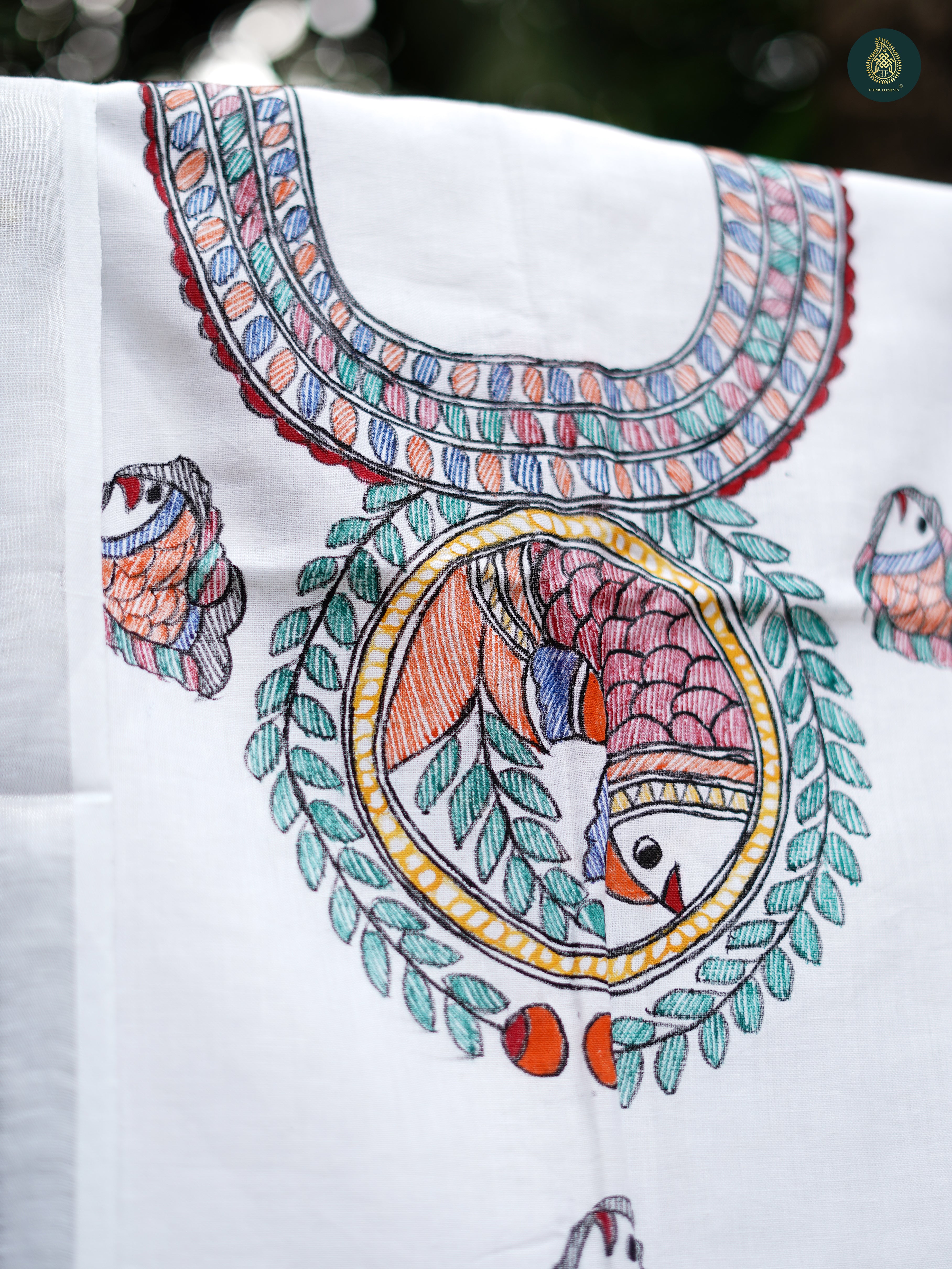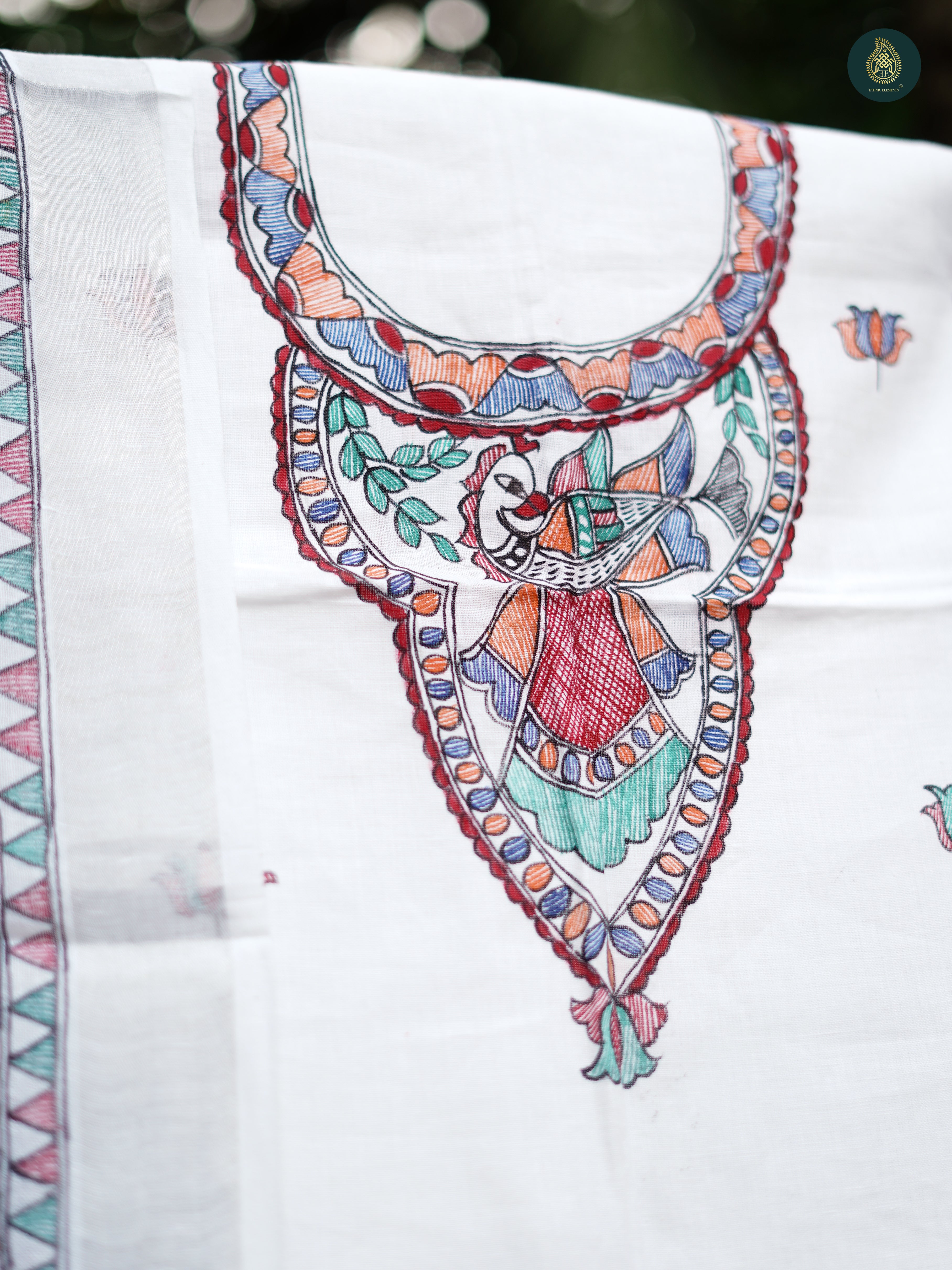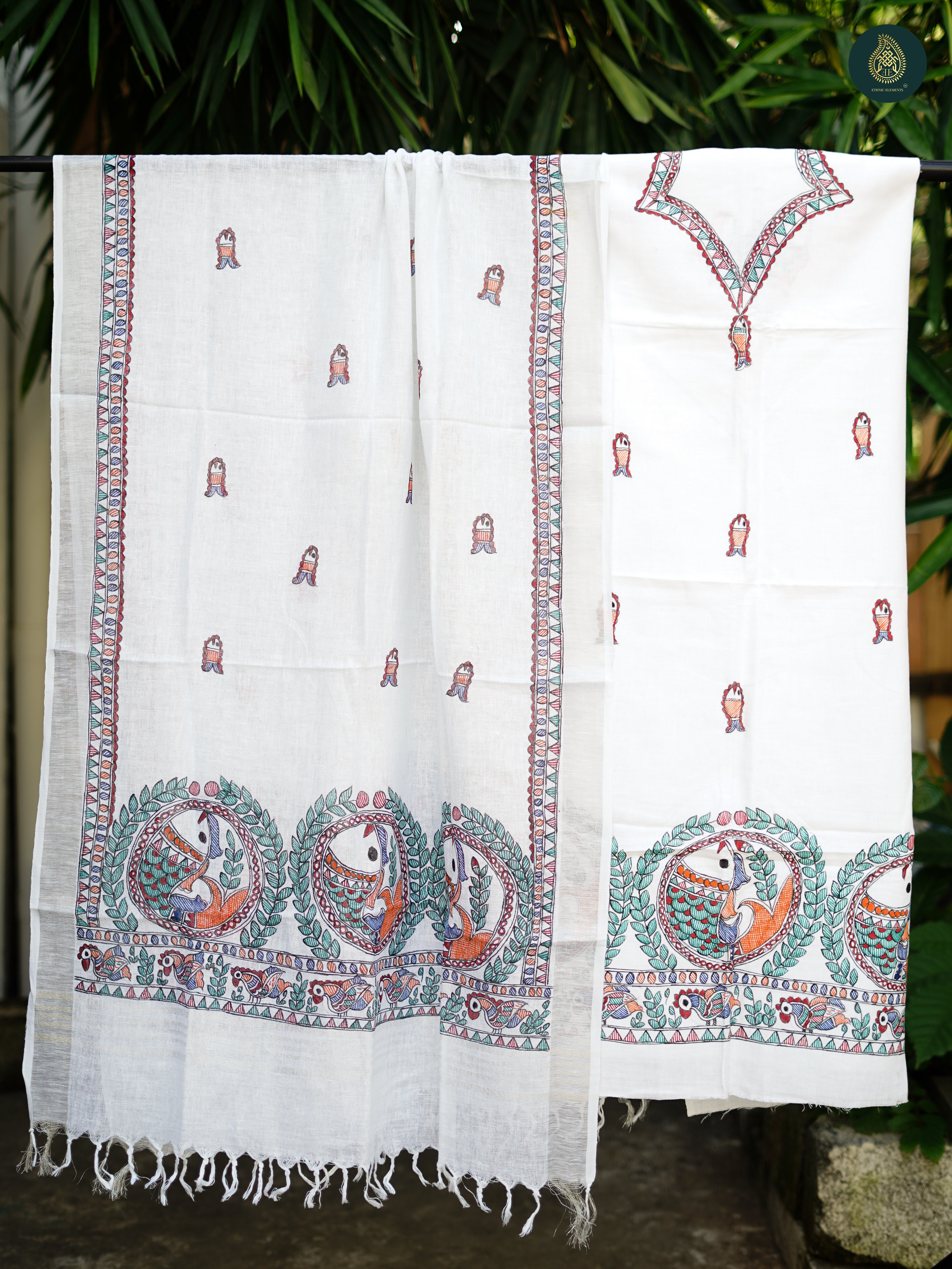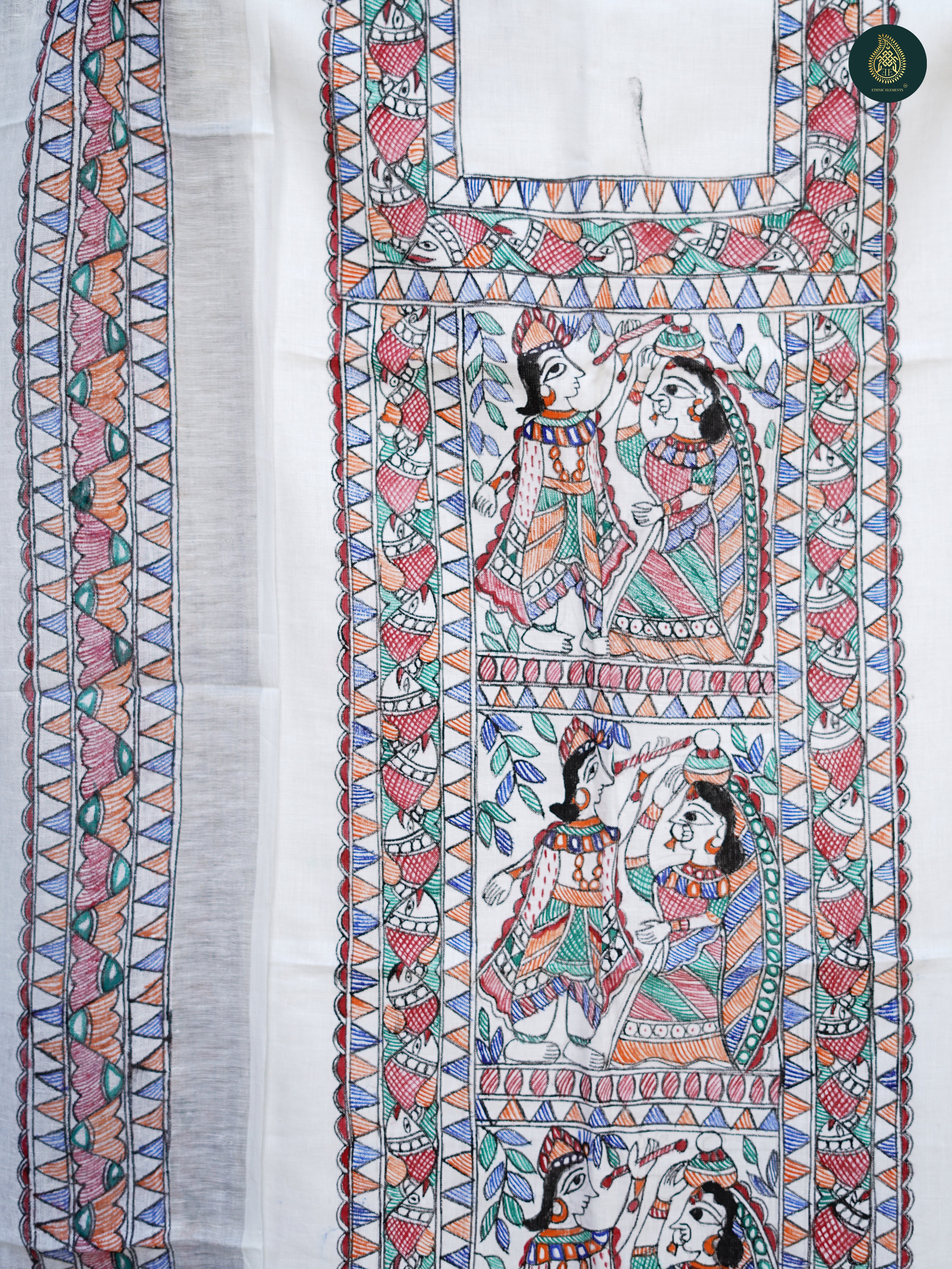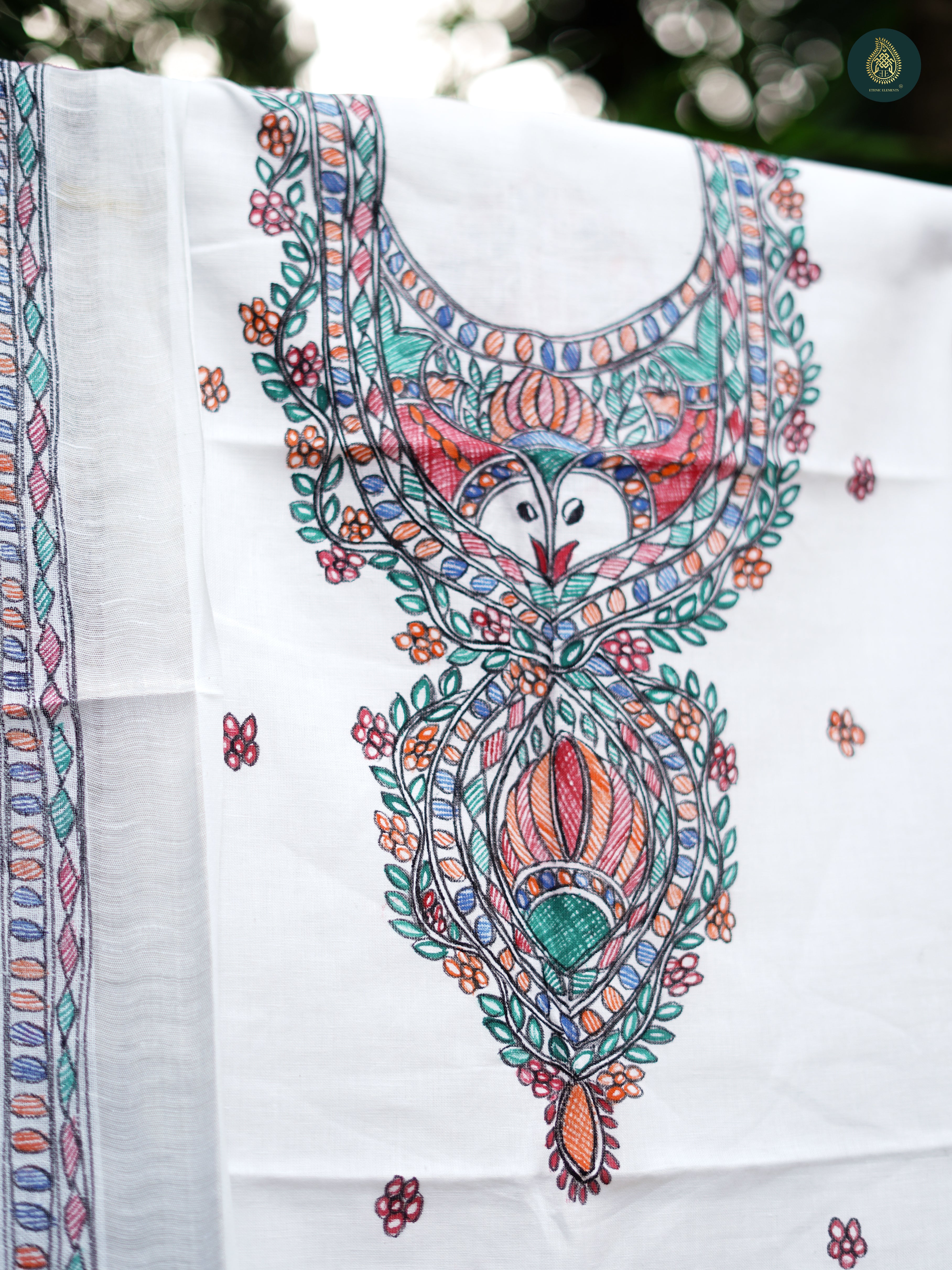 Authentic Original Hand-Painted Madhubani Suit Sets made from pure woven fabrics. Madhubani Art is a type of folk-art form. Each suit consists of line drawings filled with bright colors and contrasts or patterns. Only natural dyes and pigments are used for fabric color and painting.