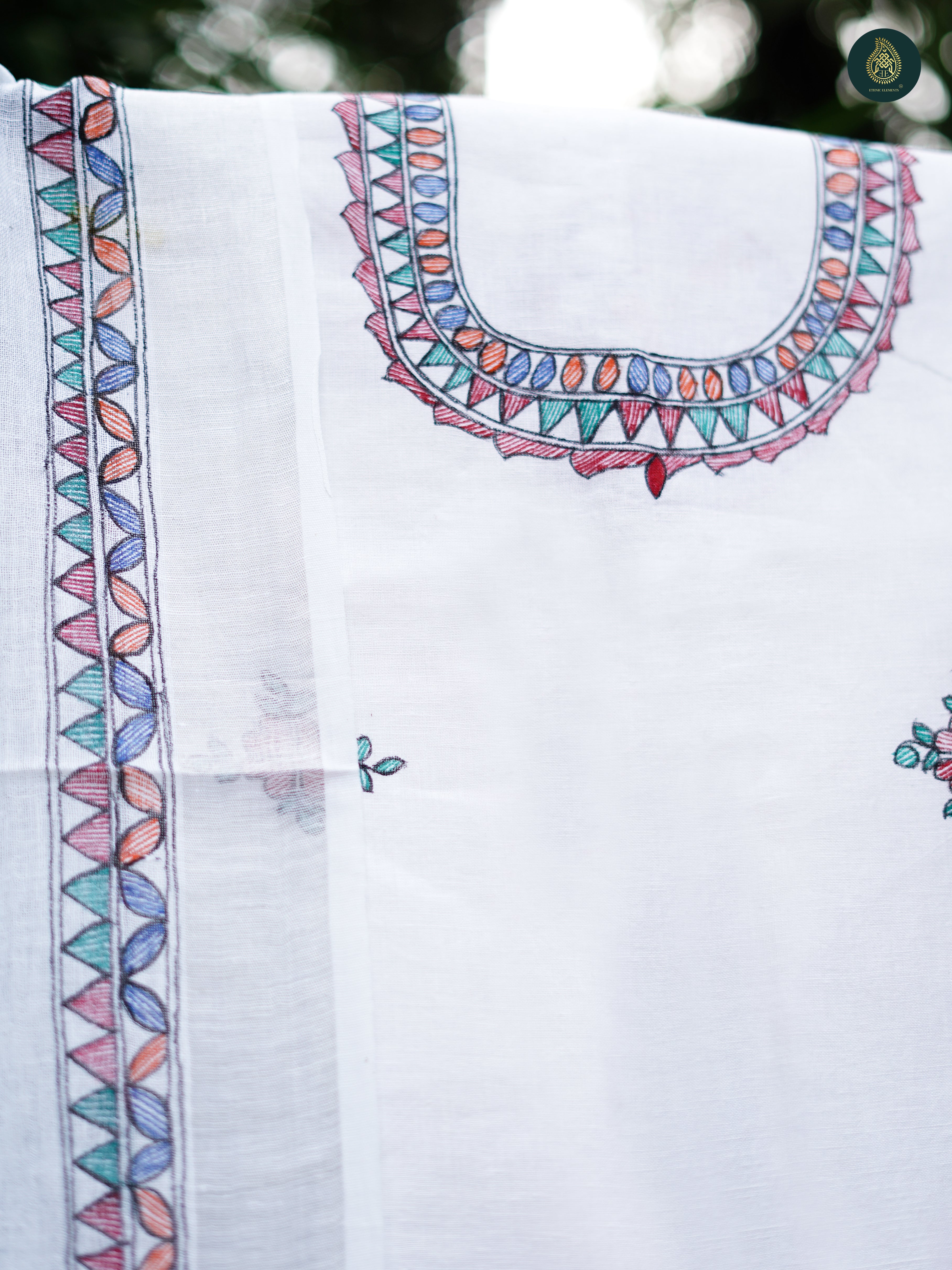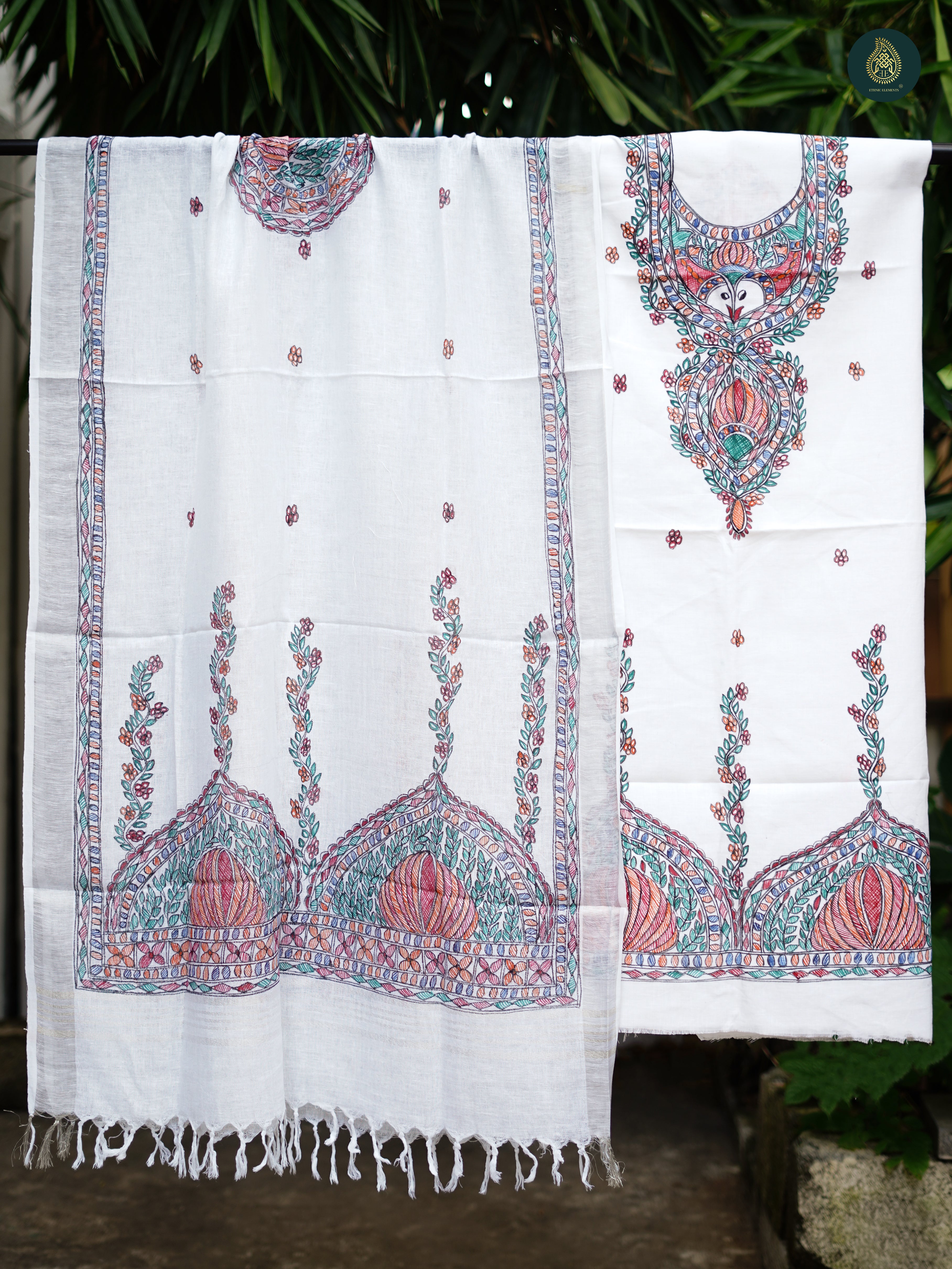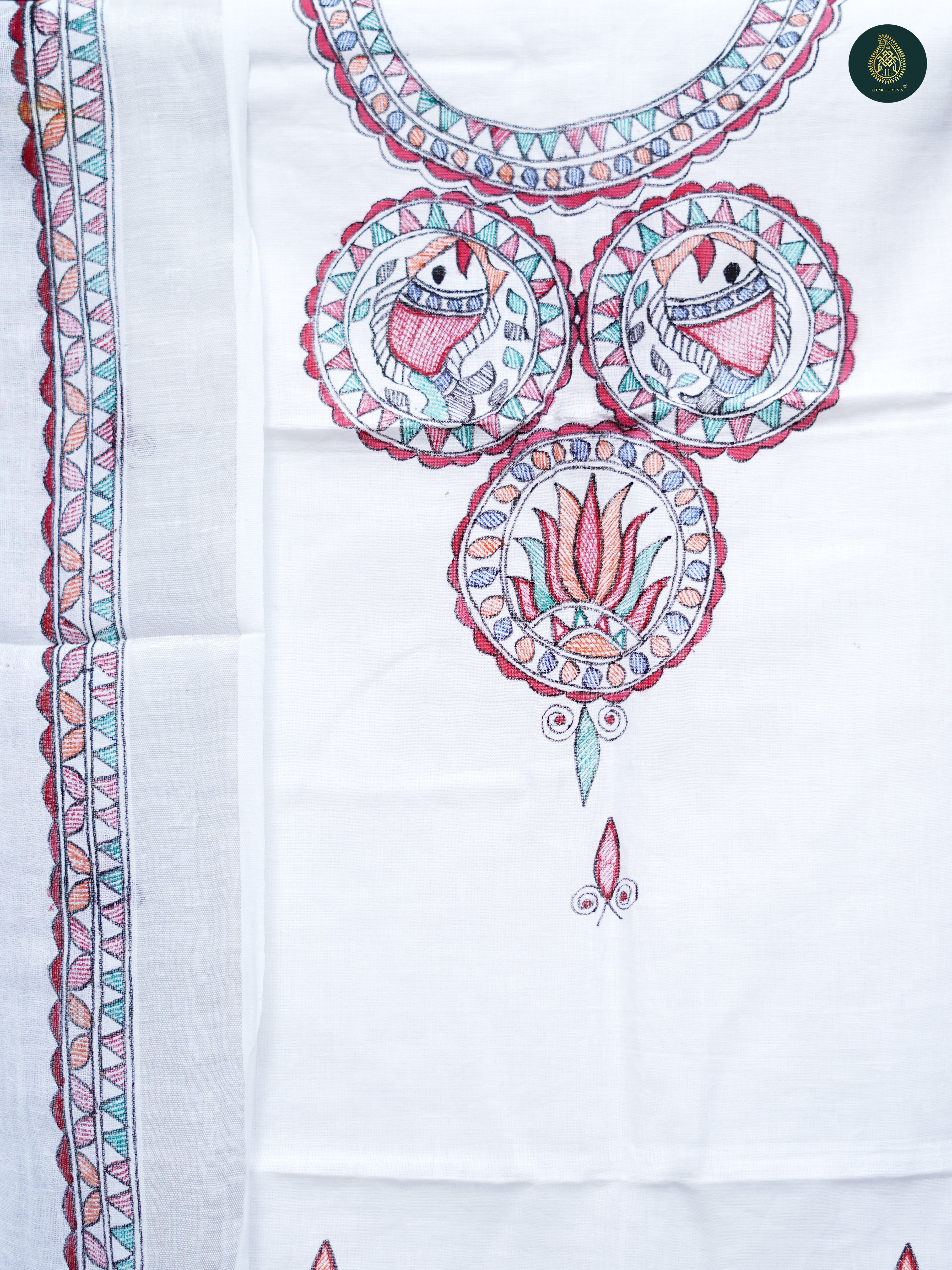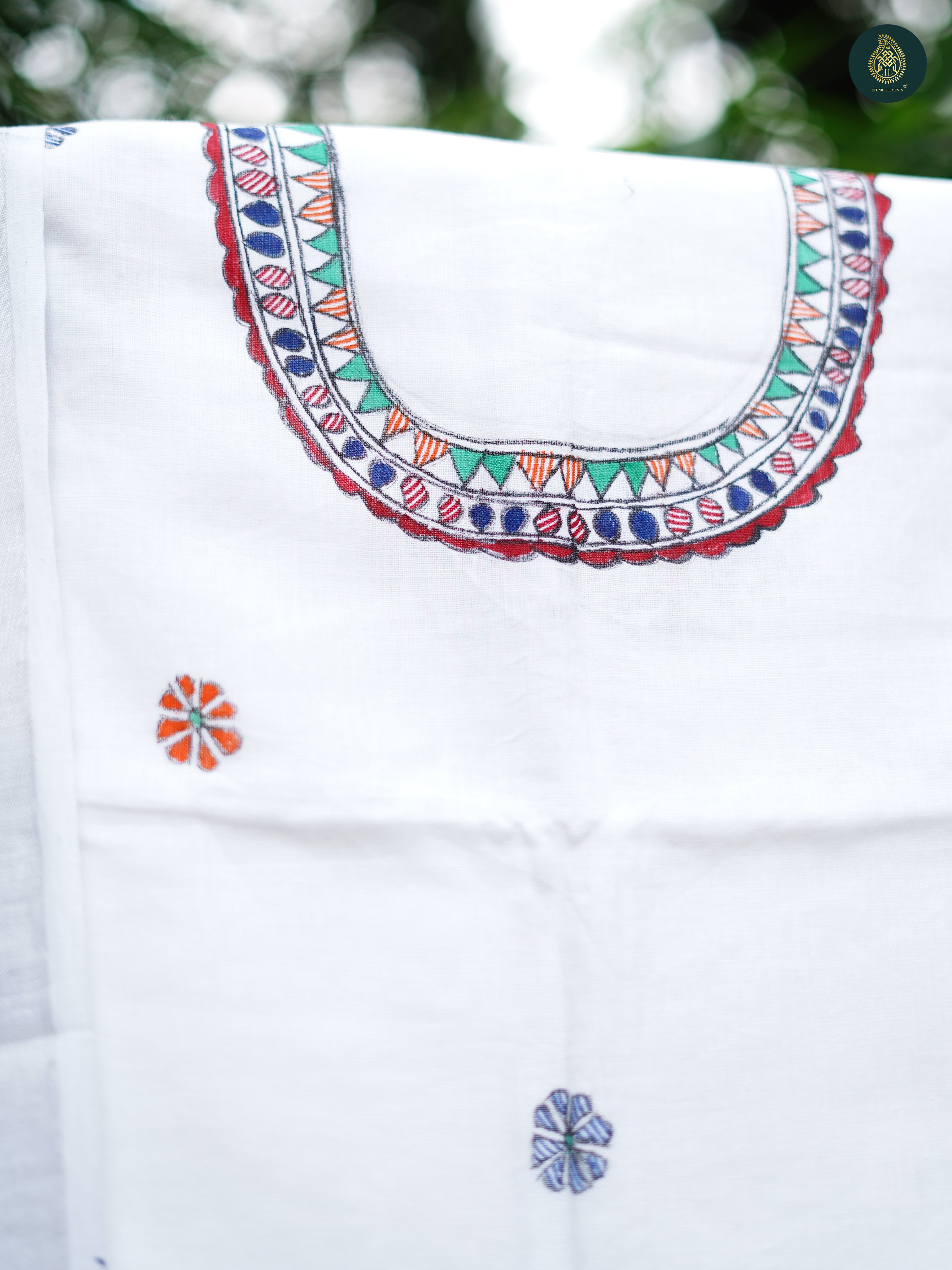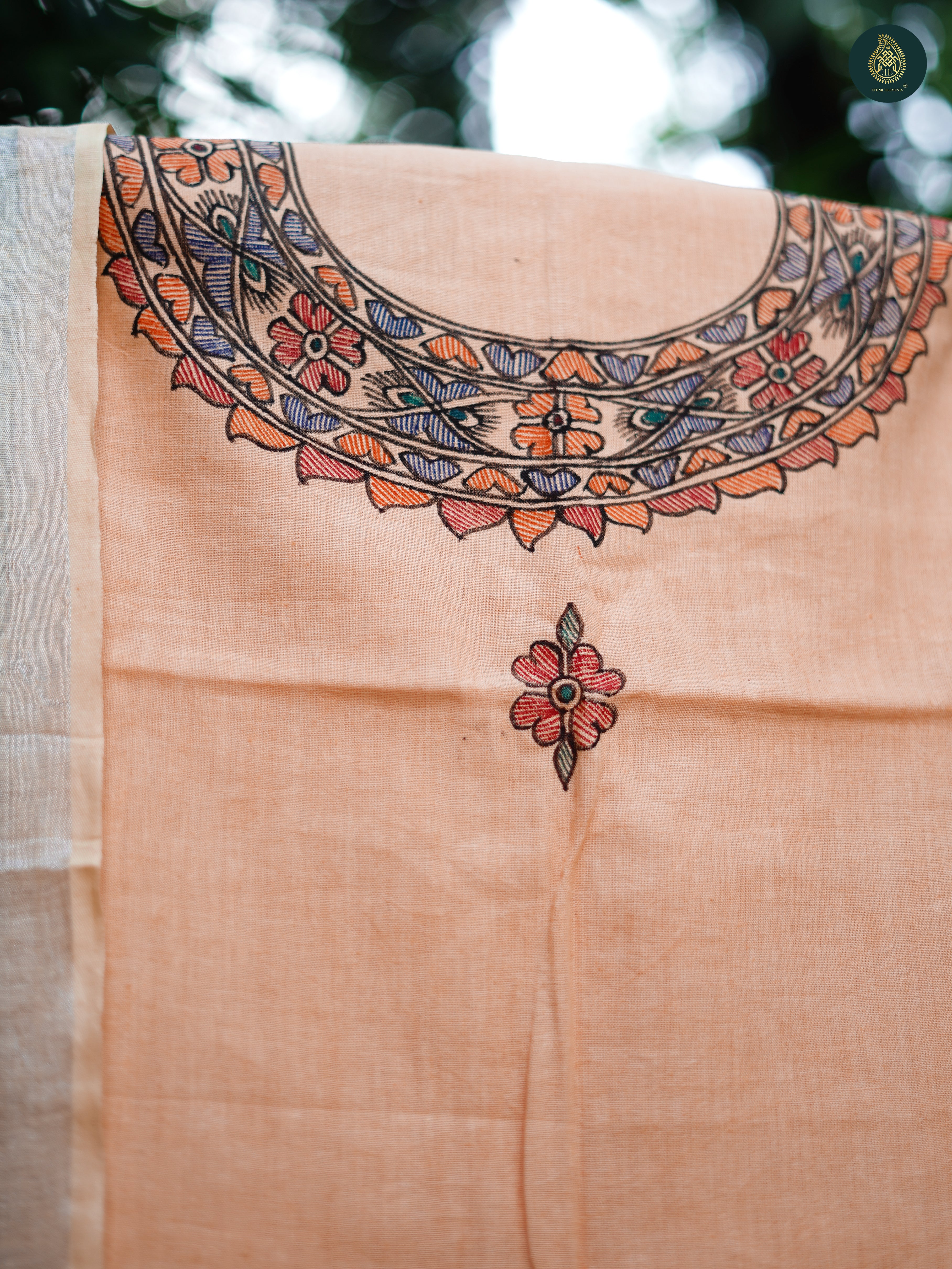 Authentic Original Hand-Painted Madhubani Suit Sets made from pure woven fabrics. Madhubani Art is a type of folk-art form. Each suit consists of line drawings filled with bright colors and contrasts or patterns. Only natural dyes and pigments are used for fabric color and painting.