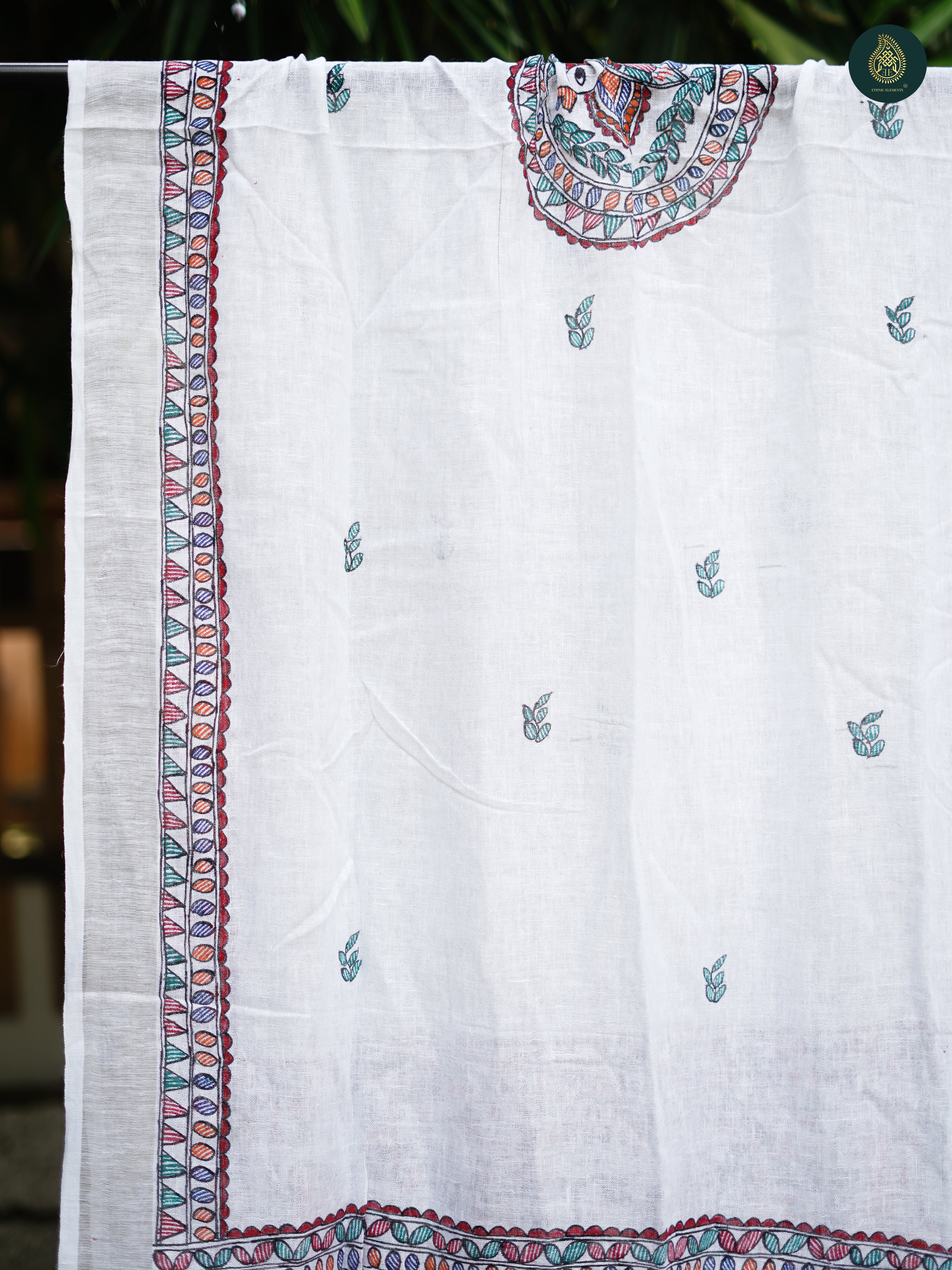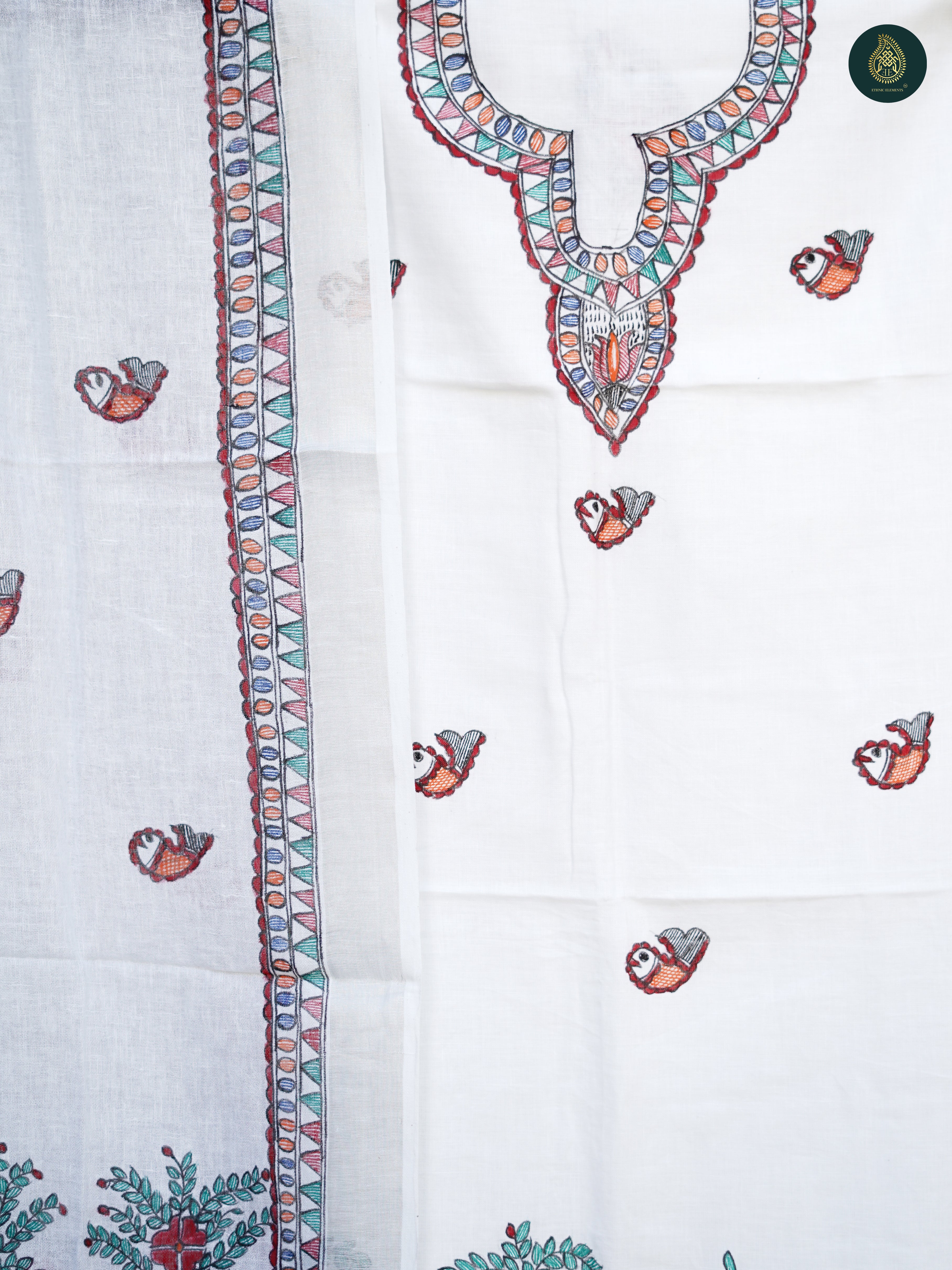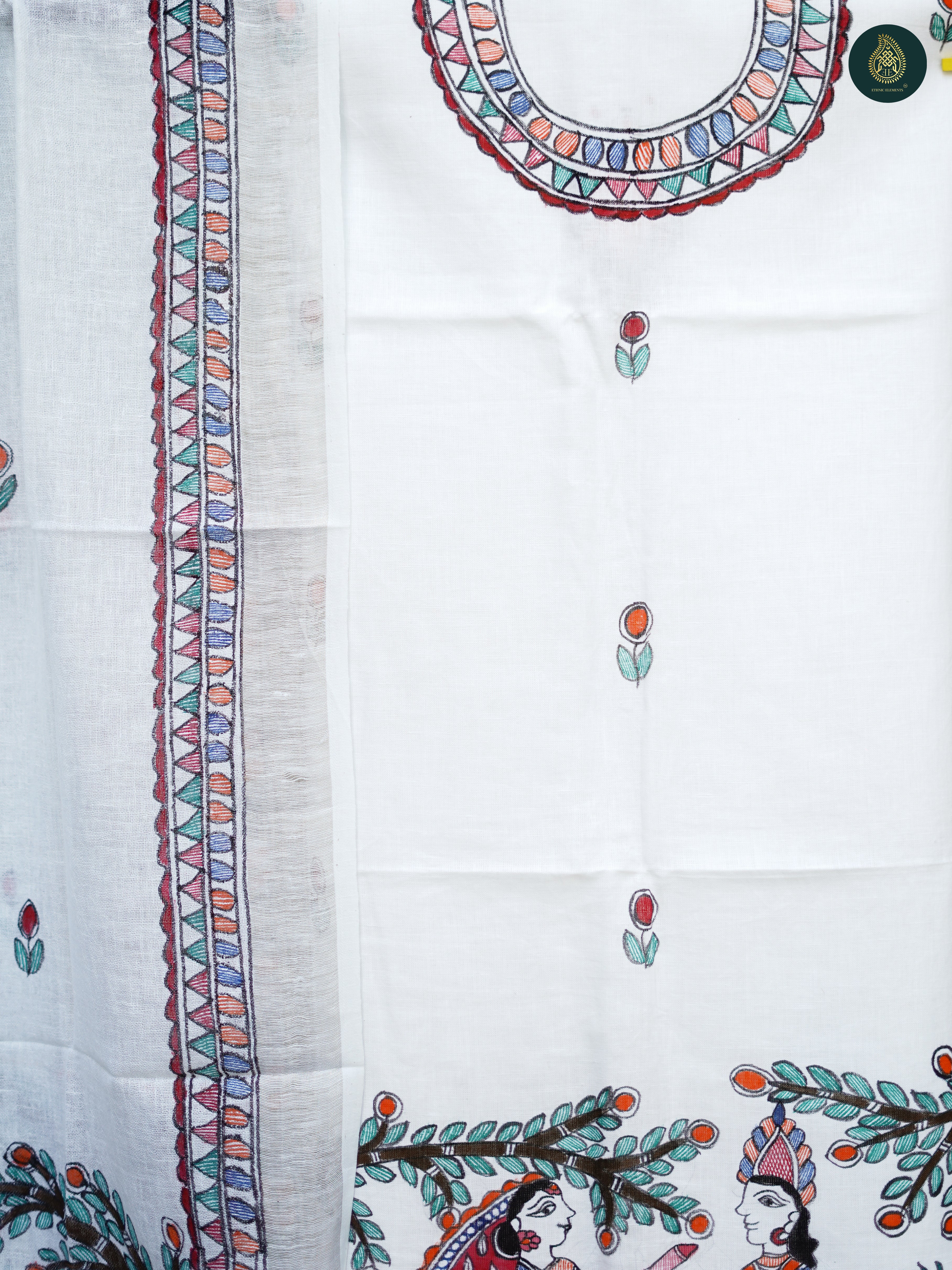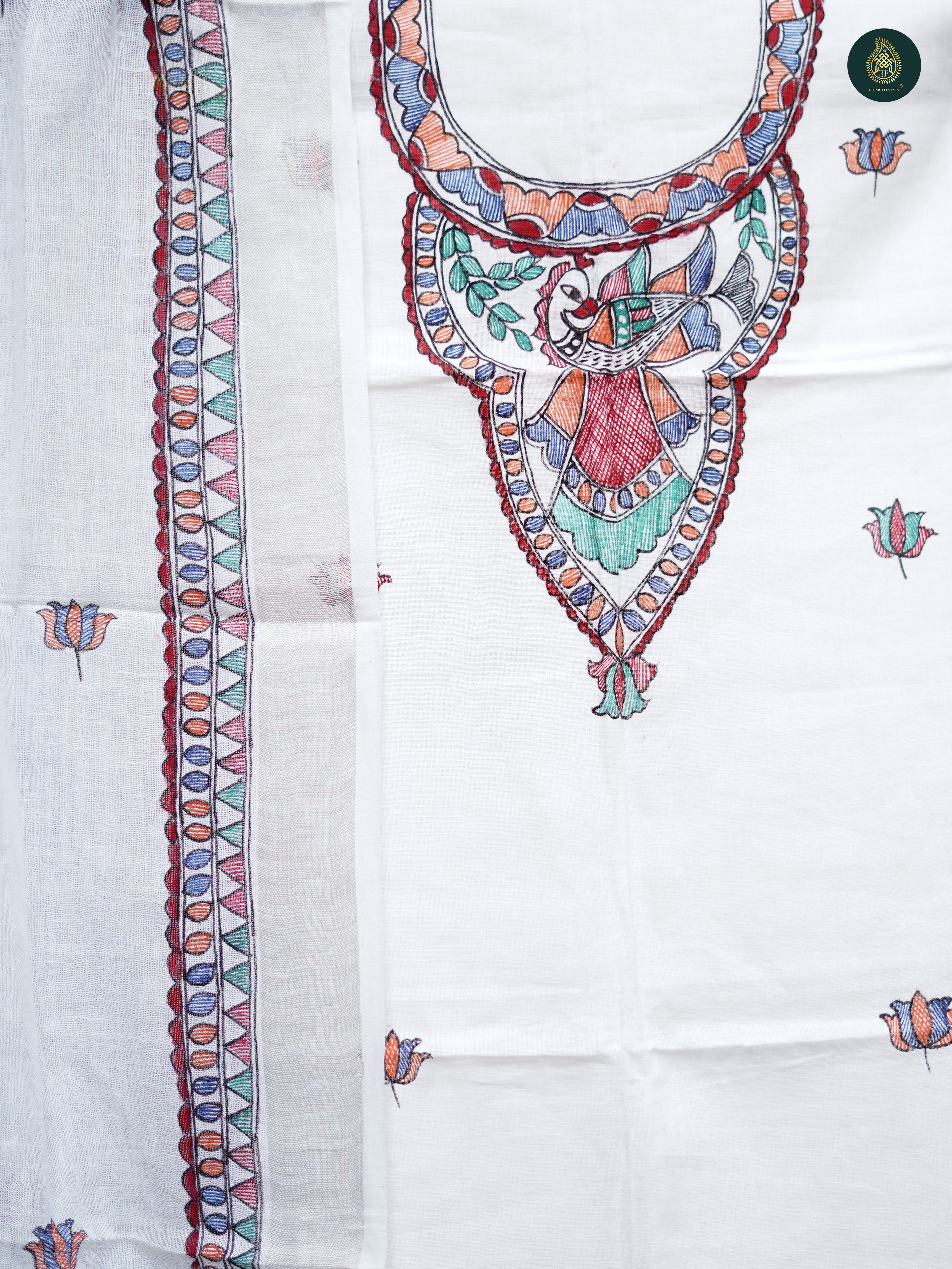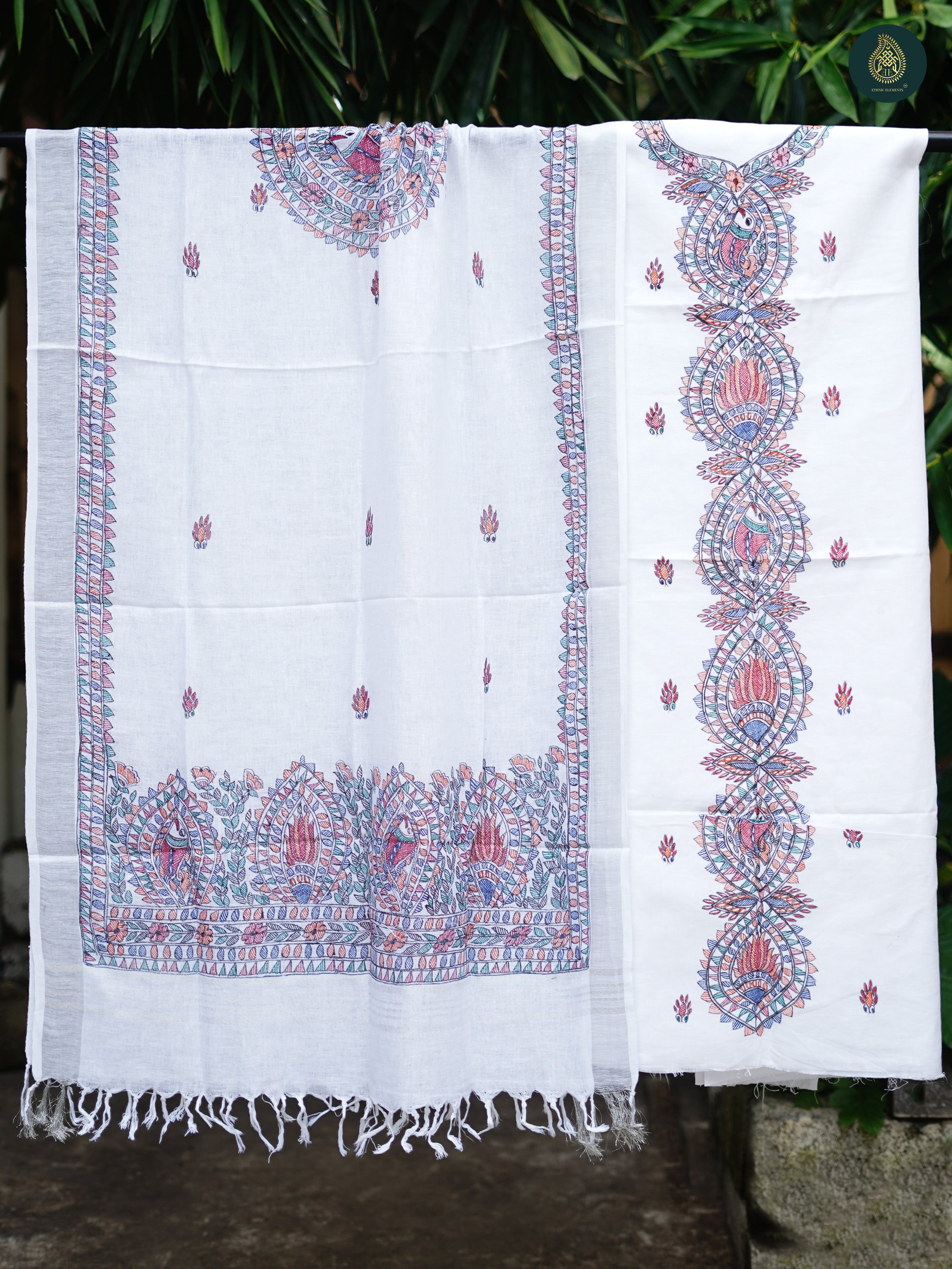 Authentic Original Hand-Painted Madhubani Suit Sets made from pure woven fabrics. Madhubani Art is a type of folk-art form. Each suit consists of line drawings filled with bright colors and contrasts or patterns. Only natural dyes and pigments are used for fabric color and painting.