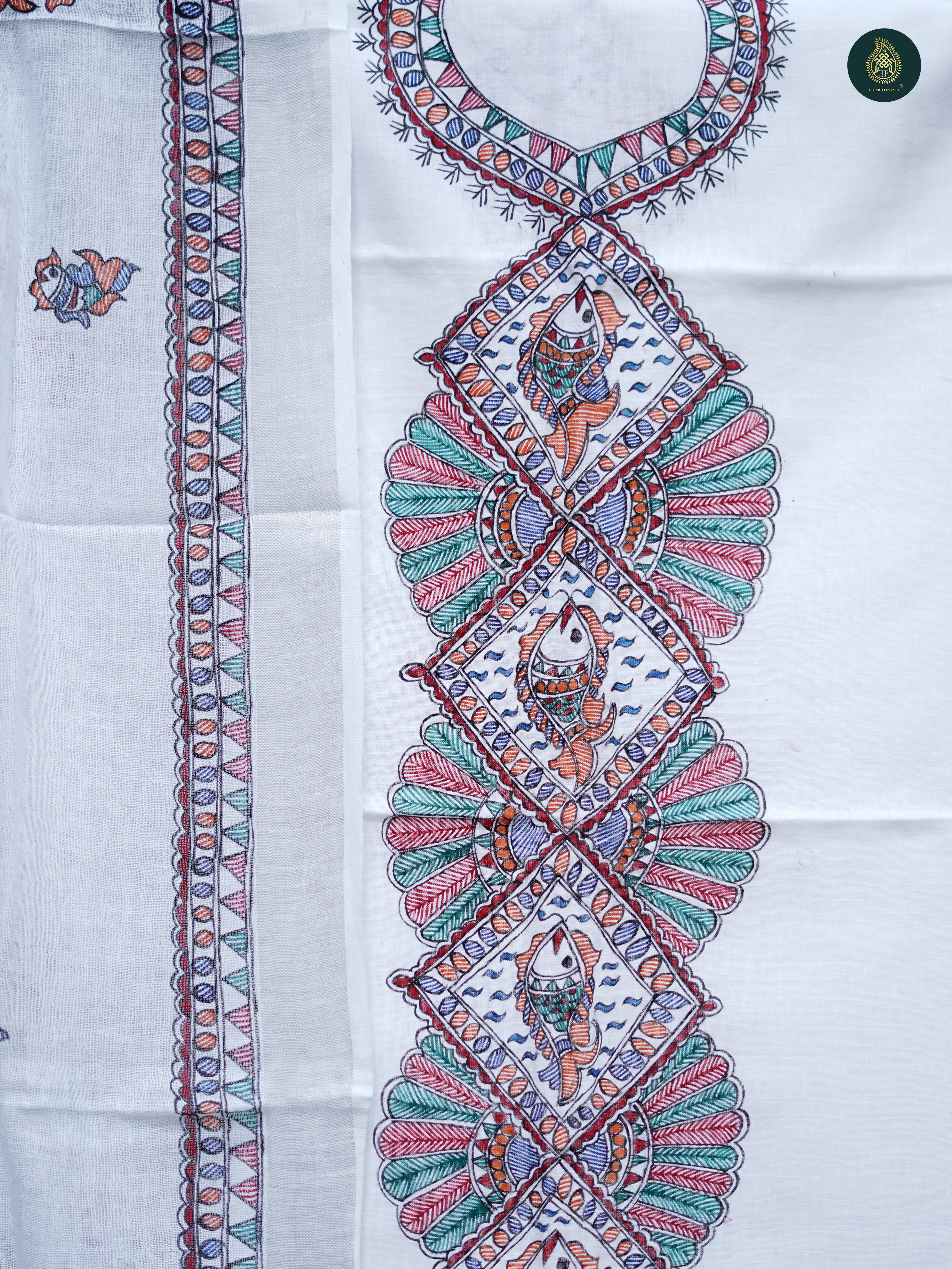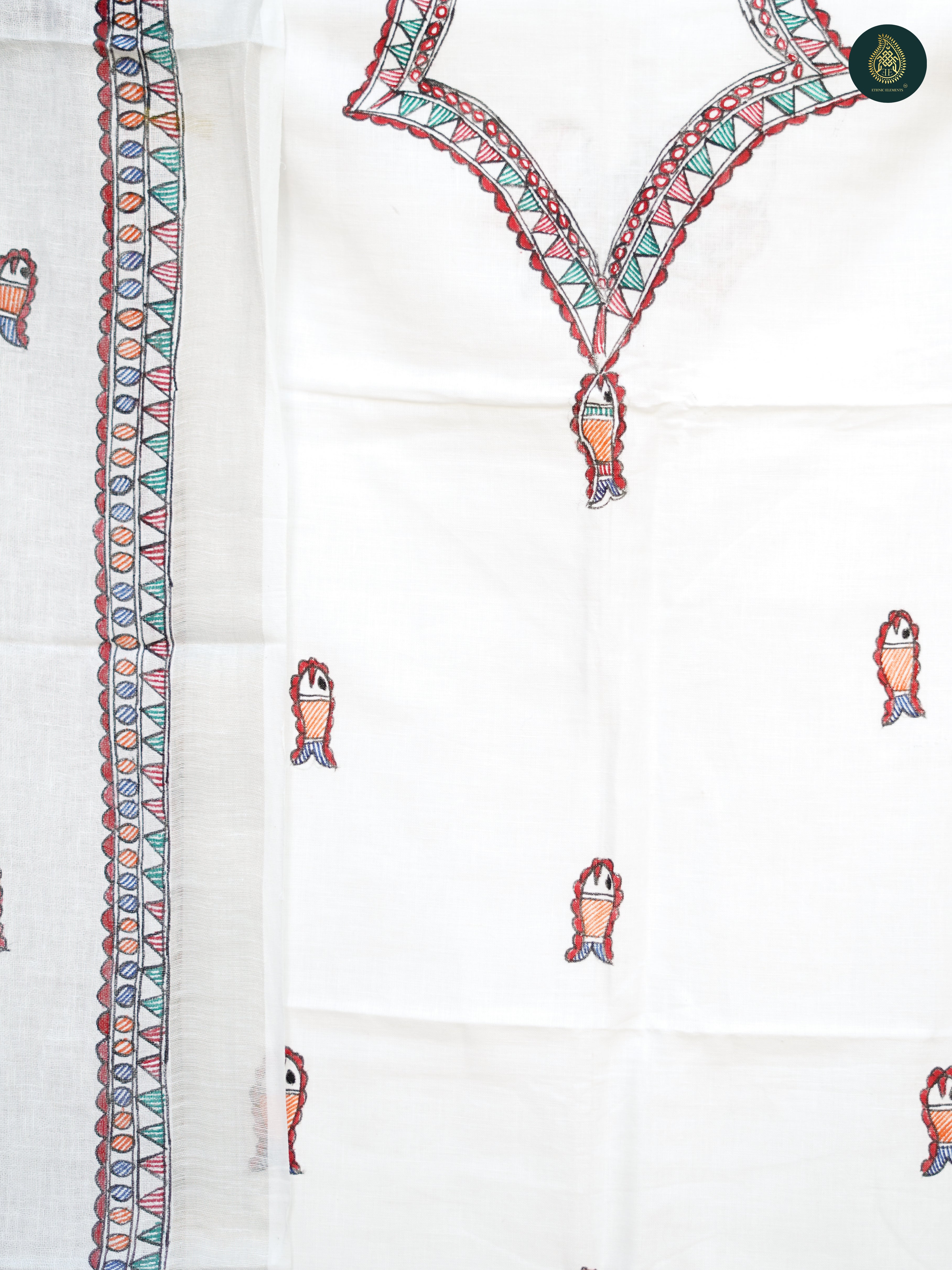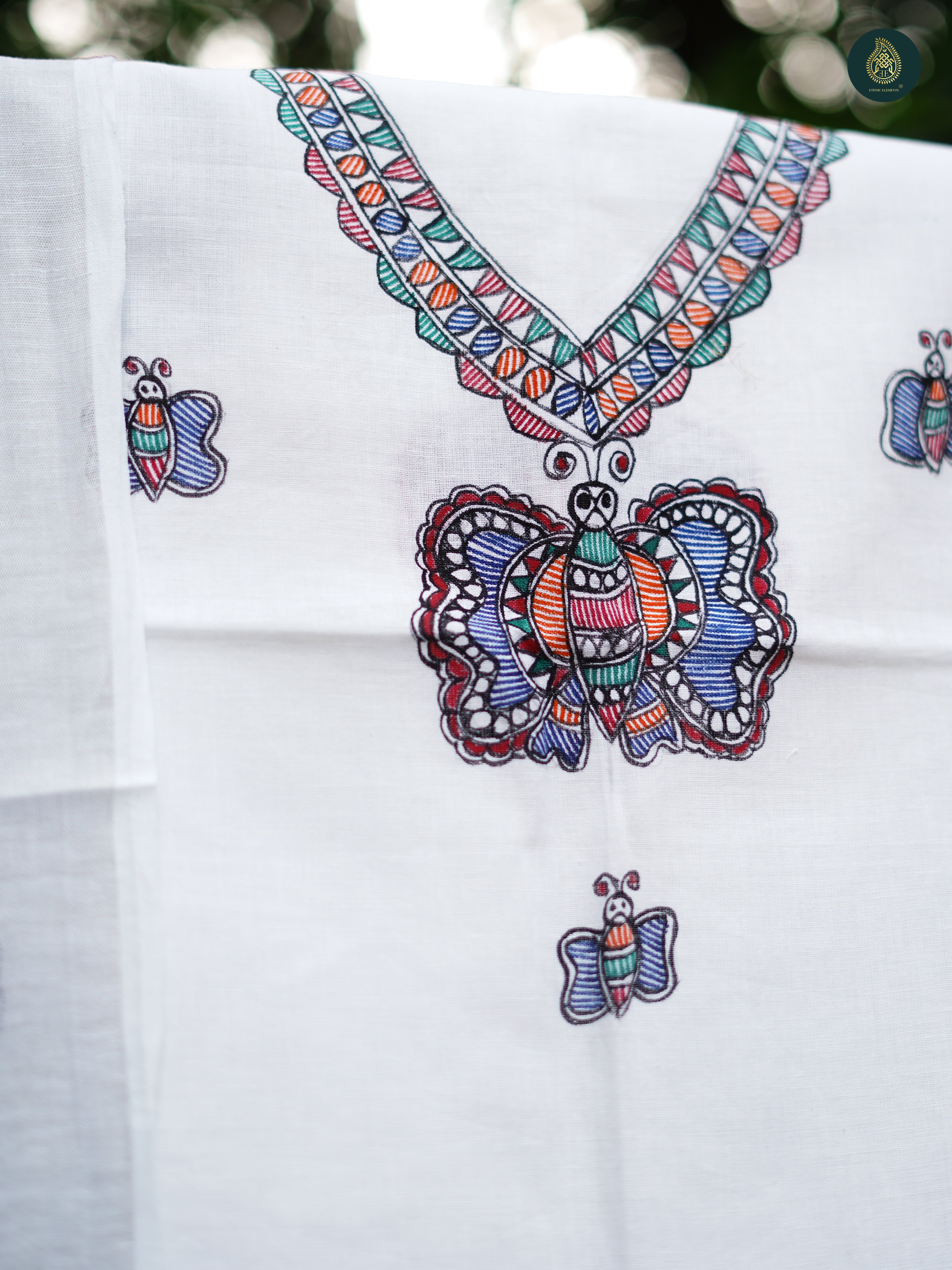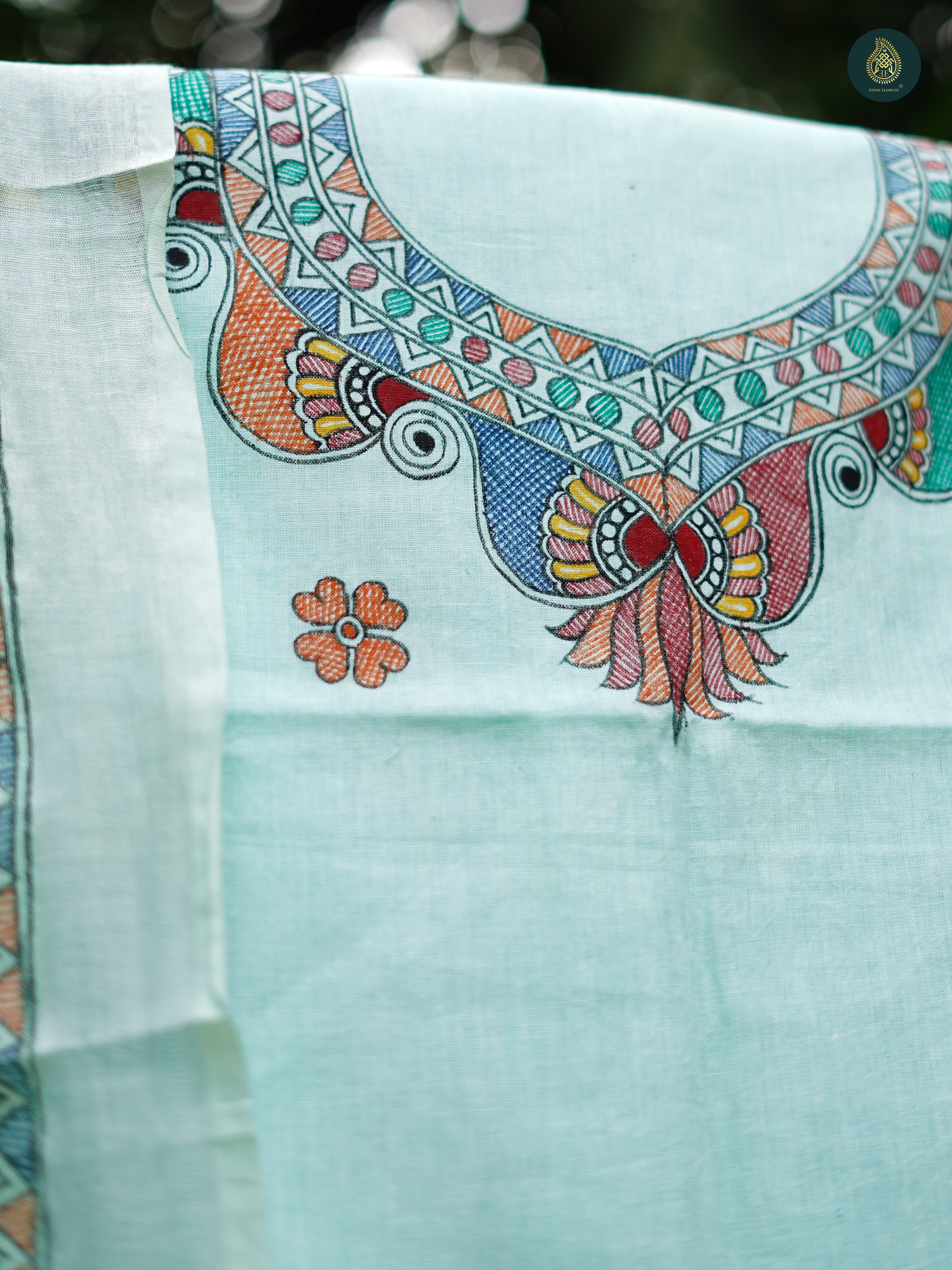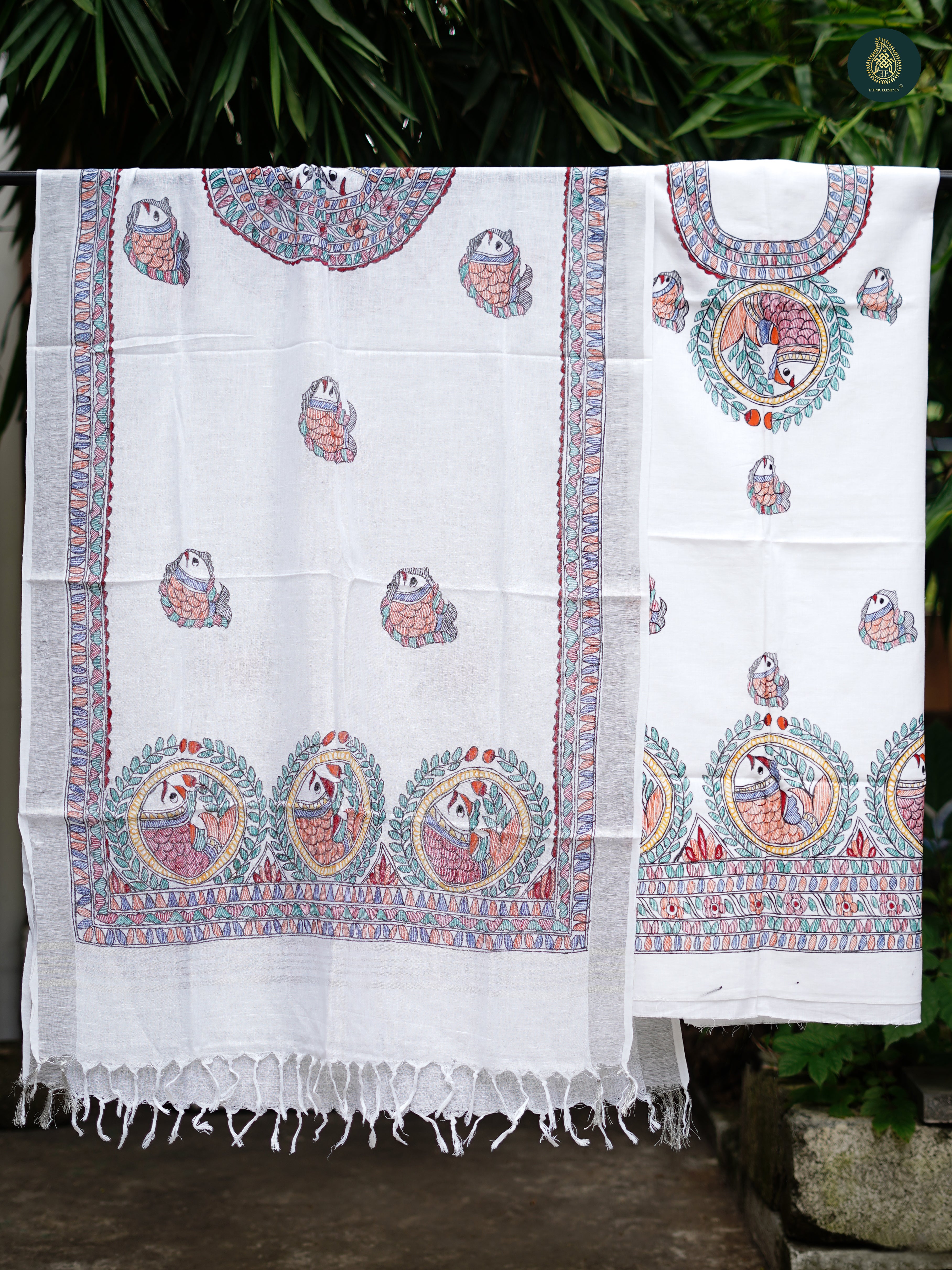 Authentic Original Hand-Painted Madhubani Suit Sets made from pure woven fabrics. Madhubani Art is a type of folk-art form. Each suit consists of line drawings filled with bright colors and contrasts or patterns. Only natural dyes and pigments are used for fabric color and painting.