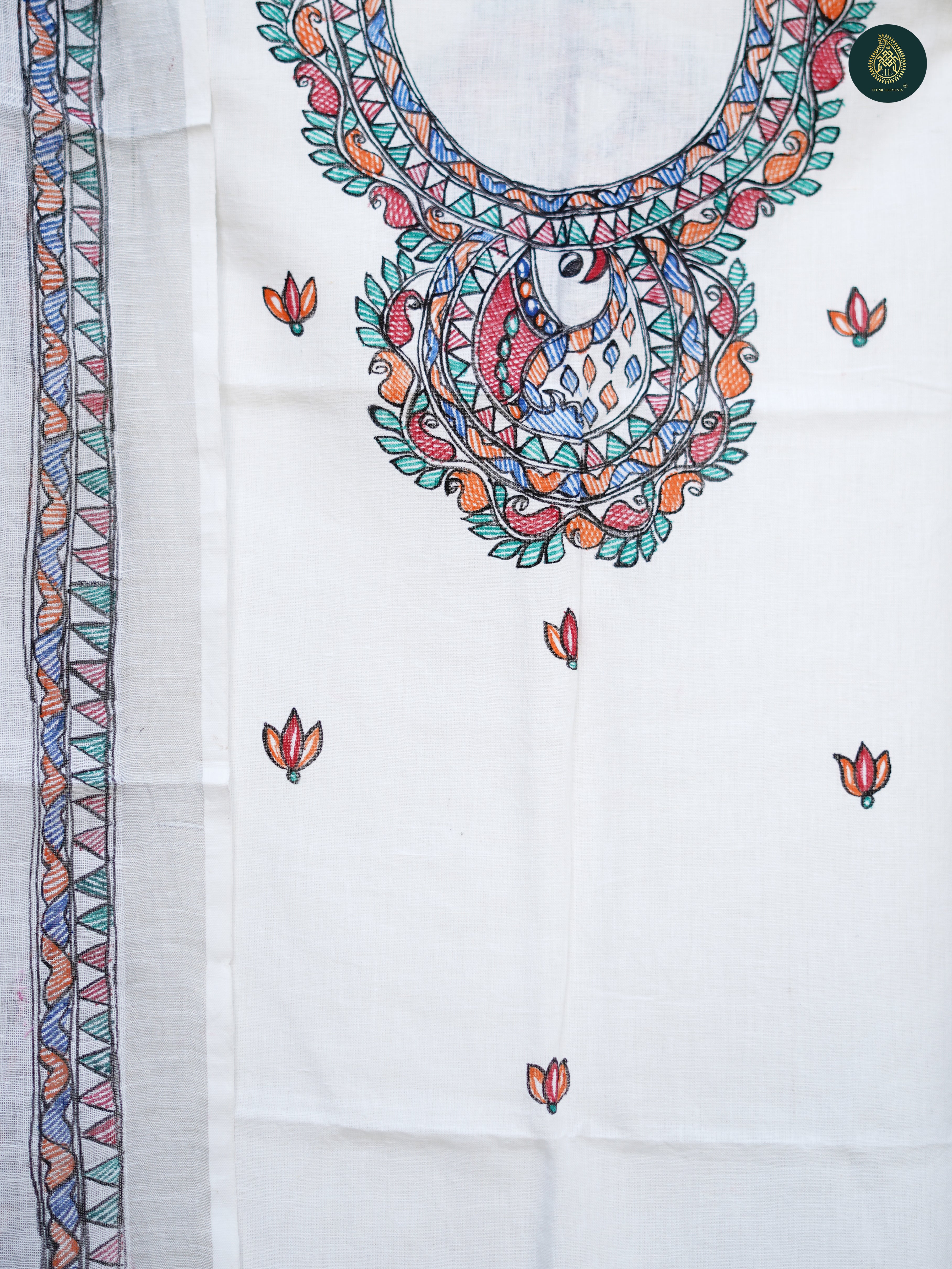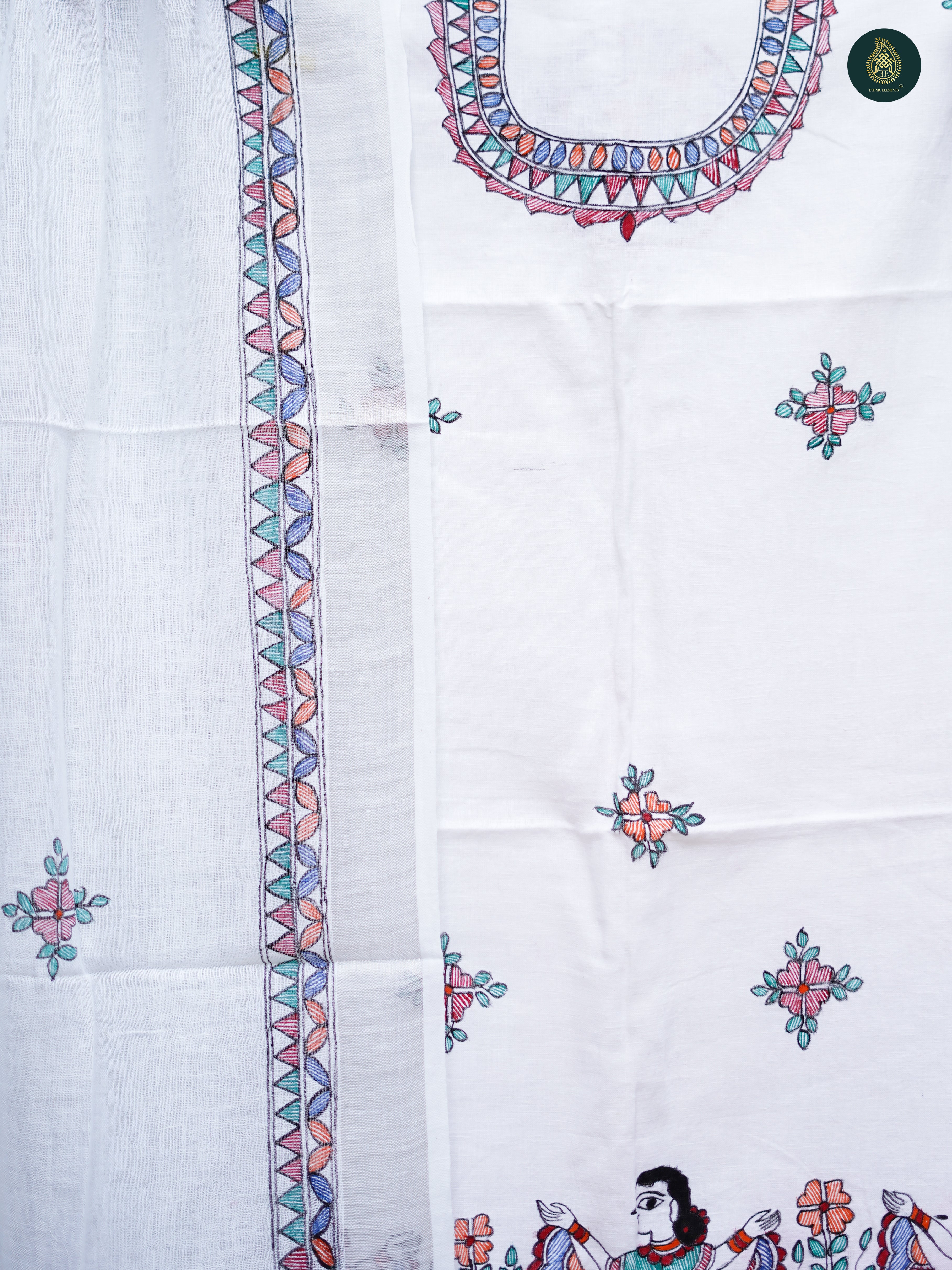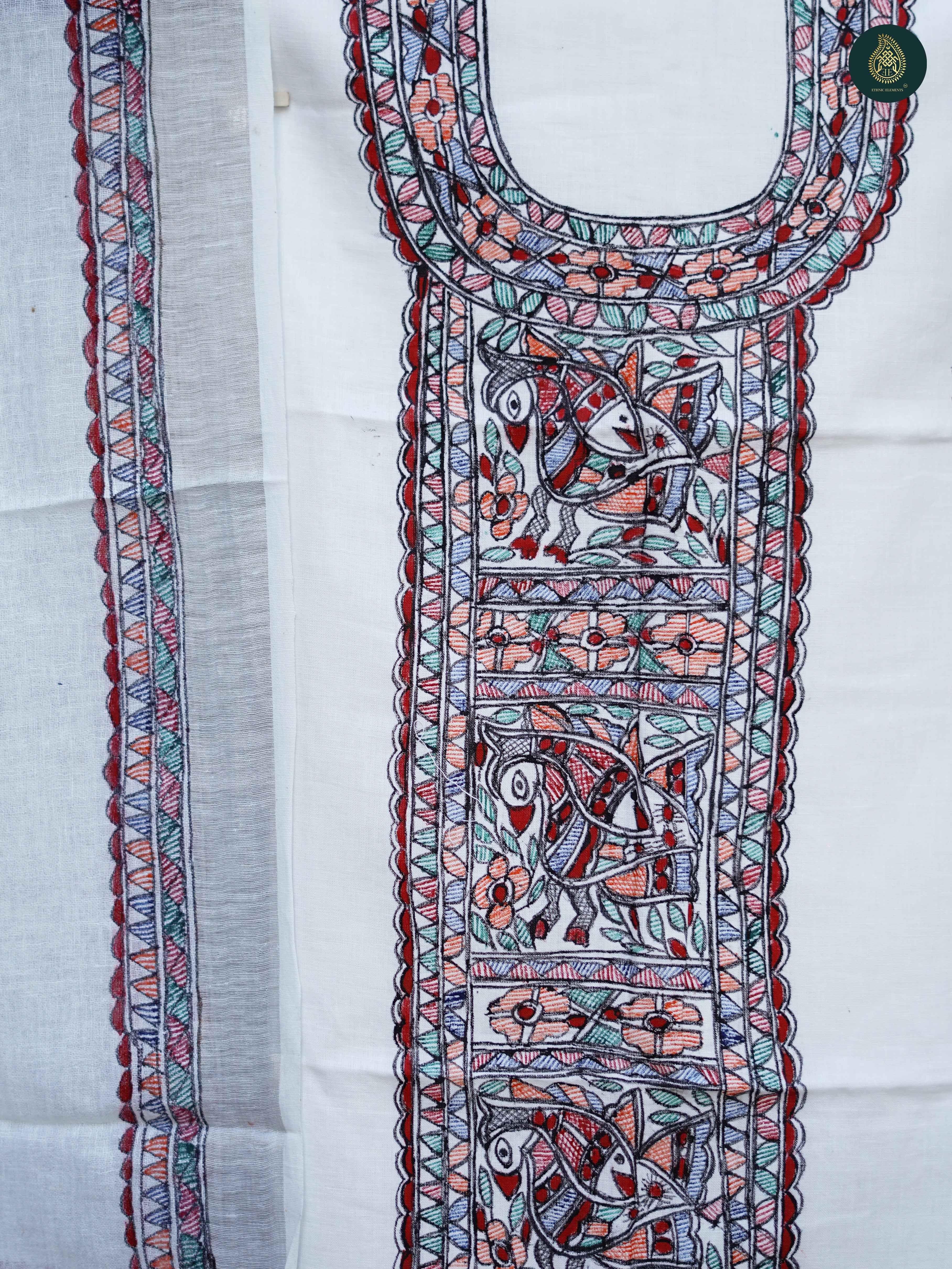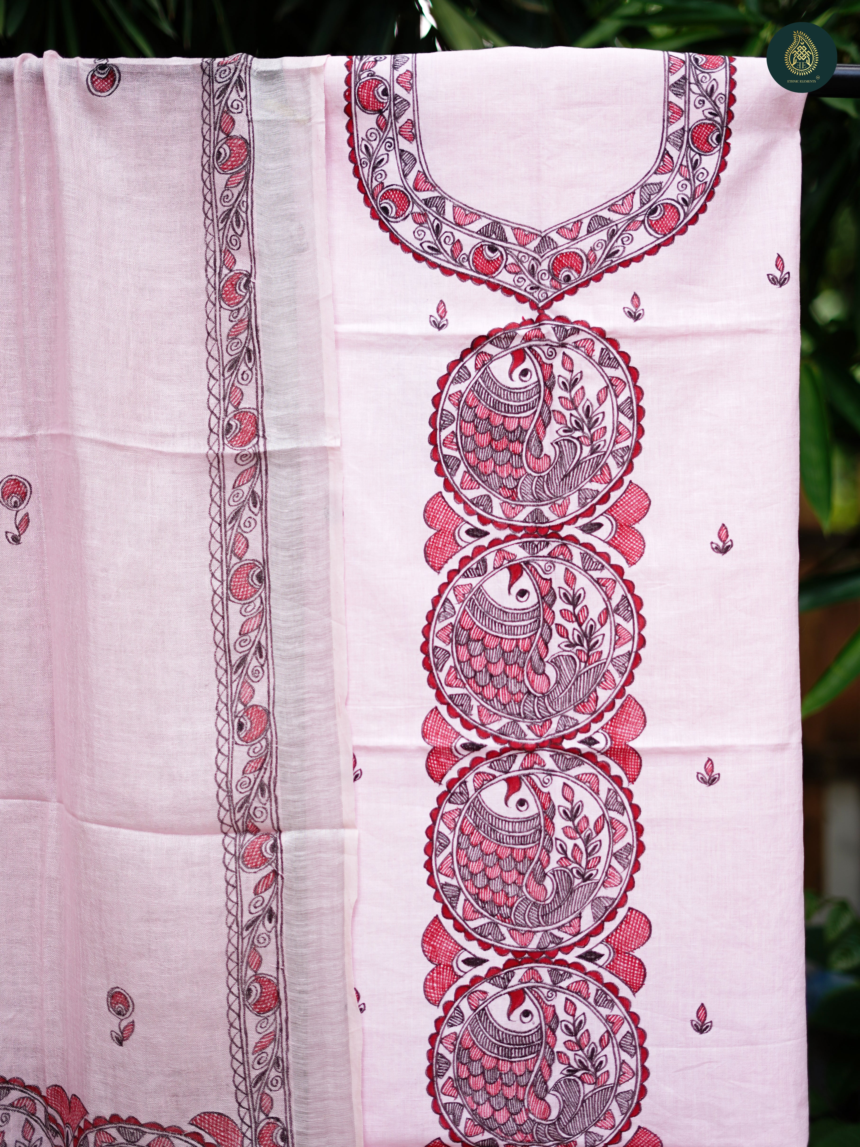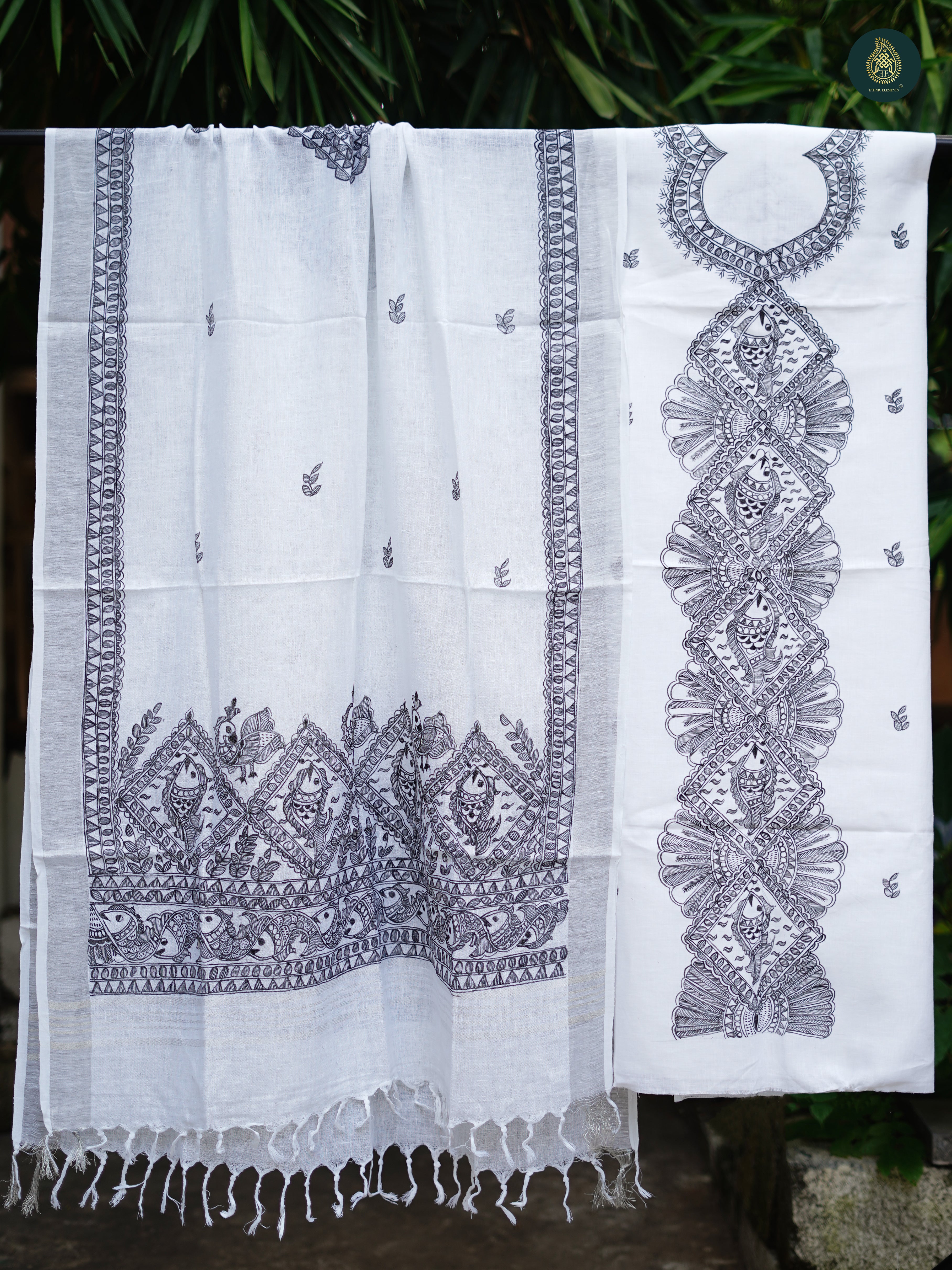 Authentic Original Hand-Painted Madhubani Suit Sets made from pure woven fabrics. Madhubani Art is a type of folk-art form. Each suit consists of line drawings filled with bright colors and contrasts or patterns. Only natural dyes and pigments are used for fabric color and painting.
