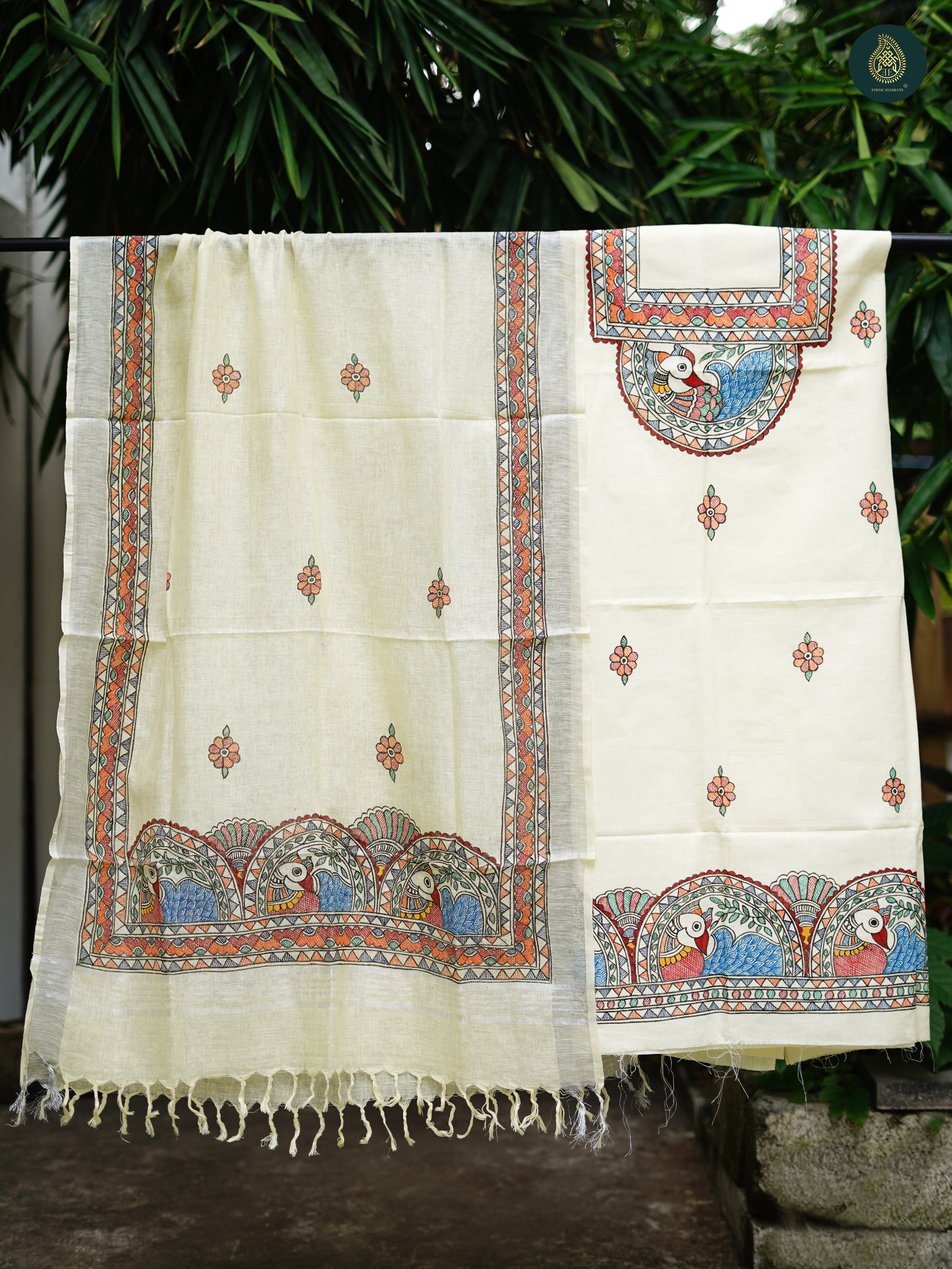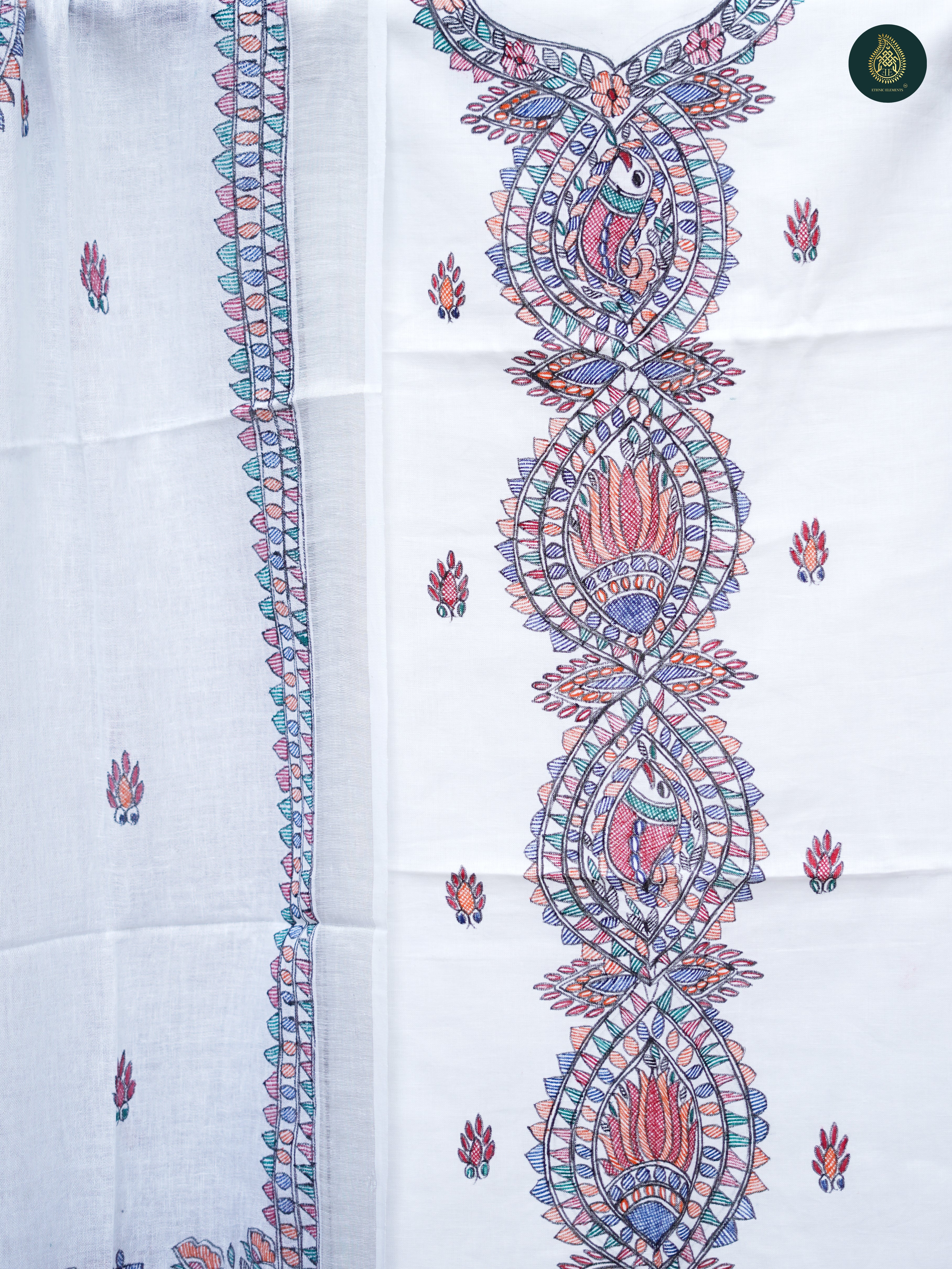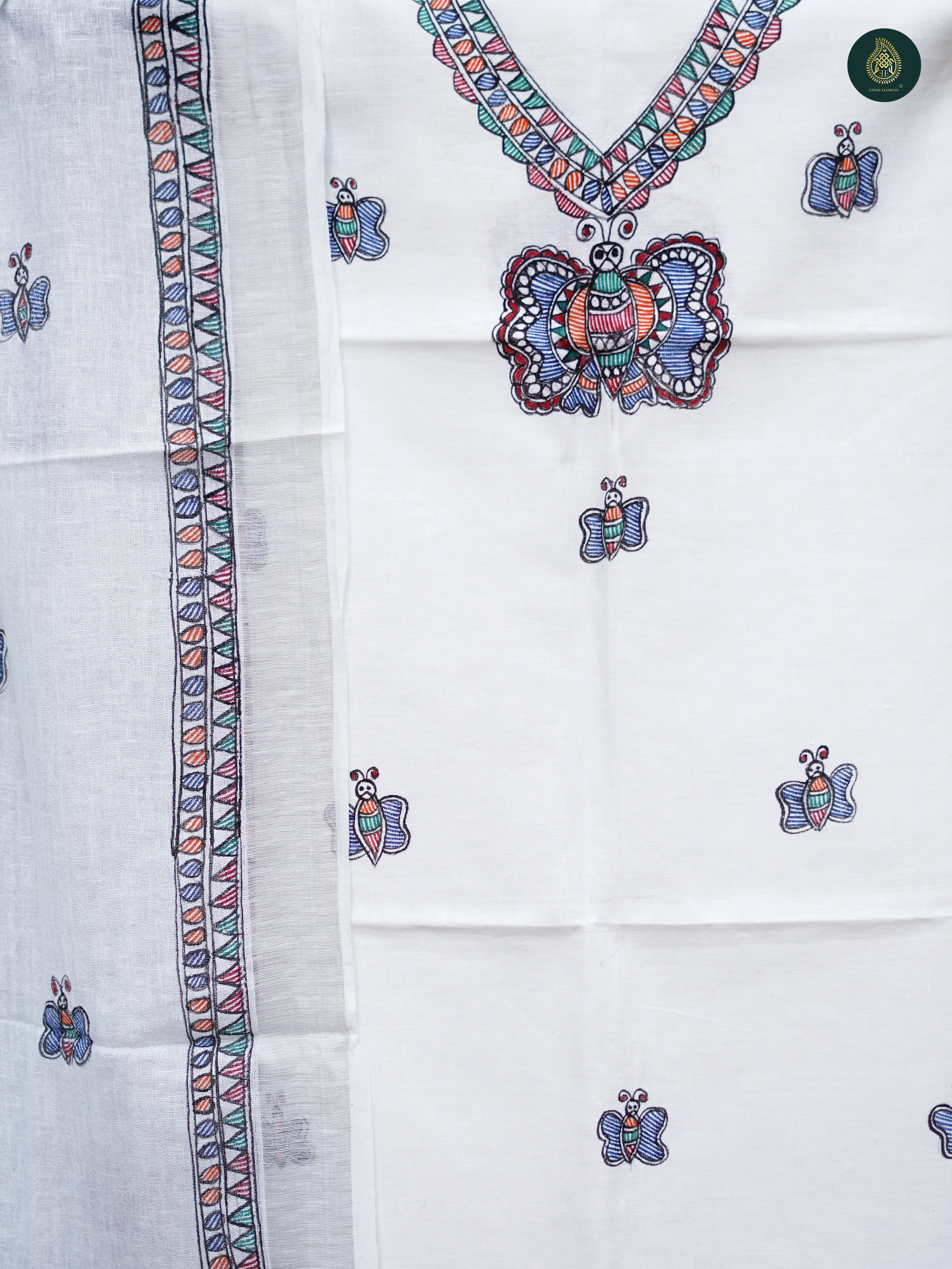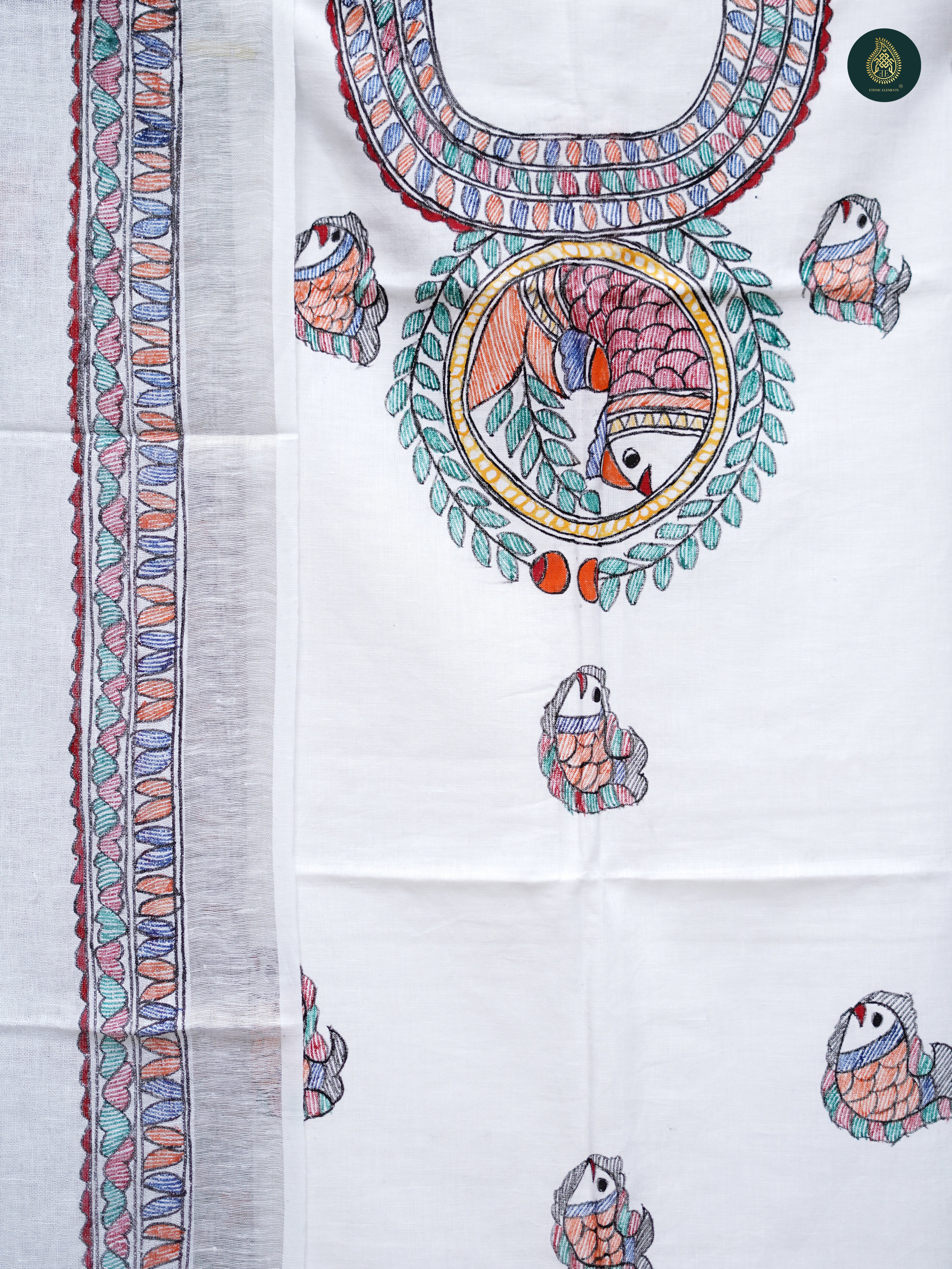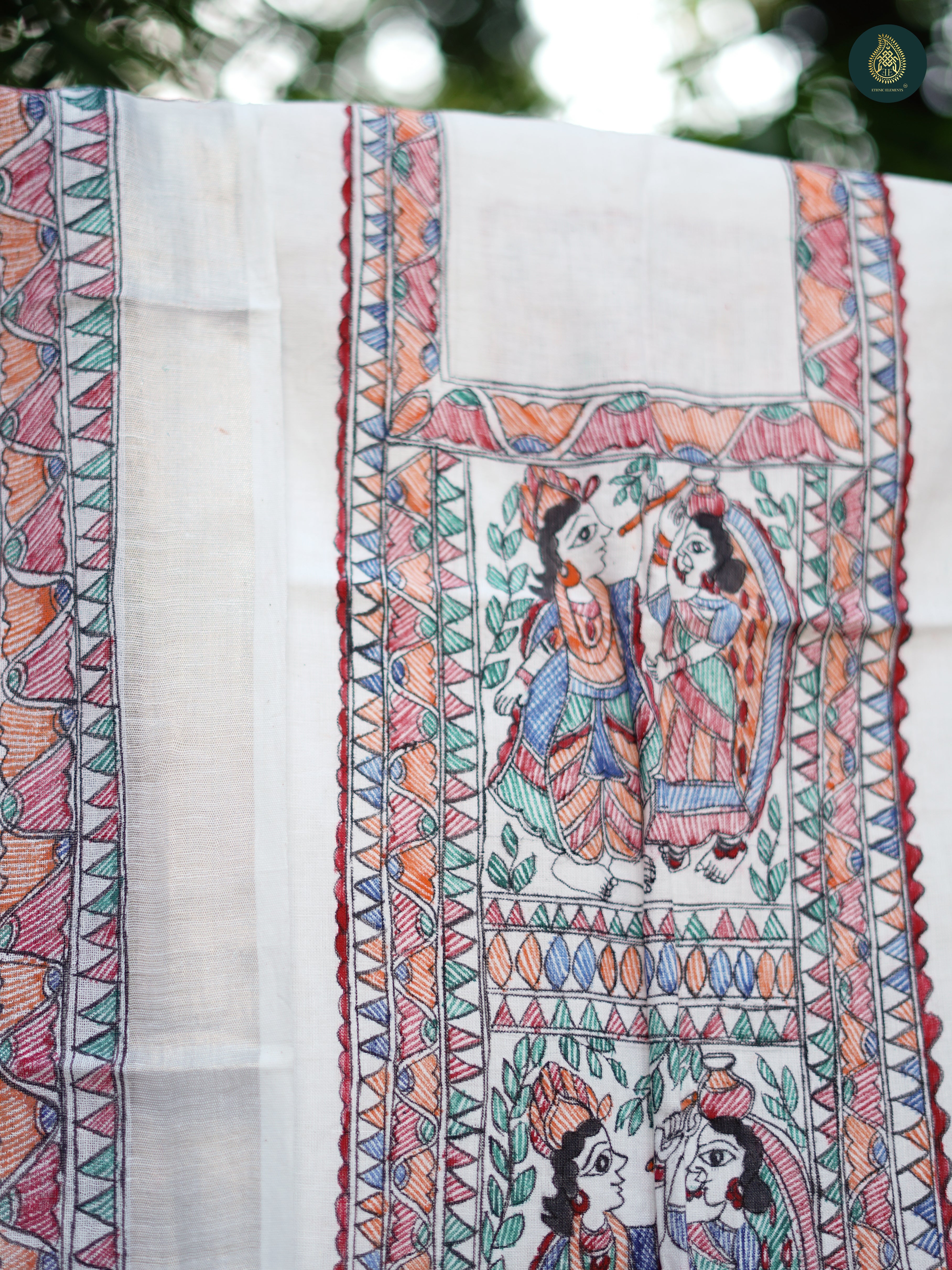Authentic Original Hand-Painted Madhubani Suit Sets made from pure woven fabrics. Madhubani Art is a type of folk-art form. Each suit consists of line drawings filled with bright colors and contrasts or patterns. Only natural dyes and pigments are used for fabric color and painting.
