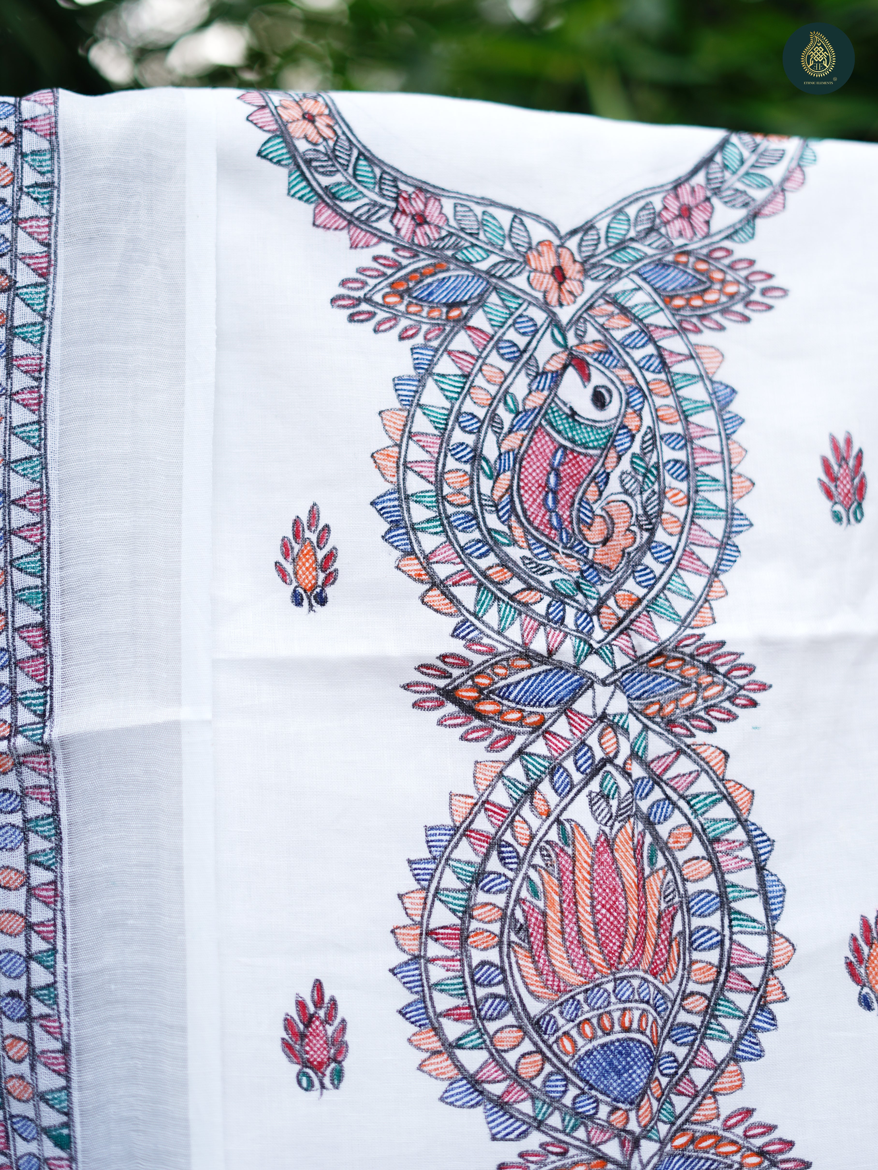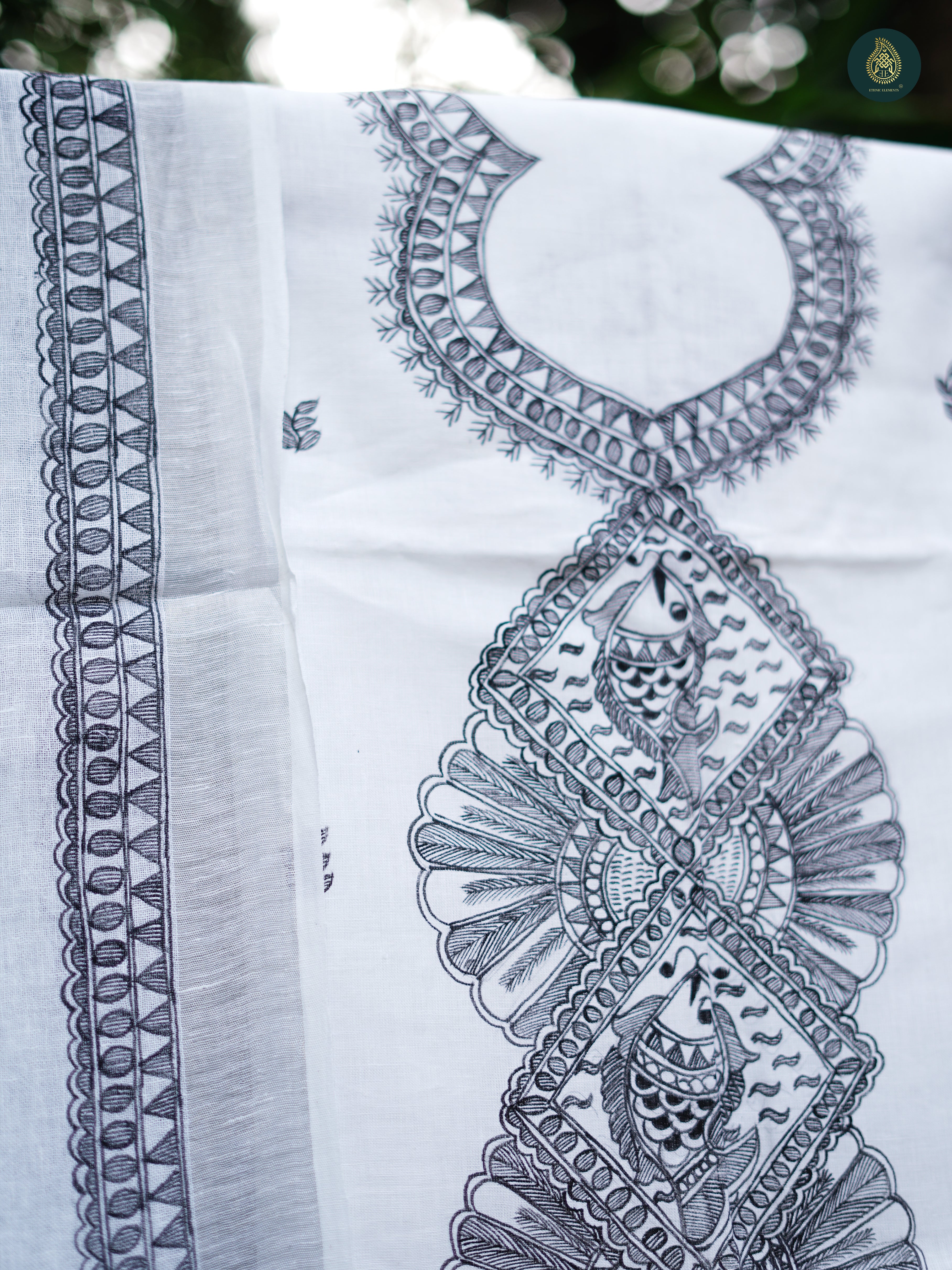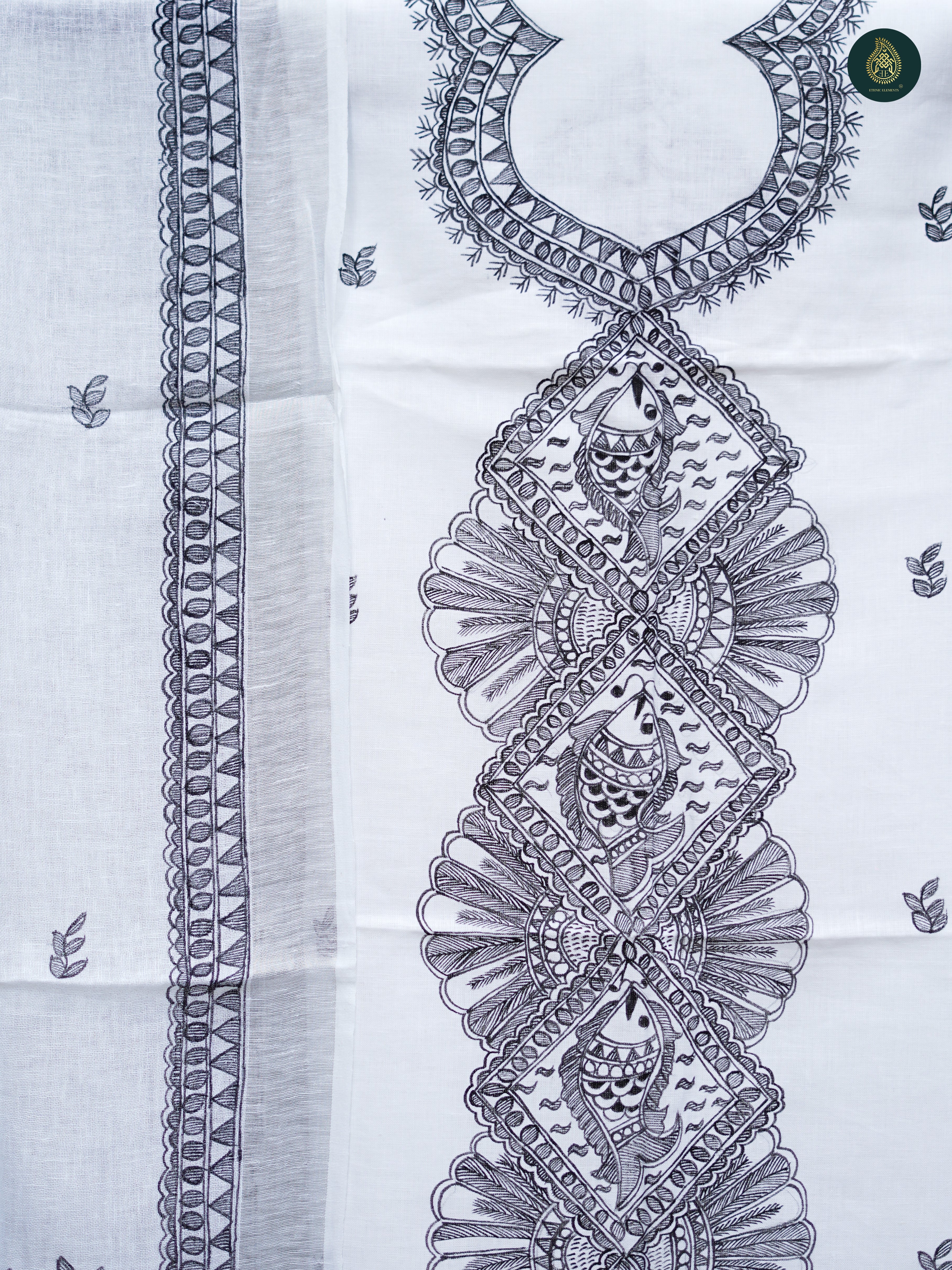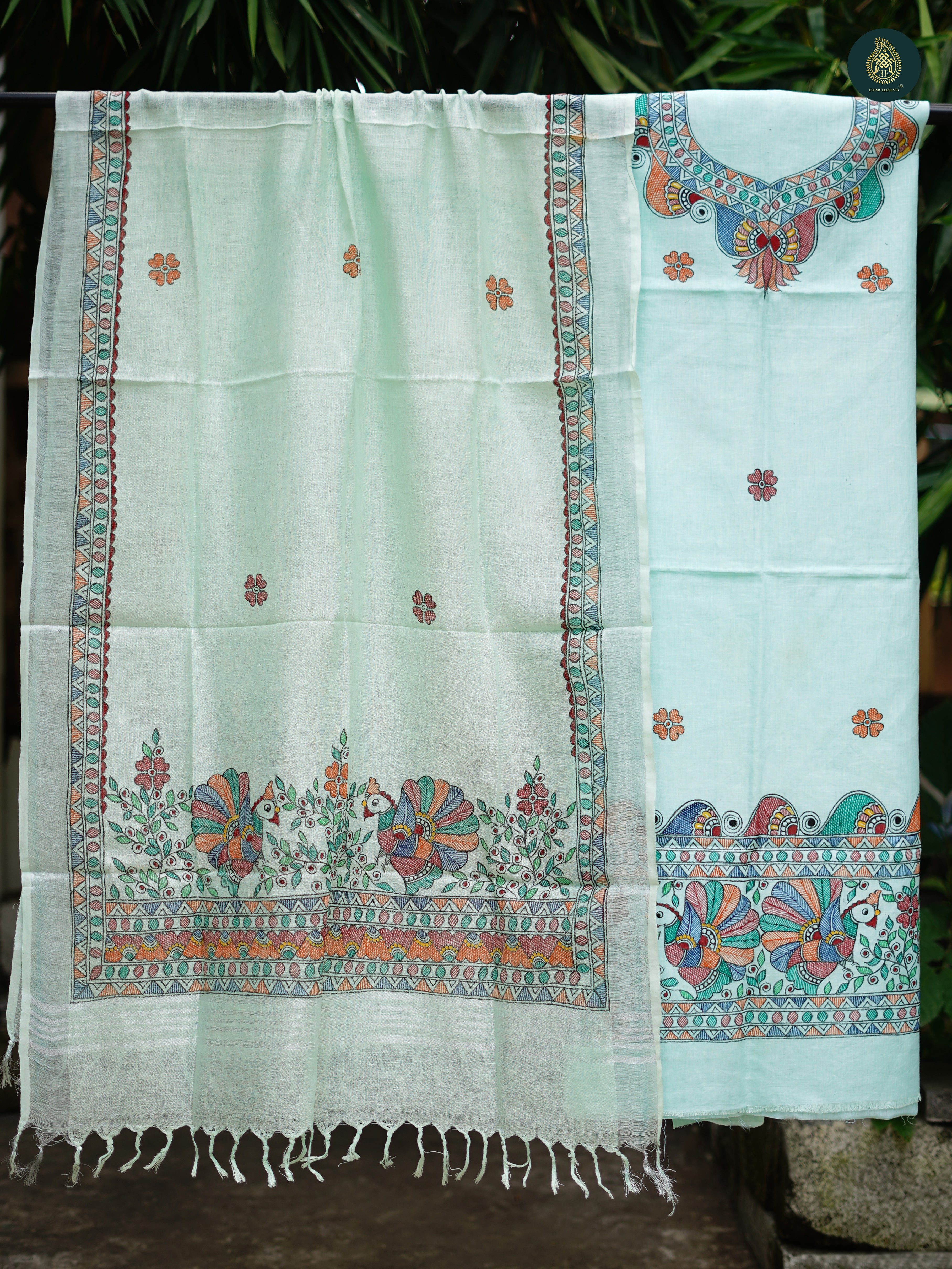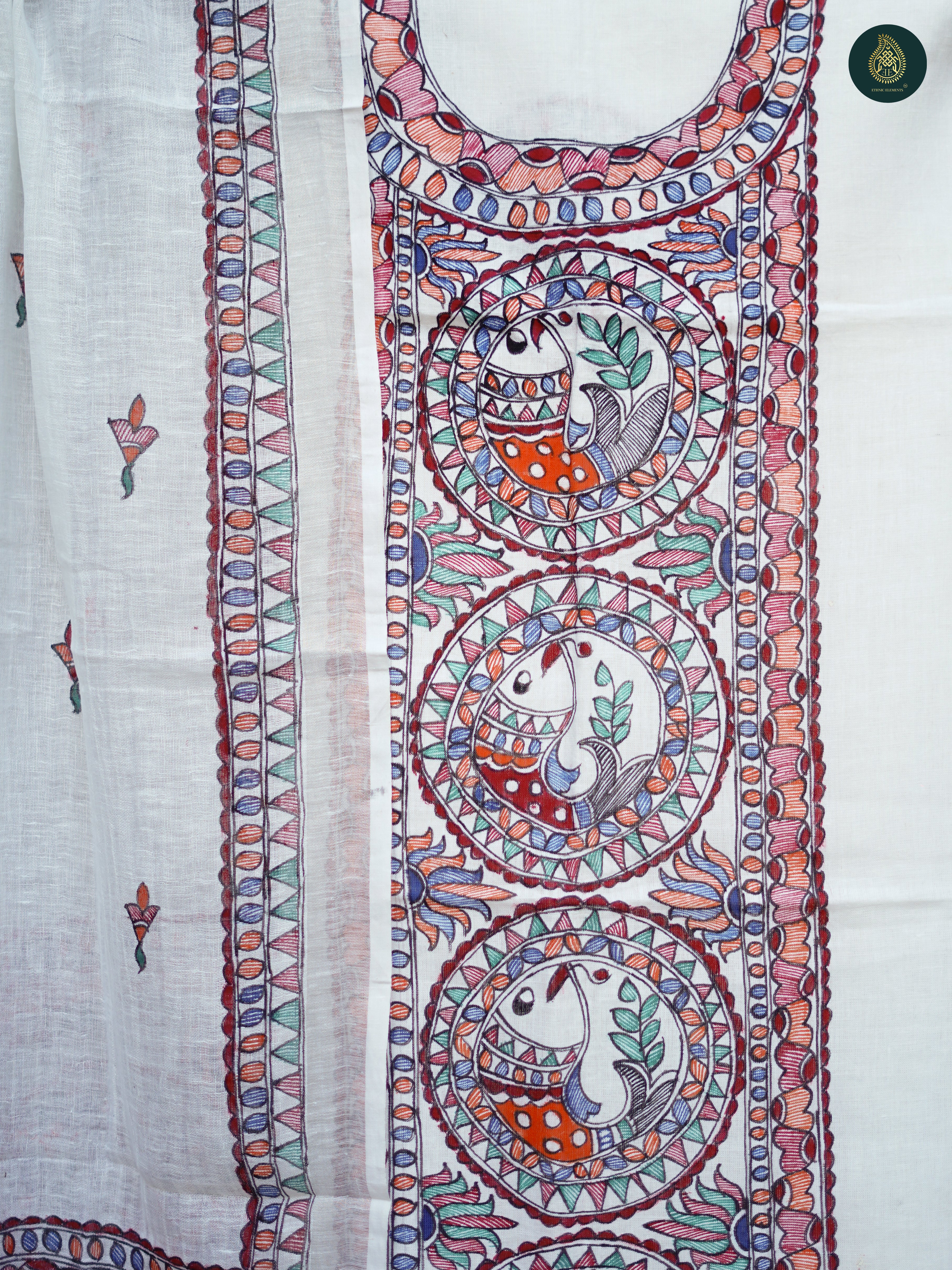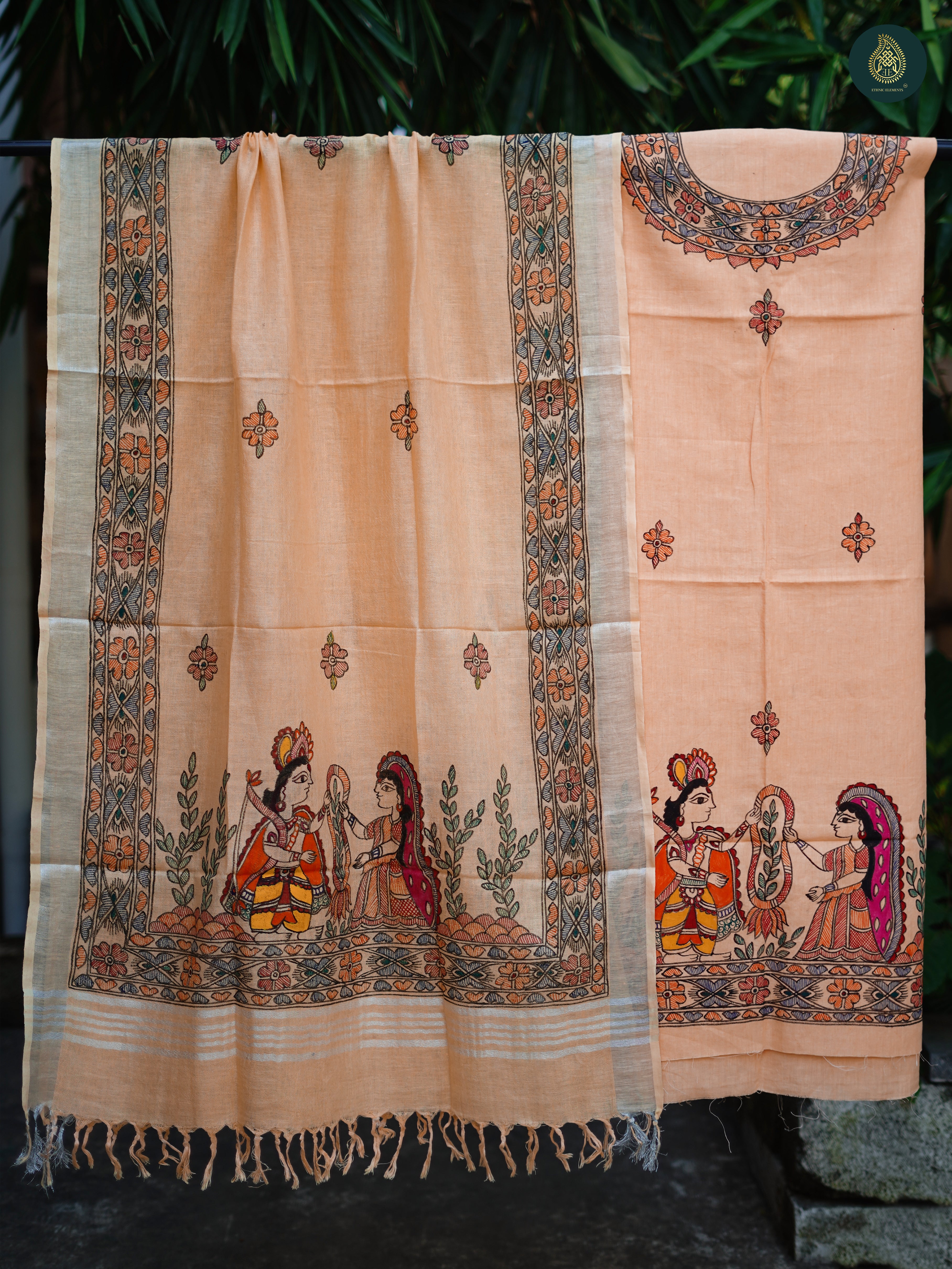 Authentic Original Hand-Painted Madhubani Suit Sets made from pure woven fabrics. Madhubani Art is a type of folk-art form. Each suit consists of line drawings filled with bright colors and contrasts or patterns. Only natural dyes and pigments are used for fabric color and painting.