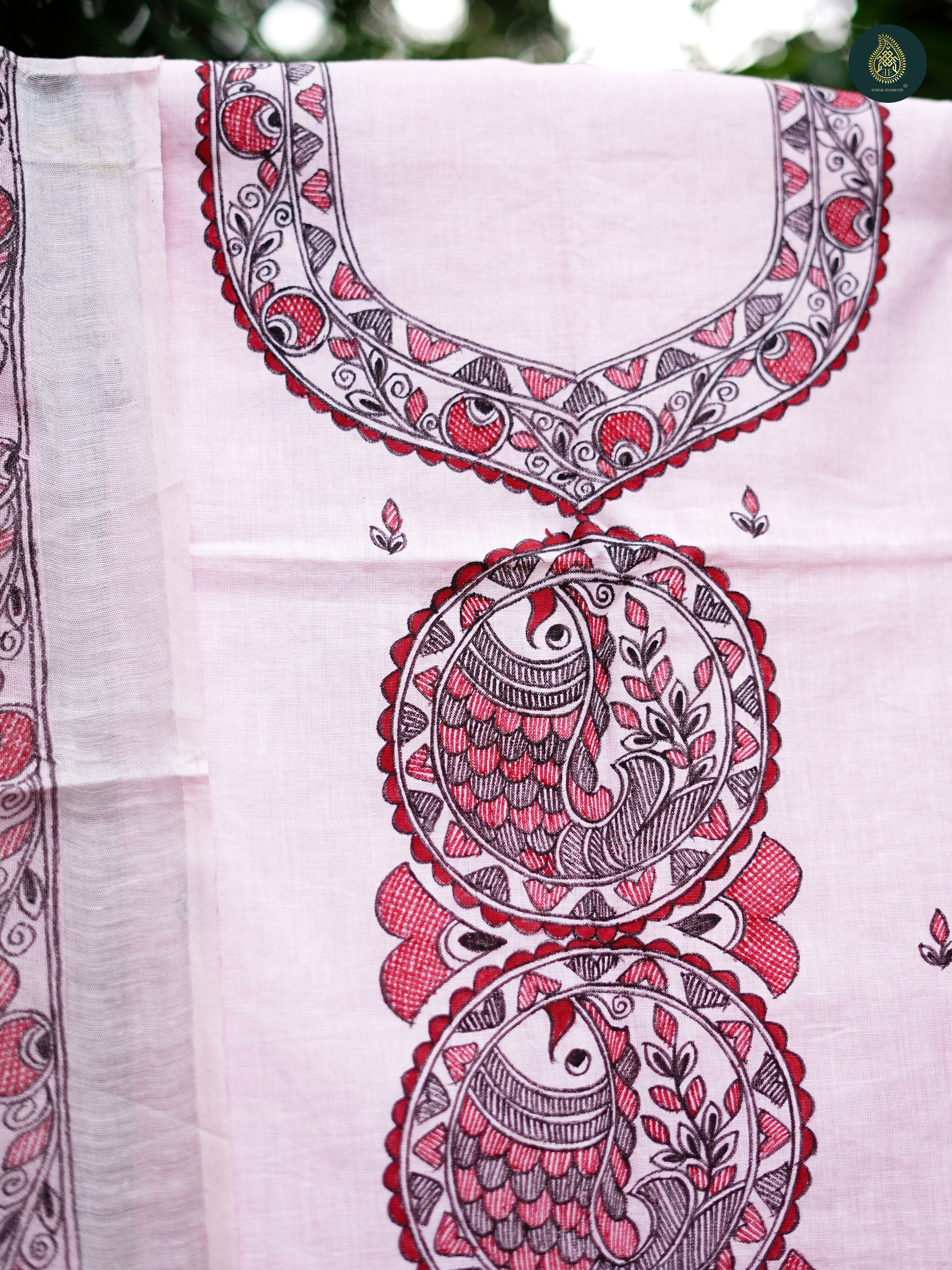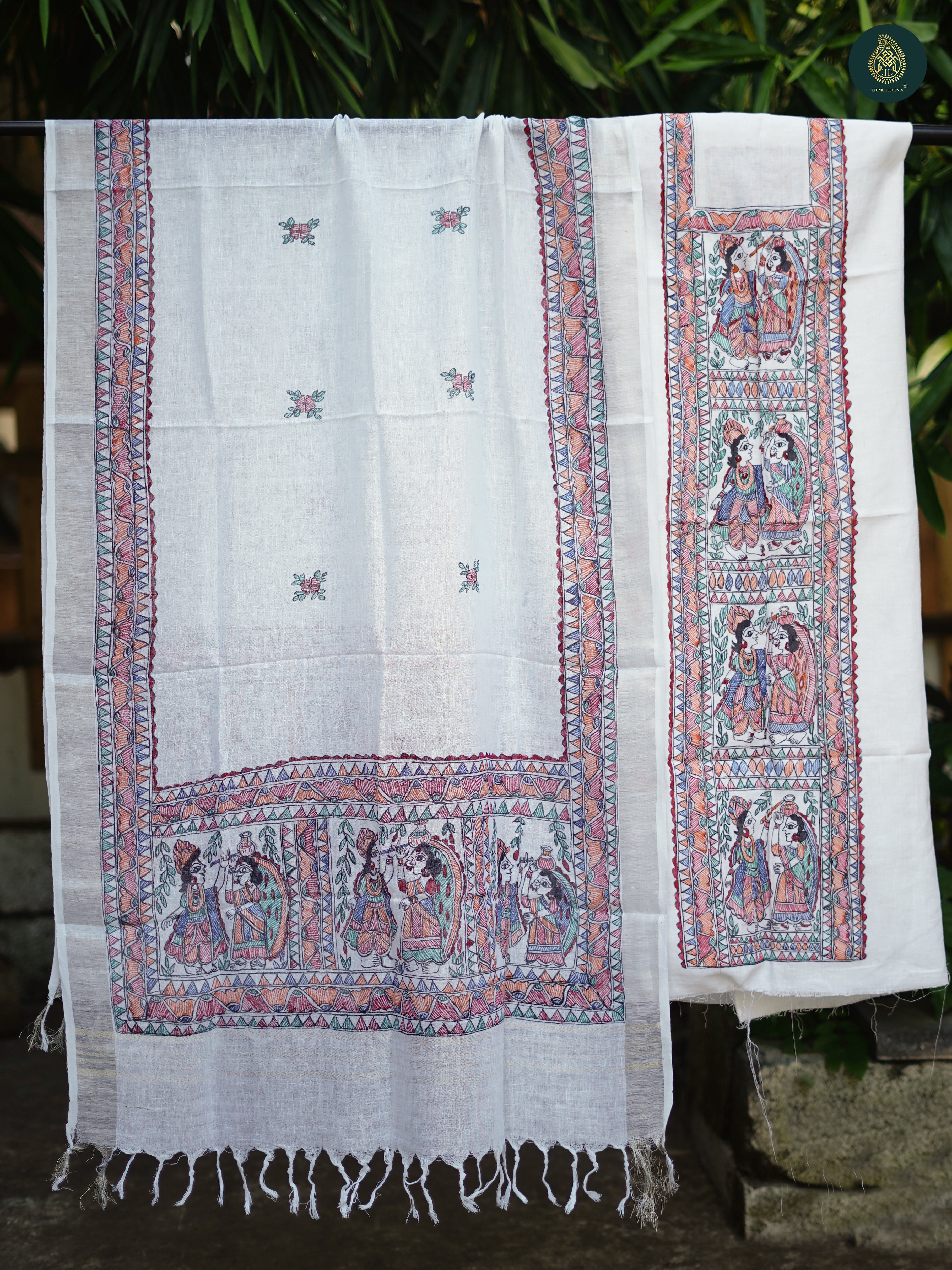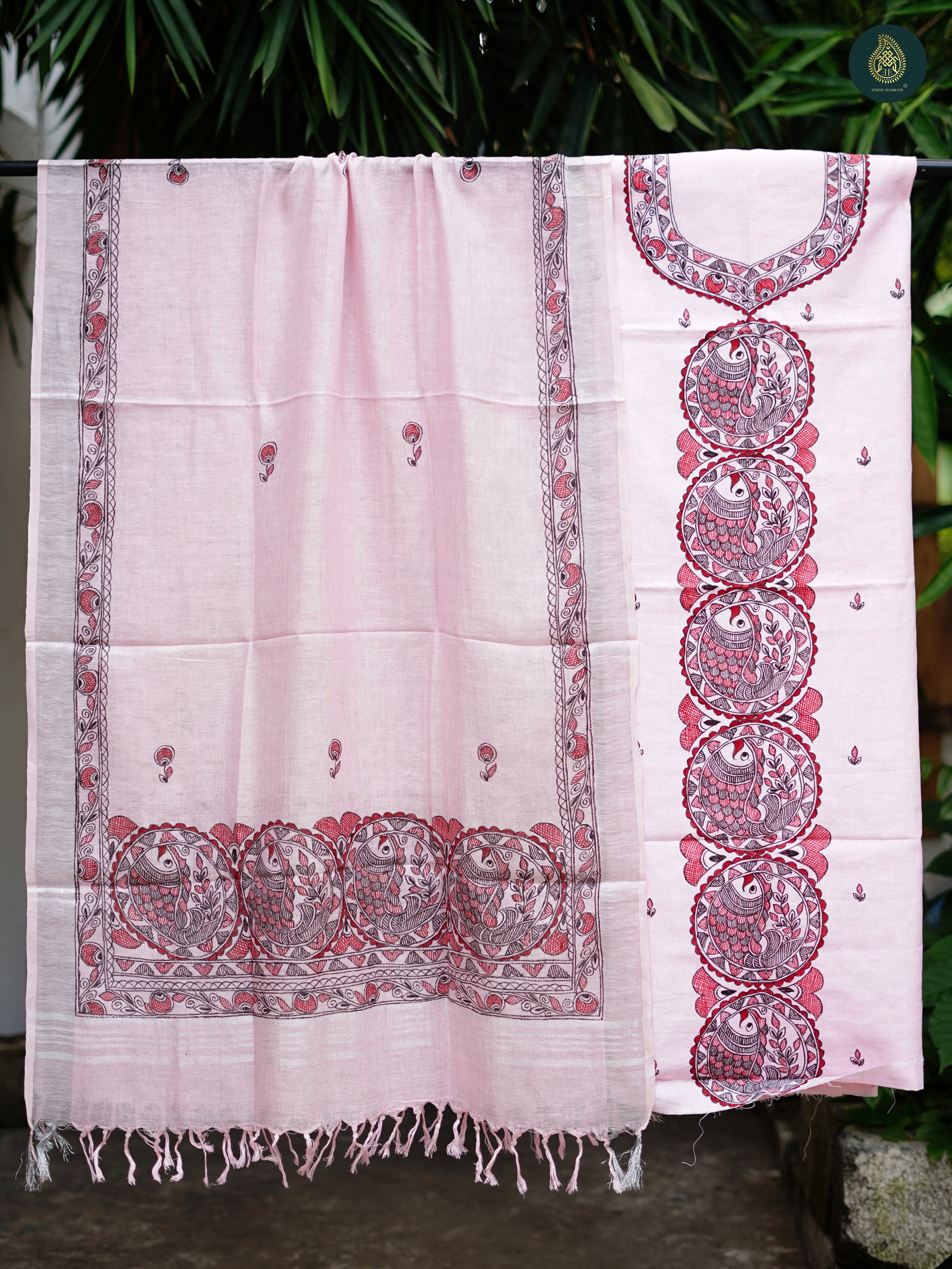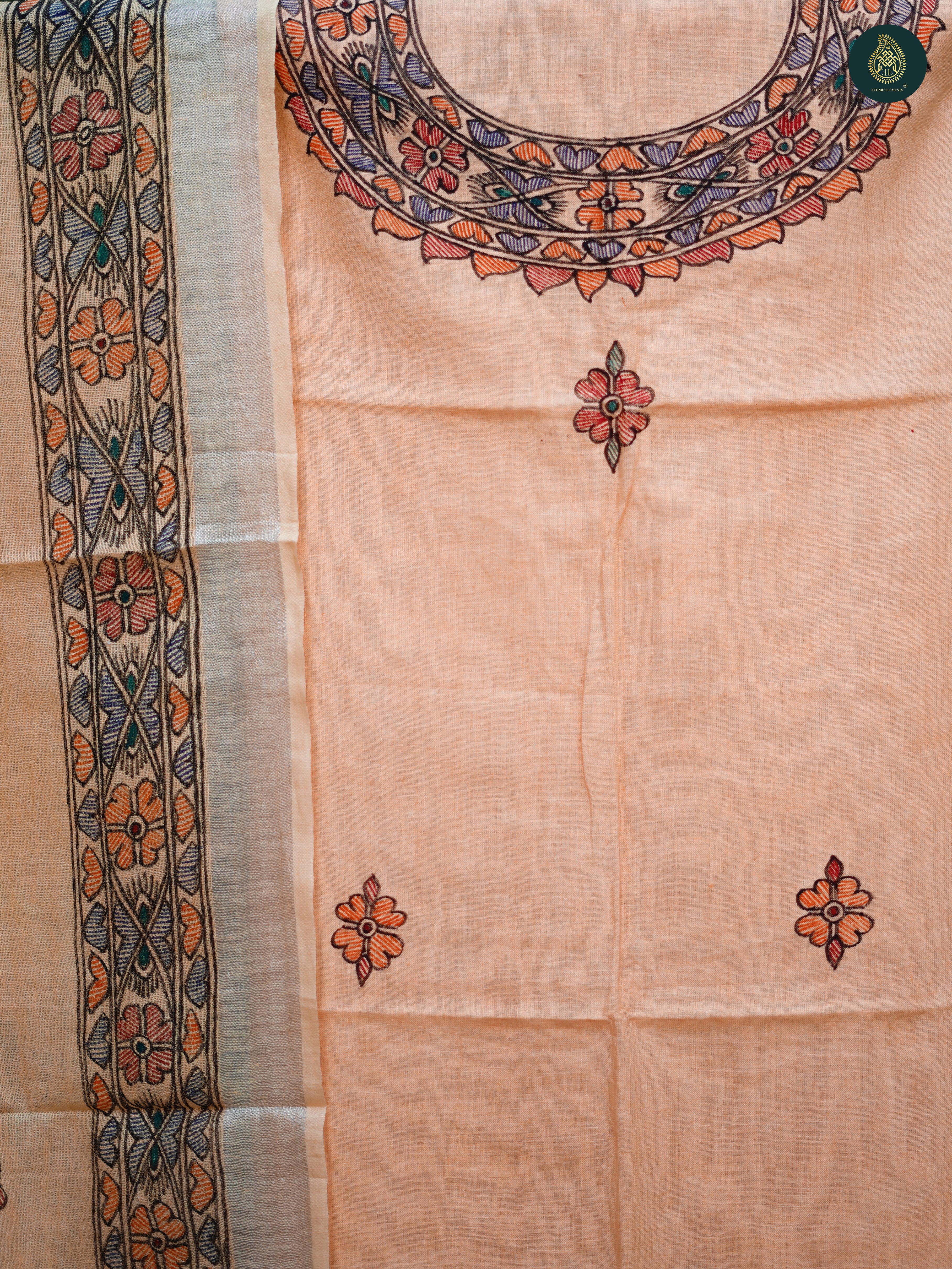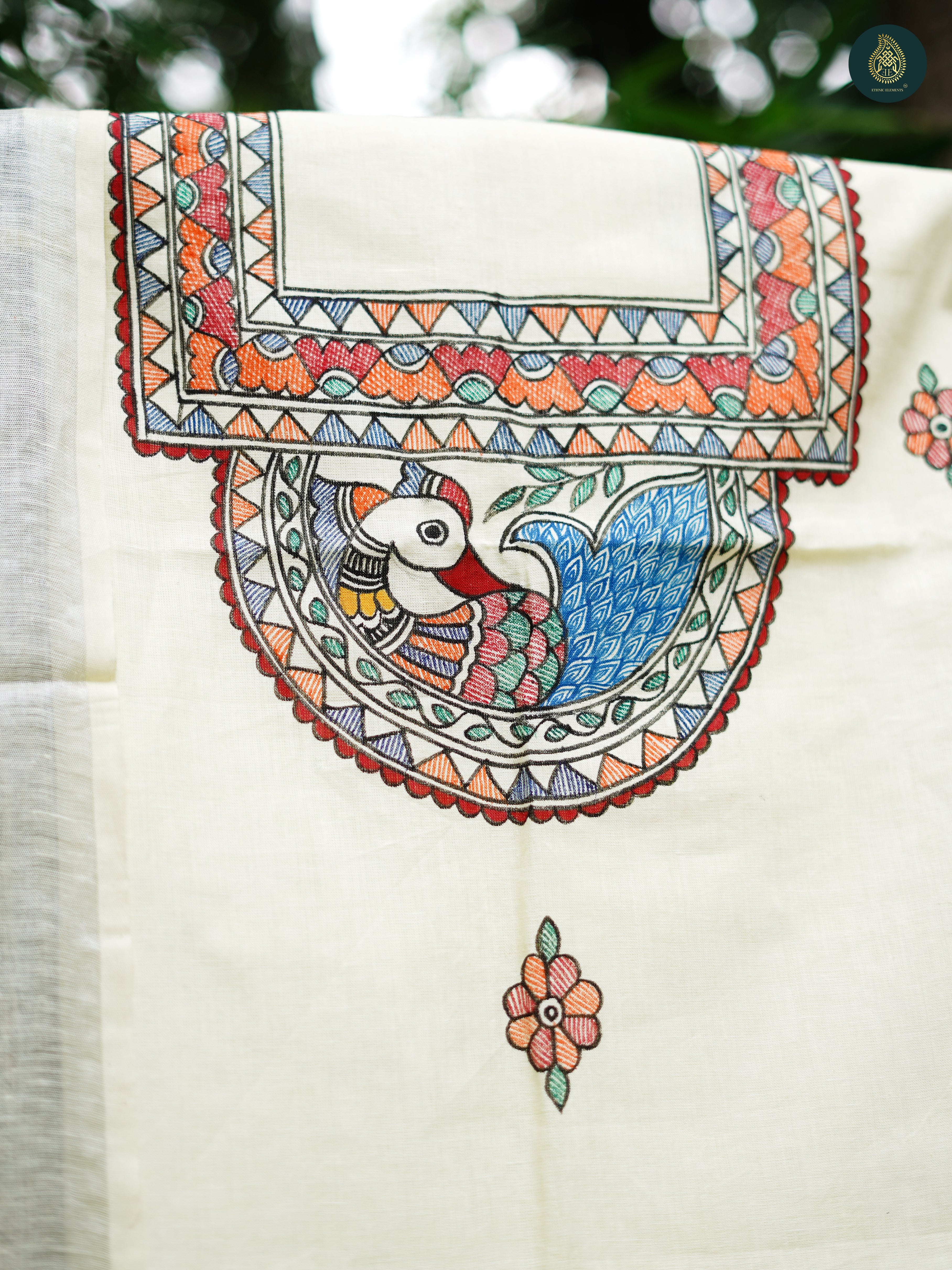 Authentic Original Hand-Painted Madhubani Suit Sets made from pure woven fabrics. Madhubani Art is a type of folk-art form. Each suit consists of line drawings filled with bright colors and contrasts or patterns. Only natural dyes and pigments are used for fabric color and painting.