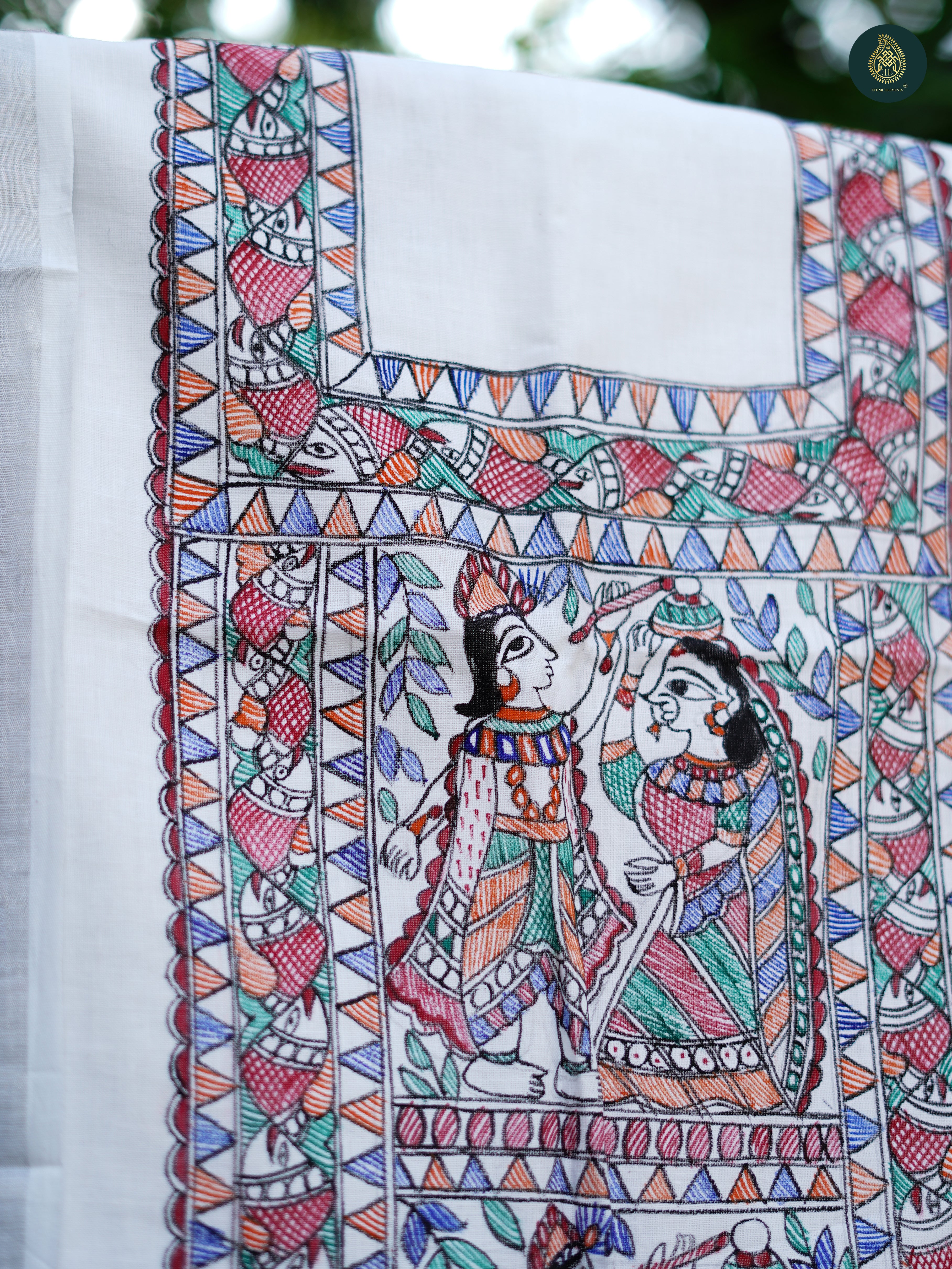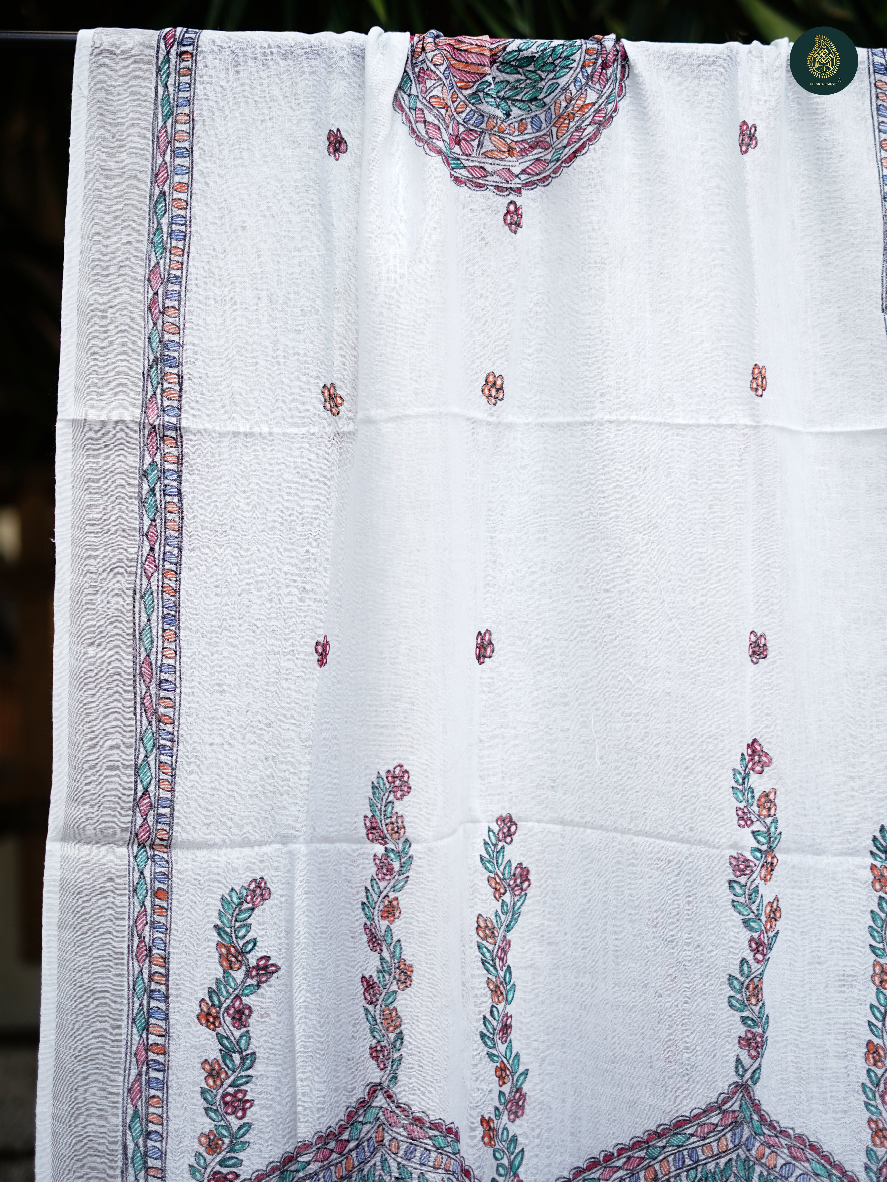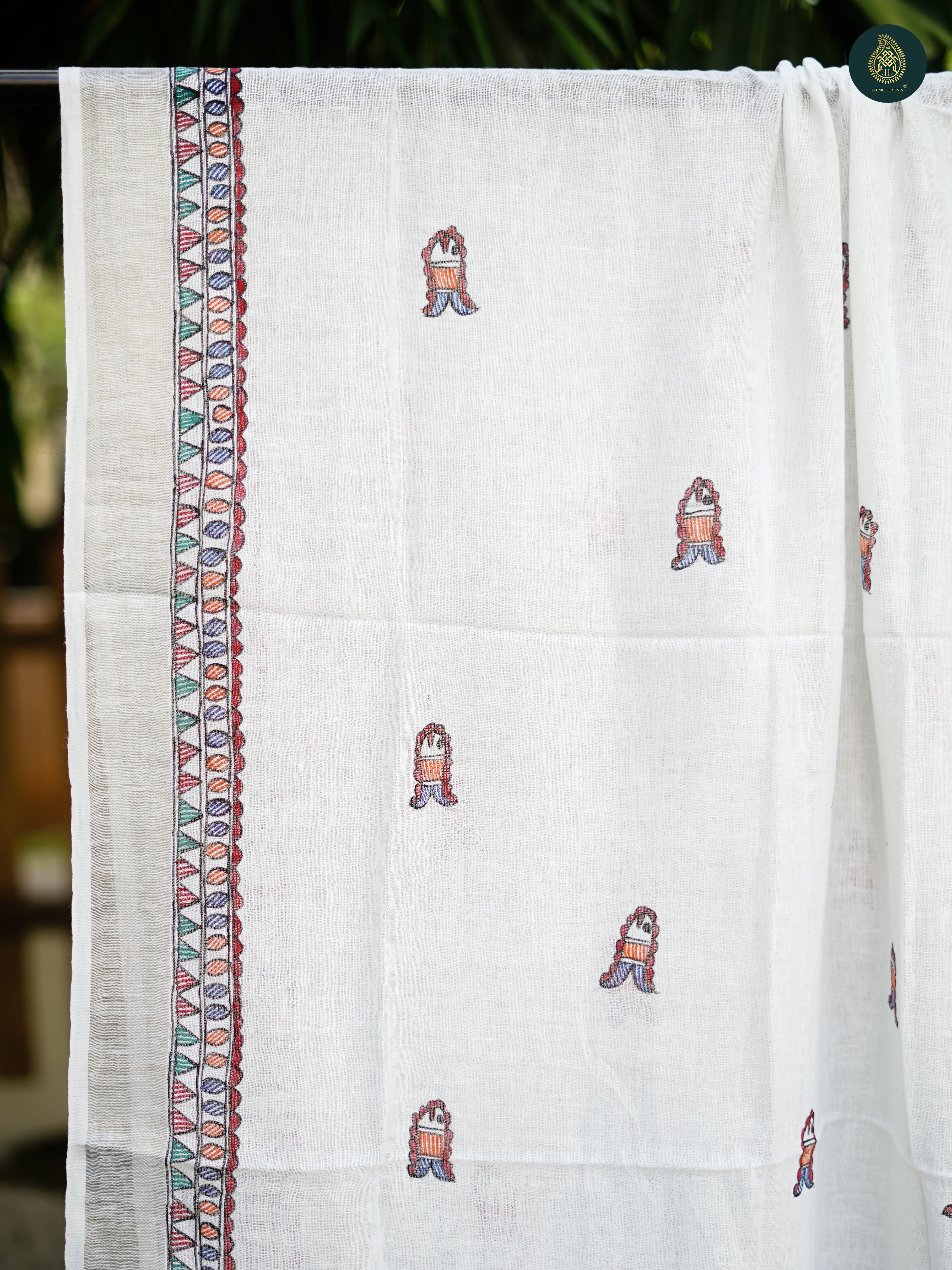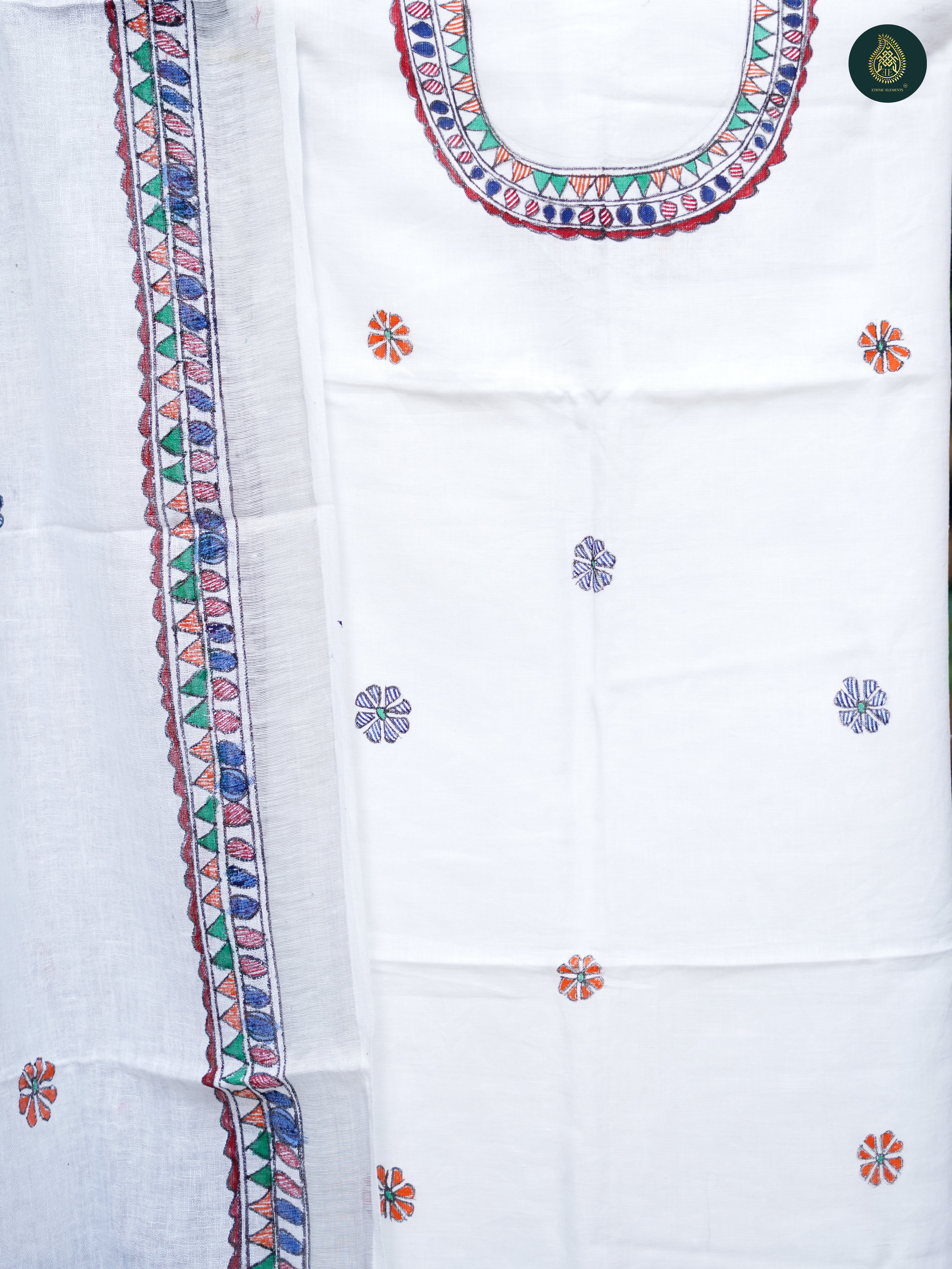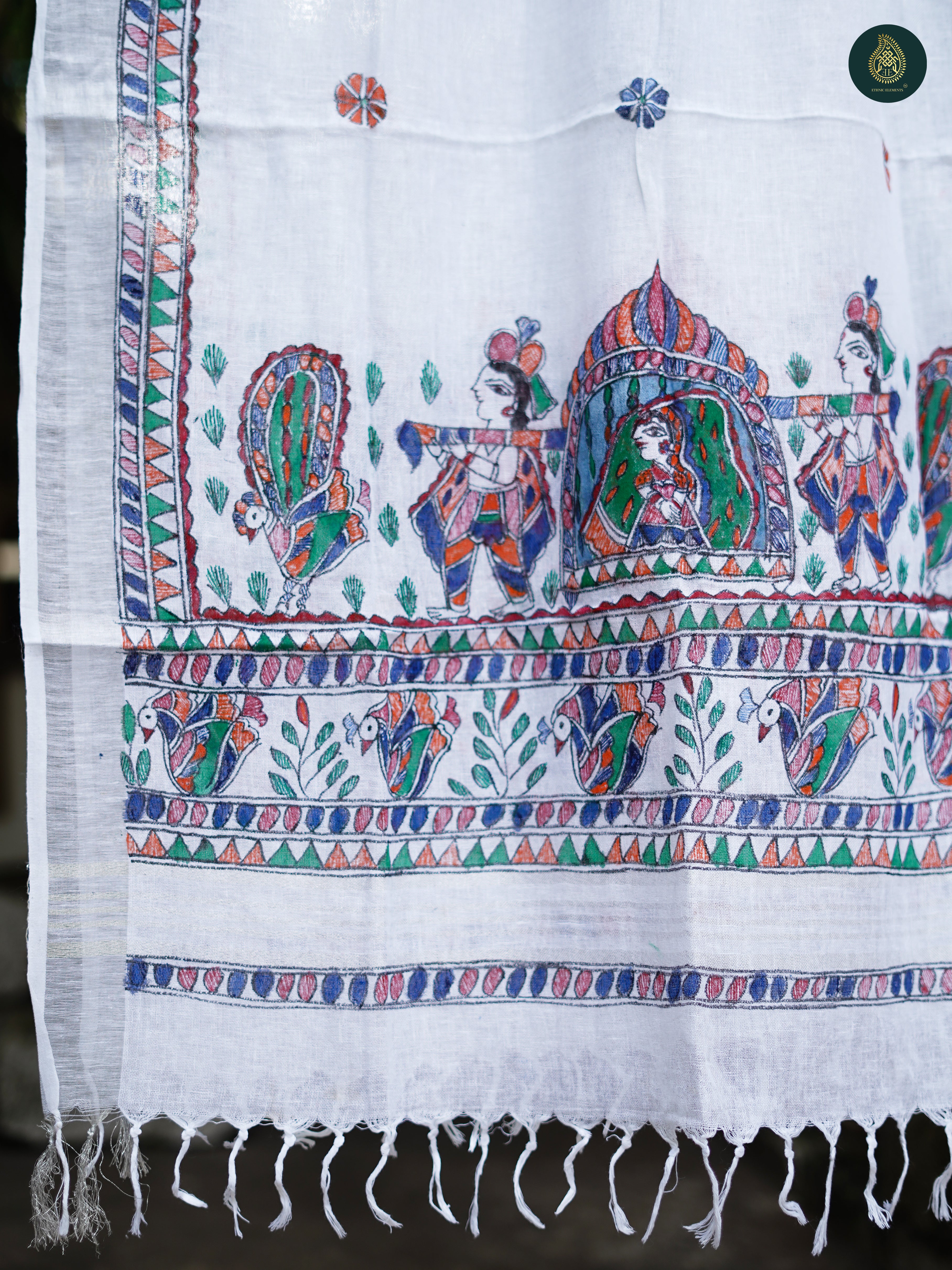 Authentic Original Hand-Painted Madhubani Suit Sets made from pure woven fabrics. Madhubani Art is a type of folk-art form. Each suit consists of line drawings filled with bright colors and contrasts or patterns. Only natural dyes and pigments are used for fabric color and painting.