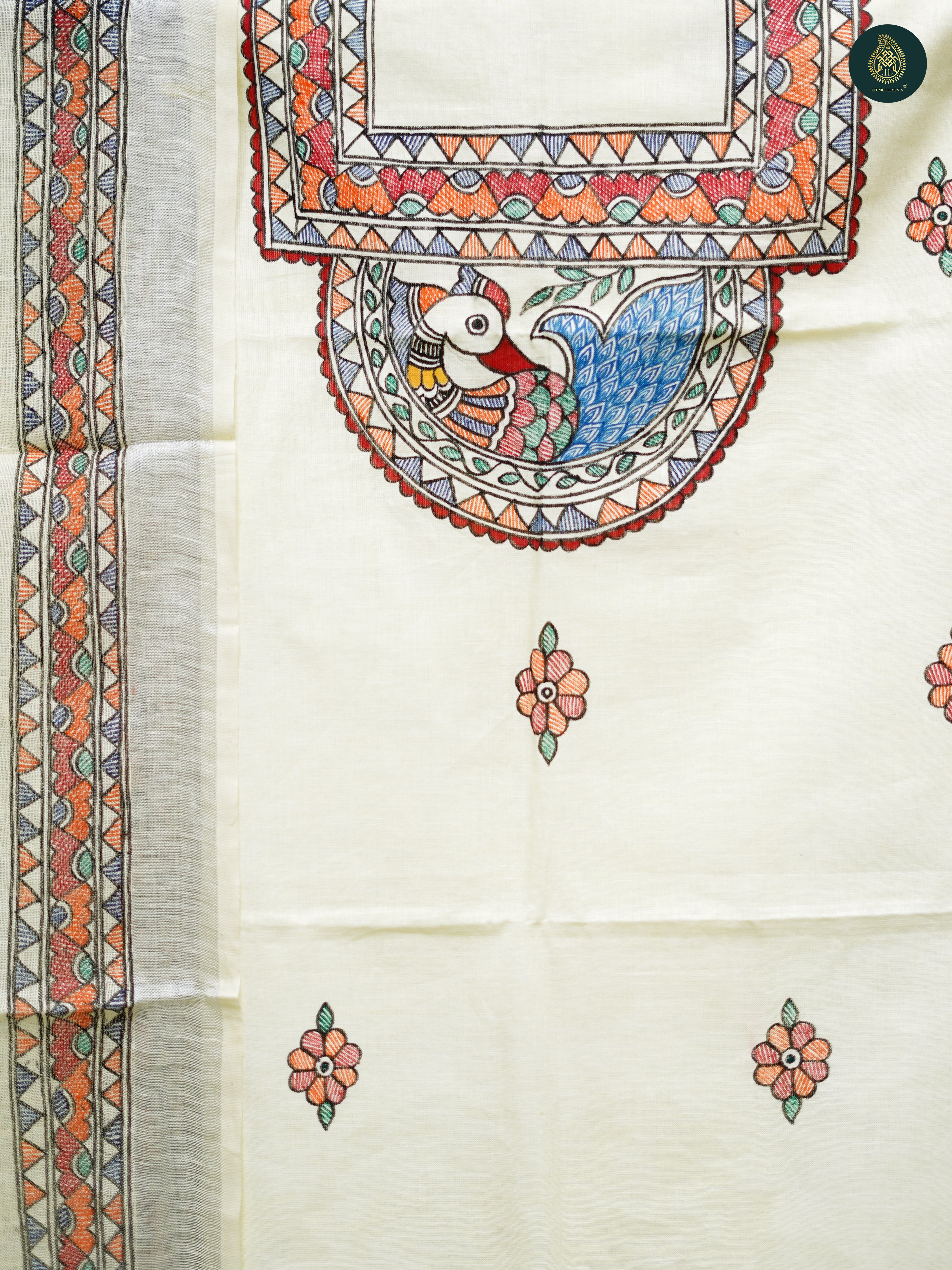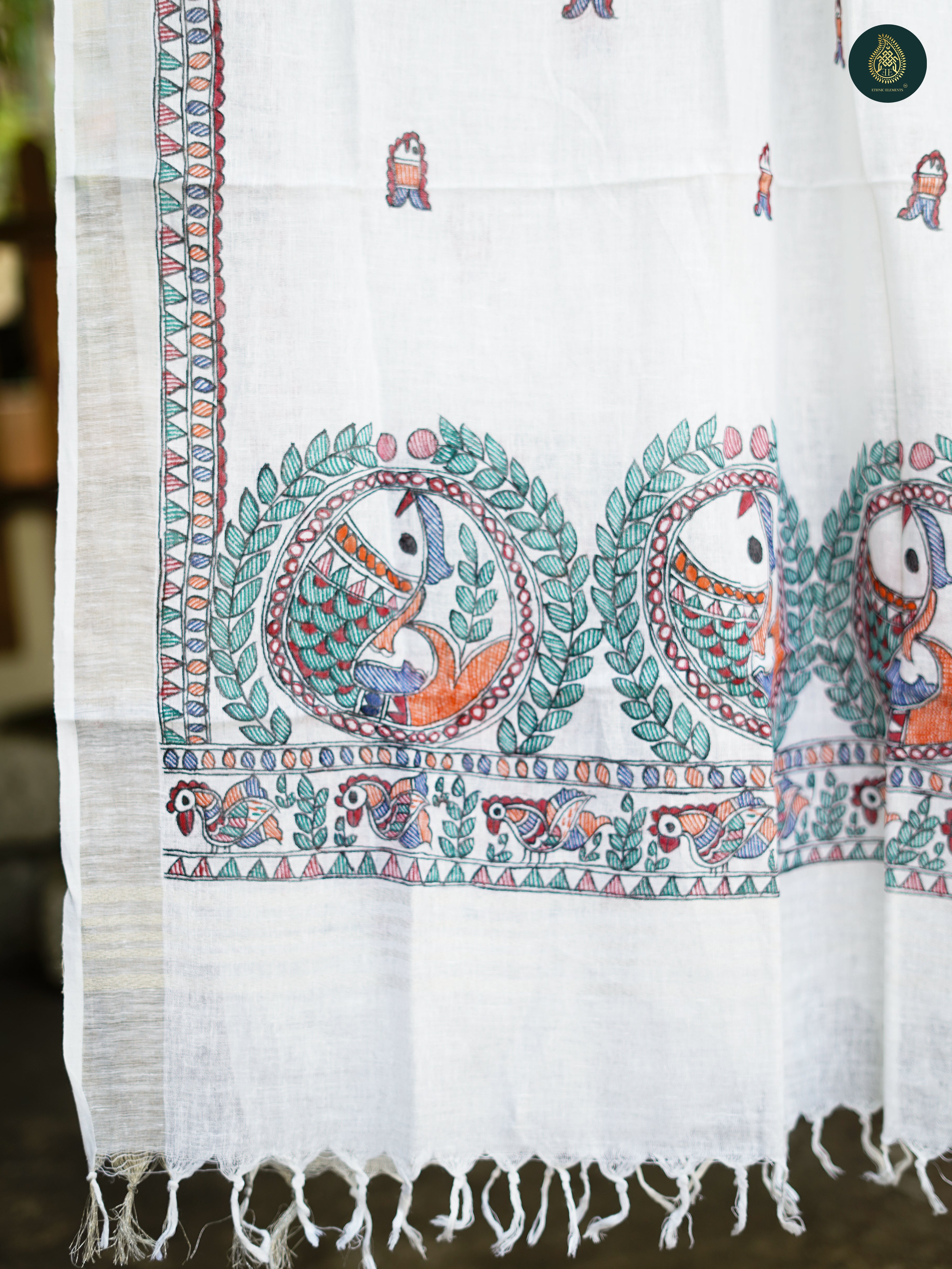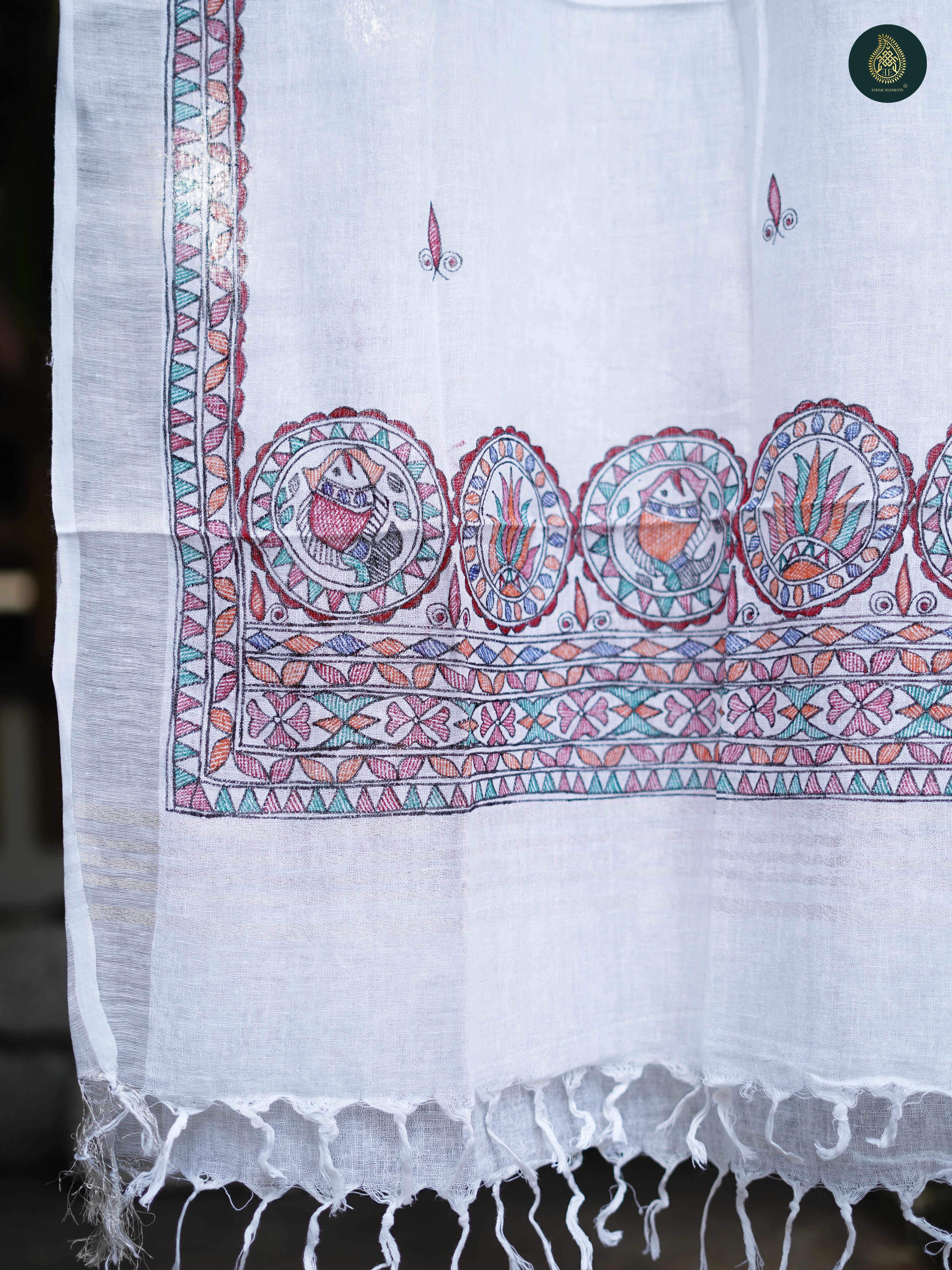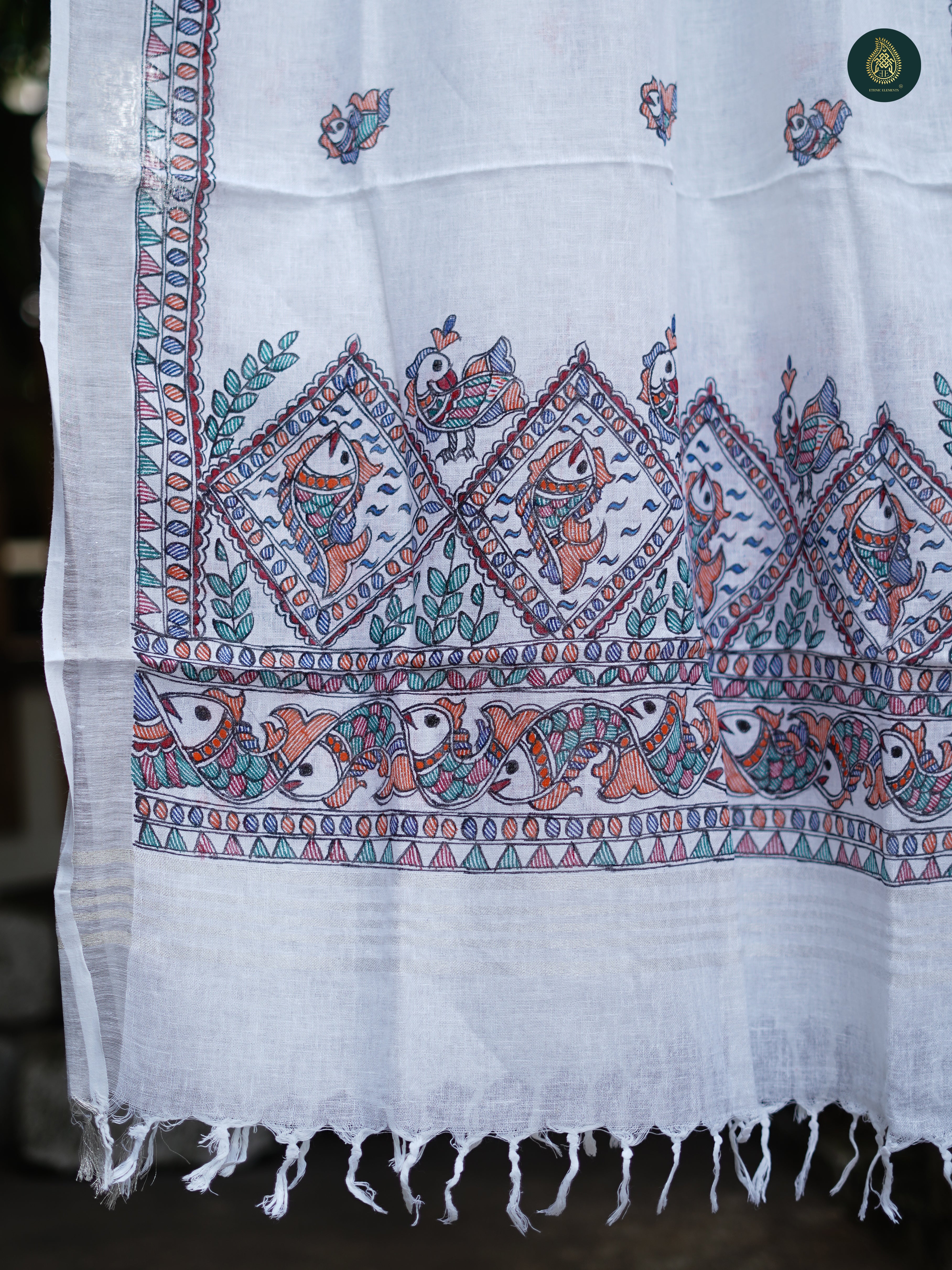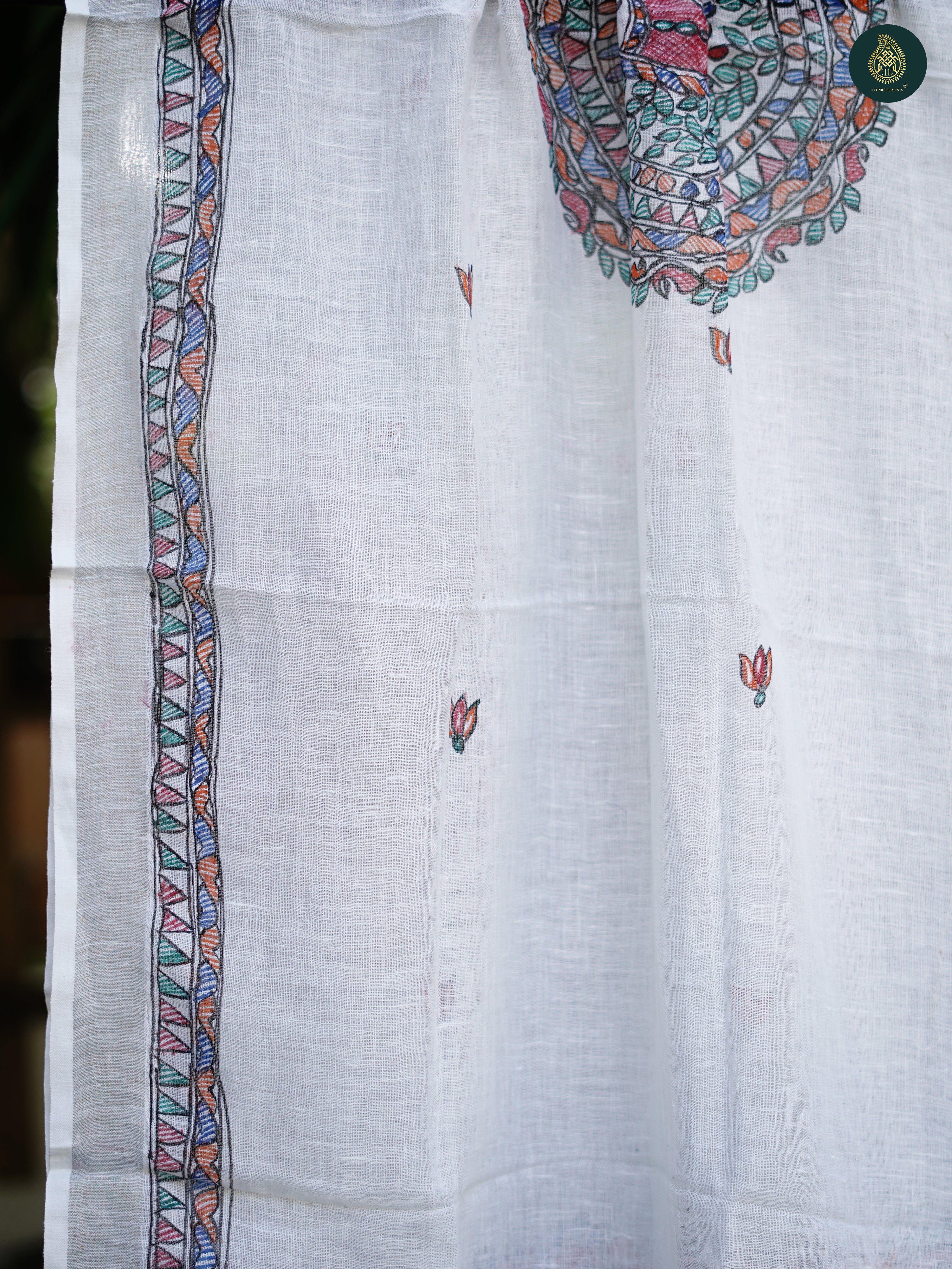 Authentic Original Hand-Painted Madhubani Suit Sets made from pure woven fabrics. Madhubani Art is a type of folk-art form. Each suit consists of line drawings filled with bright colors and contrasts or patterns. Only natural dyes and pigments are used for fabric color and painting.