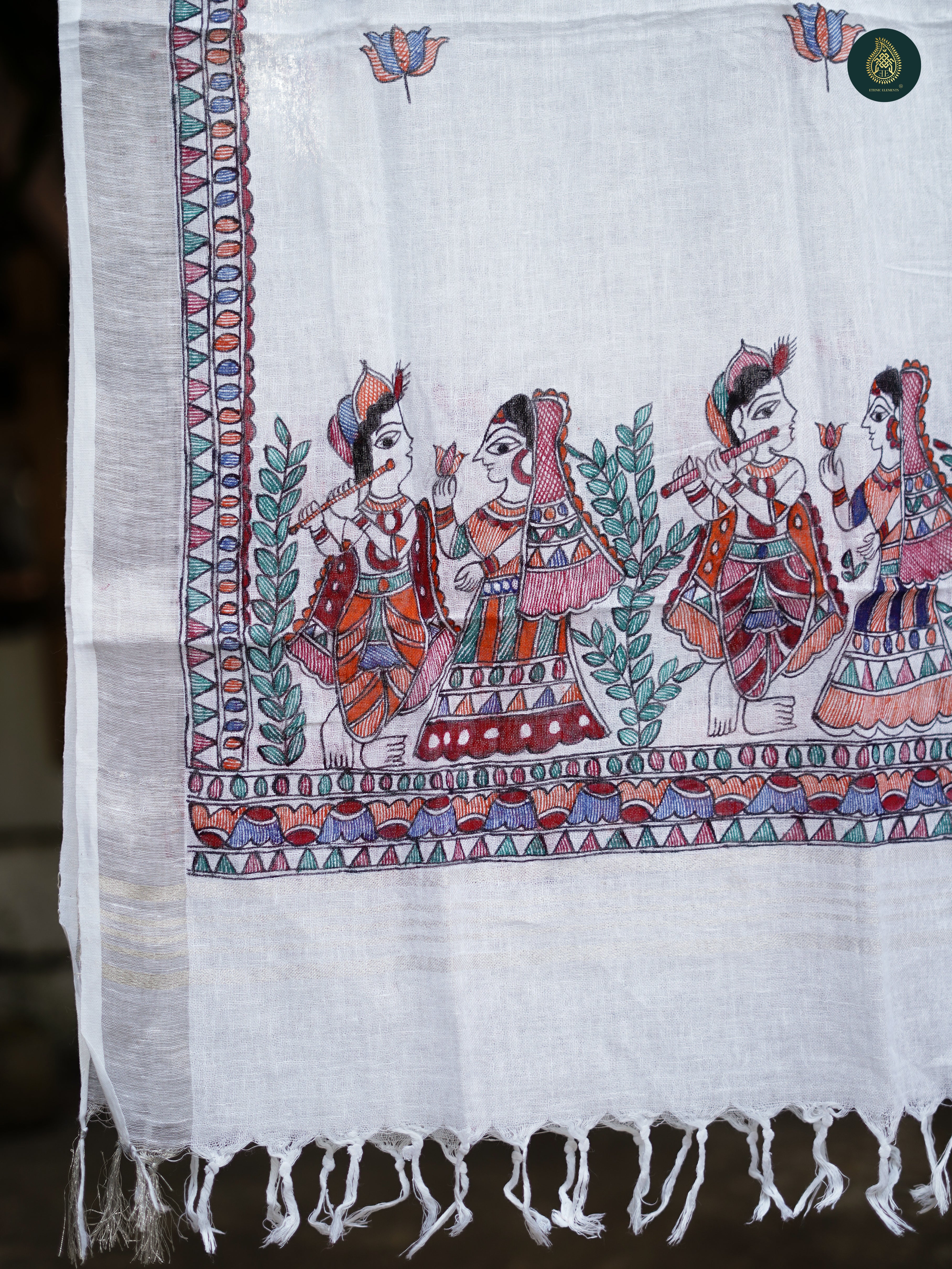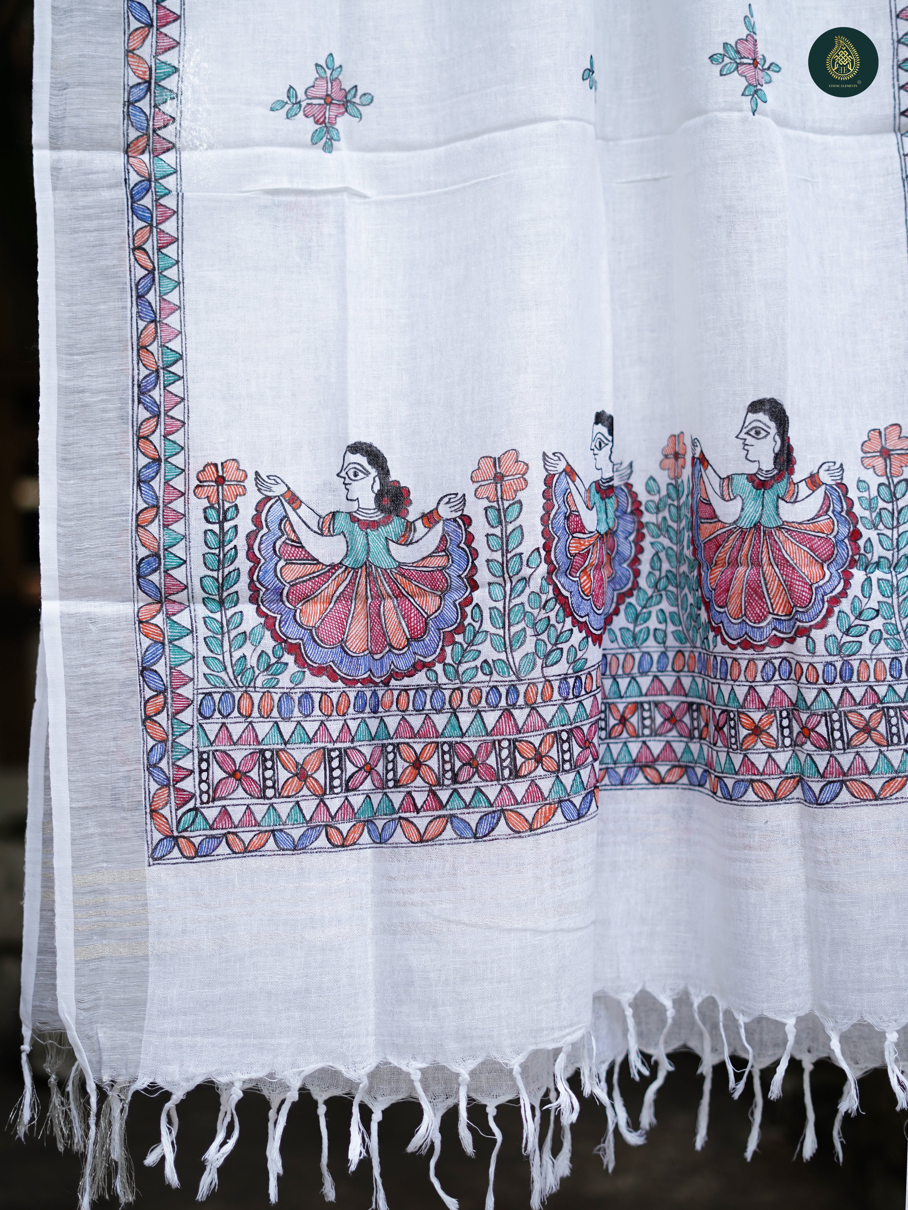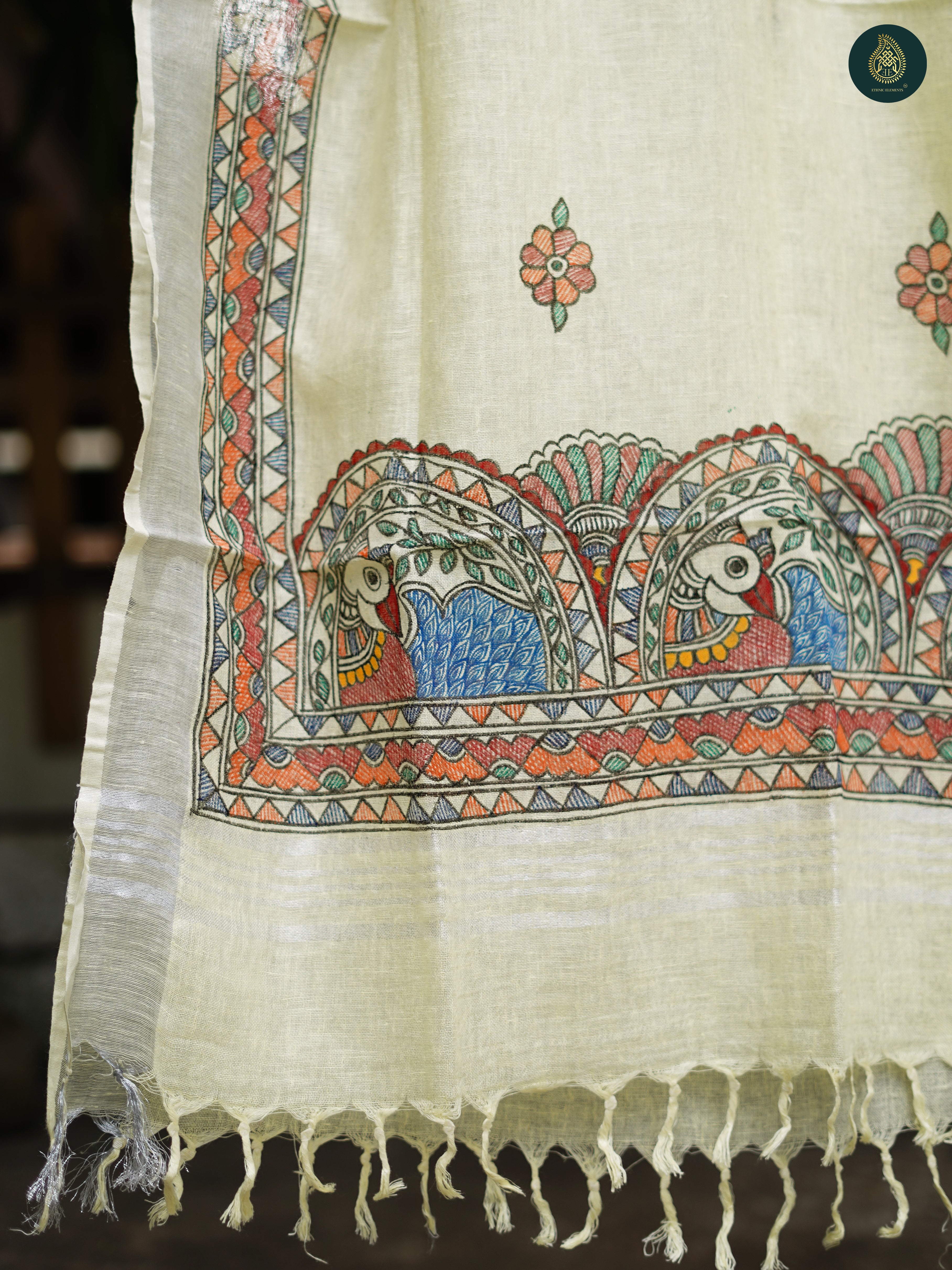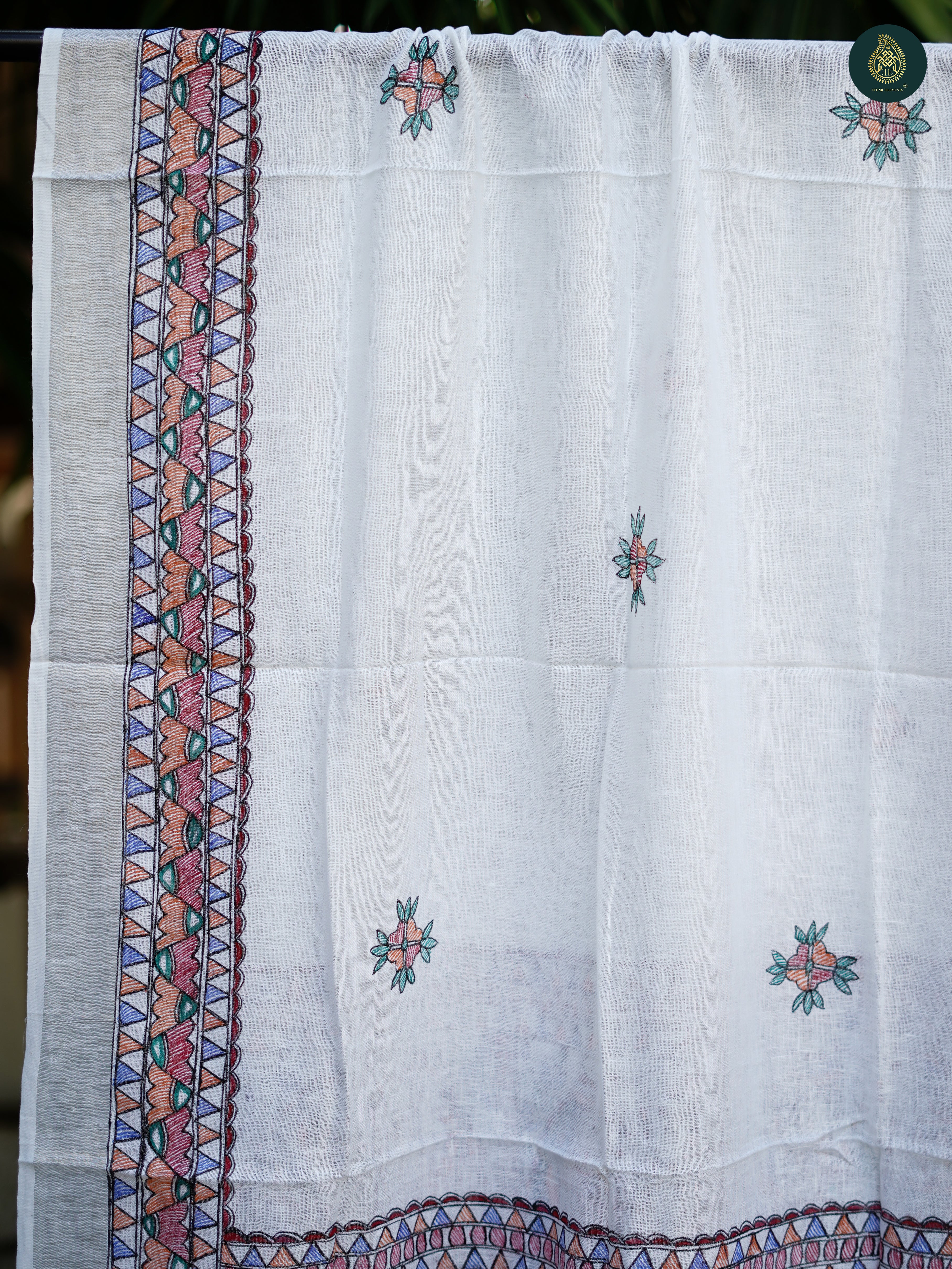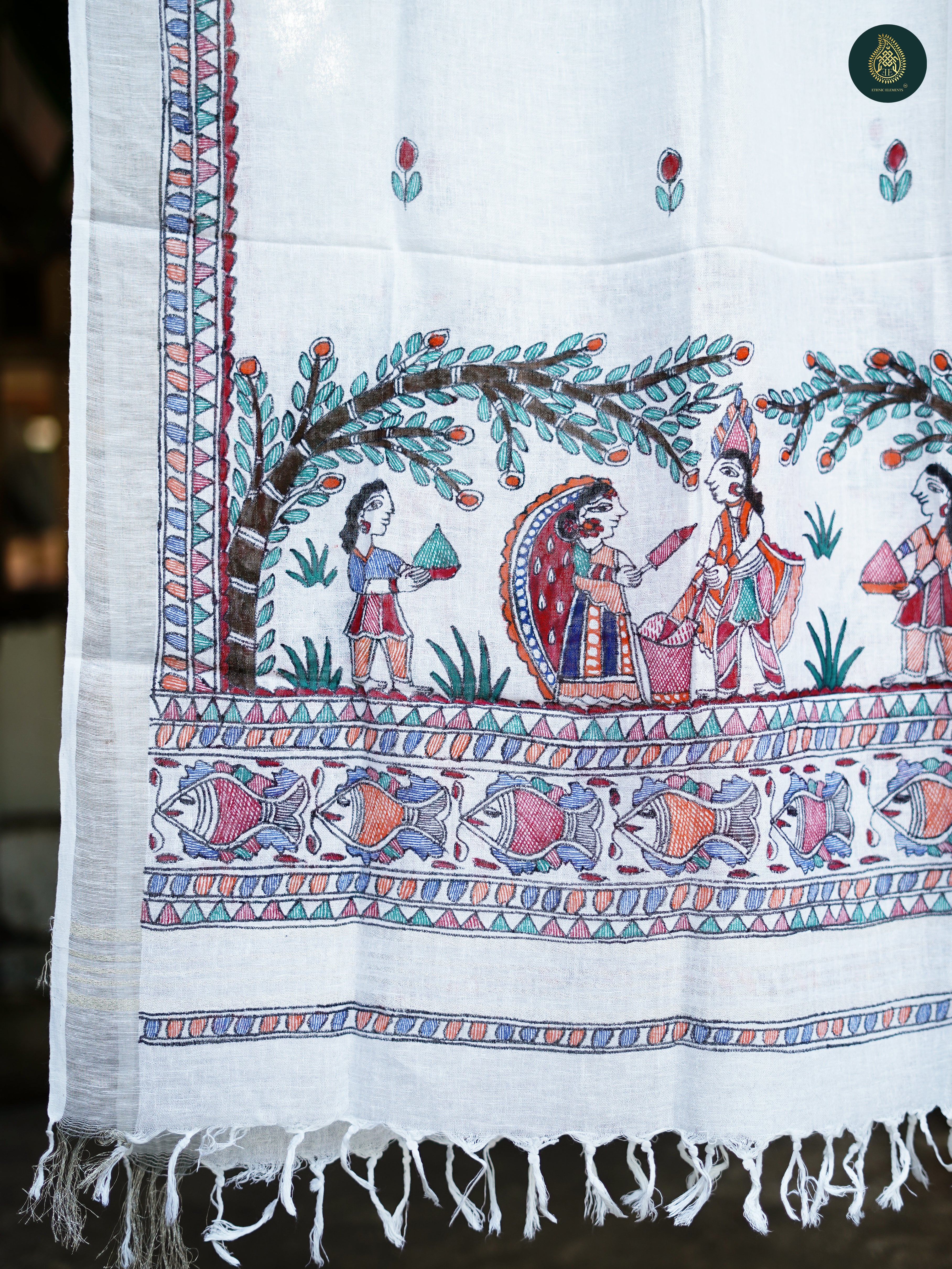 Authentic Original Hand-Painted Madhubani Suit Sets made from pure woven fabrics. Madhubani Art is a type of folk-art form. Each suit consists of line drawings filled with bright colors and contrasts or patterns. Only natural dyes and pigments are used for fabric color and painting.