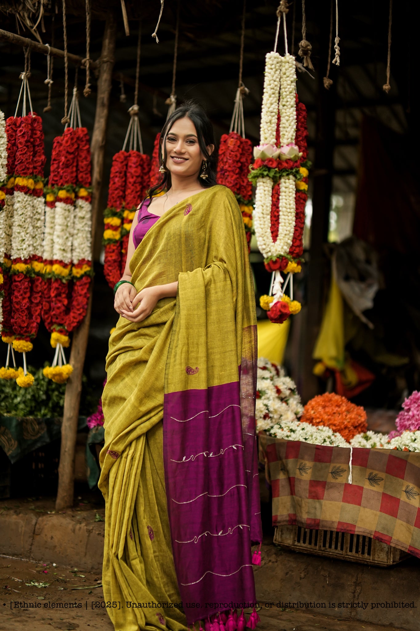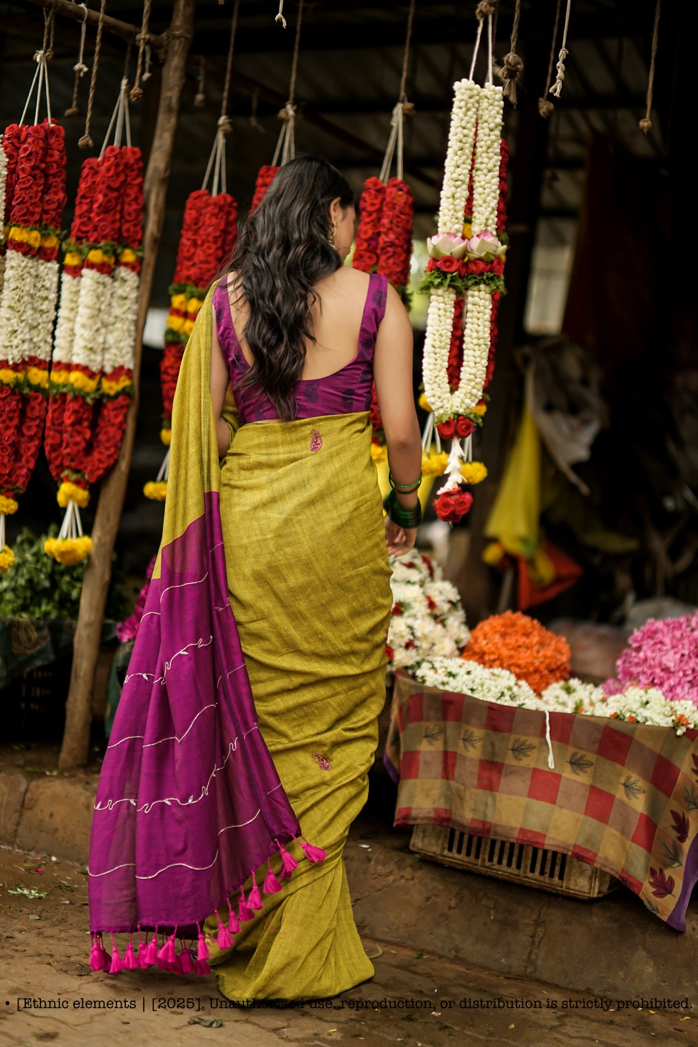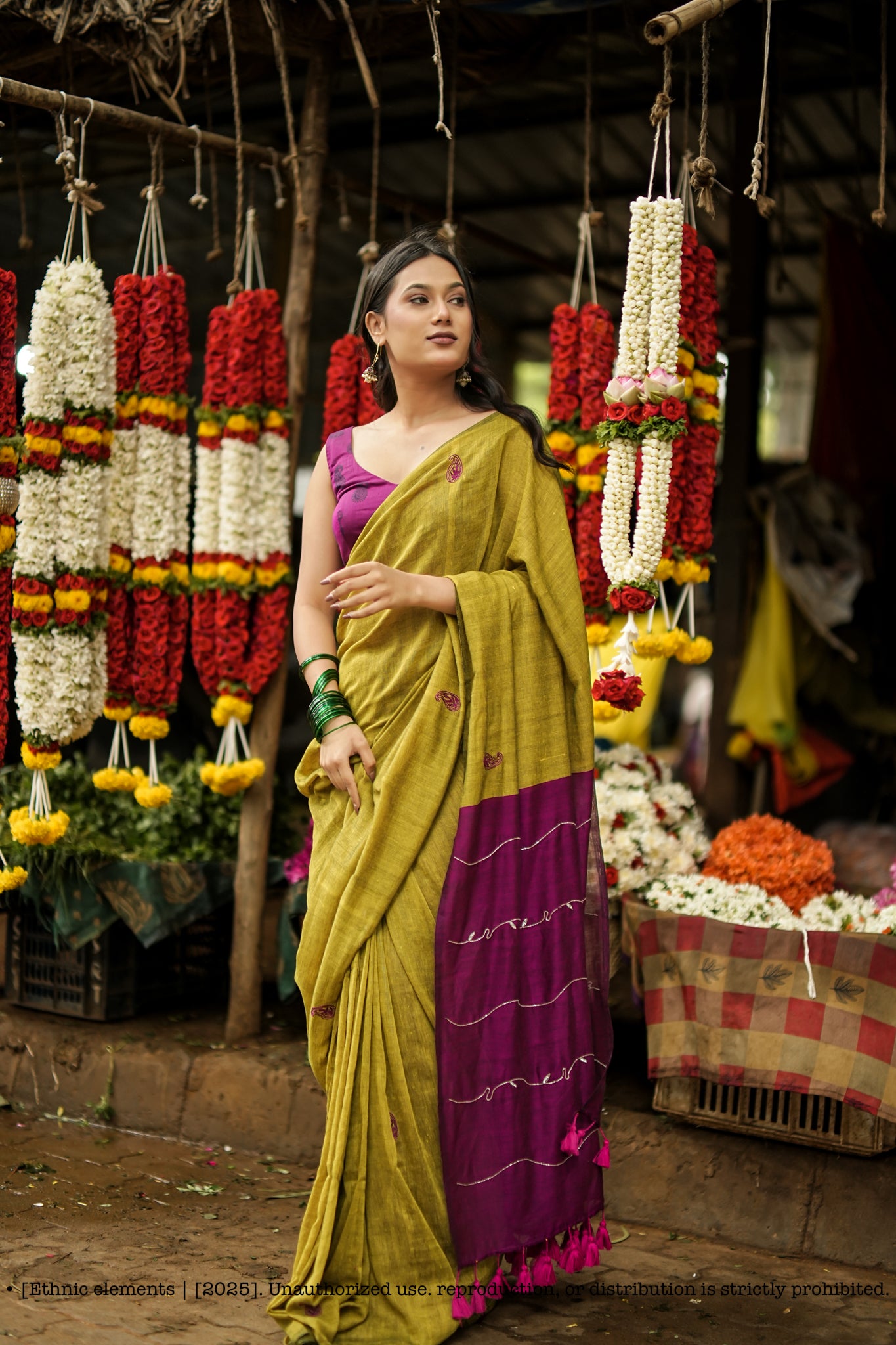 Color: Olive green body with deep magenta contrast pallu