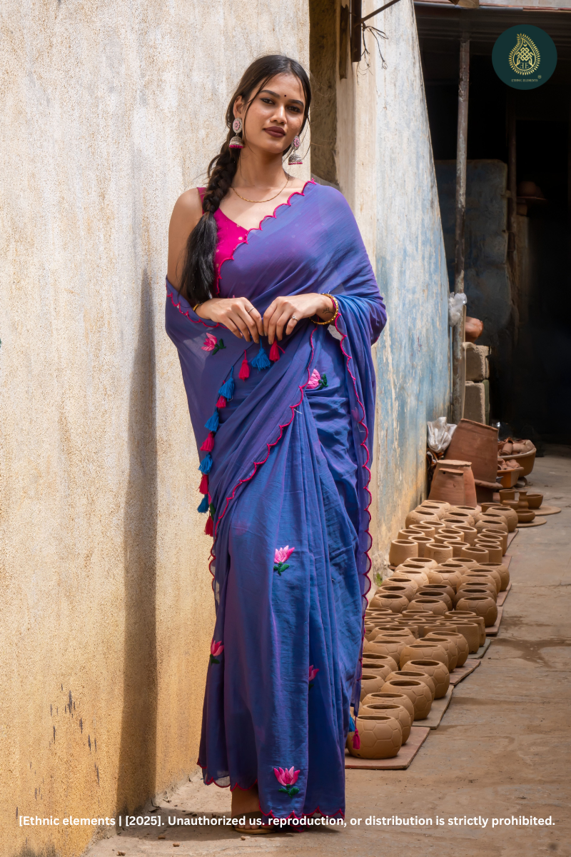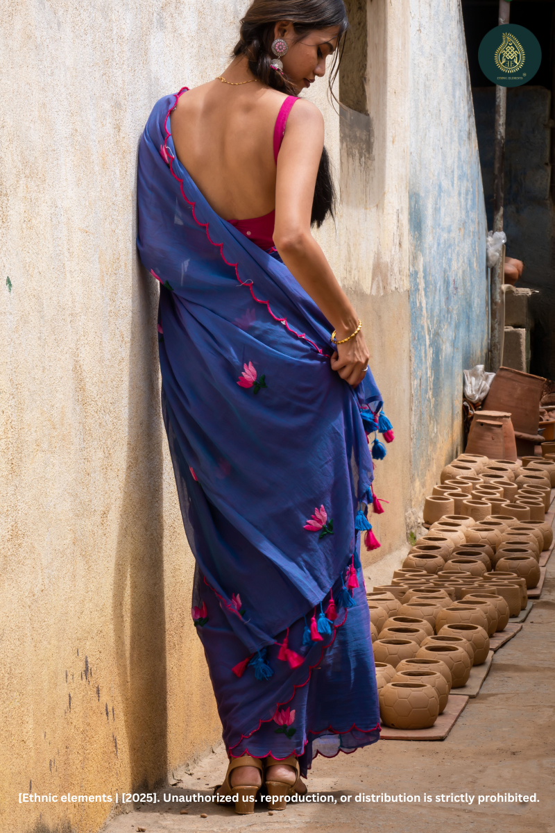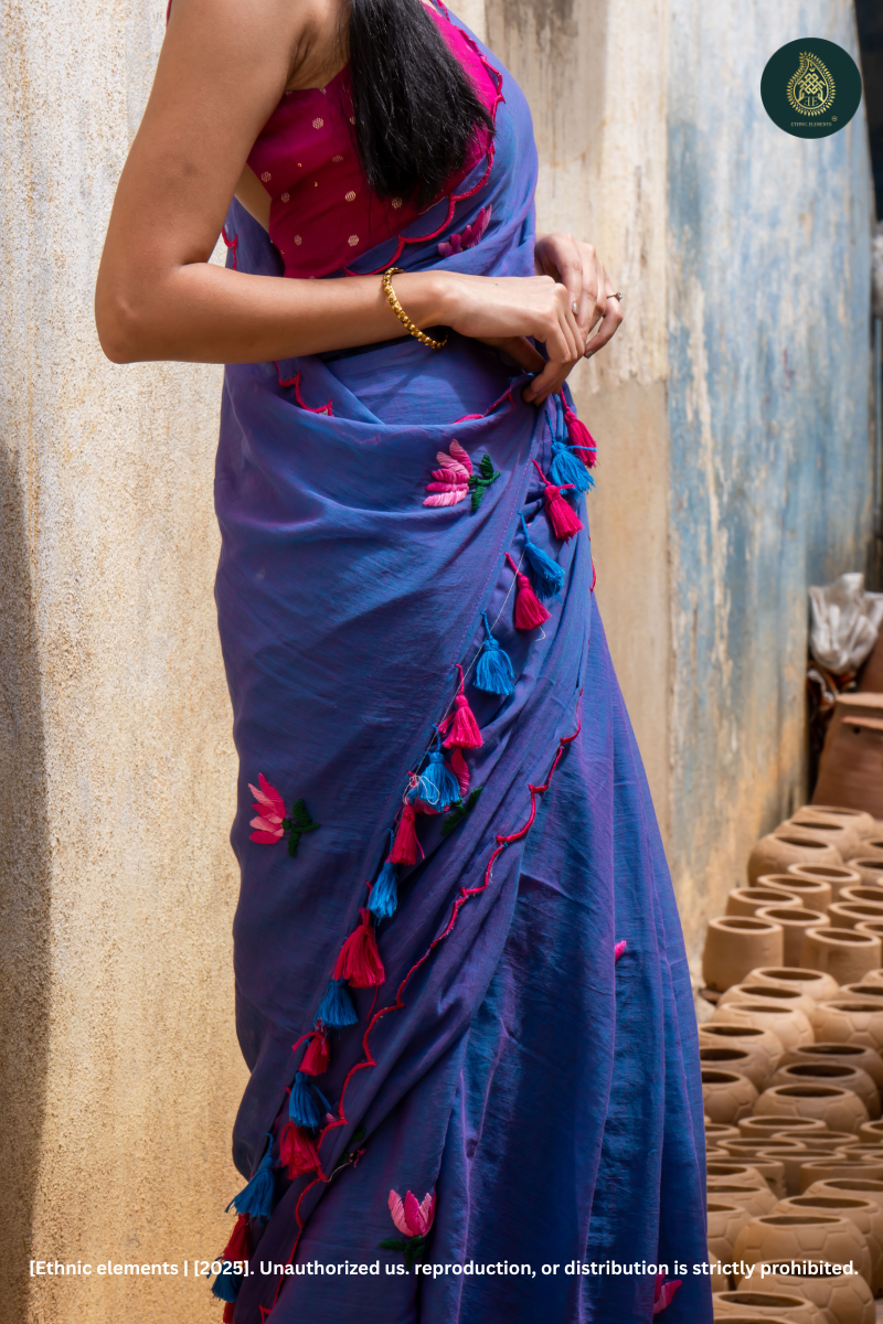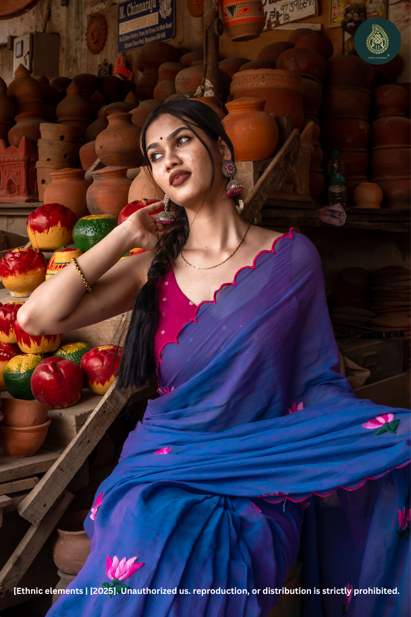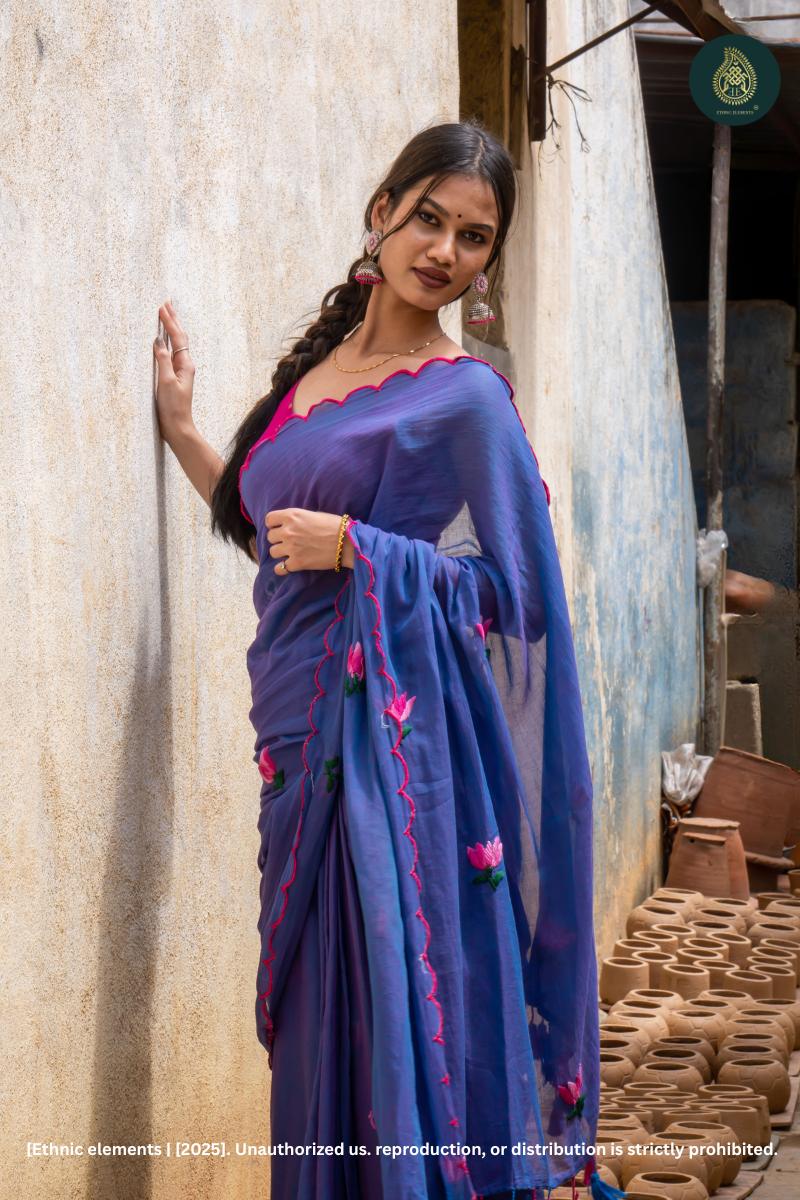 Mul Cotton Saree with Lotus Hand Embroidery Lotus Whisper - Blue