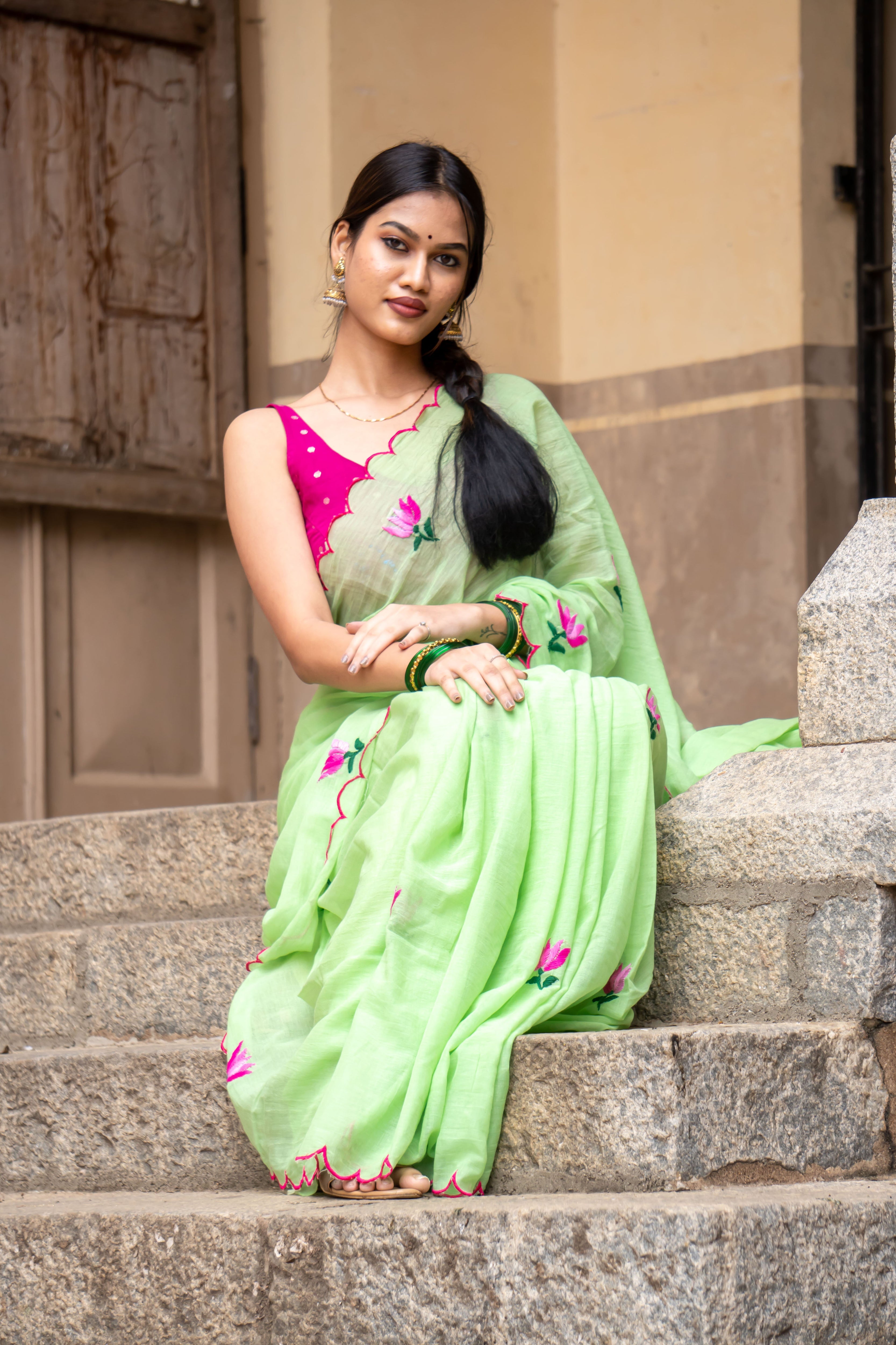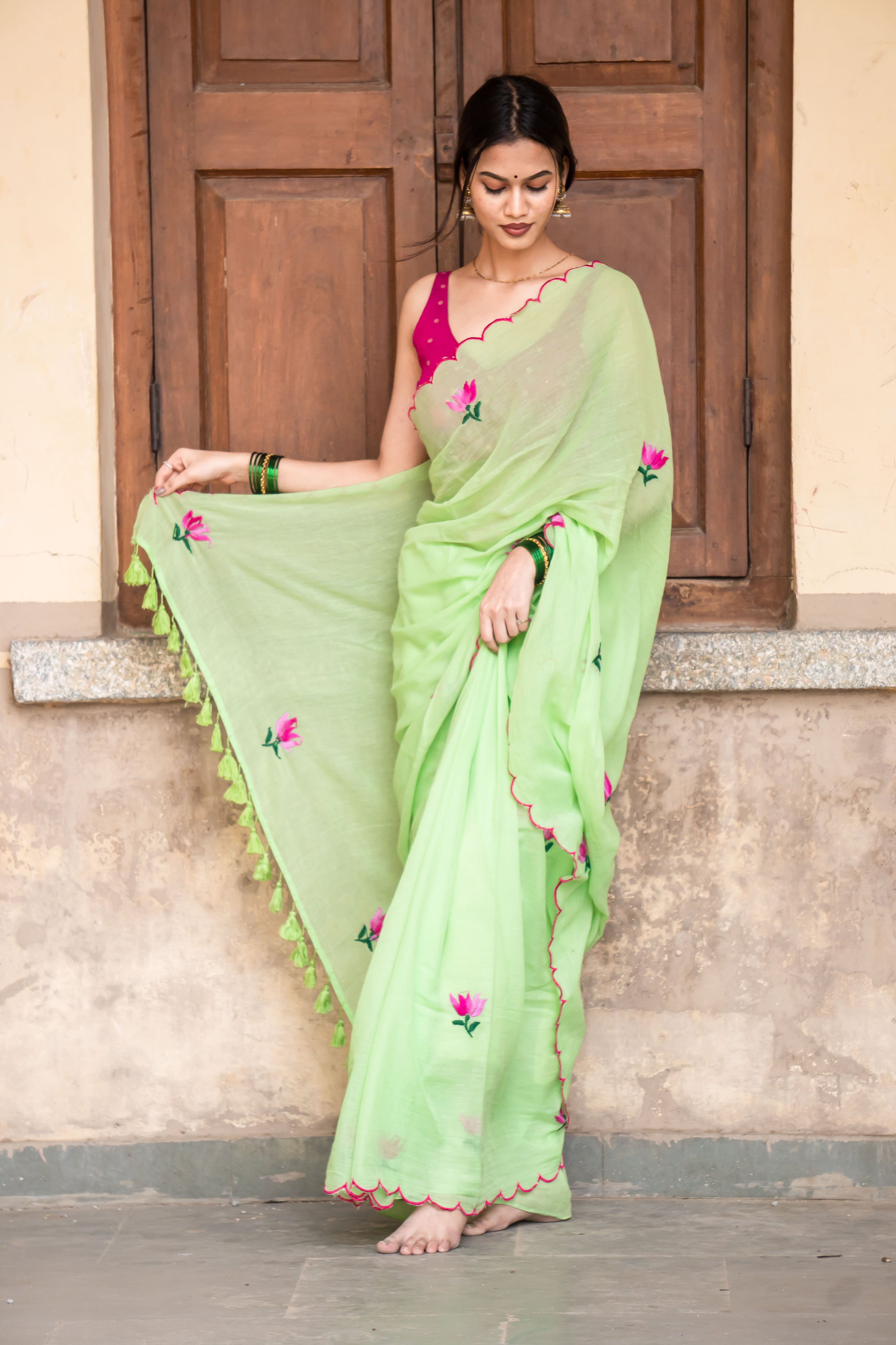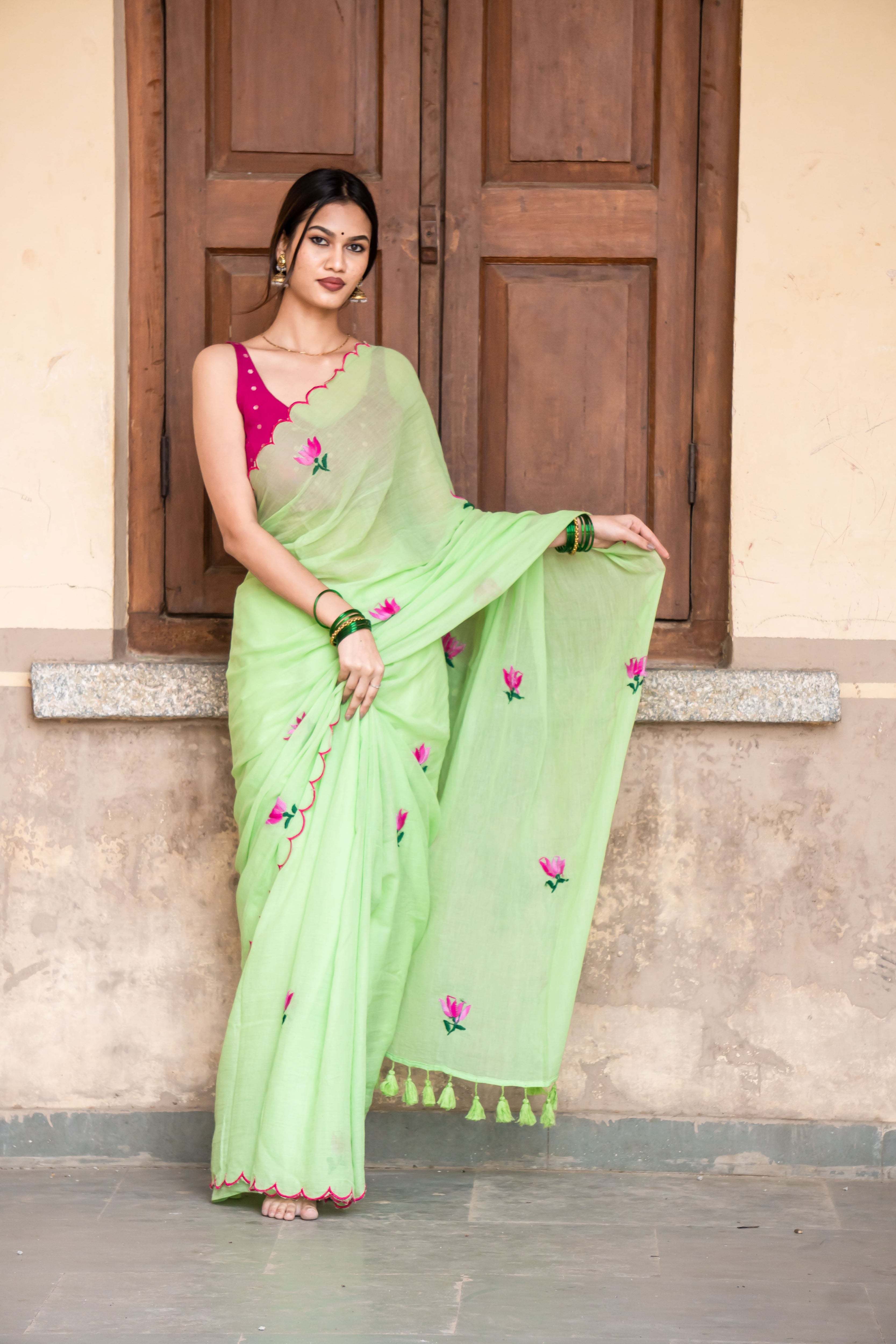 Mul Cotton Saree with Lotus Hand Embroidery - Lotus Blooms