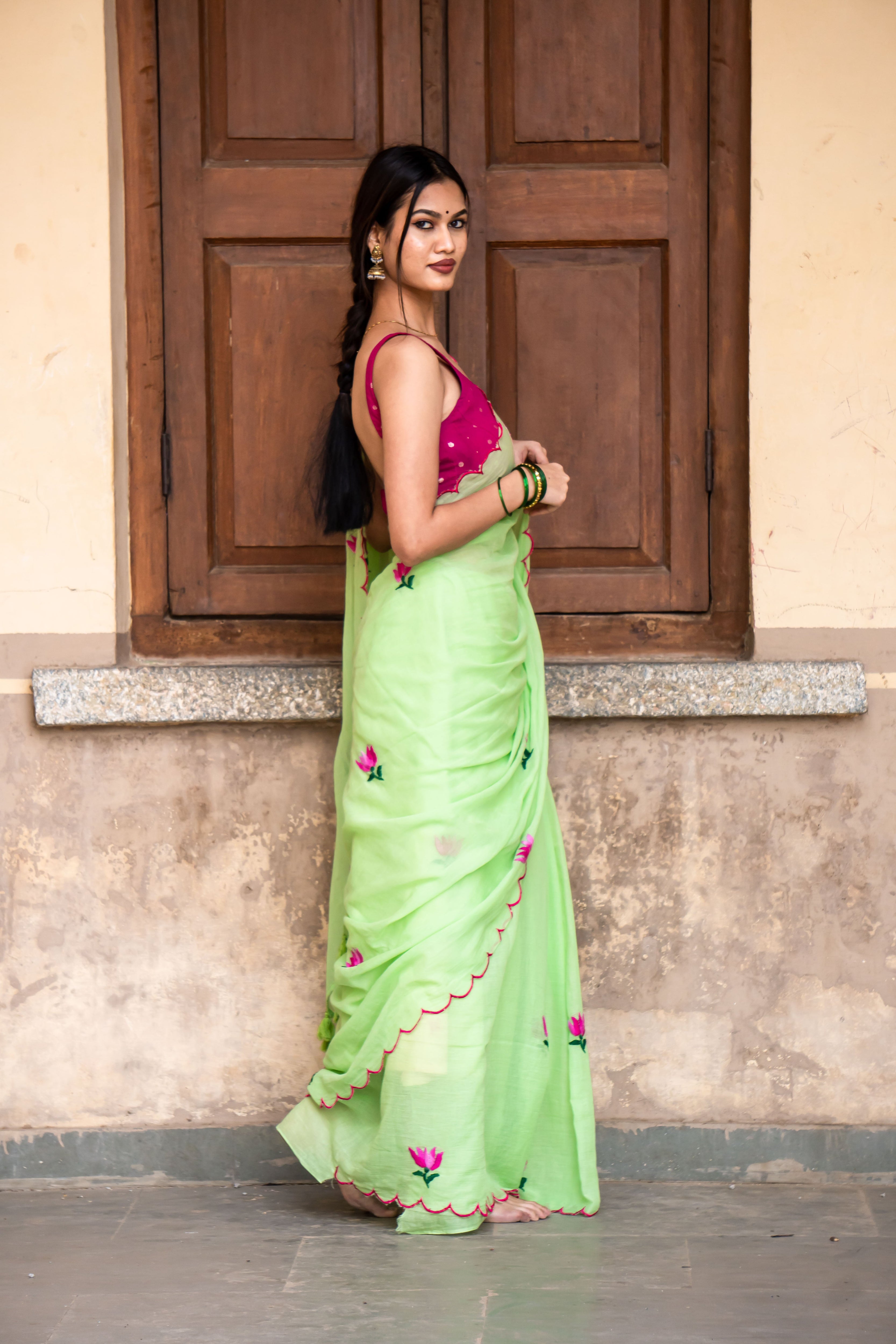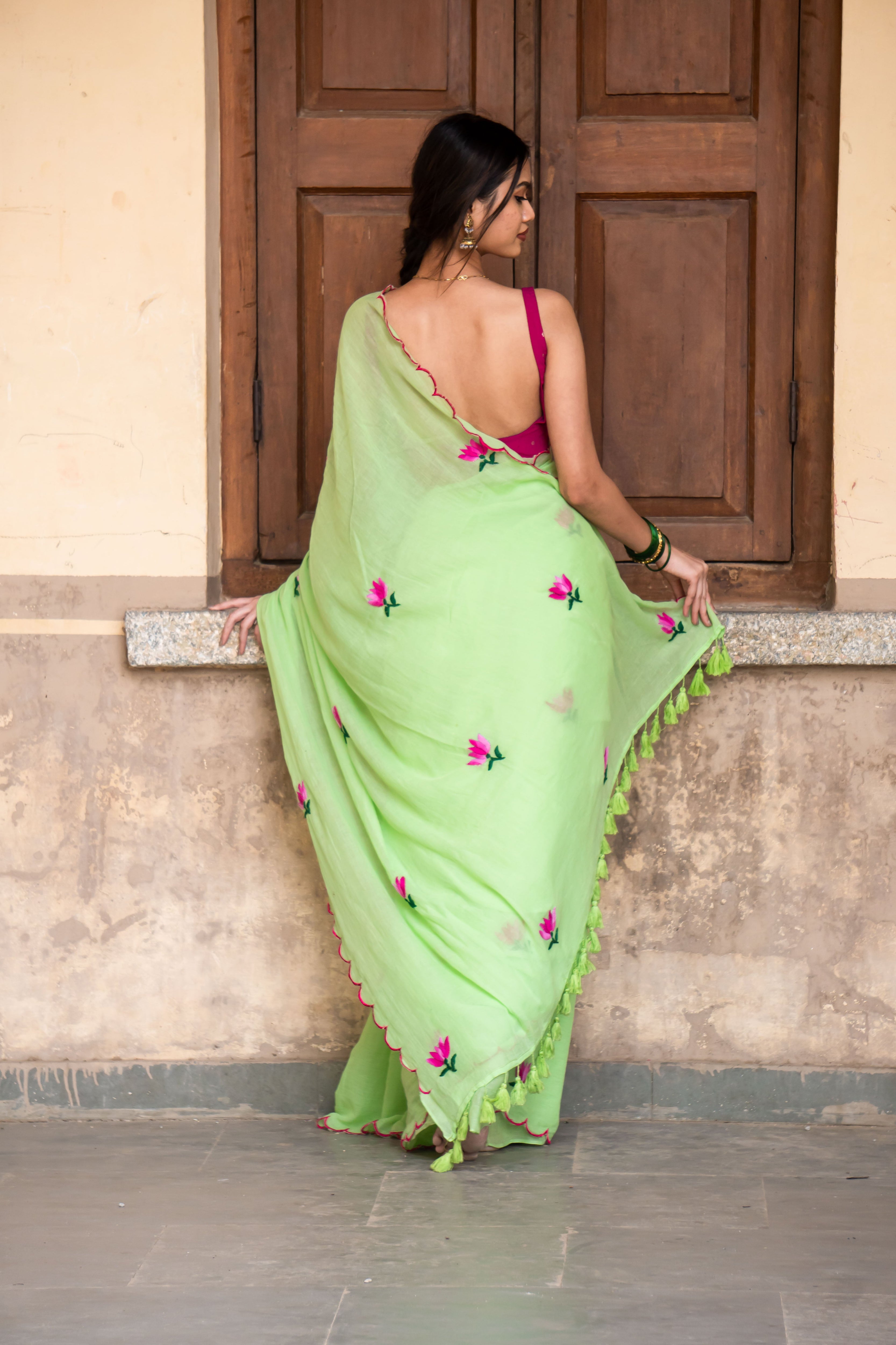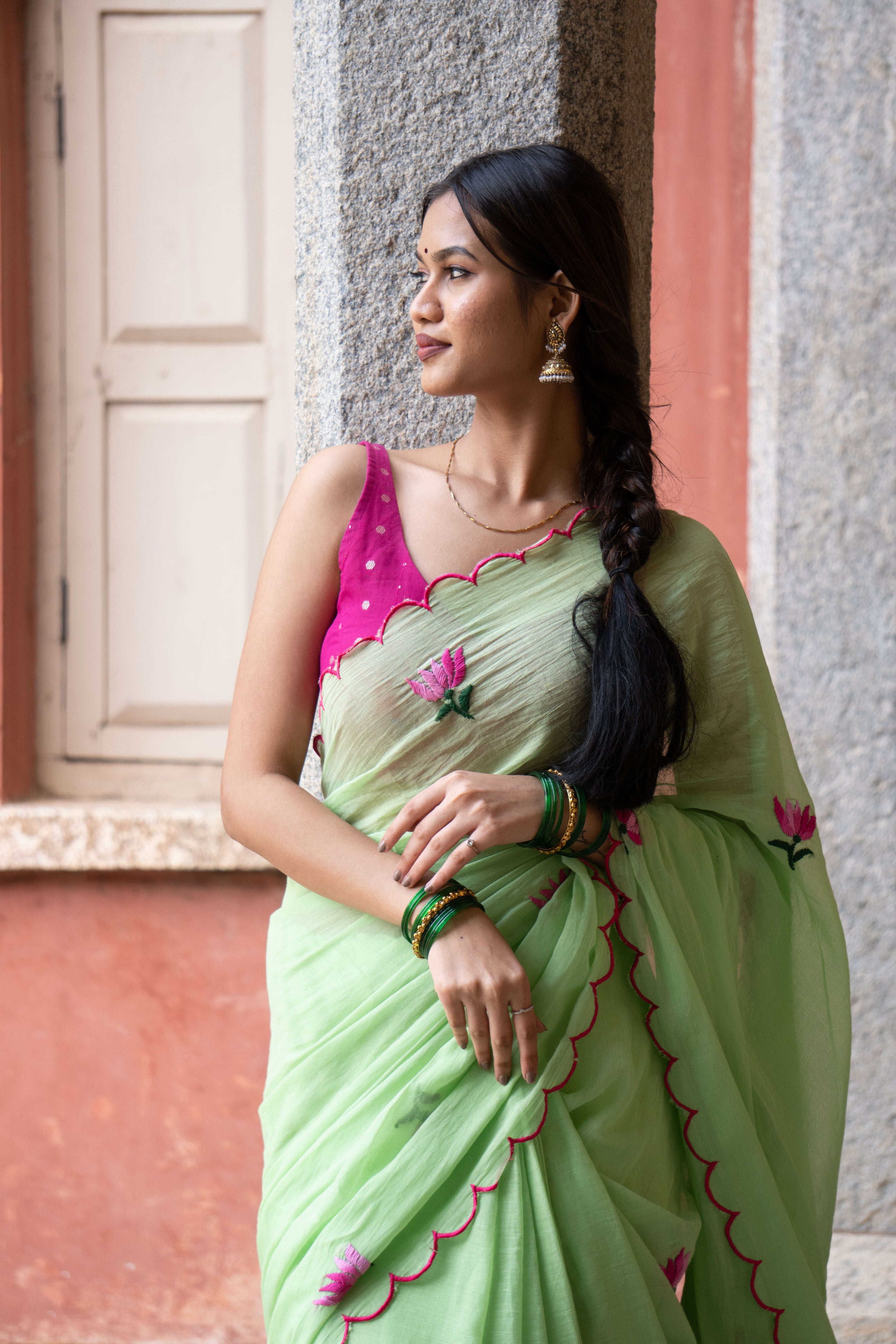 Mul Cotton Saree with Lotus Hand Embroidery - Lotus Blooms