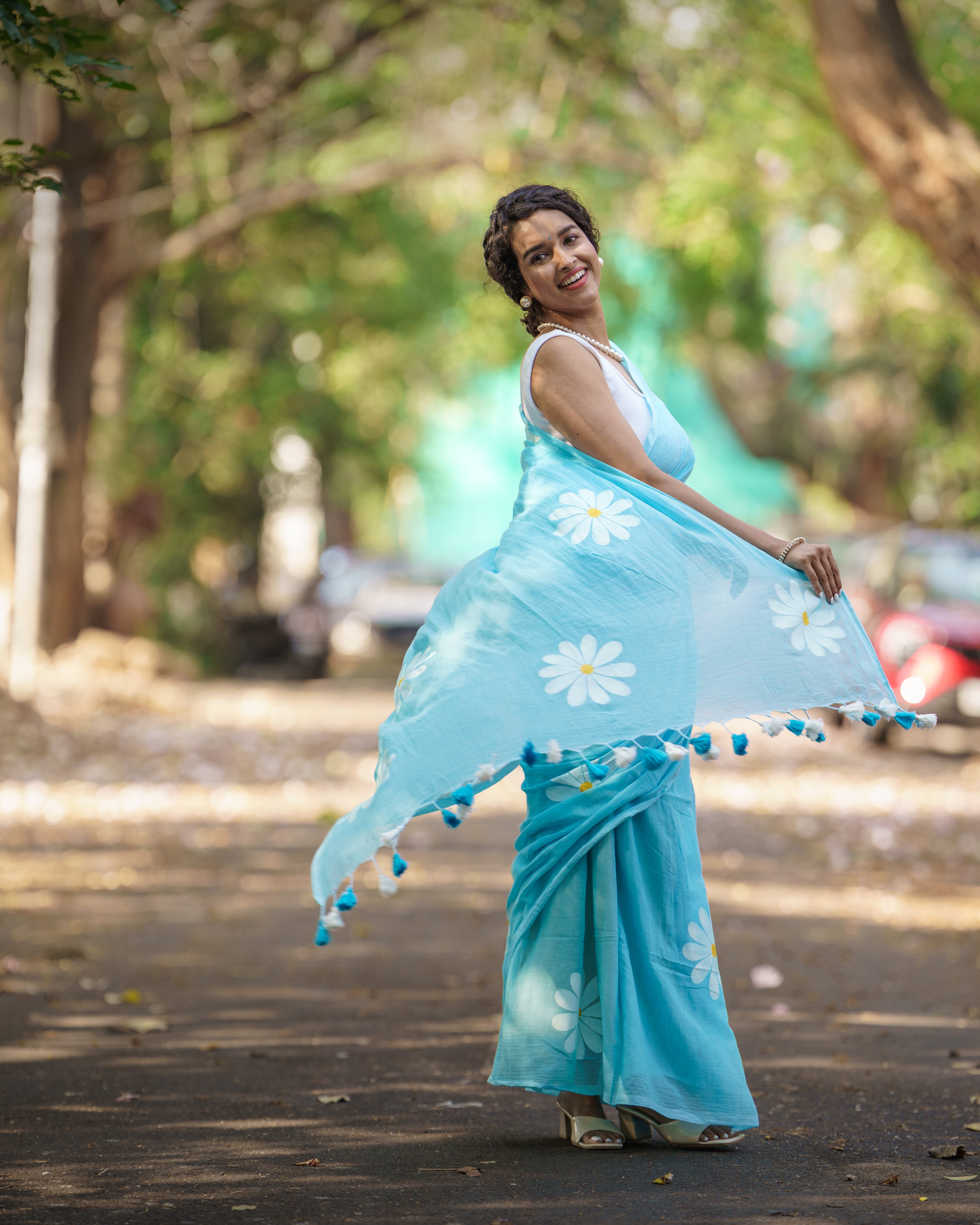 Hand painted original mul cotton saree with handmade tassels on the pallu. Very soft and light weight sarees with floral designs painted by hands. This saree does NOT have a blouse piece.