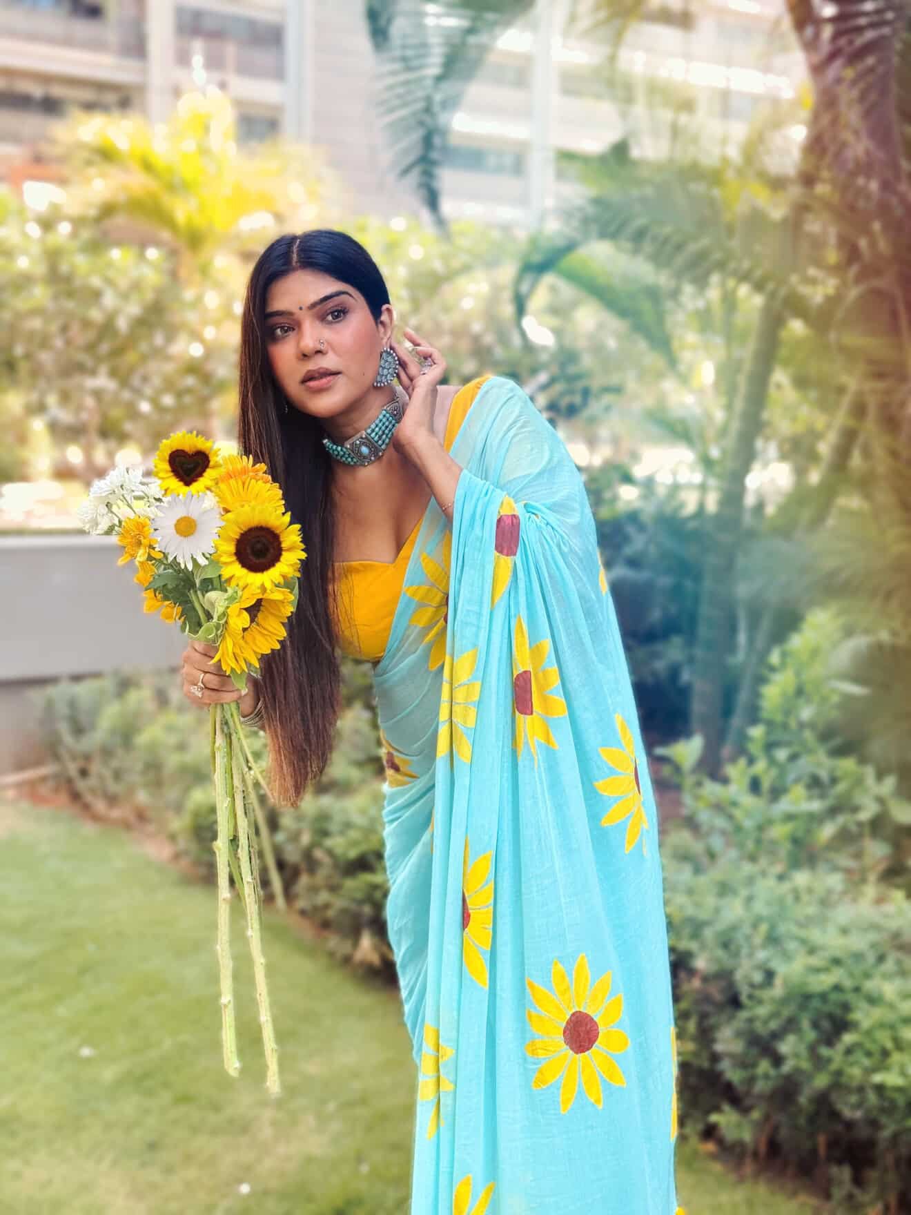 Mul Cotton Handpainted Saree - Baby Blue Sunflower