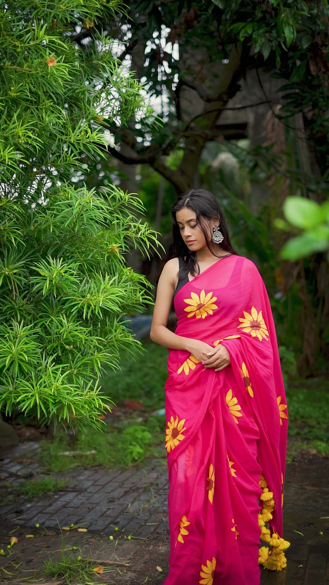 Woven pure mul cotton light weight saree with handmade tassels on pallu and embroidered maple leaves all over the body. This saree does NOT have a blouse piece.