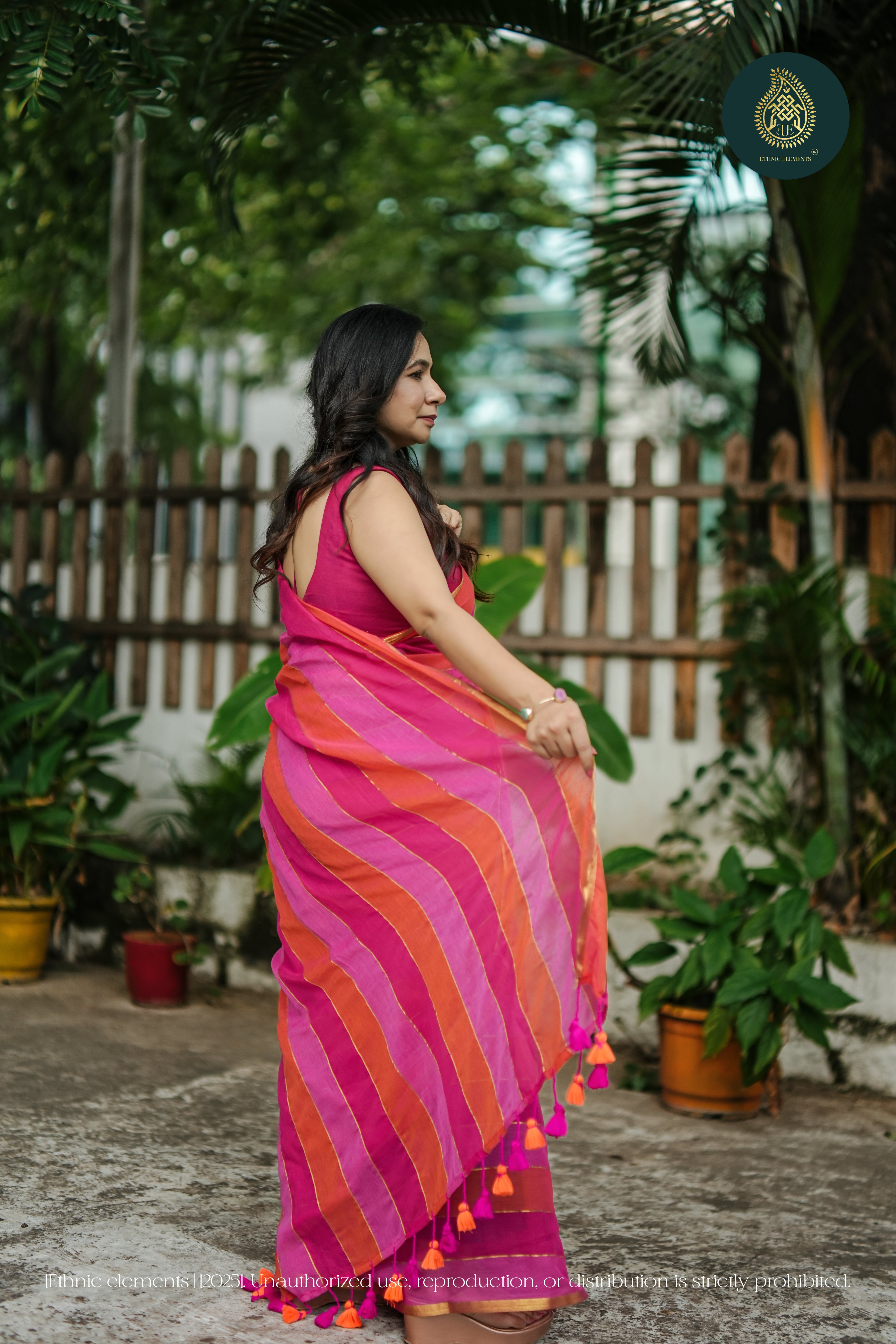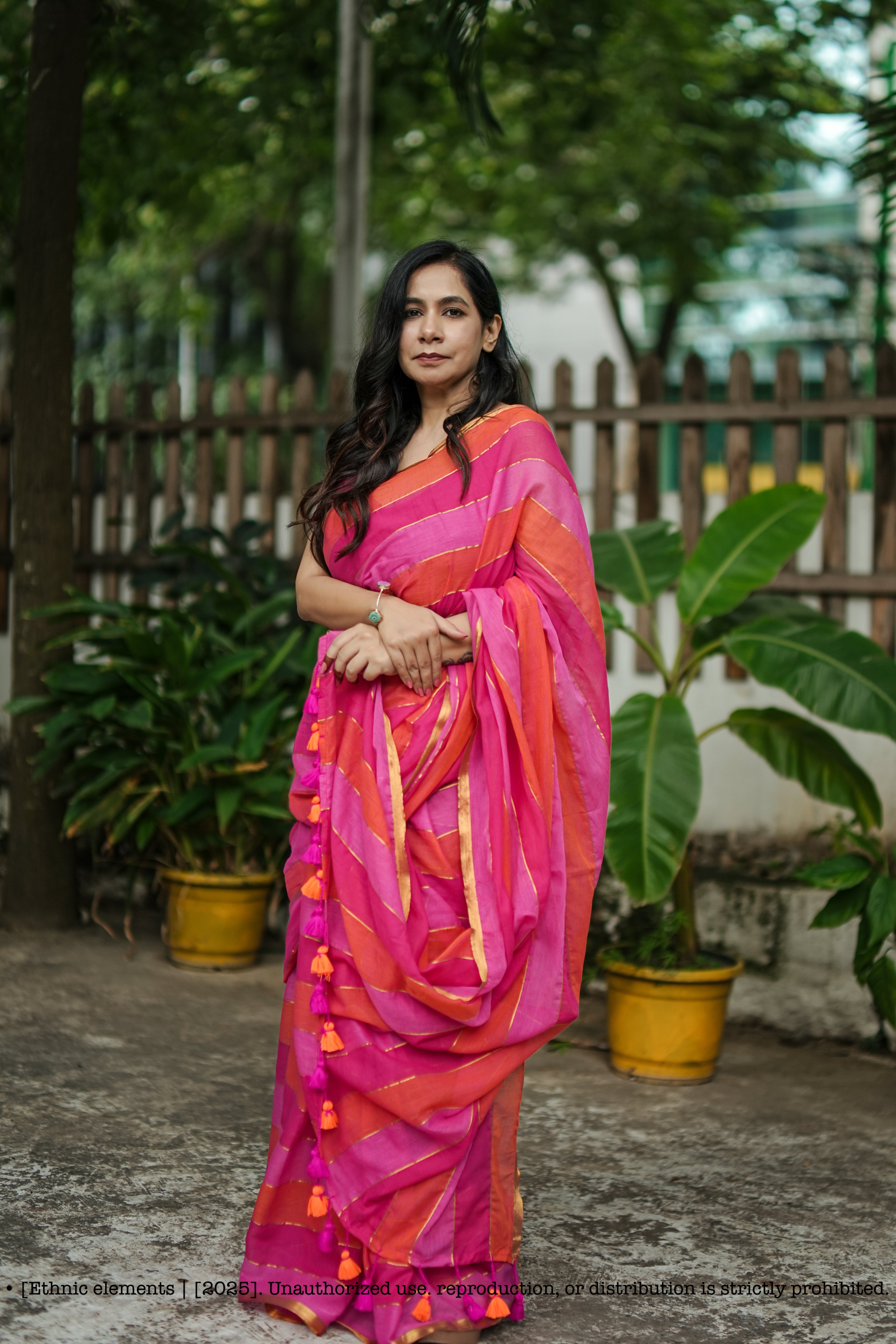 A burst of pinks and oranges brought to life with glimmering gold lines—this saree is pure sunshine wrapped in six yards. Handwoven in feathery-soft mul cotton, it’s light on the body and vibrant on the eyes. The subtle zari stripes lend a festive shimmer, while dual-tone tassels add playful movement to every step.