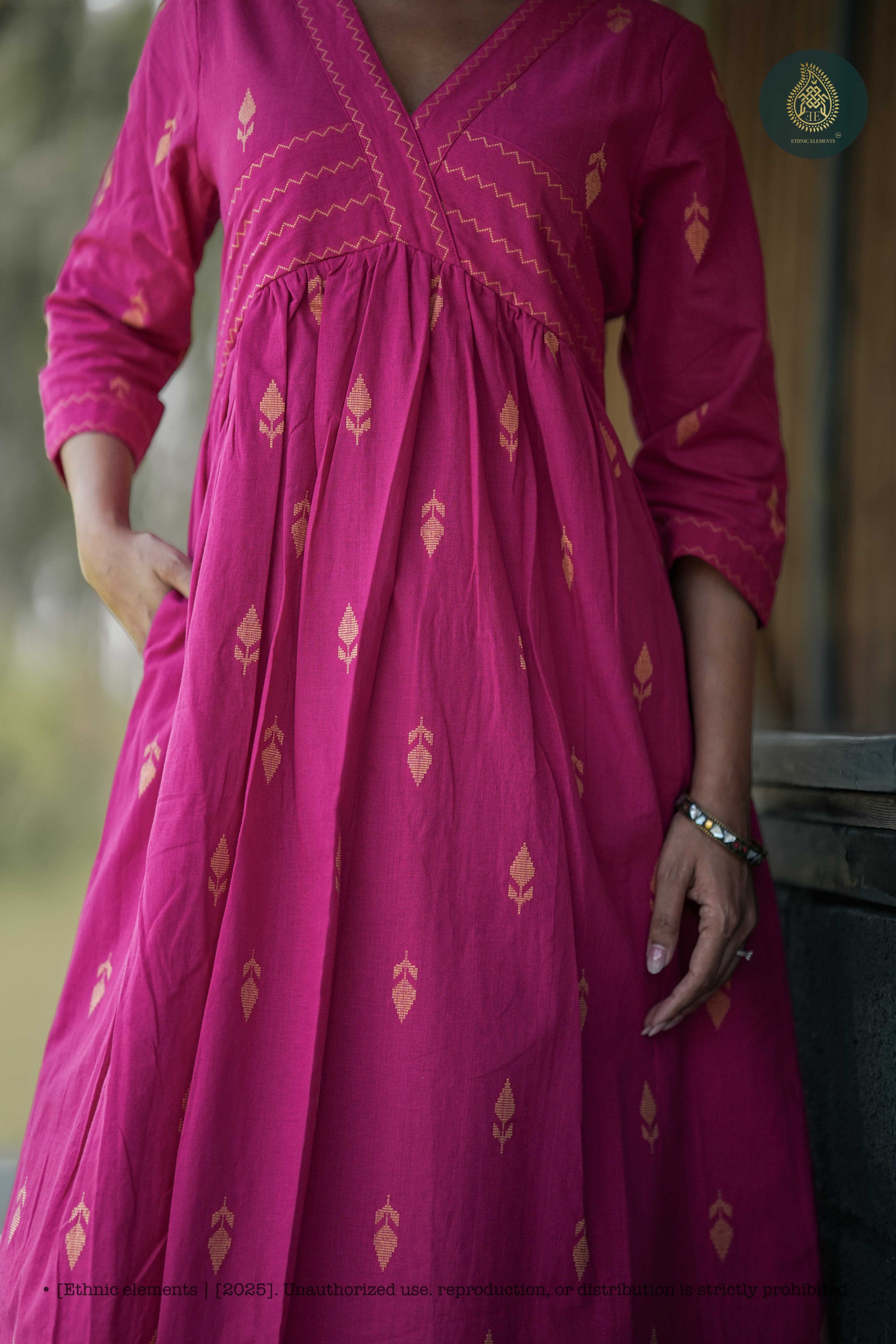 Featuring the new Alia cut with a flattering V-neckline and 3/4th sleeves, the design is accentuated with chic gathering at the chest and back for a refined, modern silhouette. The pink base is beautifully highlighted with mustard yellow leaf motifs, adding a refreshing contrast.