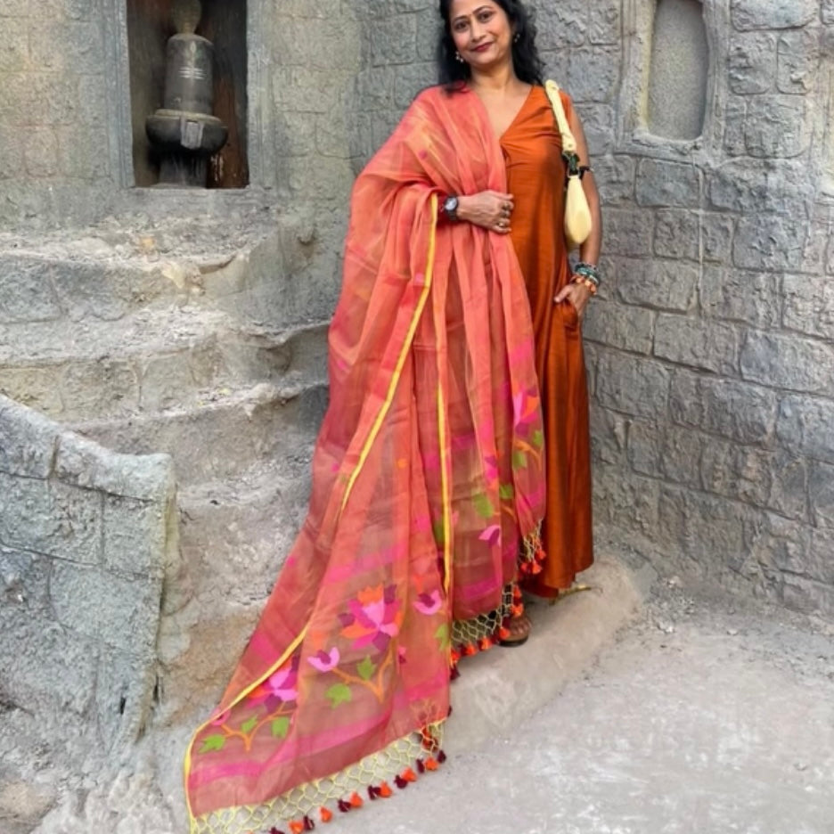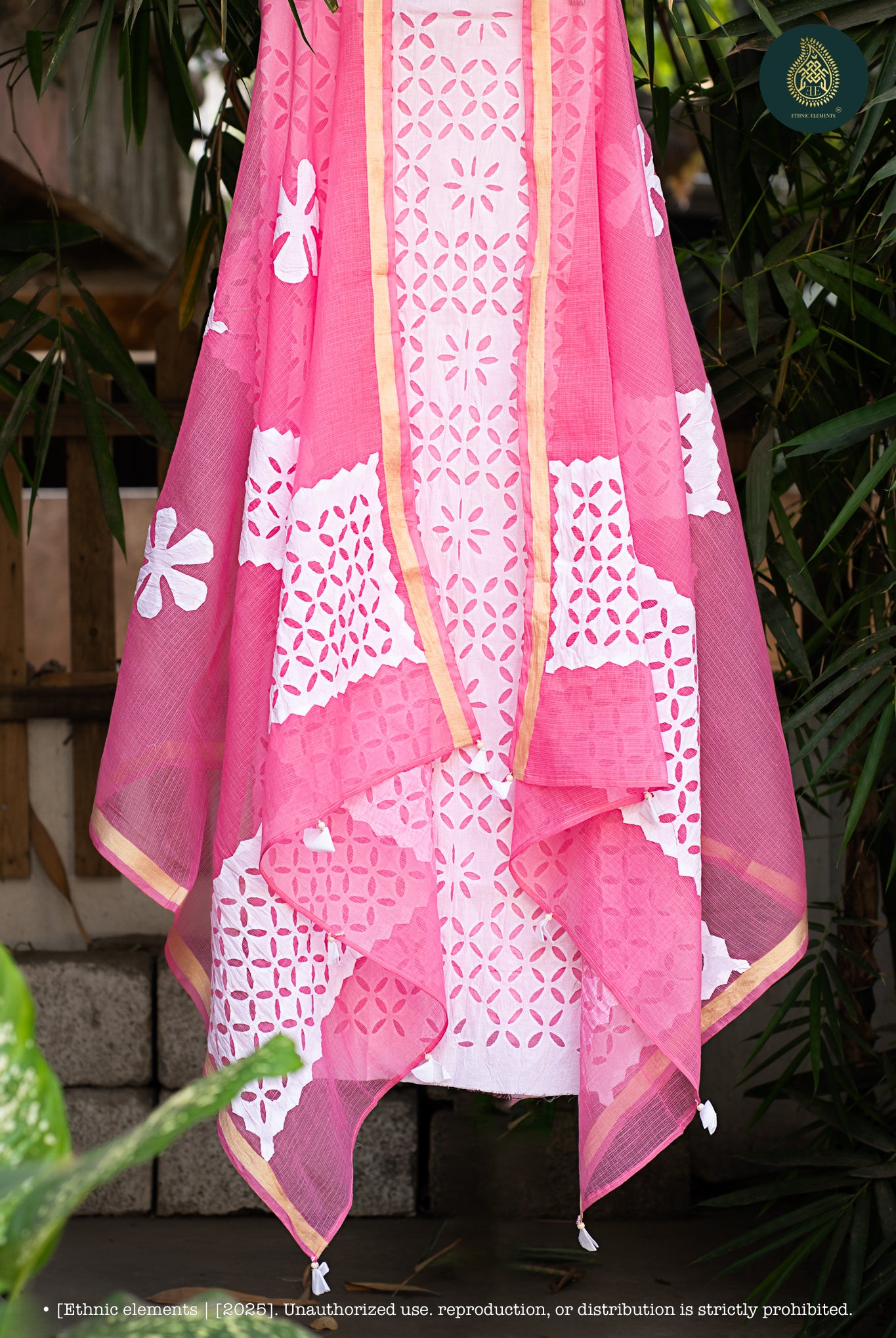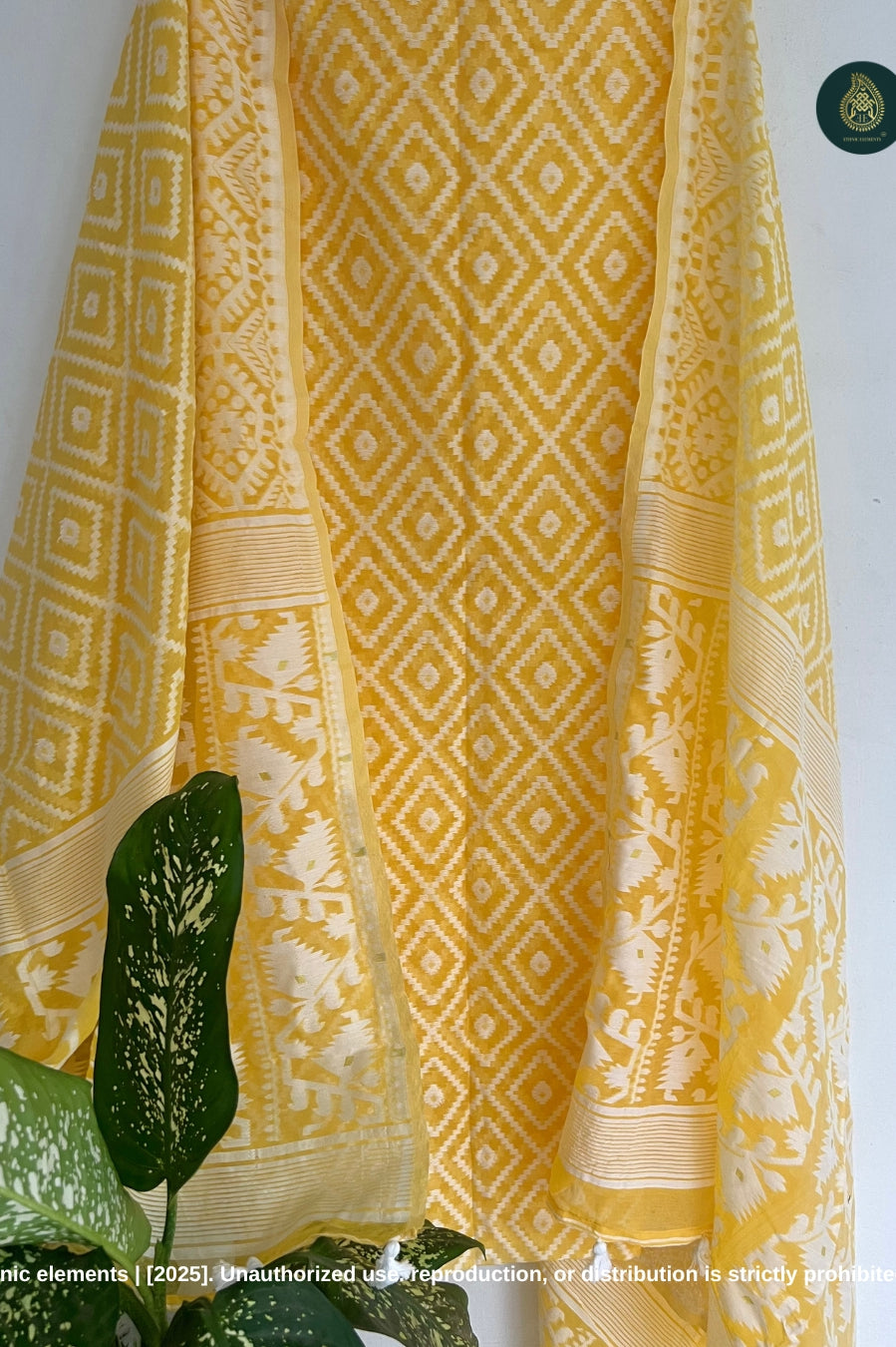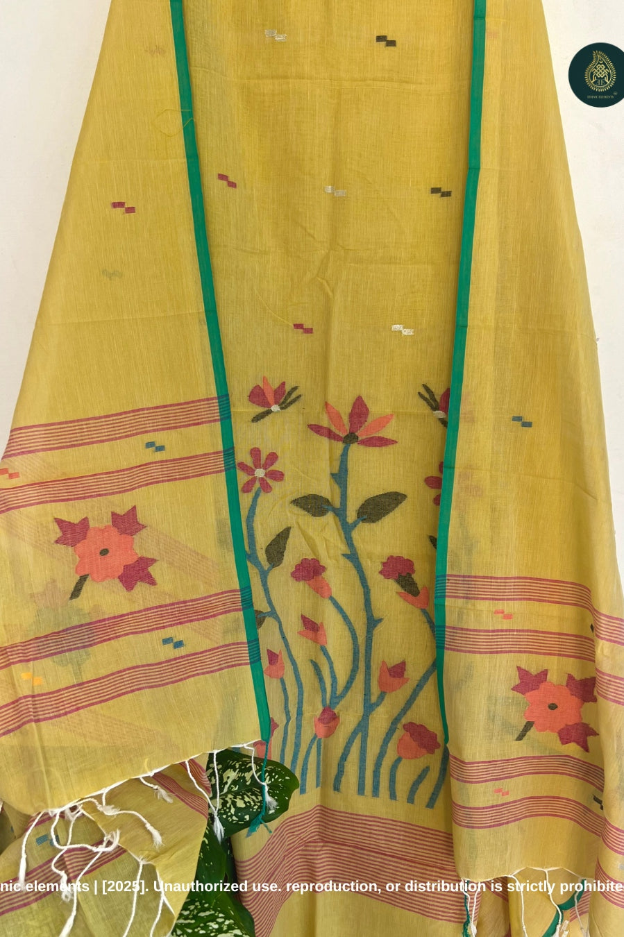 A Jamdani handloom suit set features intricate woven patterns with extra threads, creating a luxurious and textured fabric. Perfect for elegant occasions, it combines traditional craftsmanship with timeless beauty.