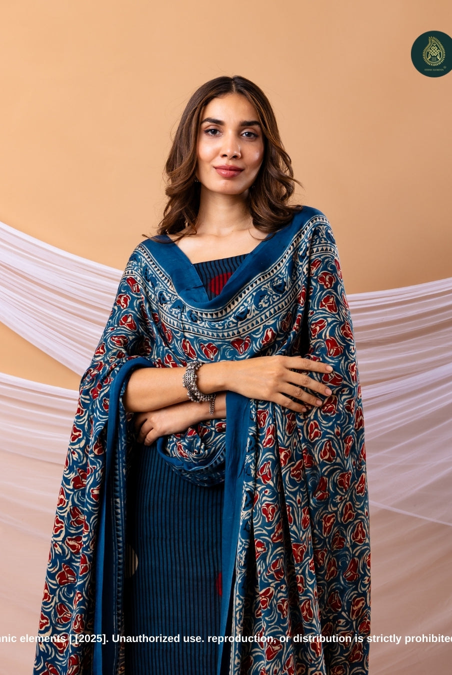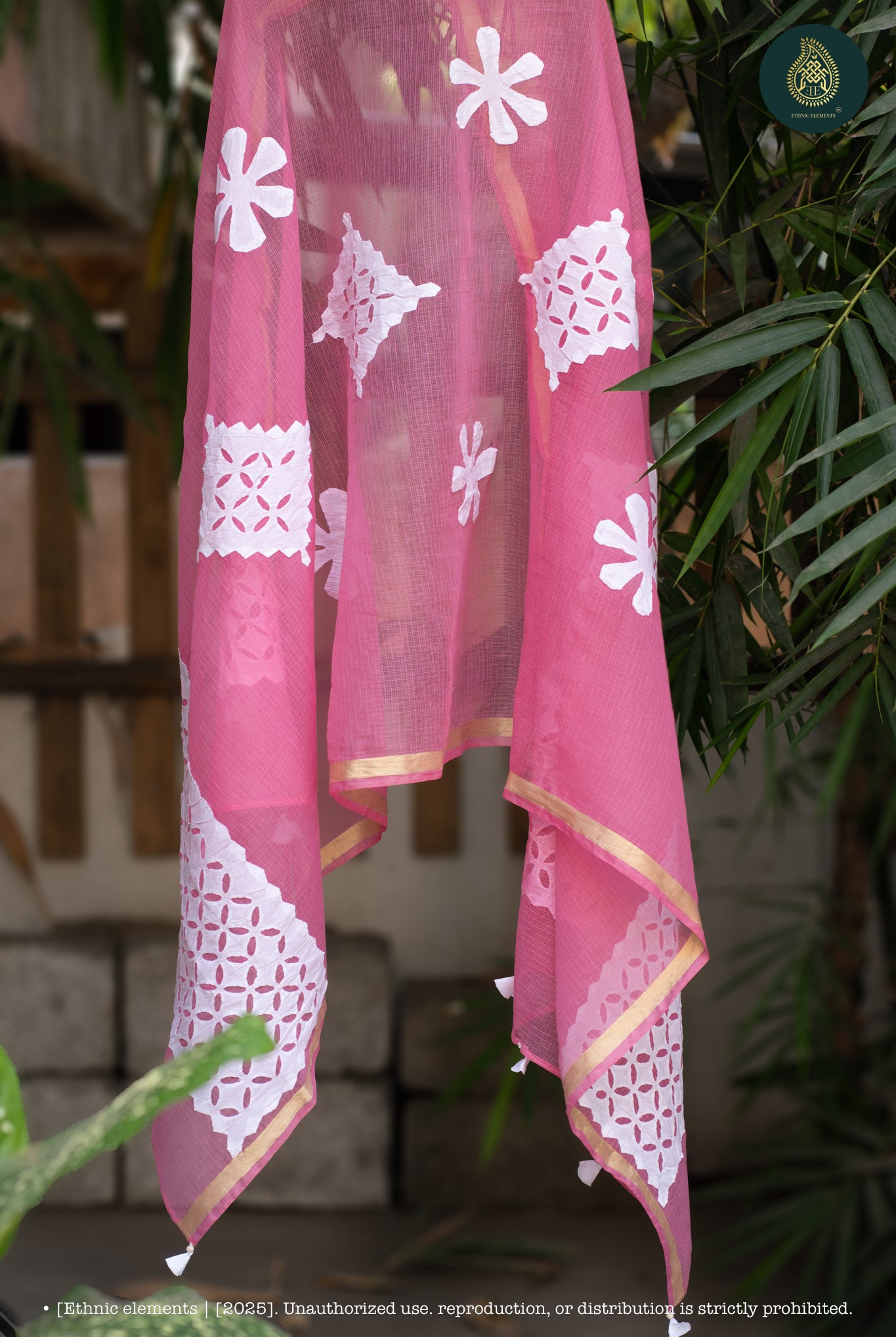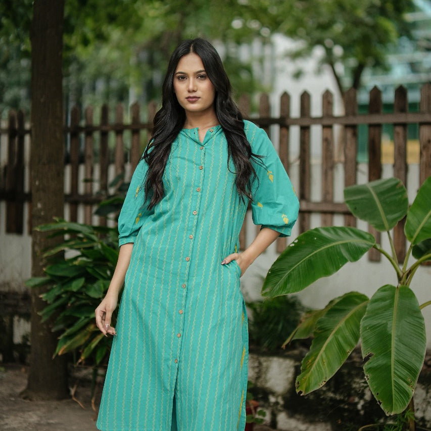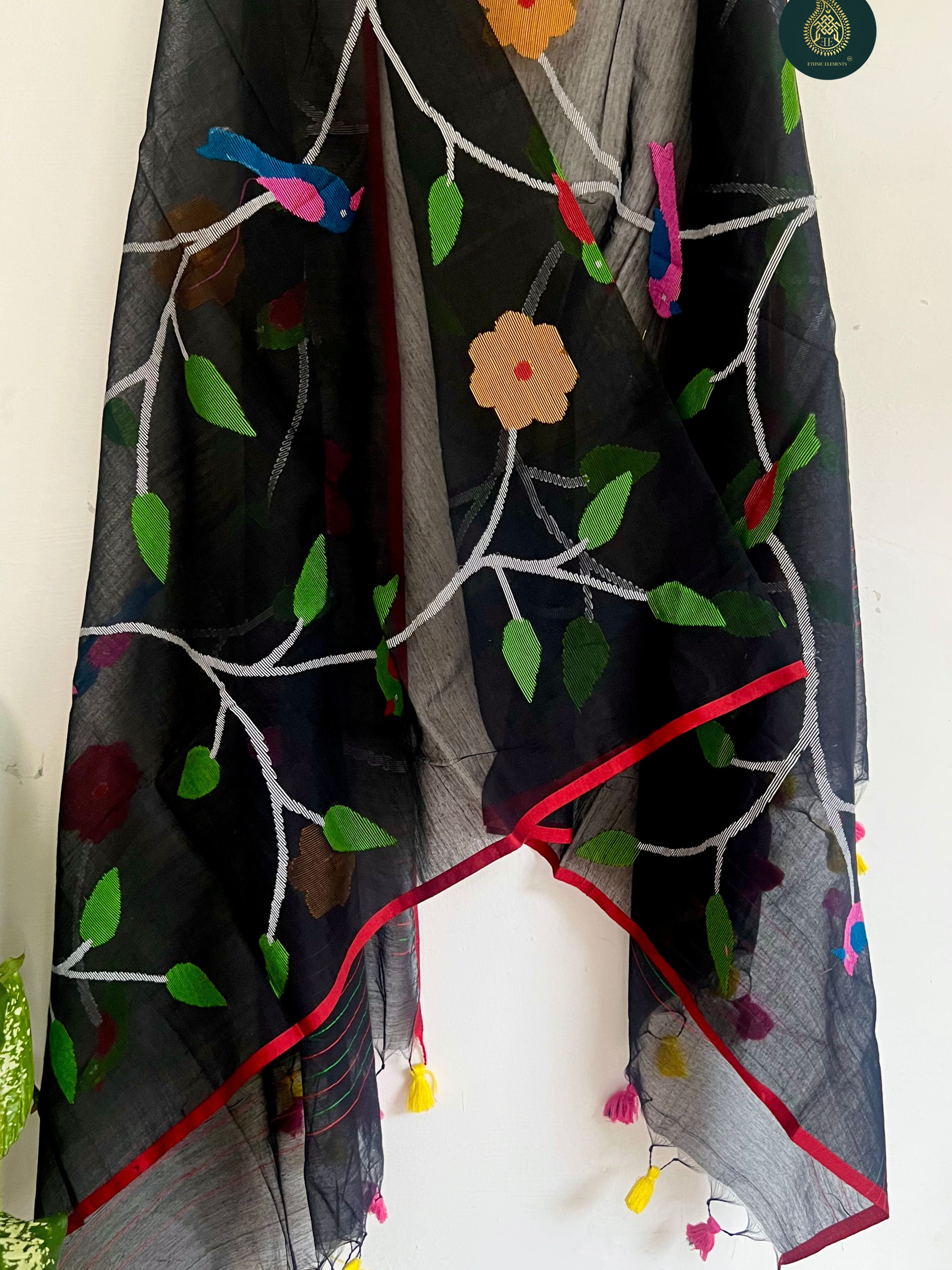 A Jamdani handloom suit set features intricate woven patterns with extra threads, creating a luxurious and textured fabric. Perfect for elegant occasions, it combines traditional craftsmanship with timeless beauty.