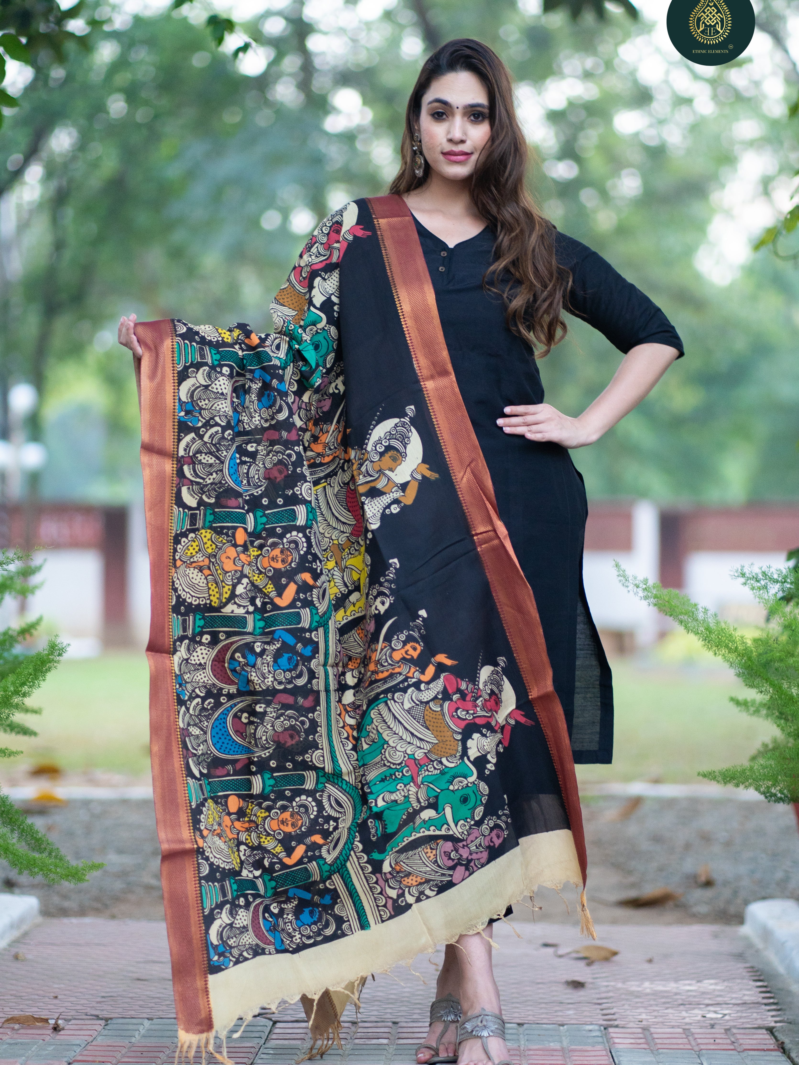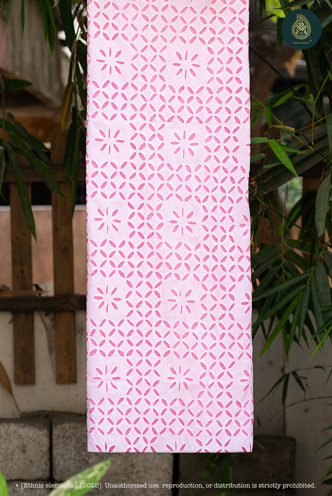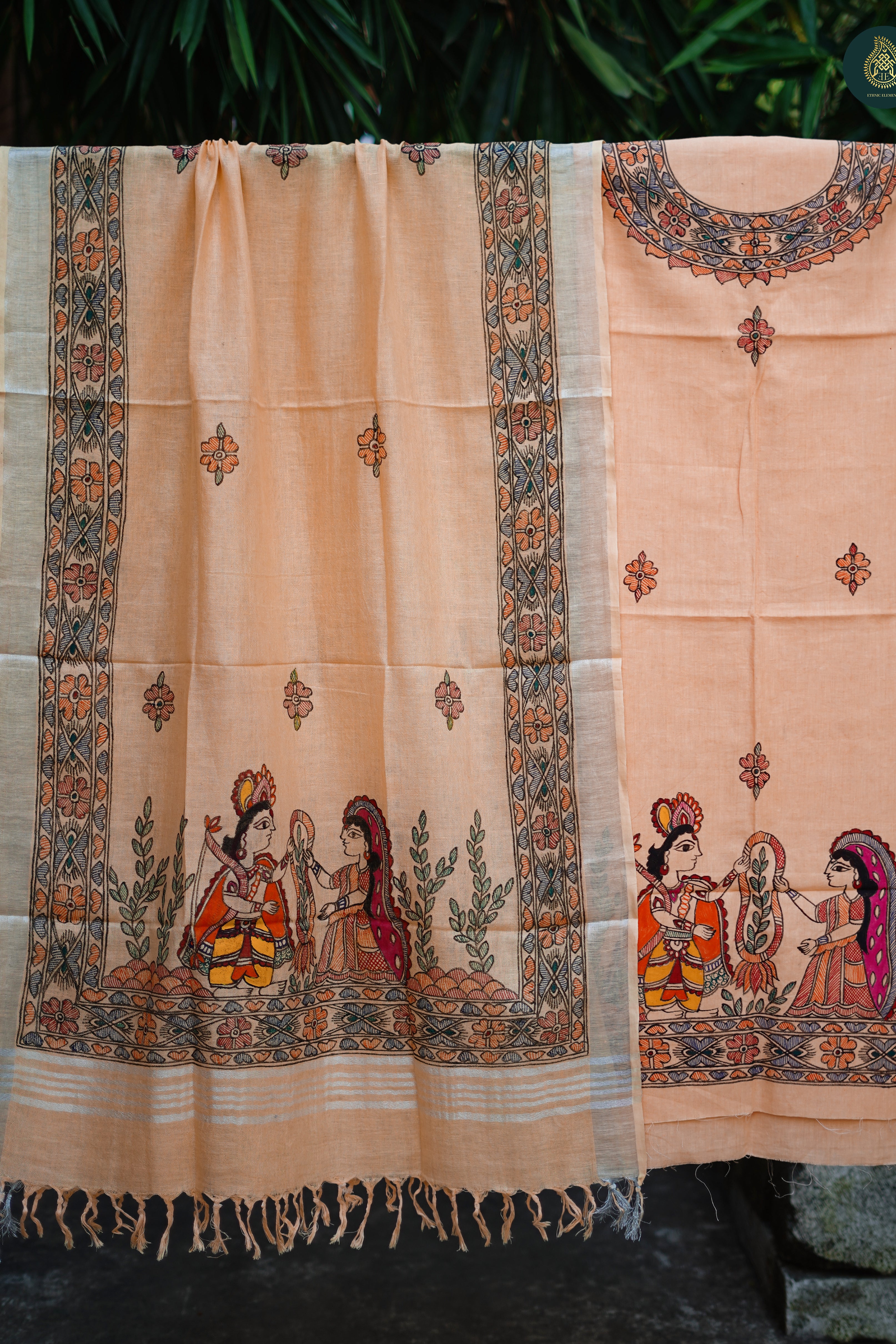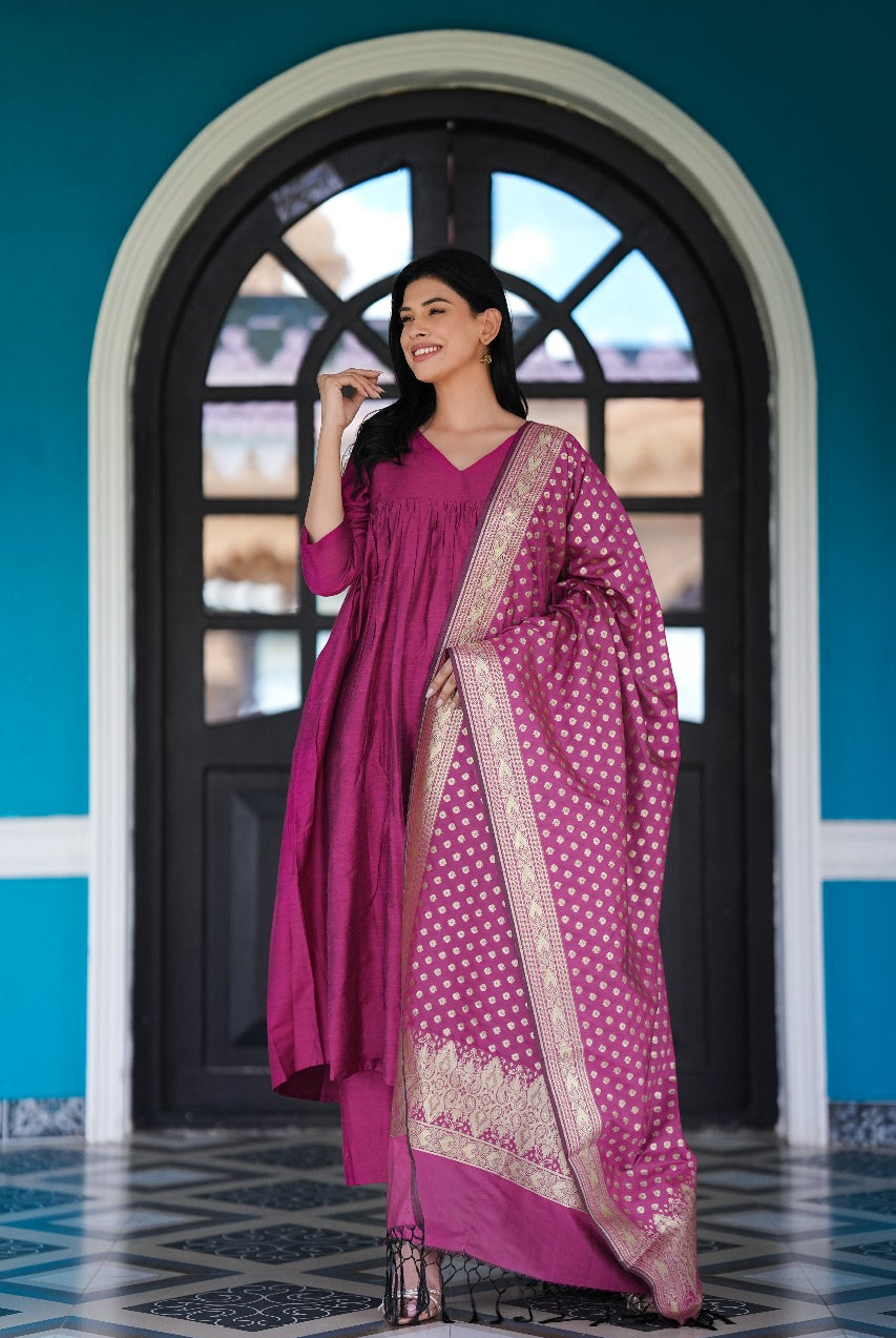A Jamdani handloom suit set features intricate woven patterns with extra threads, creating a luxurious and textured fabric. Perfect for elegant occasions, it combines traditional craftsmanship with timeless beauty.