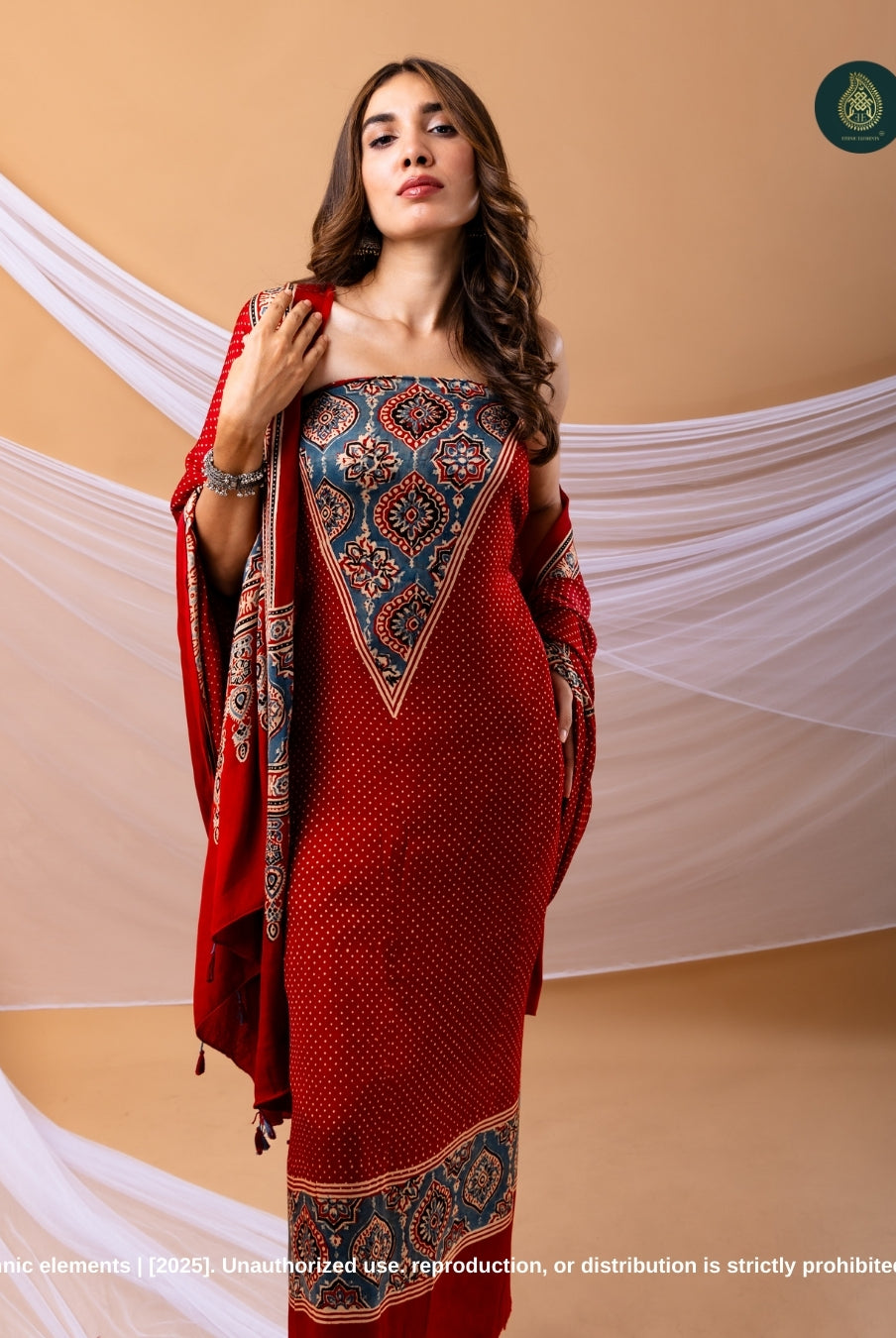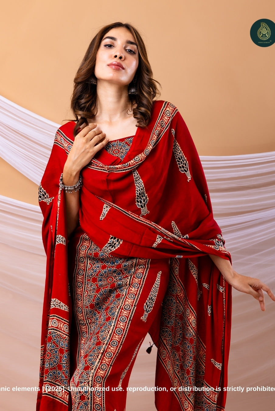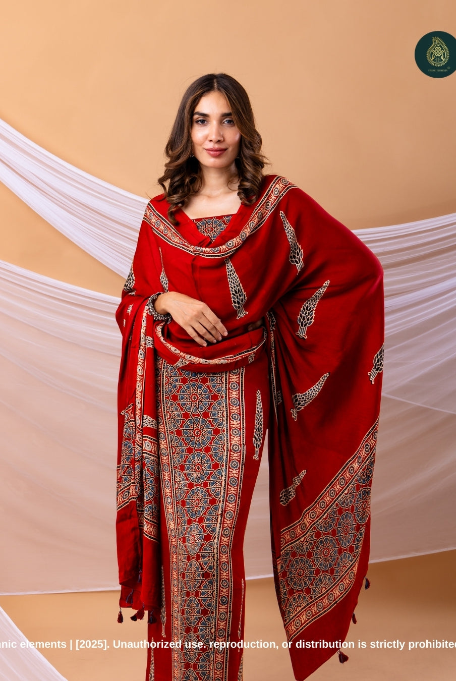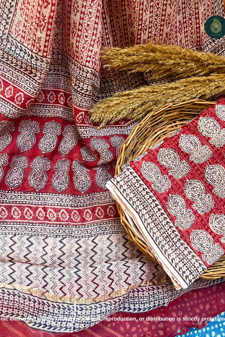 Stitched 2pc Cotton Silk Suit Set - Crimson Red