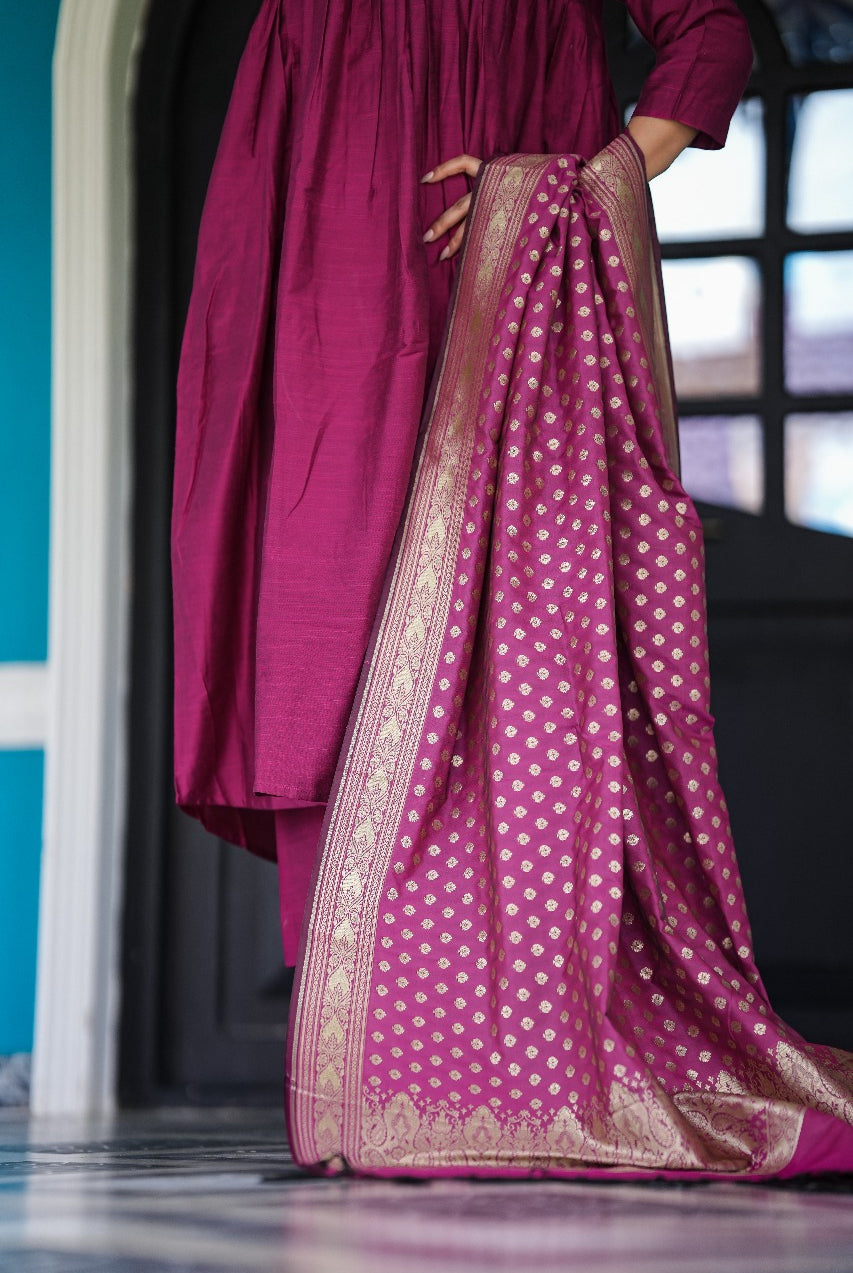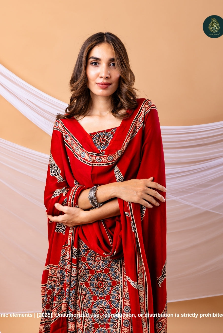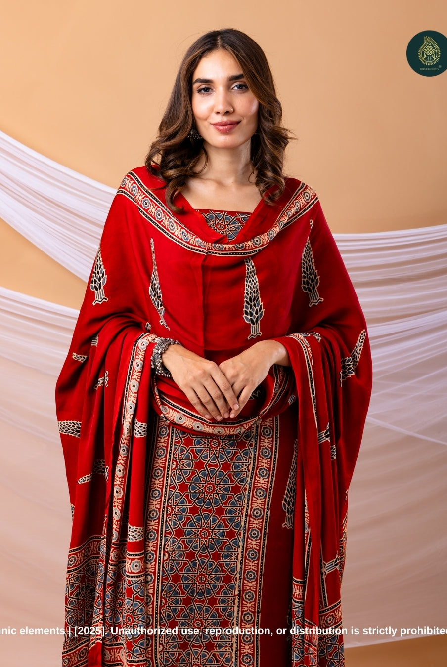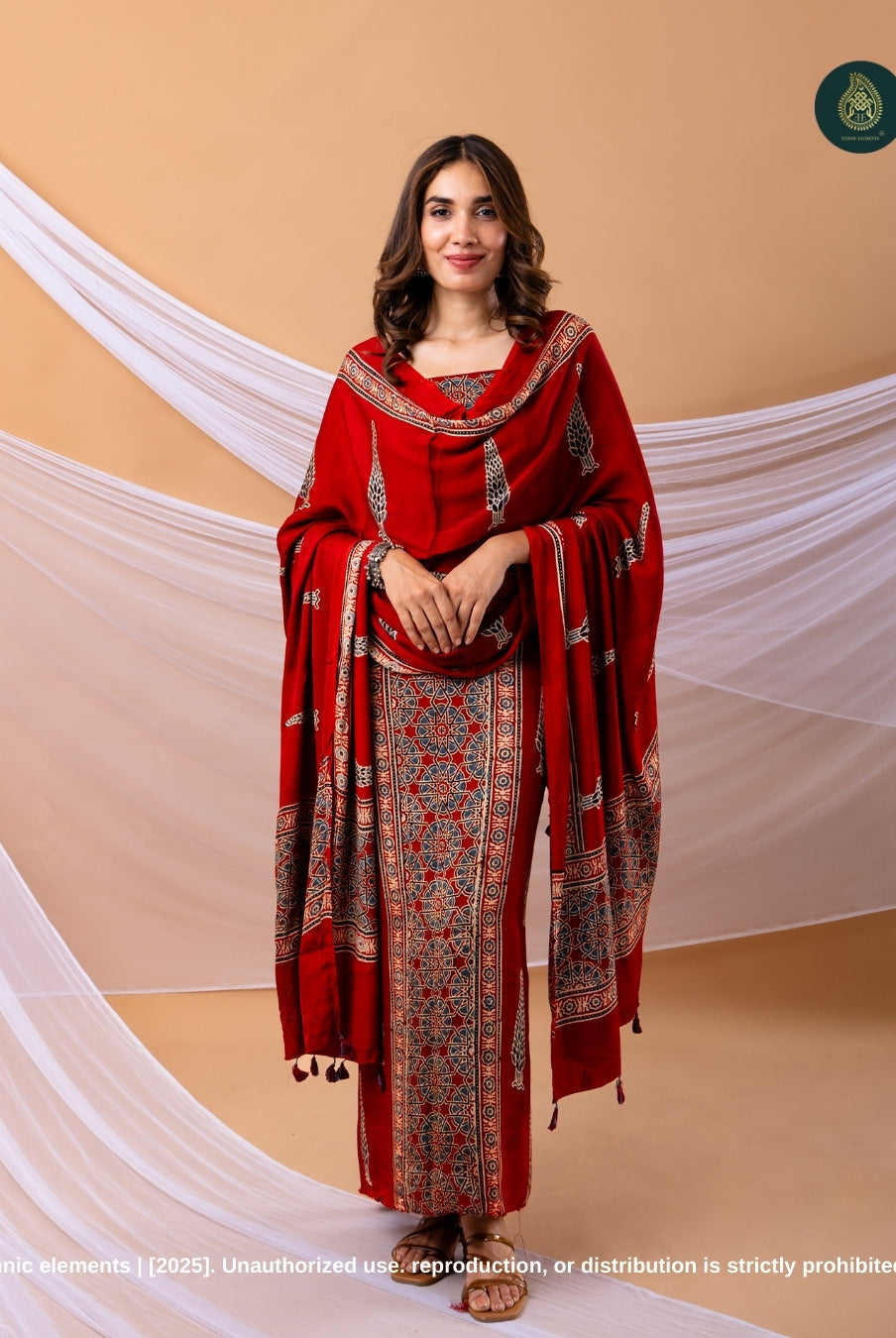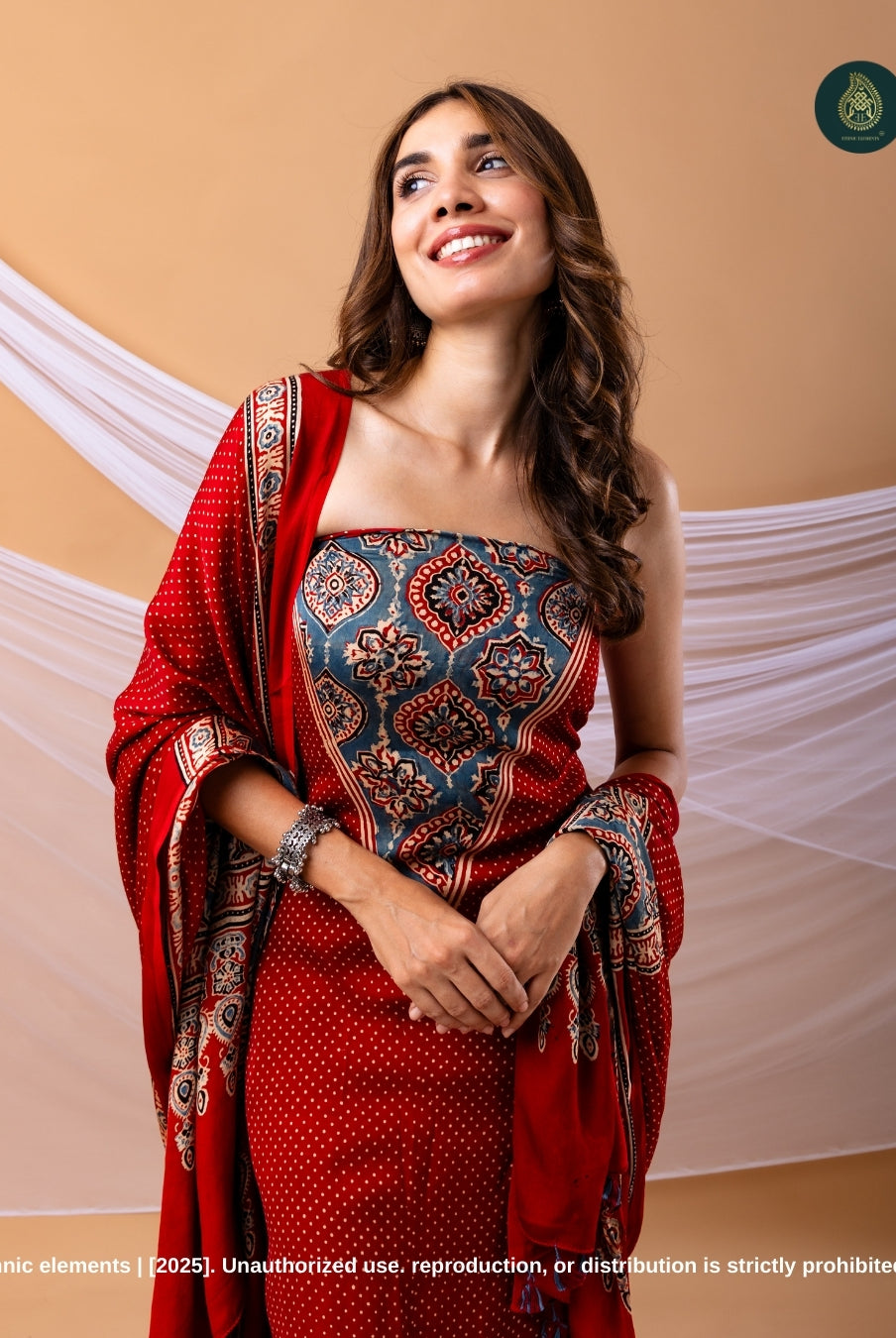 Stitched 2pc Cotton Silk Suit Set - Crimson Red