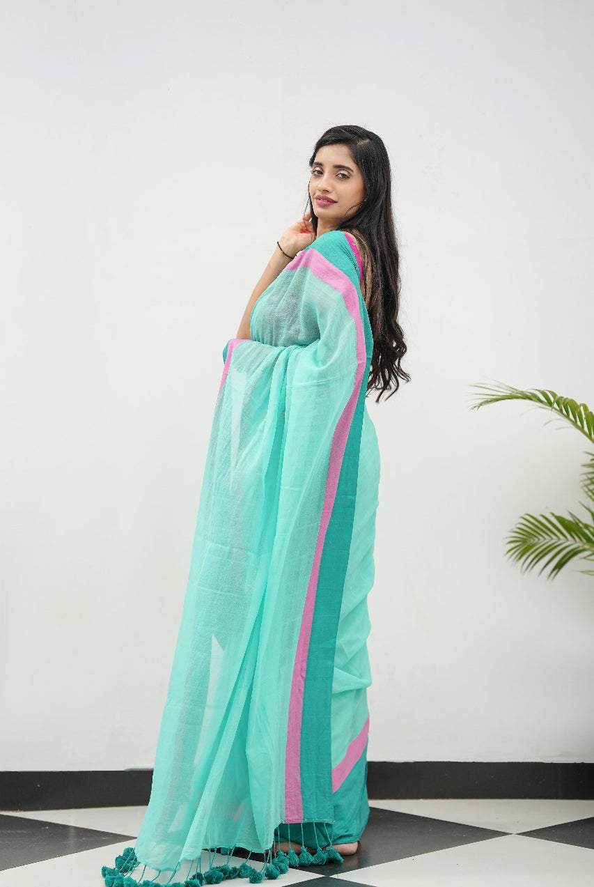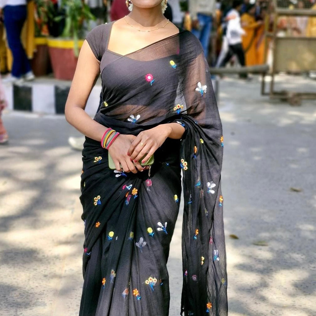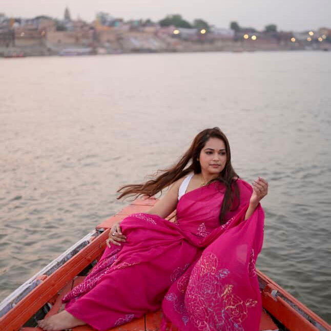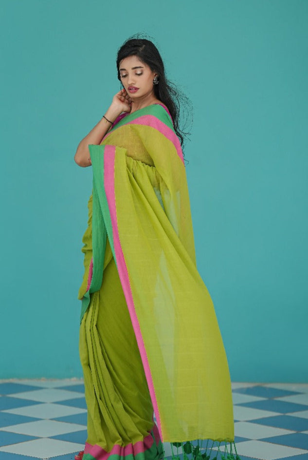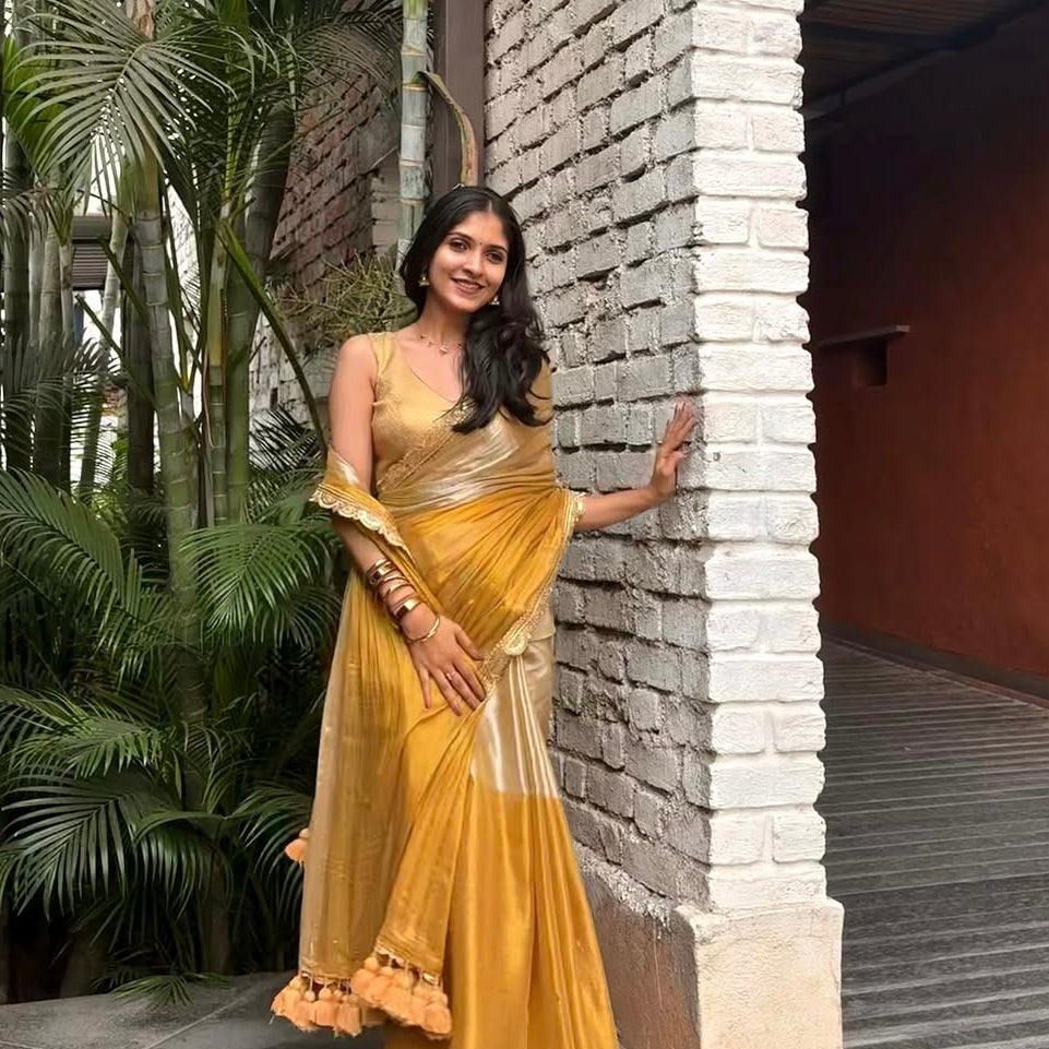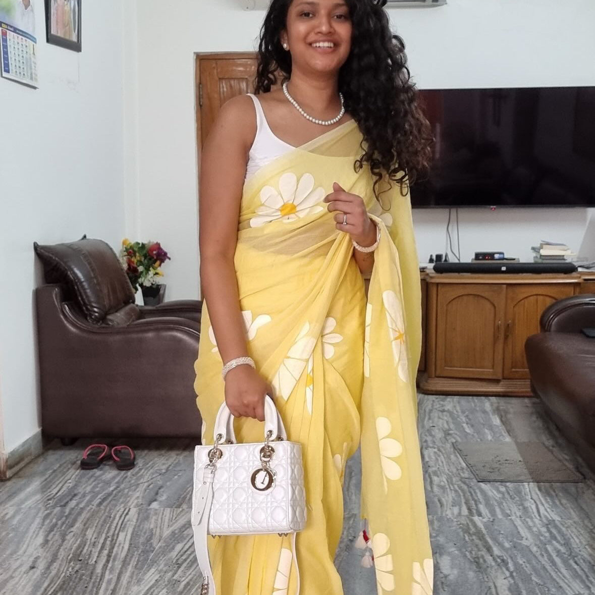 This saree is pure joy! The color is so fresh and vibrant, and the fabric feels light and breezy-perfect for all-day wear. I love how effortlessly elegant it makes me feel, whether I’m outdoors or at a casual gathering.