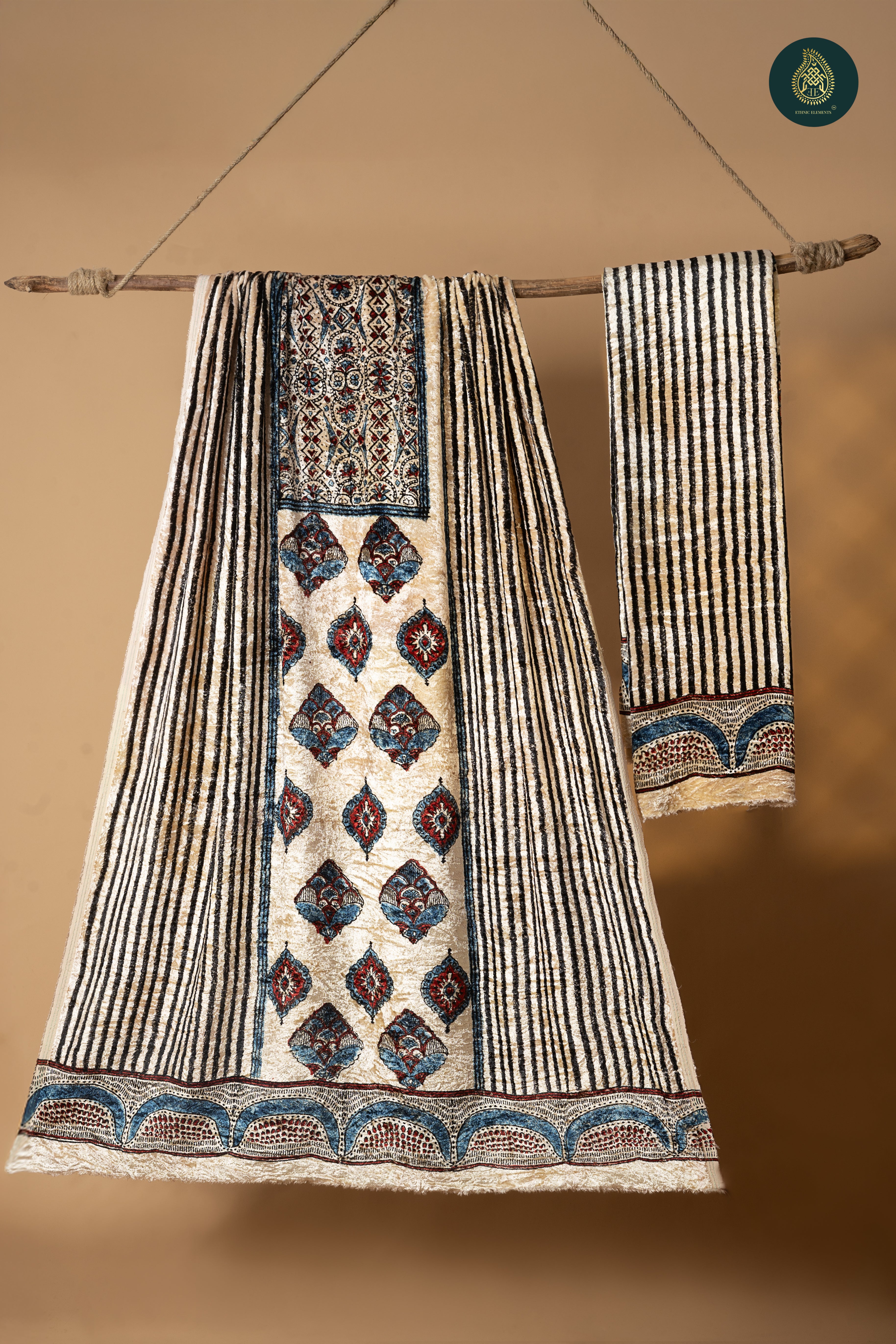 Velvet Ajrakh/Ajrak fabric for kurta. The Ajrakh blocks are made using wooden blocks and organic natural colors. This is only a kurta fabric piece.