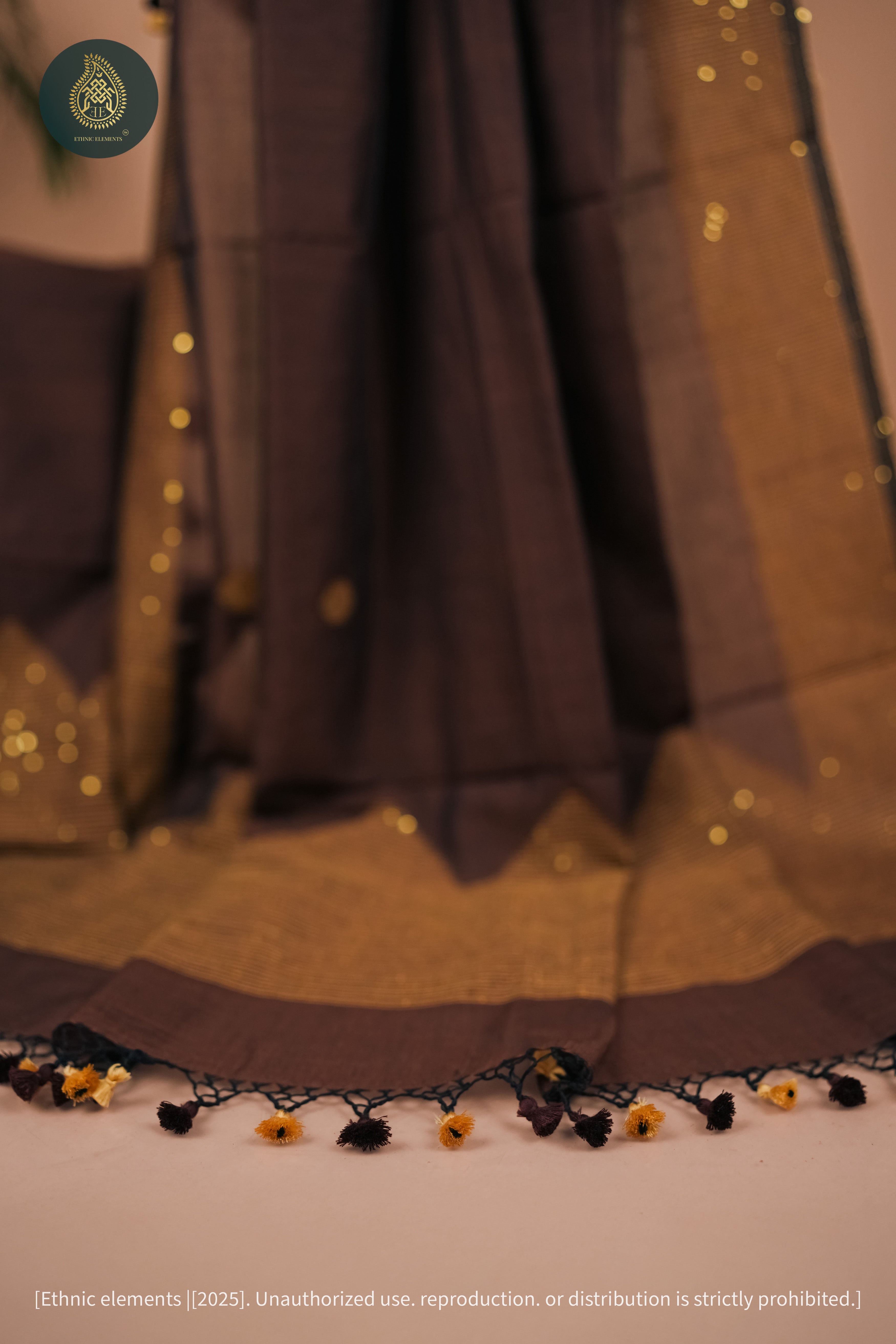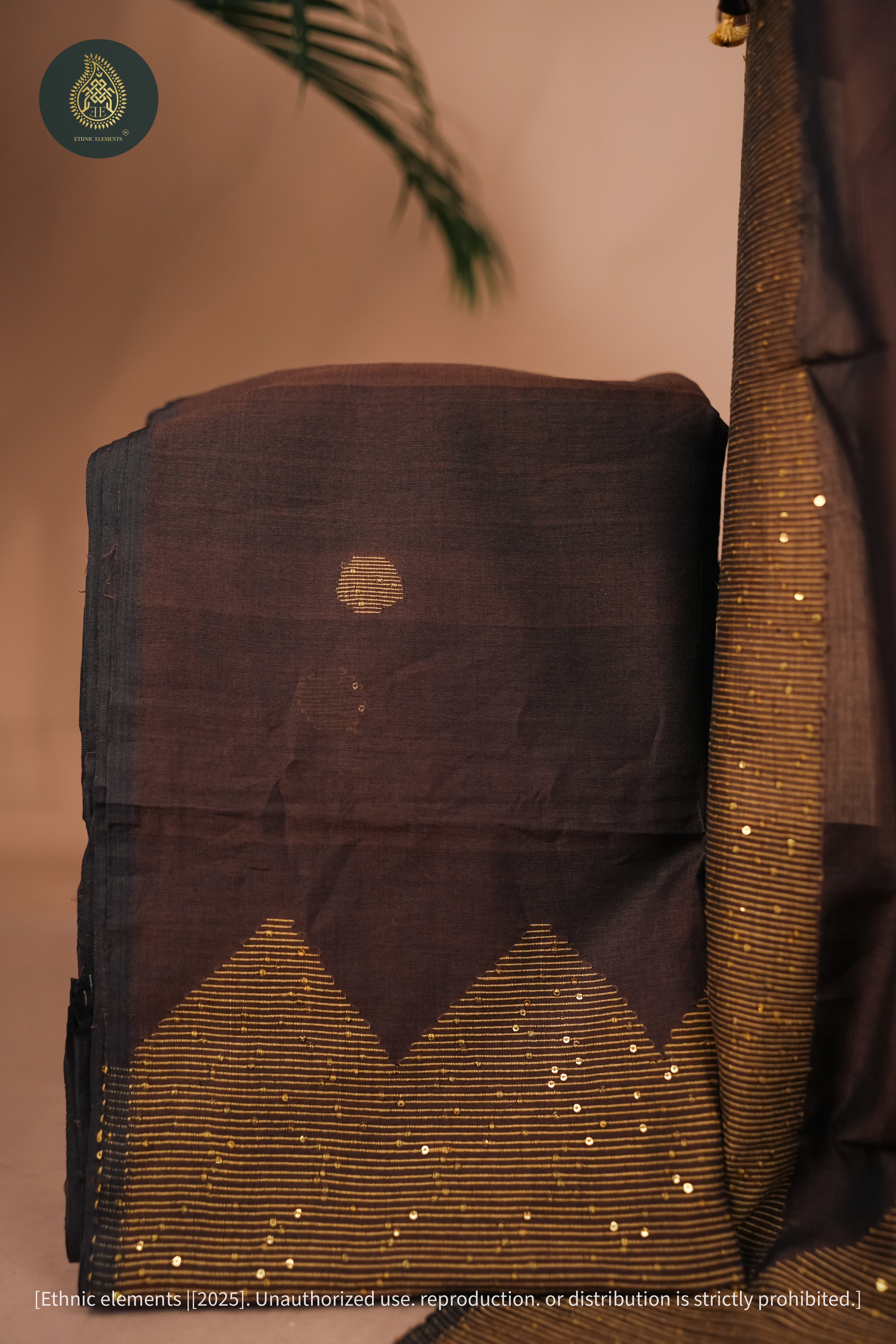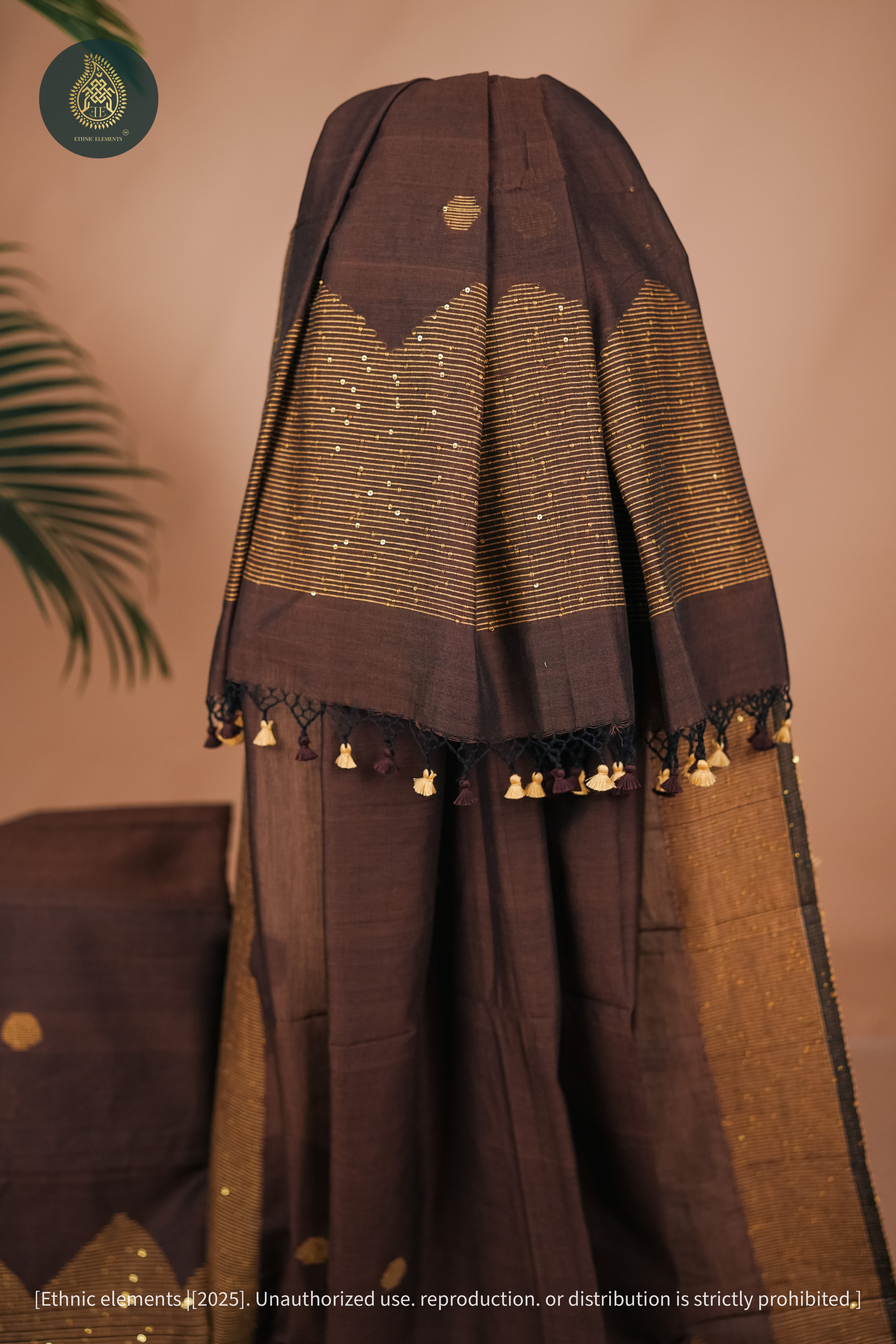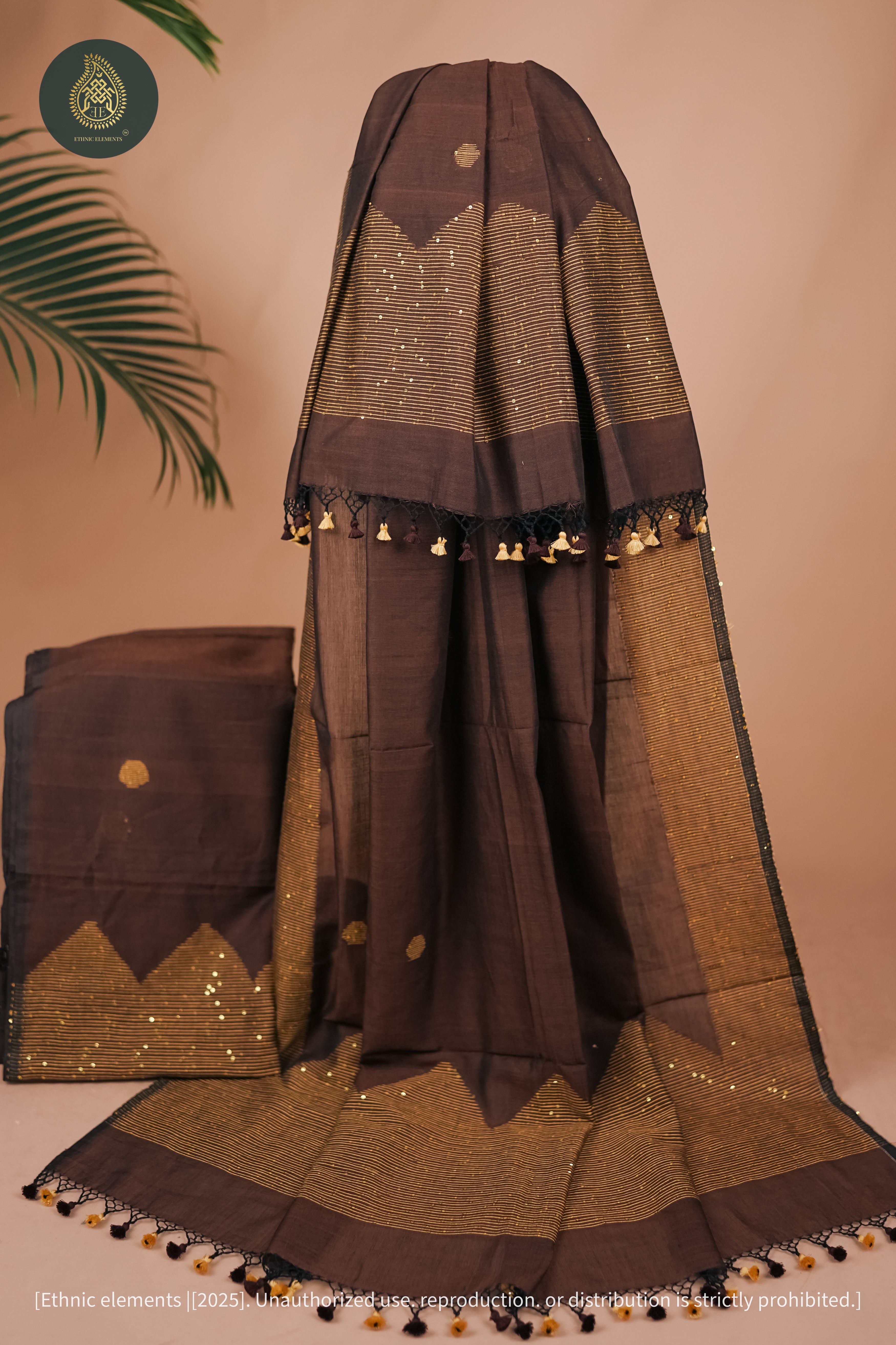 Elevate your ethnic wardrobe with this vibrant Brown handwoven cotton suit set, intricately adorned with delicate sequin hand embroidery. The Brown hue paired with subtle shimmer detailing creates a graceful, festive charm perfect for intimate gatherings, celebrations, or elegant day wear.