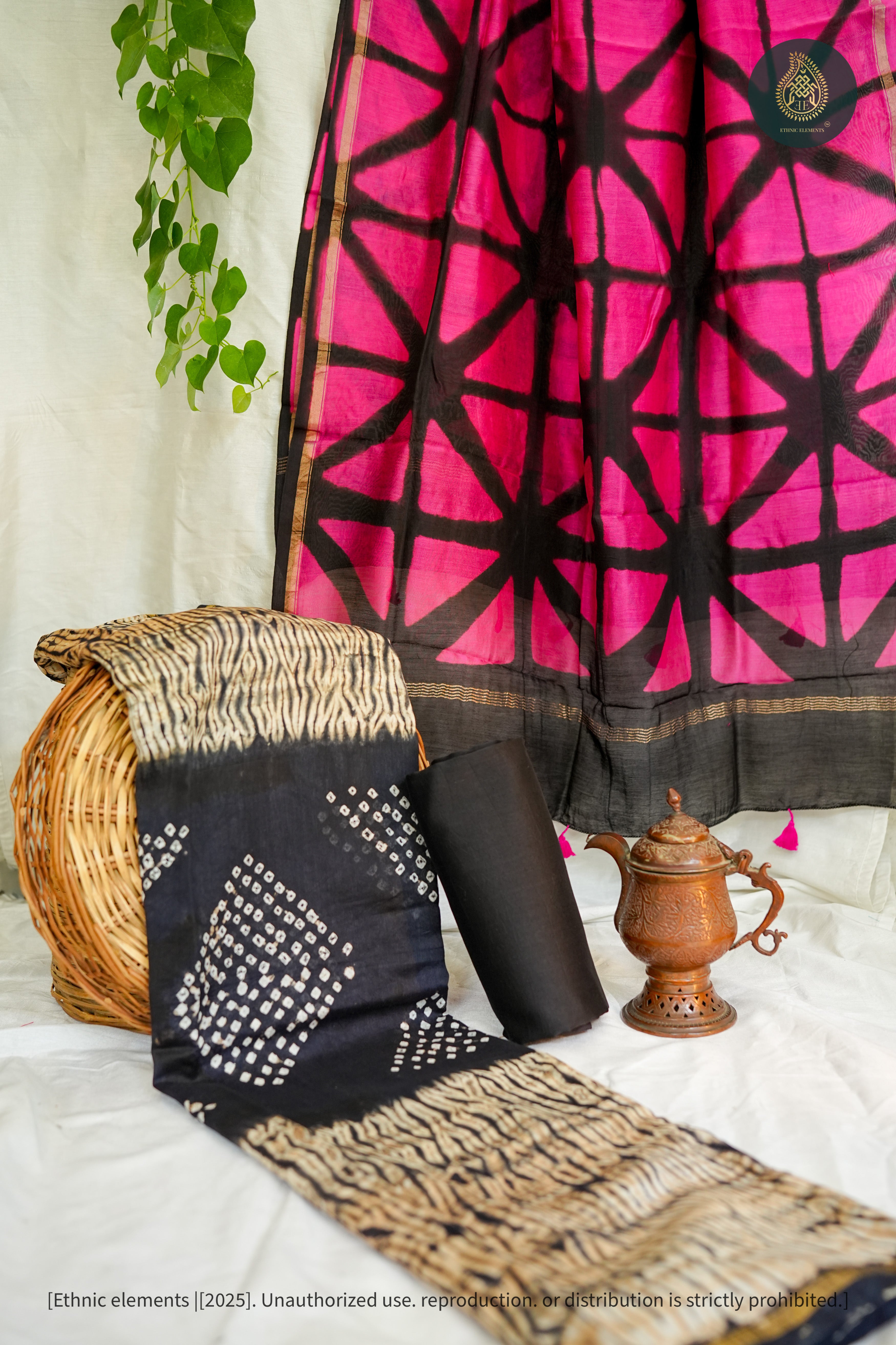 1.Chanderi Silk Unstitched Suit Set – Bandhani & Shibori Kurta, Clamp-Dyed Dupatta