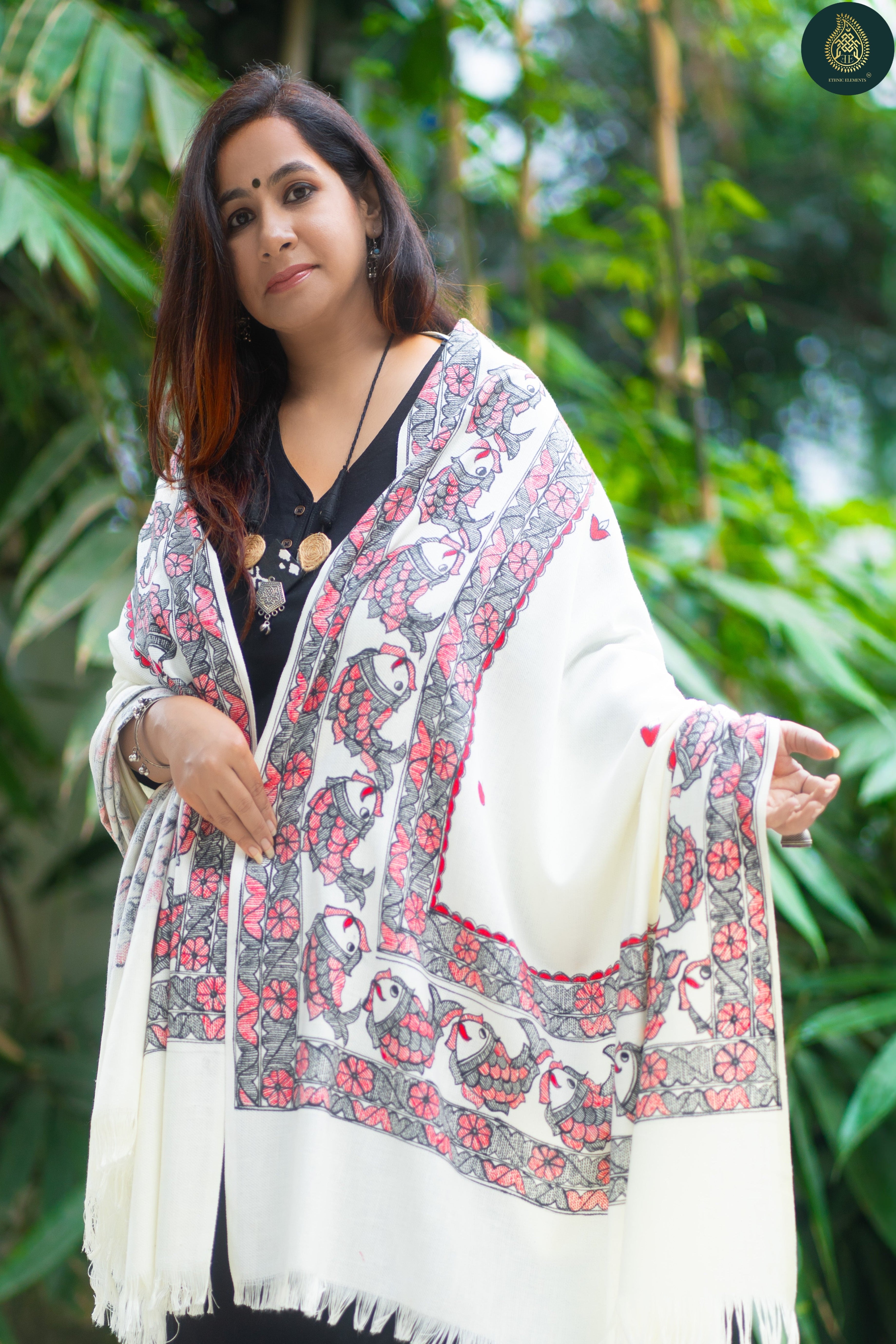Madhubani Woolen Shawl - Fiery Gills & Dark Fins