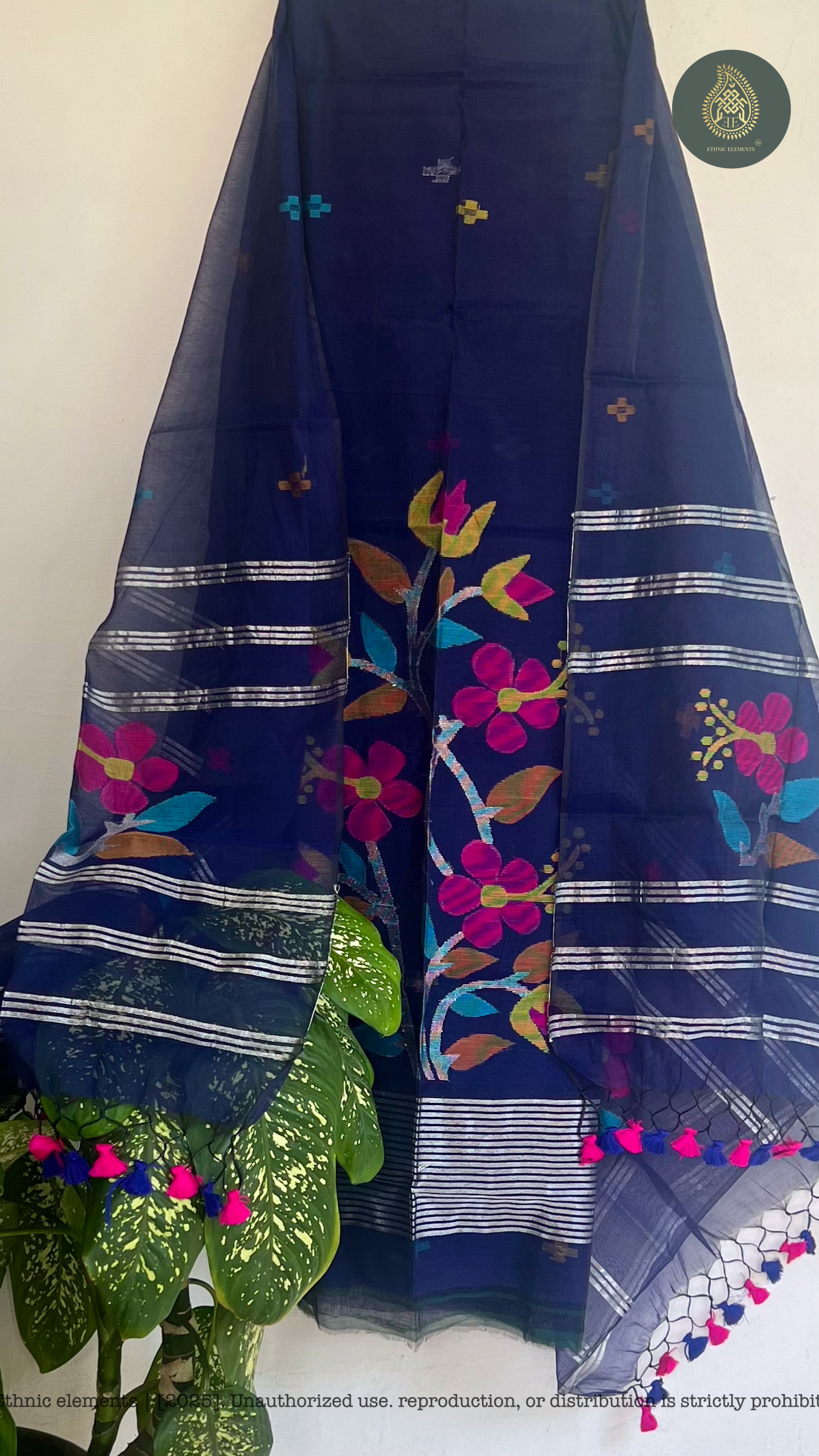Resham Muslin Jamdani Suit Set - Navy Petals