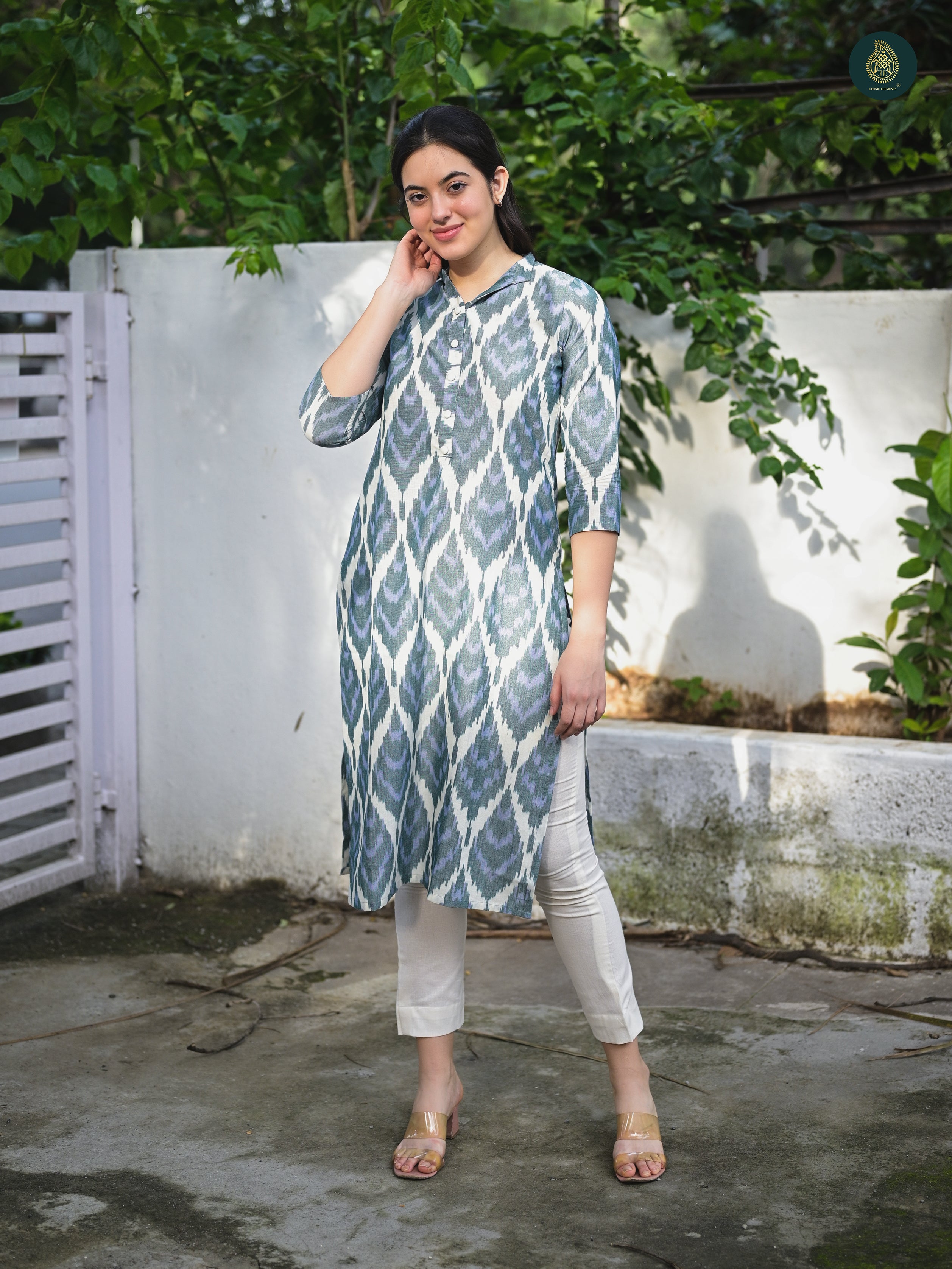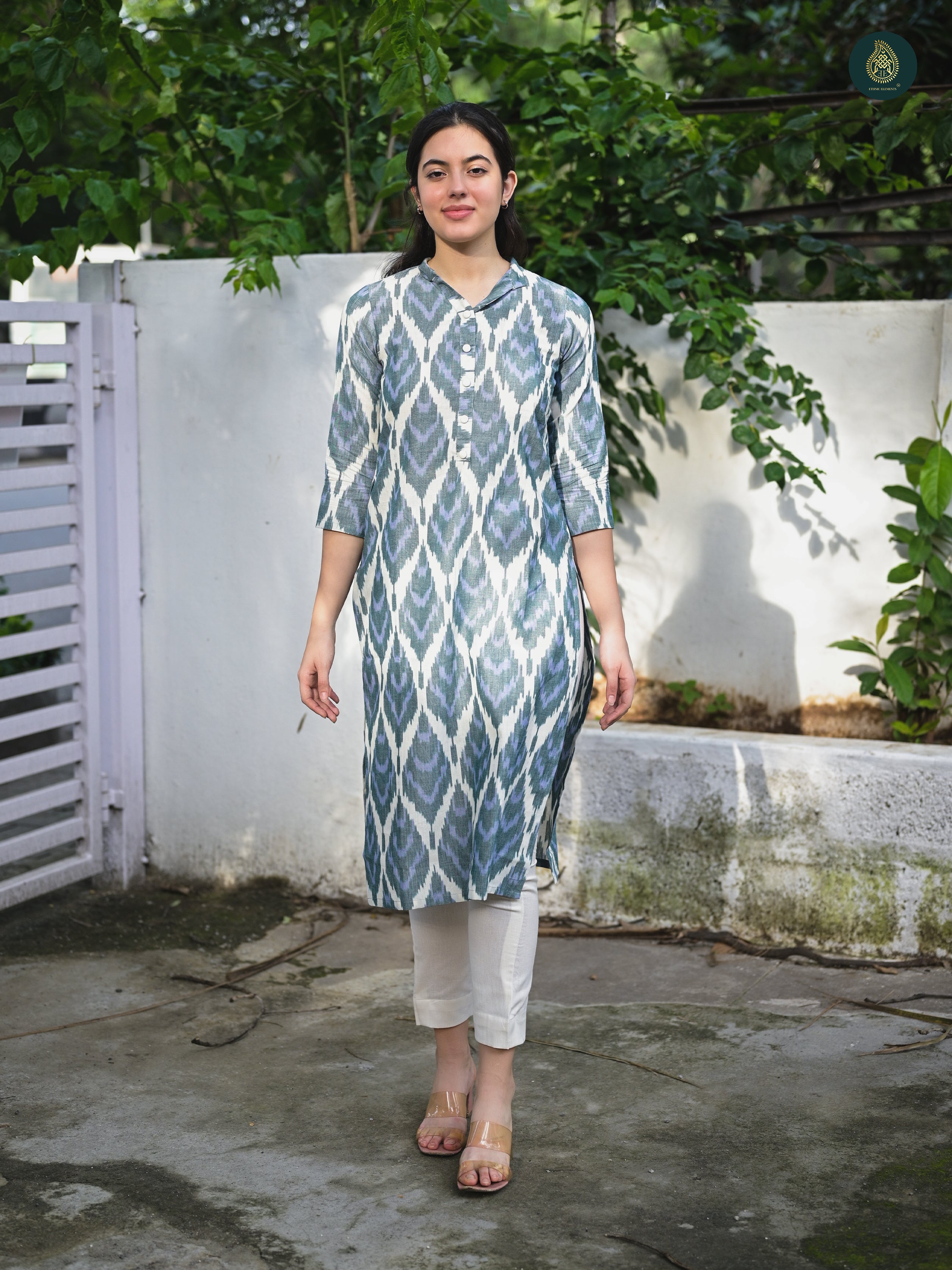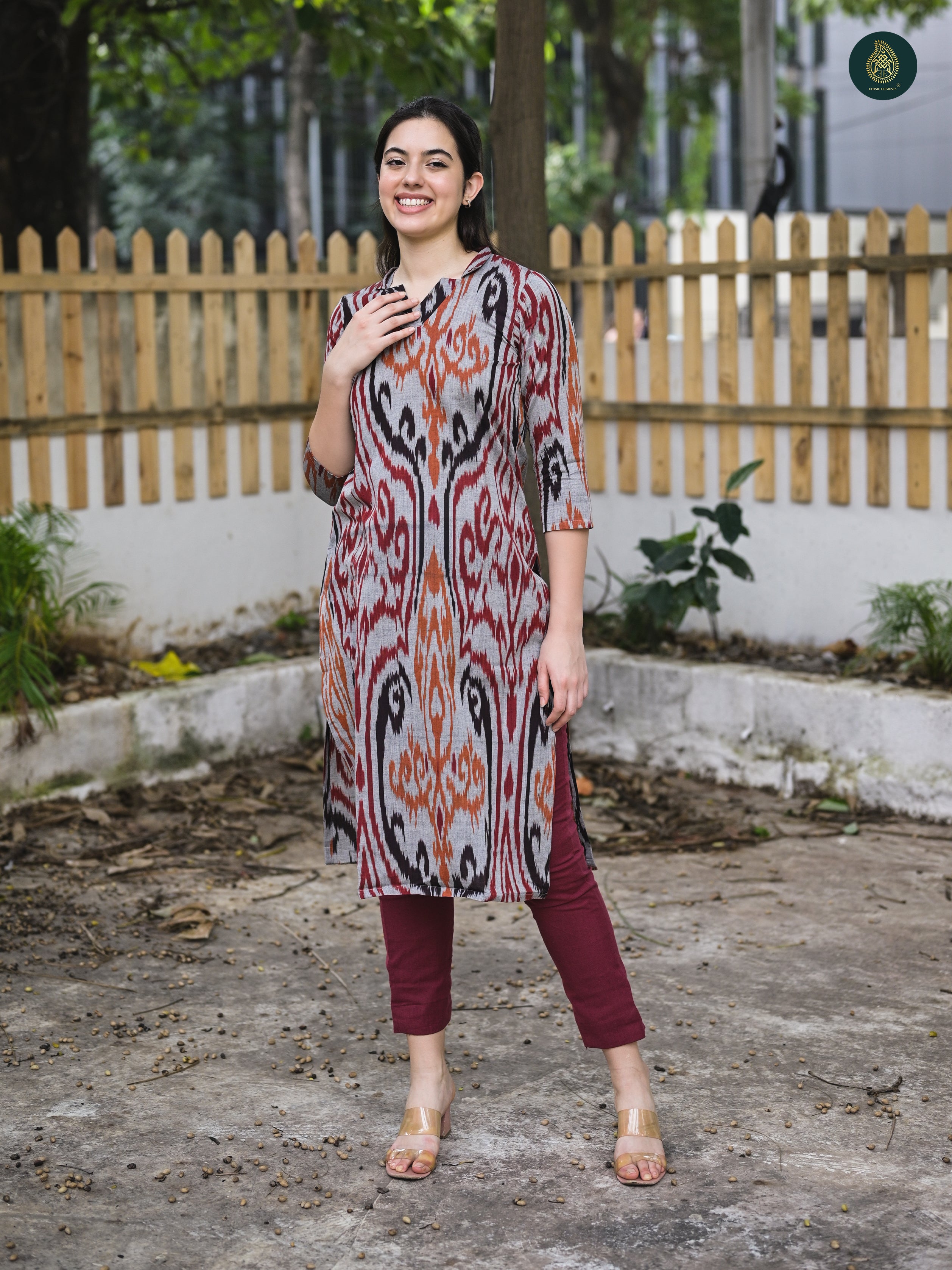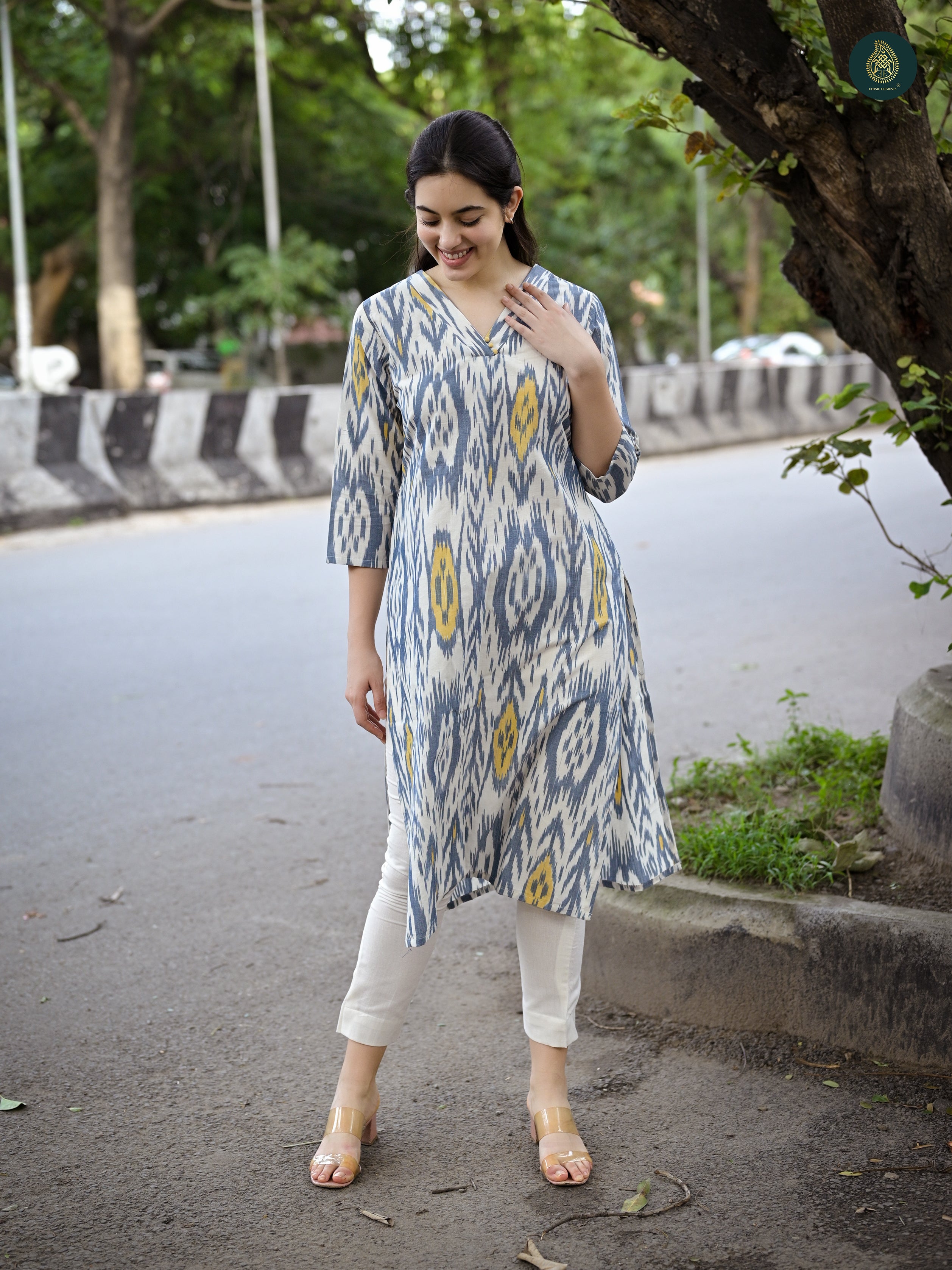 Stitched 2pc Uzbek Ikkat Suit Set - Creamy Grey