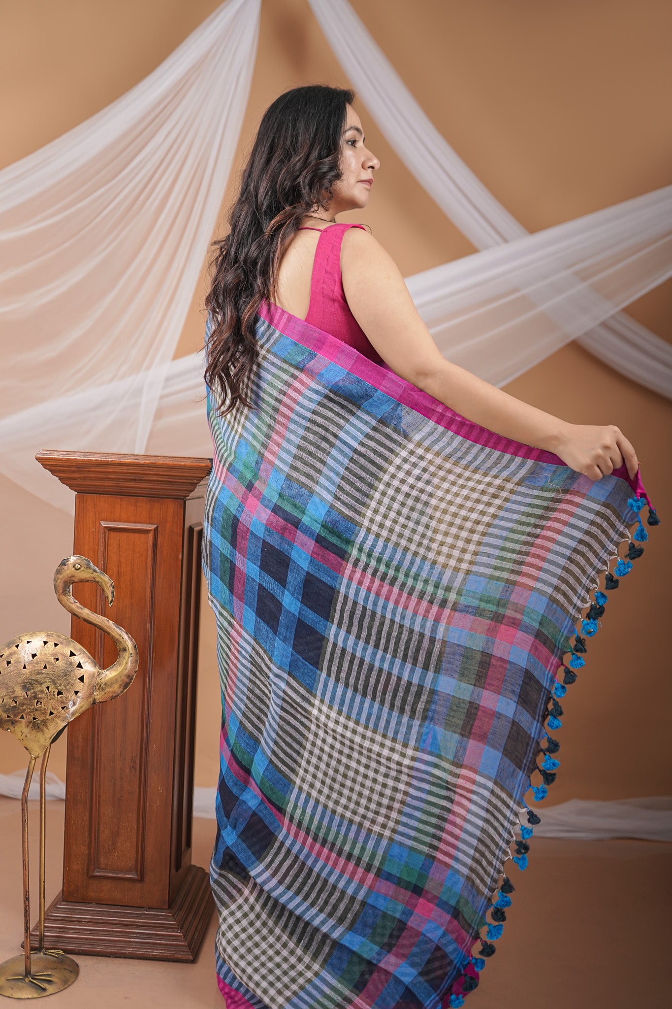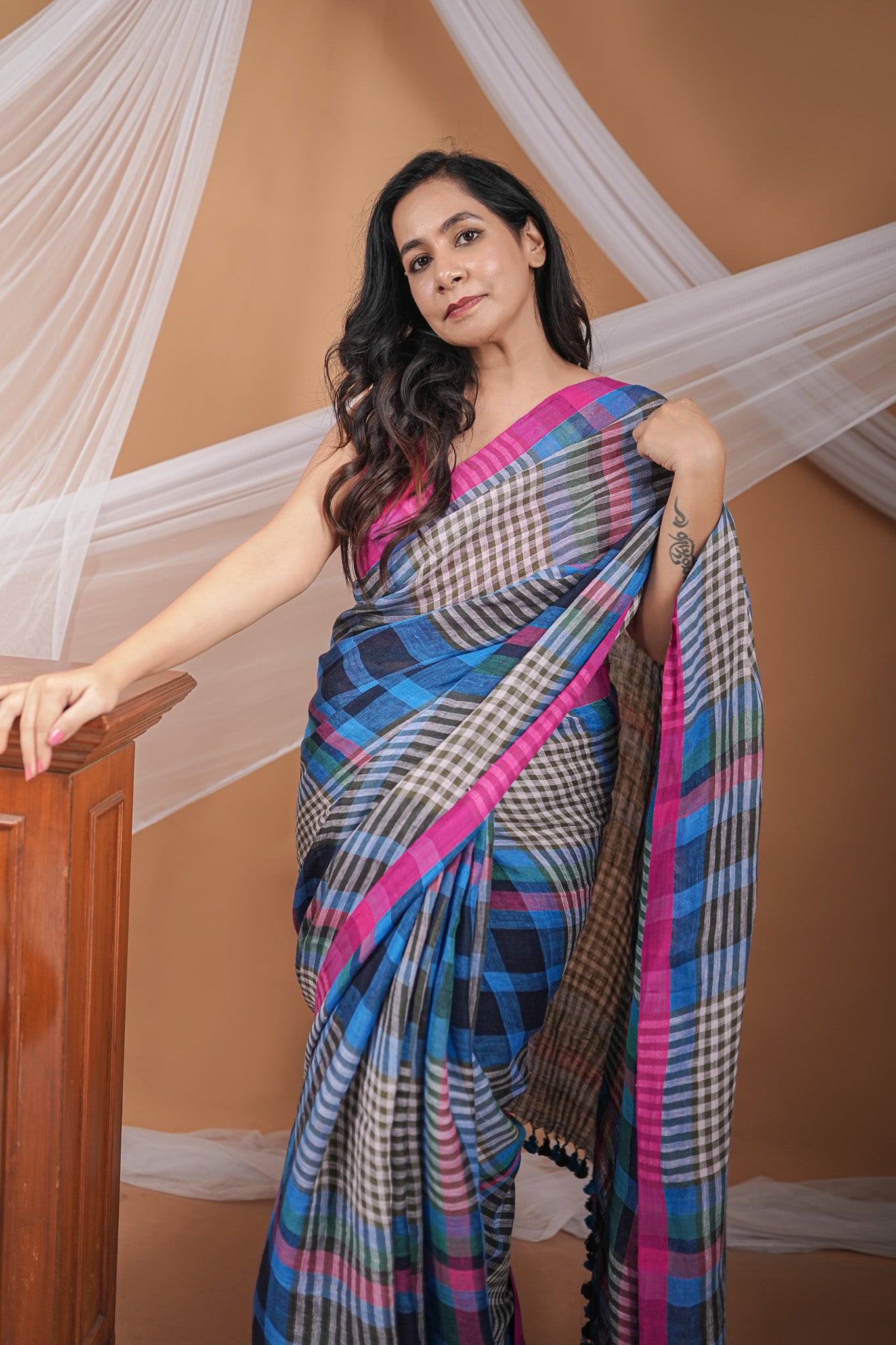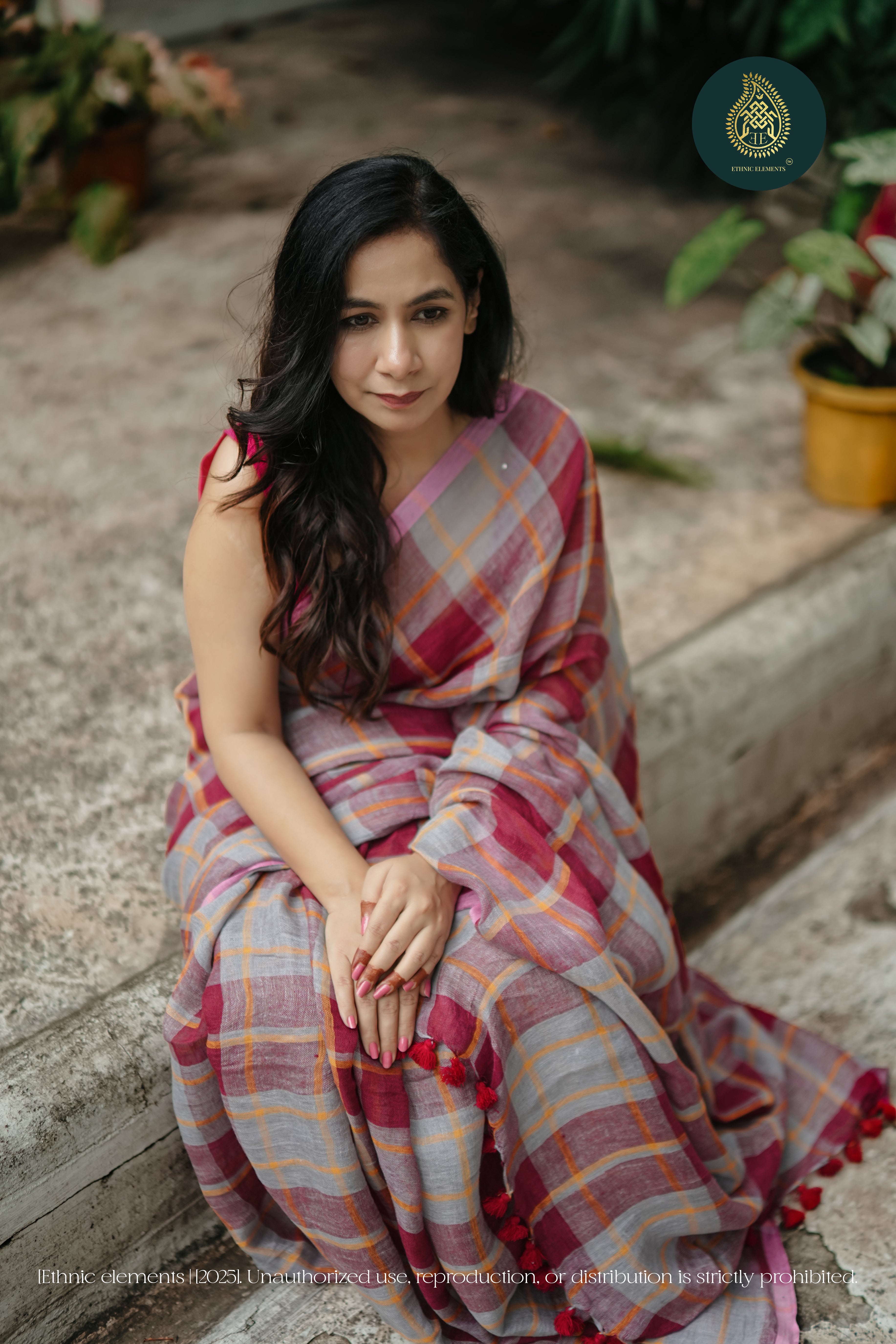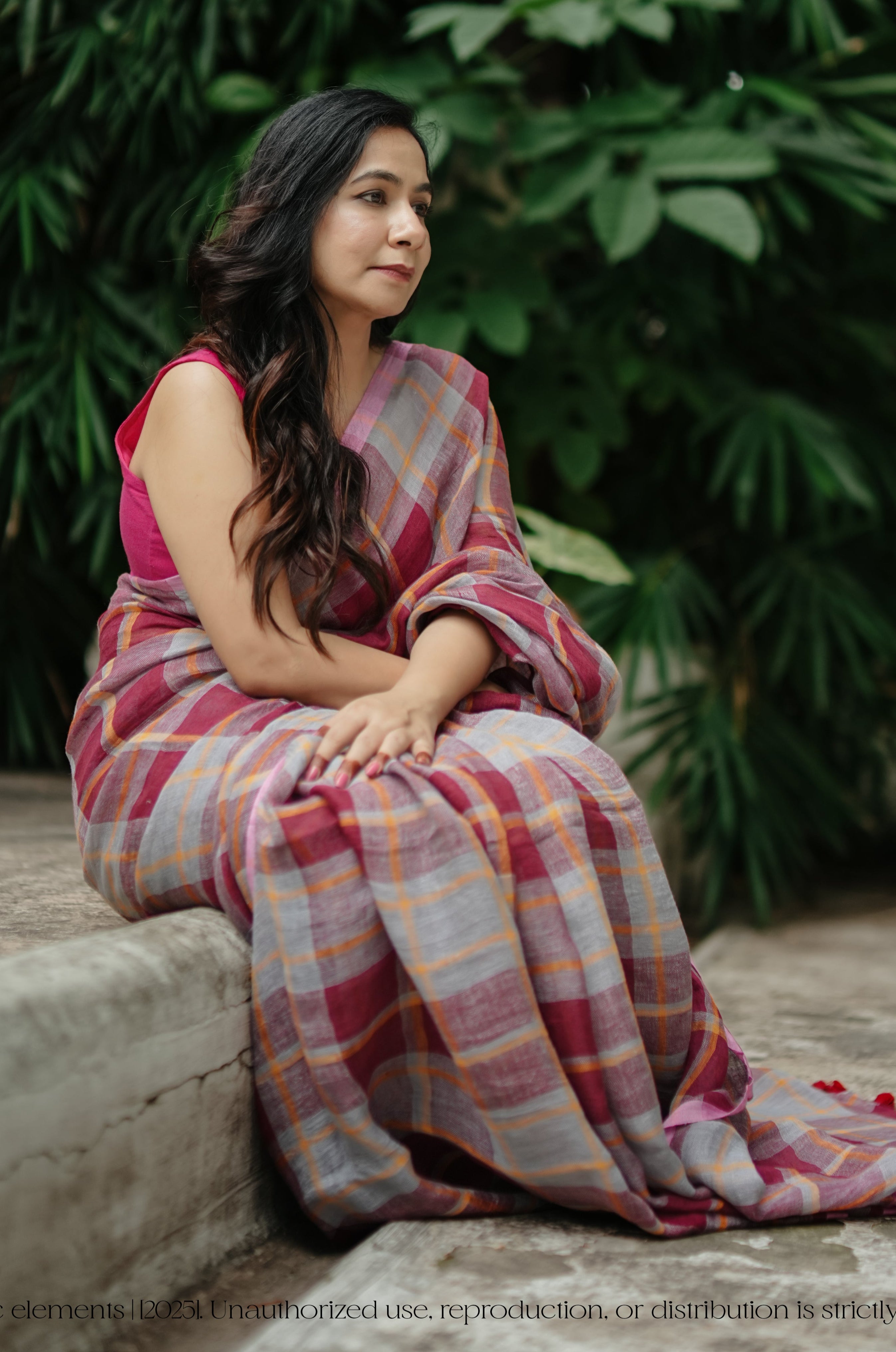 Handwoven Linen Jamdani Checked Saree – Raatrani Blush