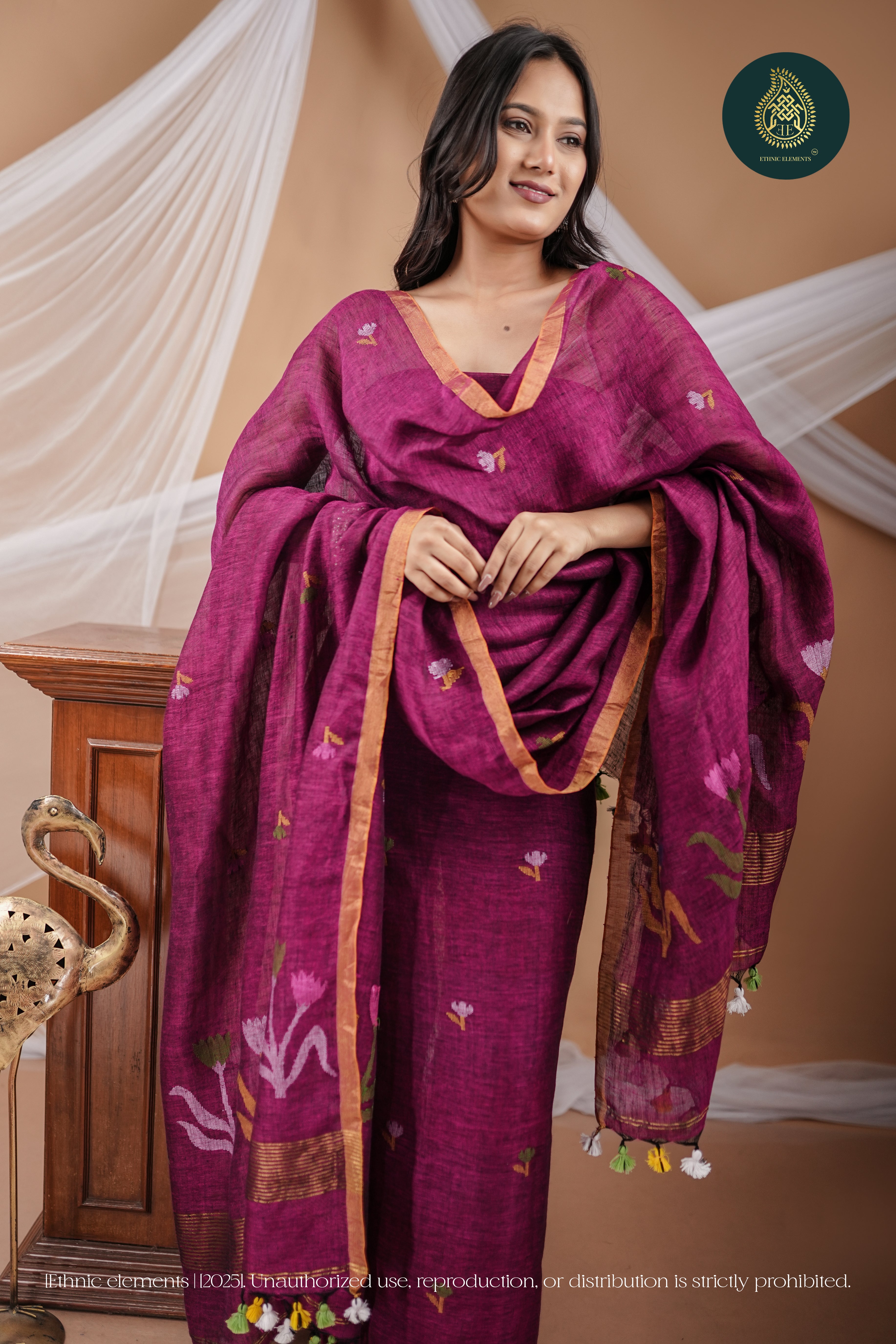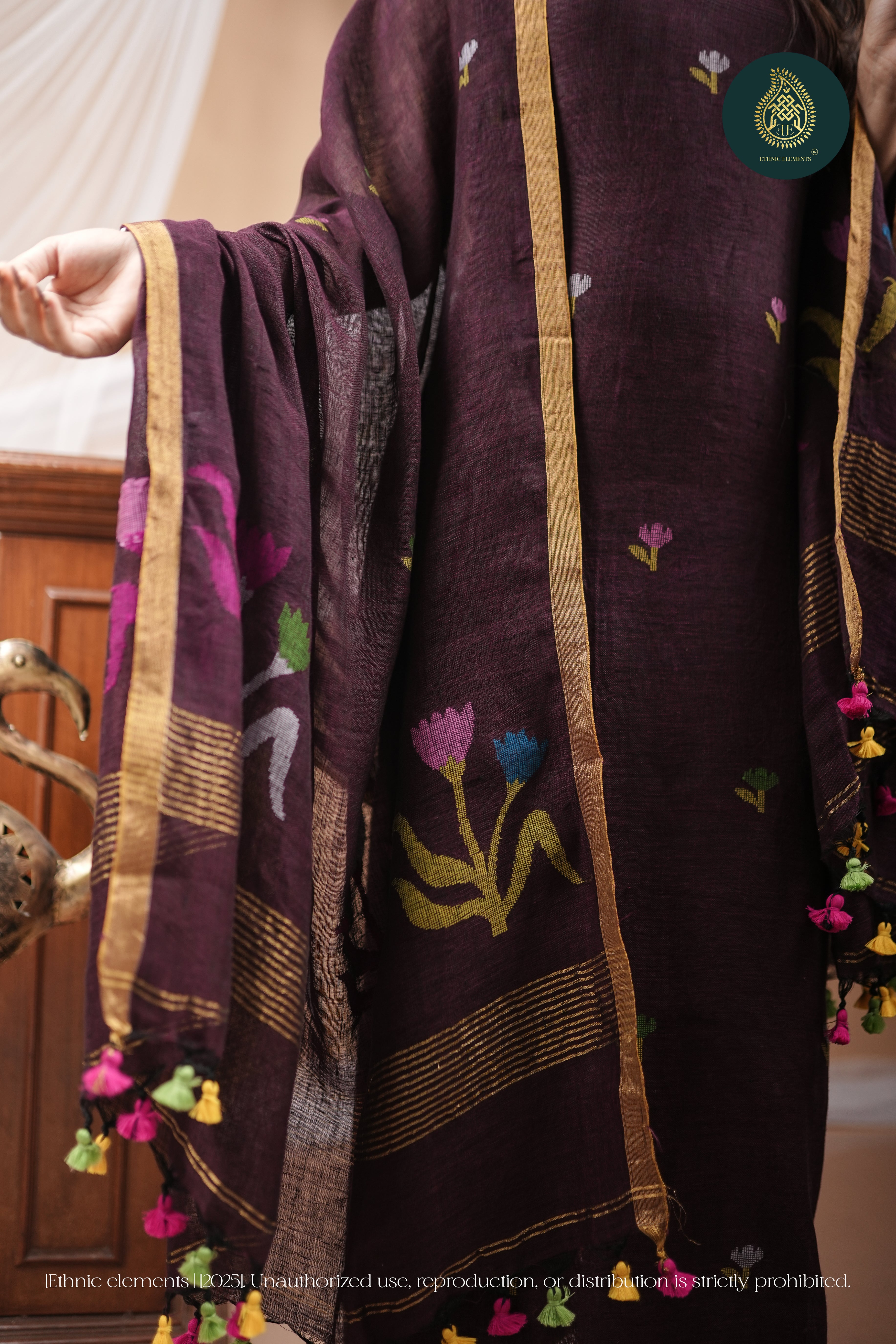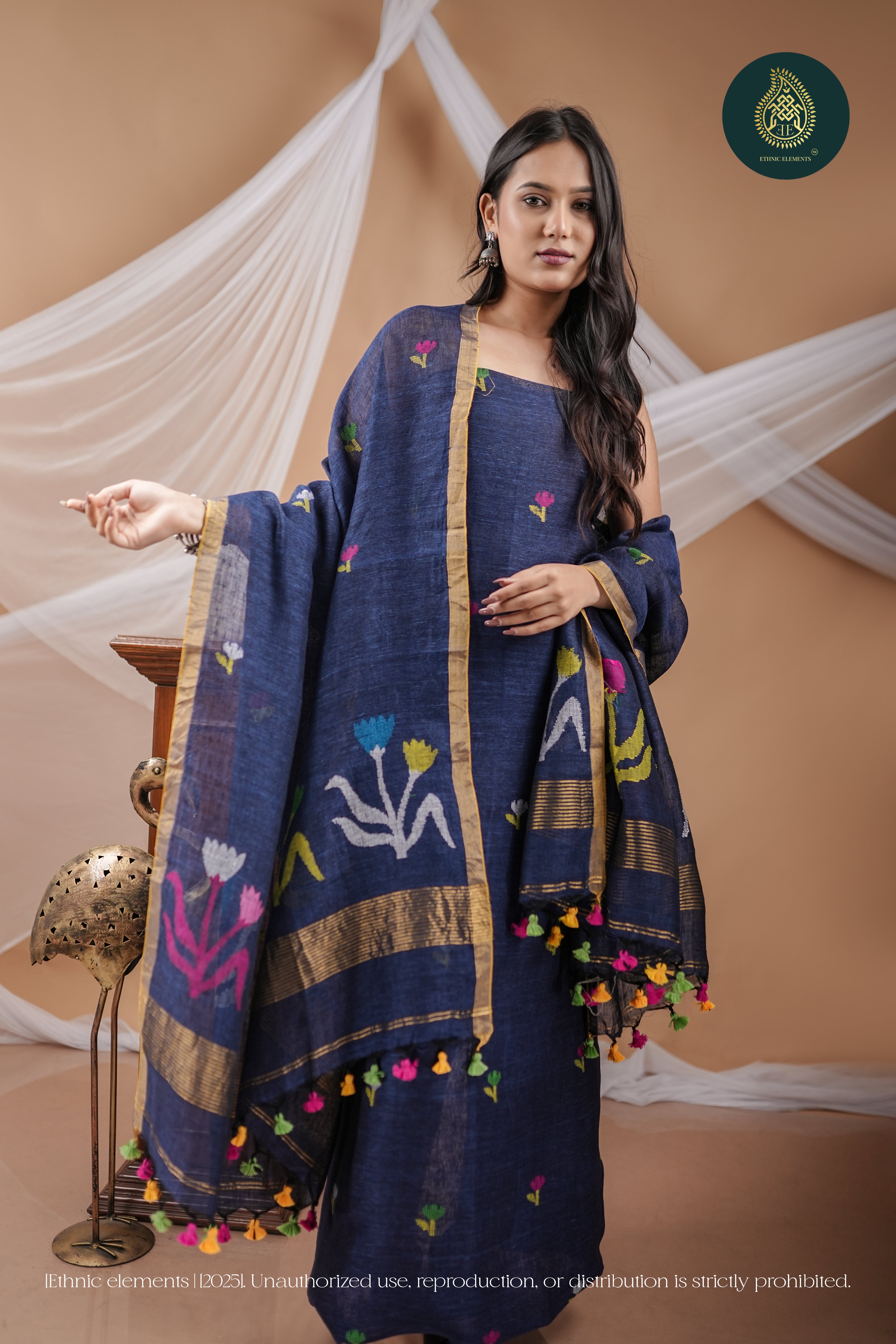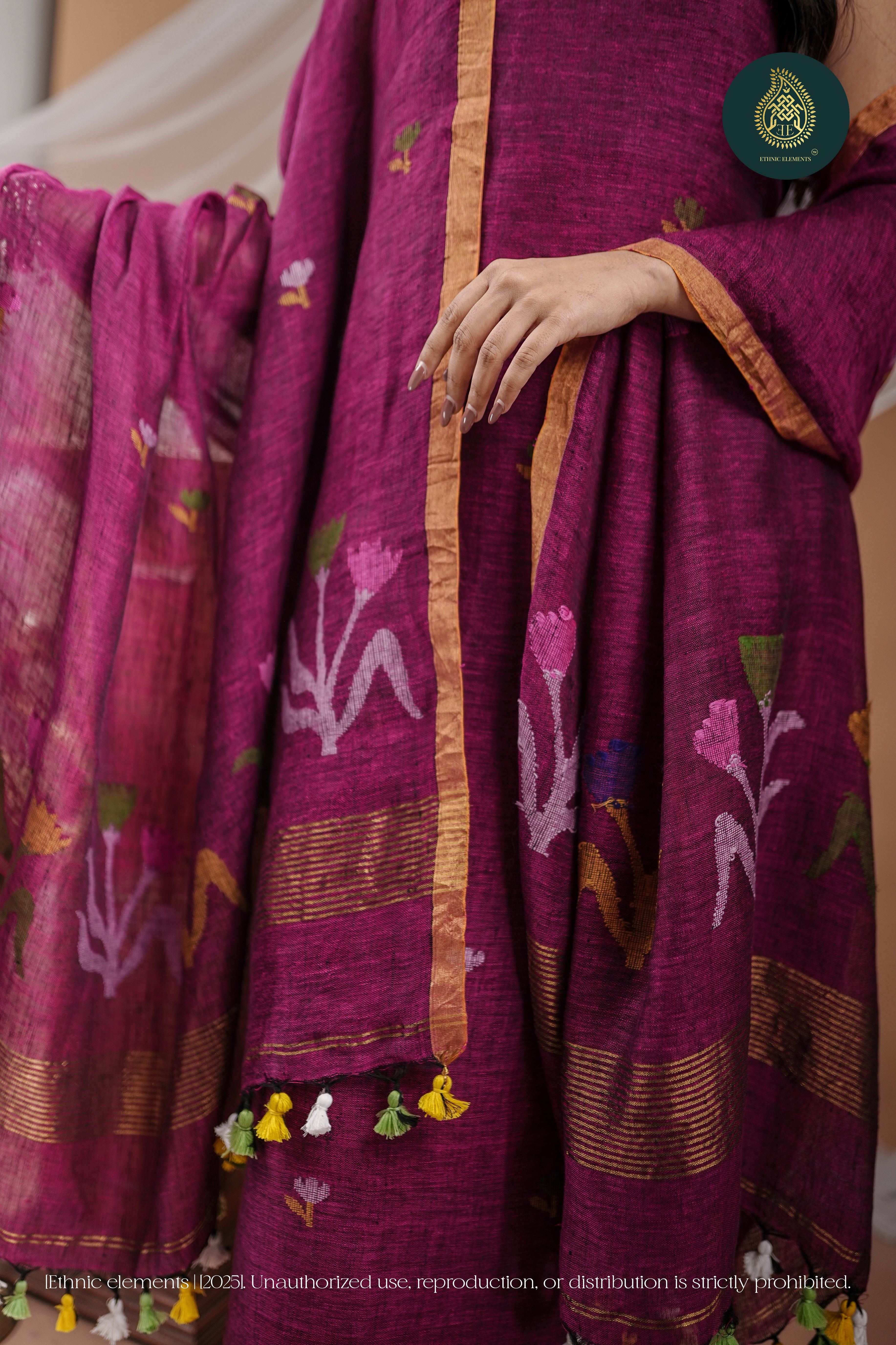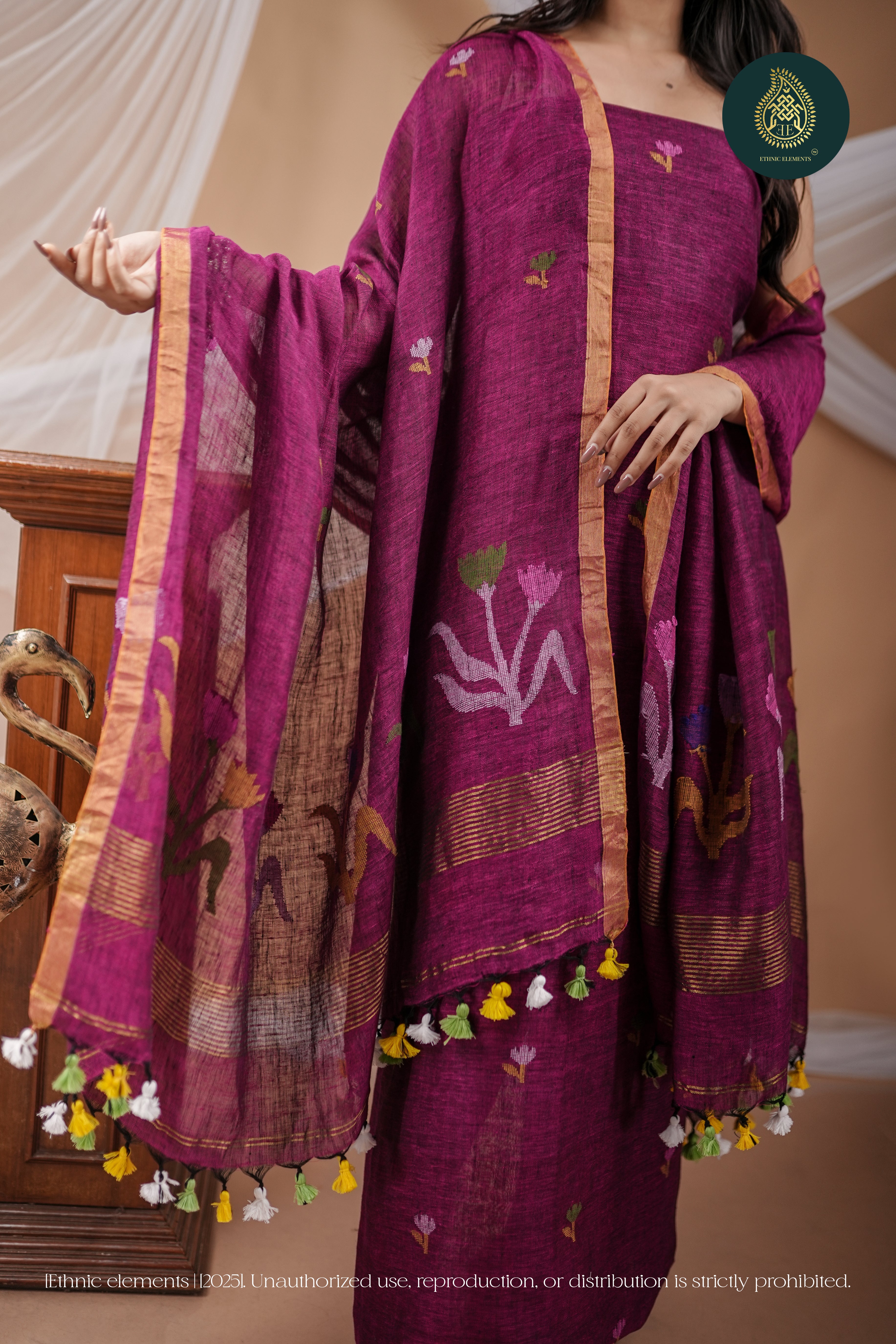 Woven from pure Bengal linen, our Jamdani suits are 100% handmade on traditional wooden looms by skilled artisans. Lightweight, breathable, and timeless — each piece is crafted with care using the finest linen threads, sourced authentically from Bengal’s weaving communities.