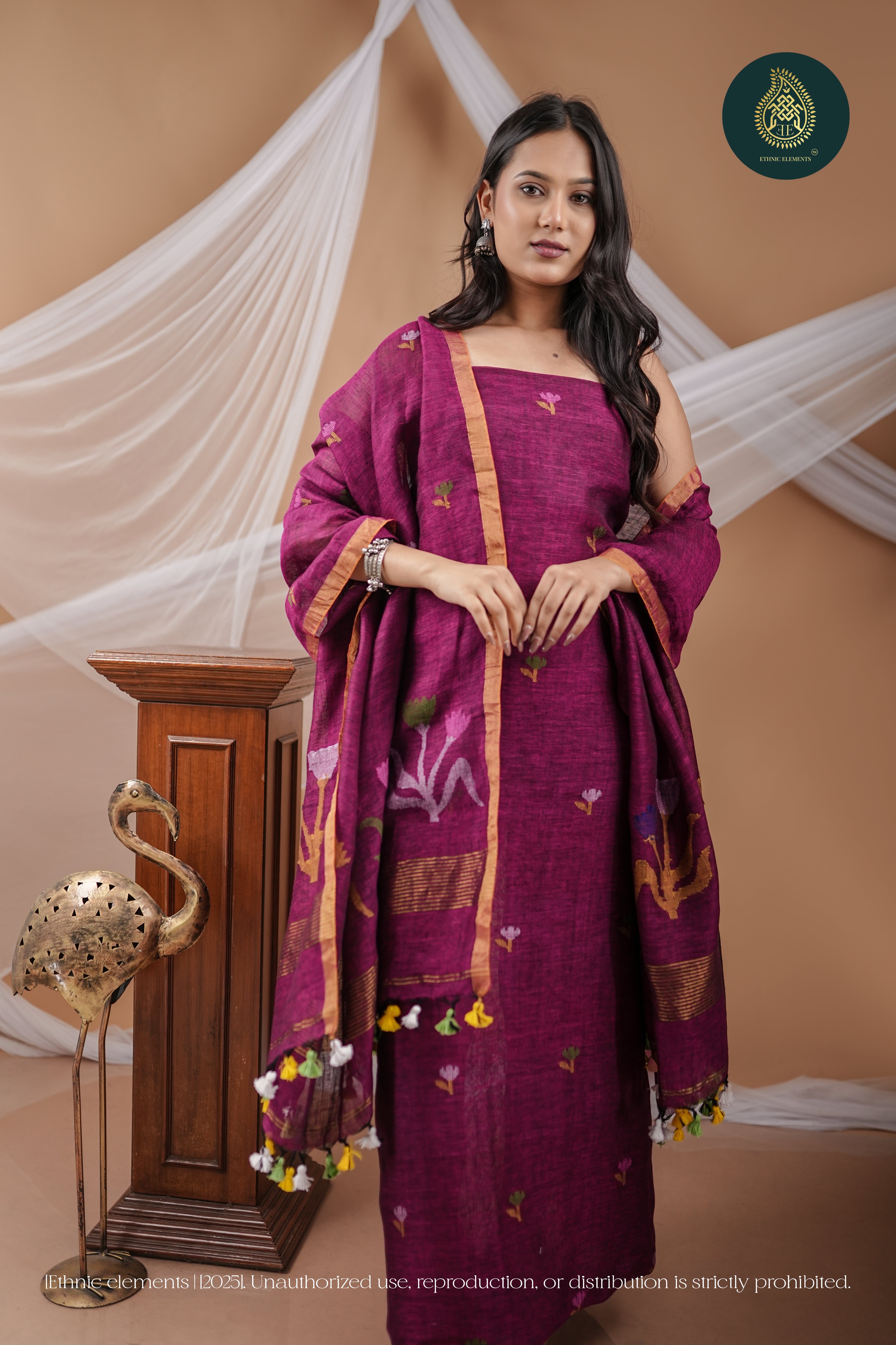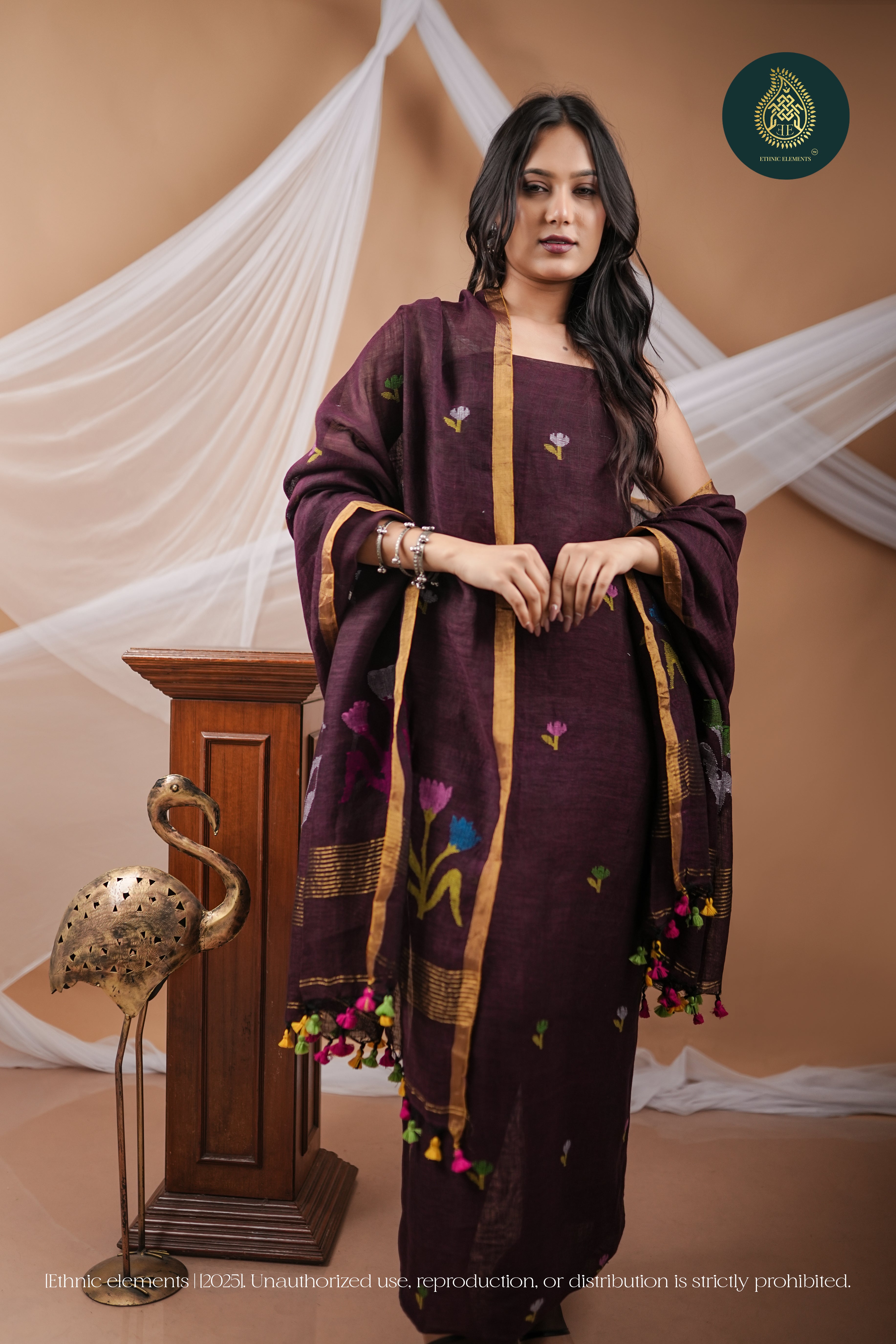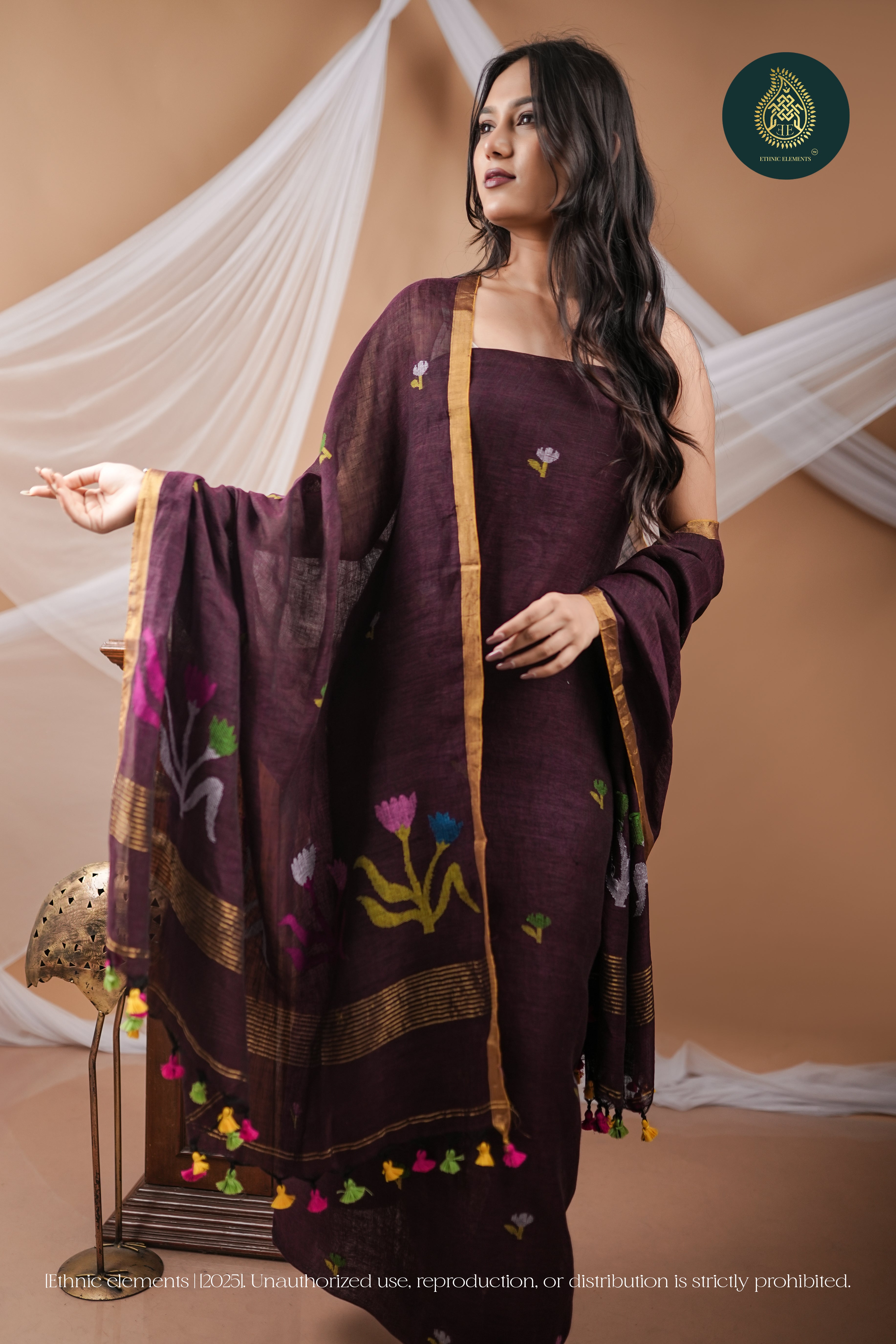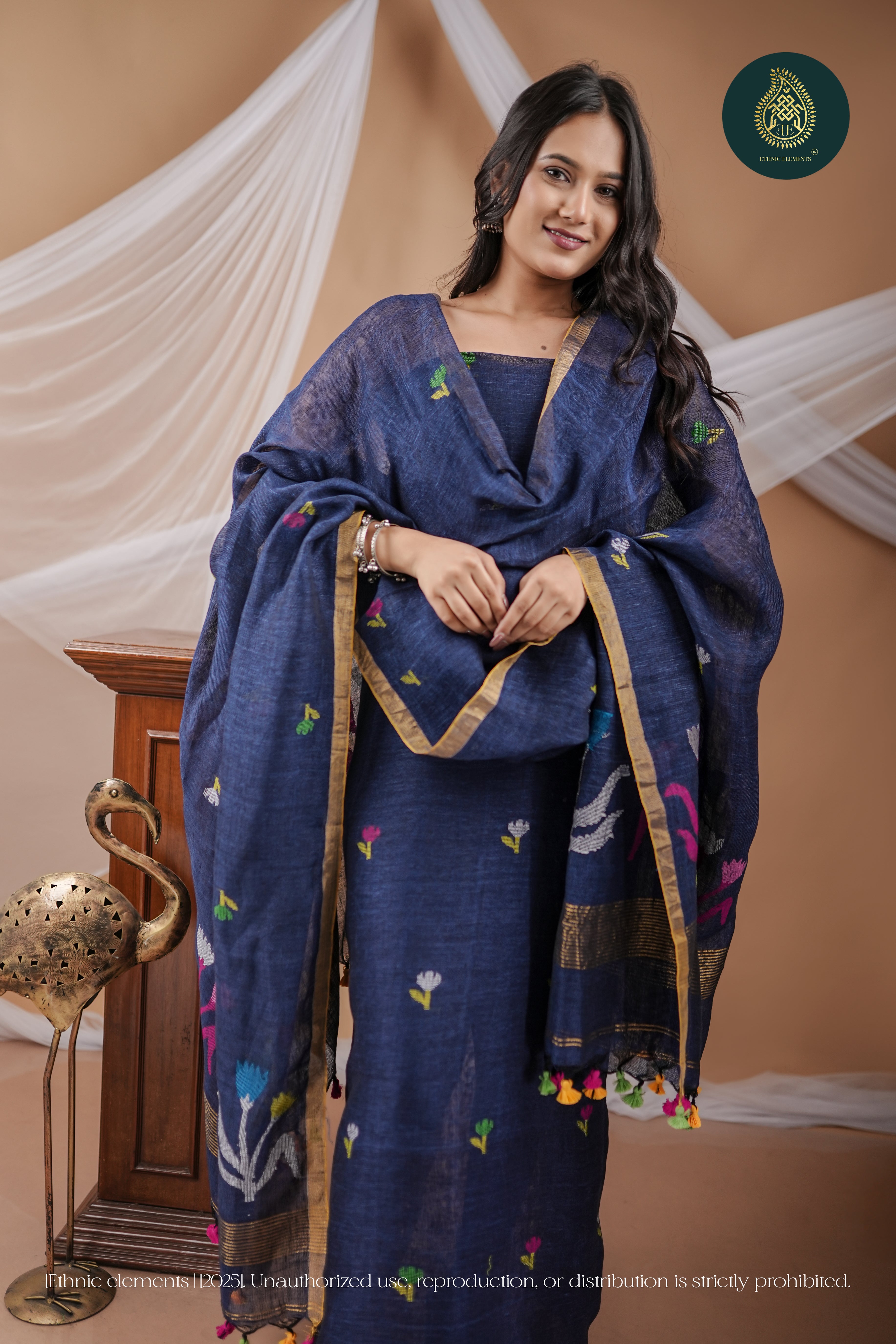 Woven from pure Bengal linen, our Jamdani suits are 100% handmade on traditional wooden looms by skilled artisans. Lightweight, breathable, and timeless — each piece is crafted with care using the finest linen threads, sourced authentically from Bengal’s weaving communities.