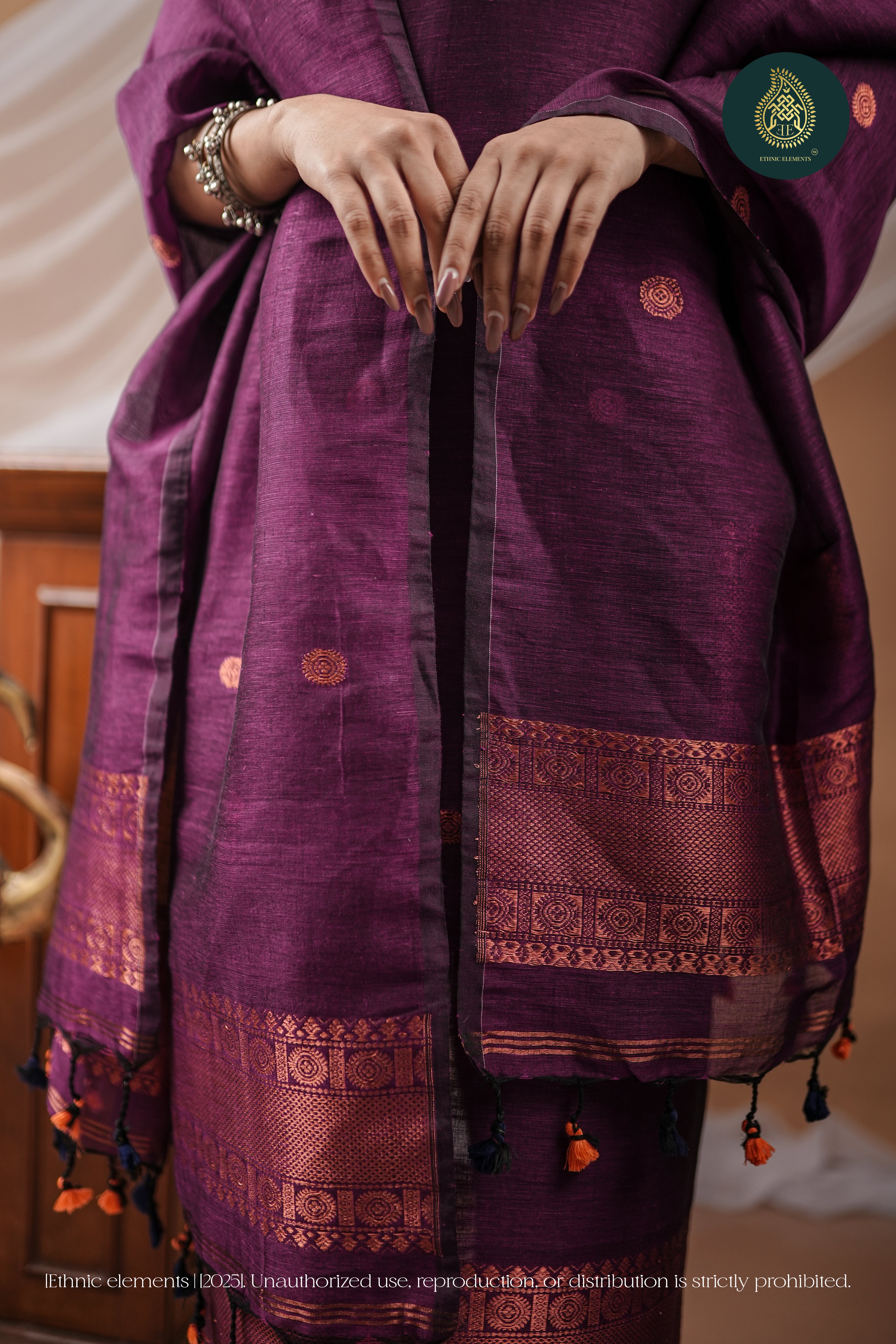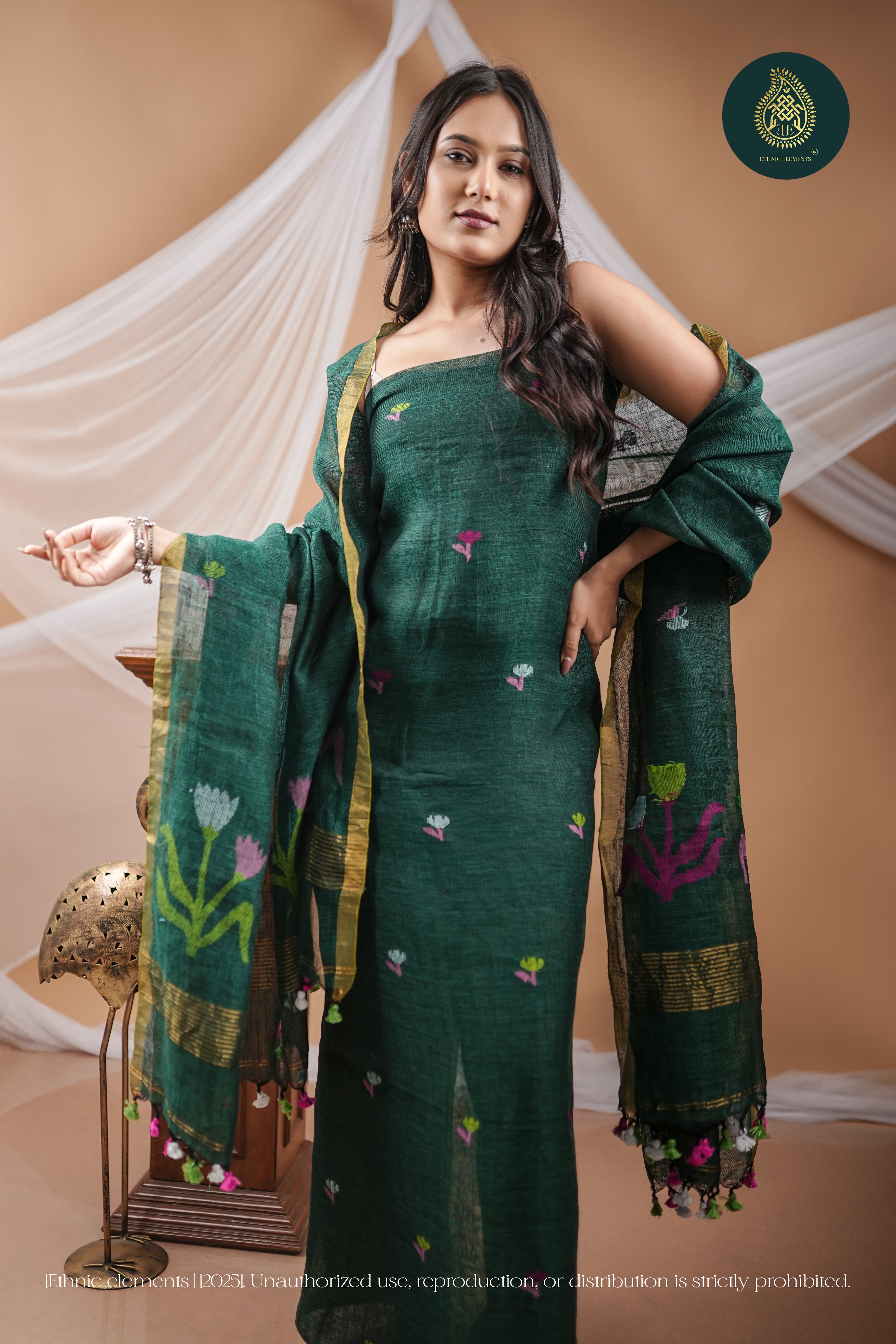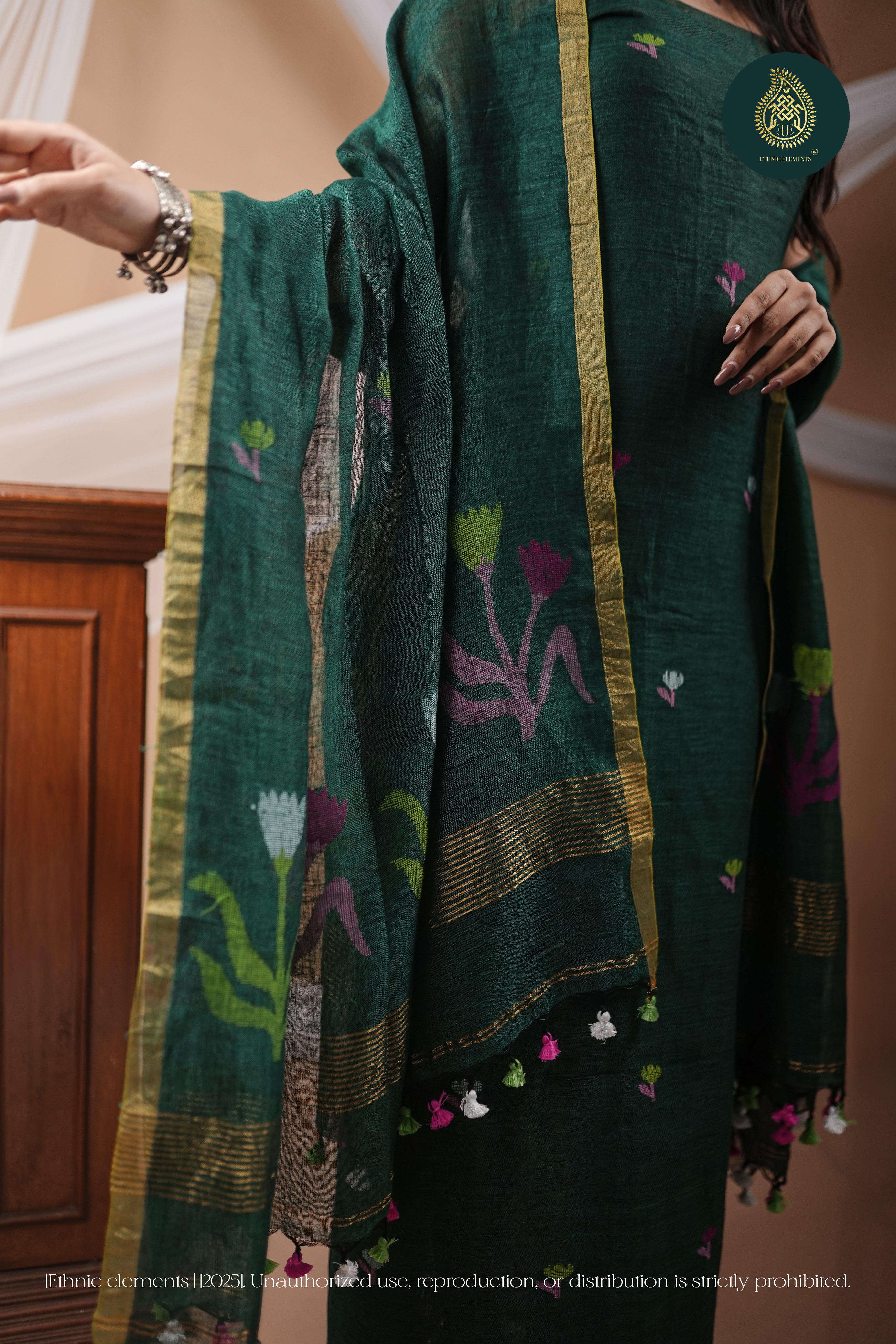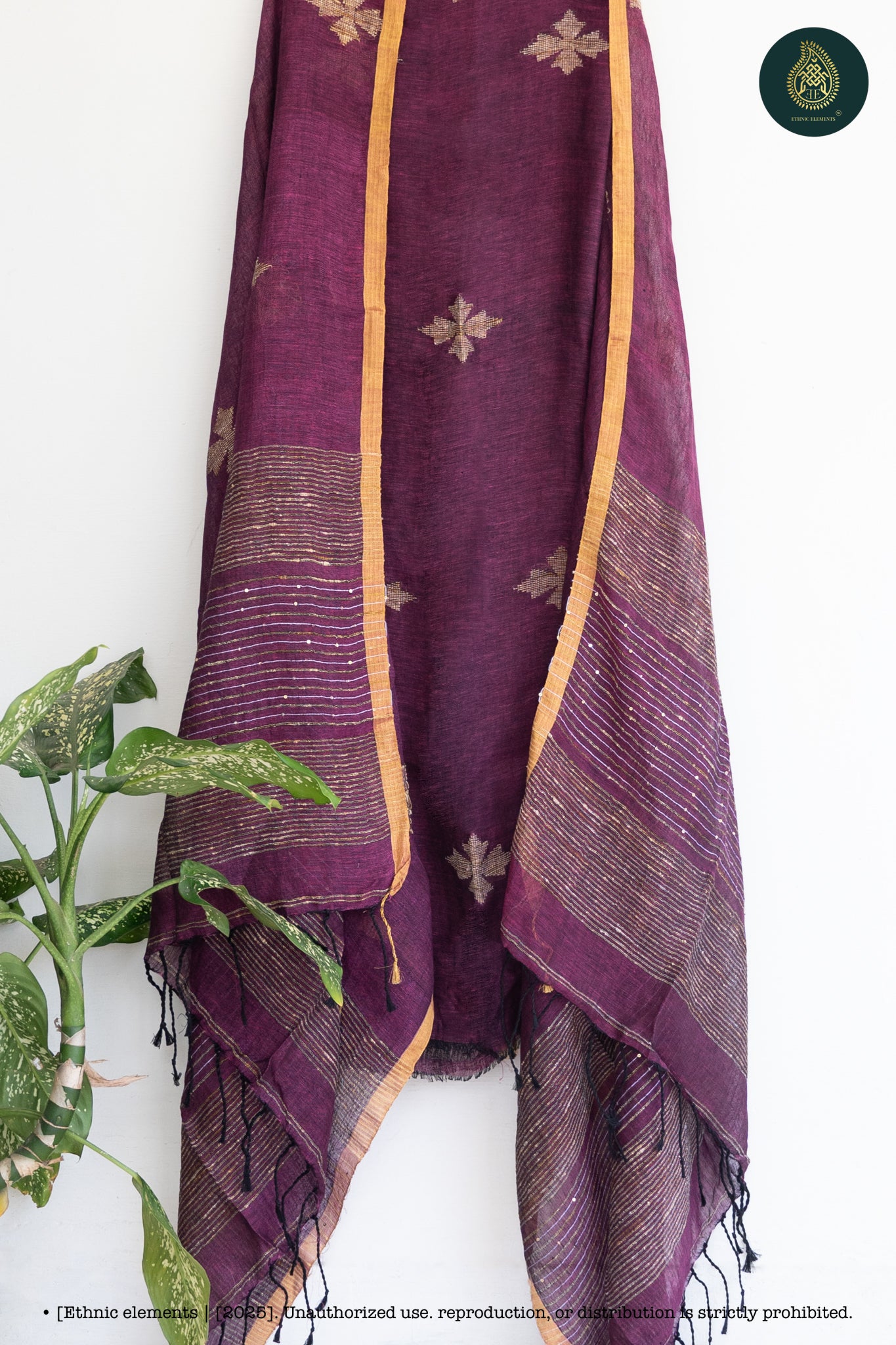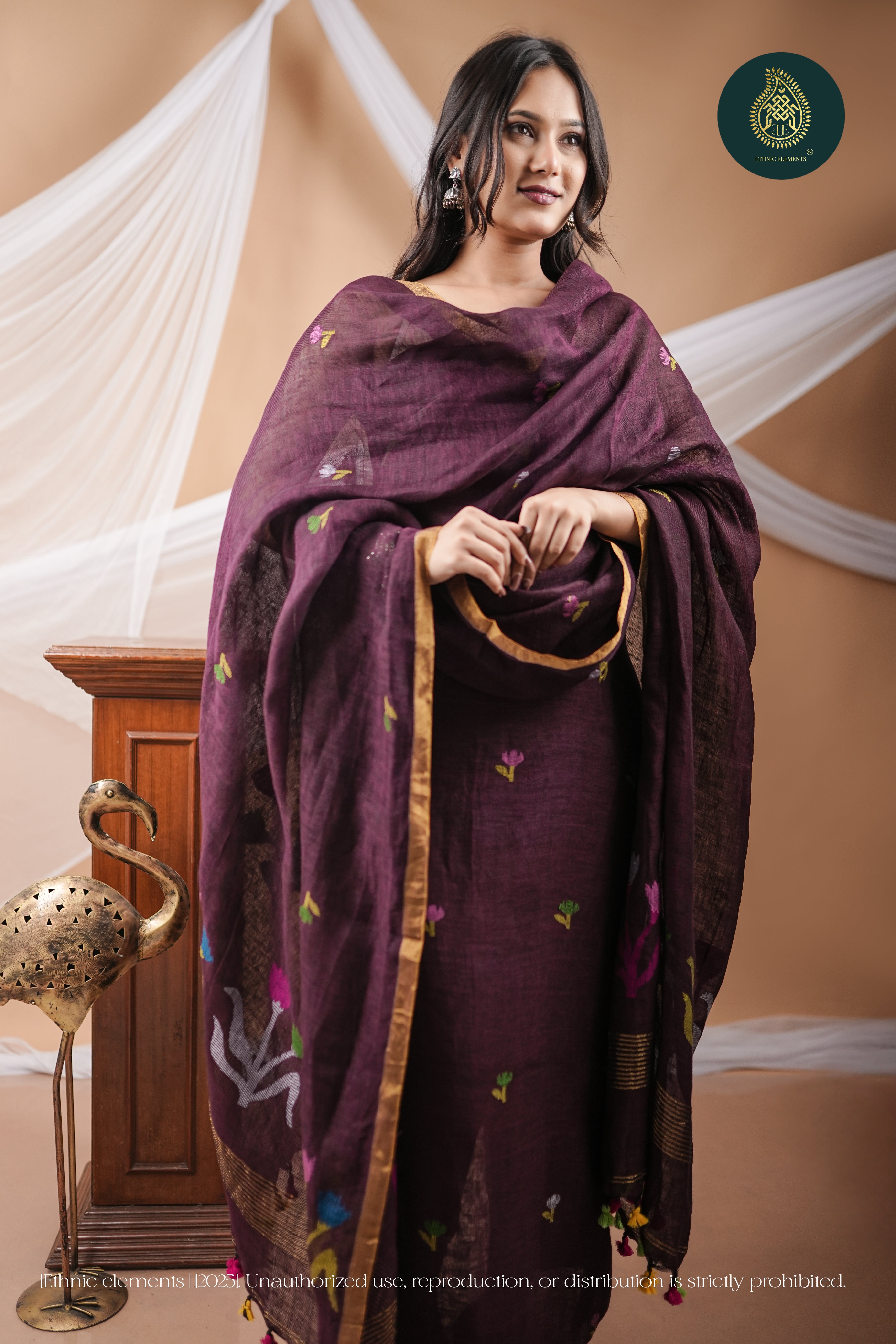 Woven from pure Bengal linen, our Jamdani suits are 100% handmade on traditional wooden looms by skilled artisans. Lightweight, breathable, and timeless — each piece is crafted with care using the finest linen threads, sourced authentically from Bengal’s weaving communities.