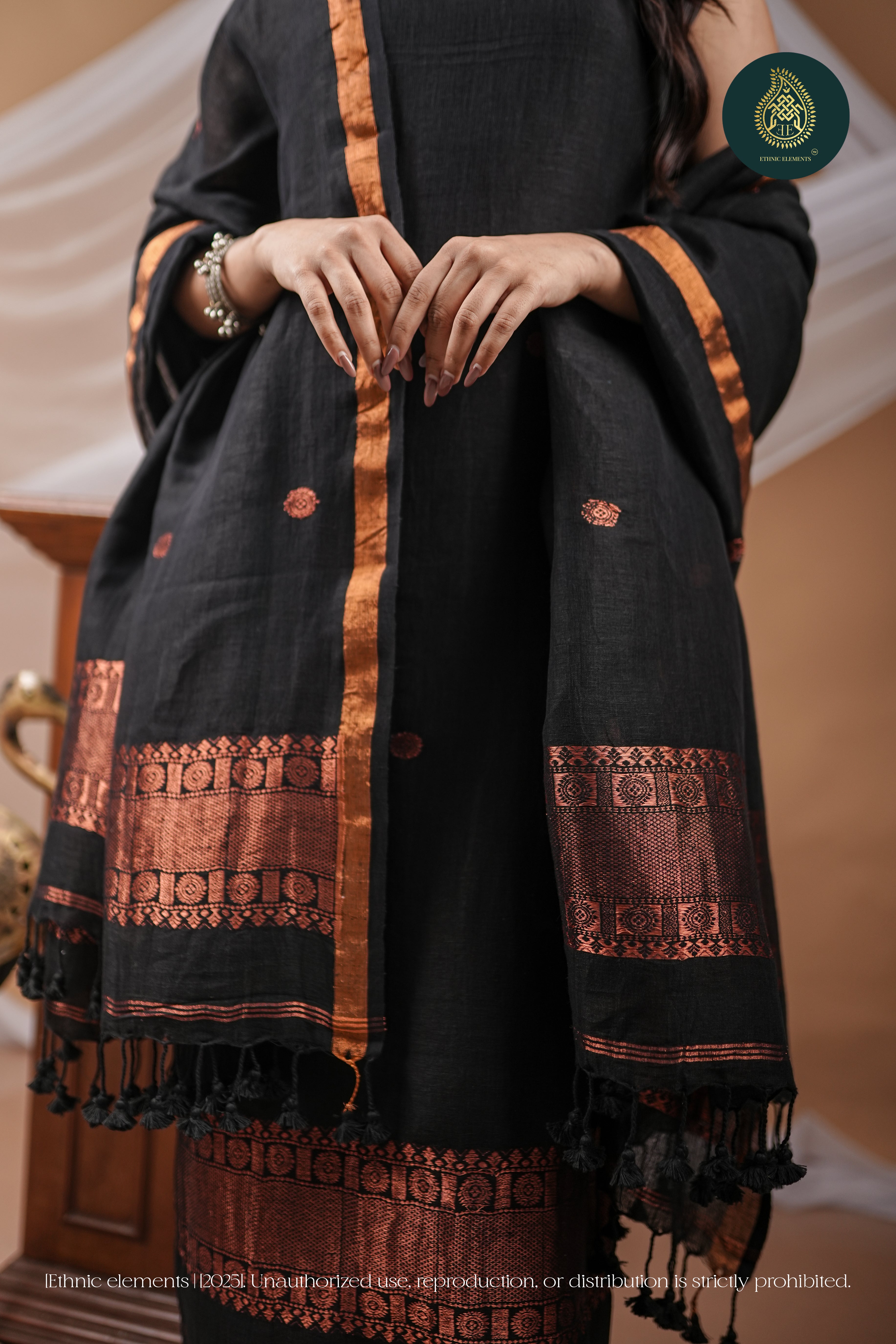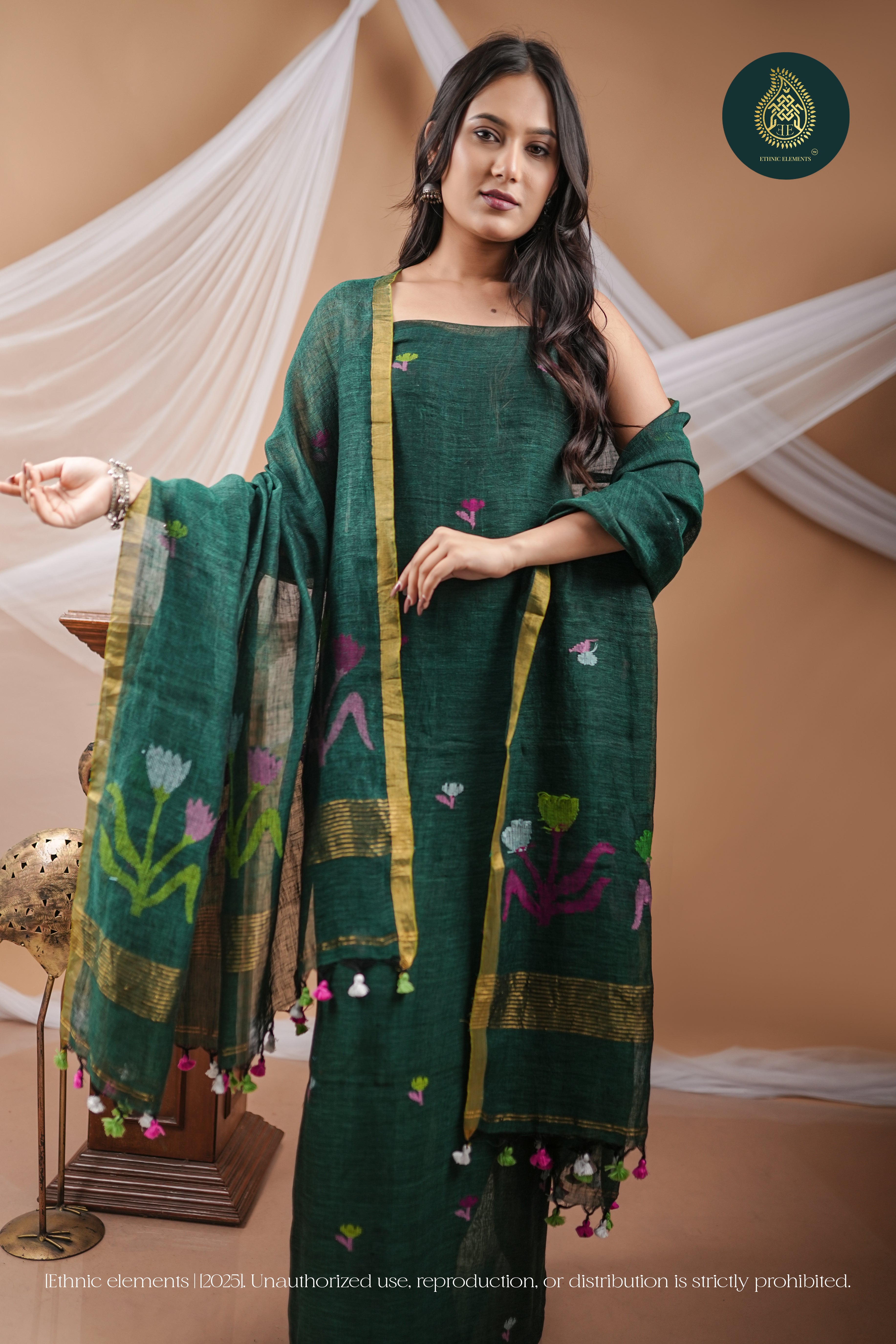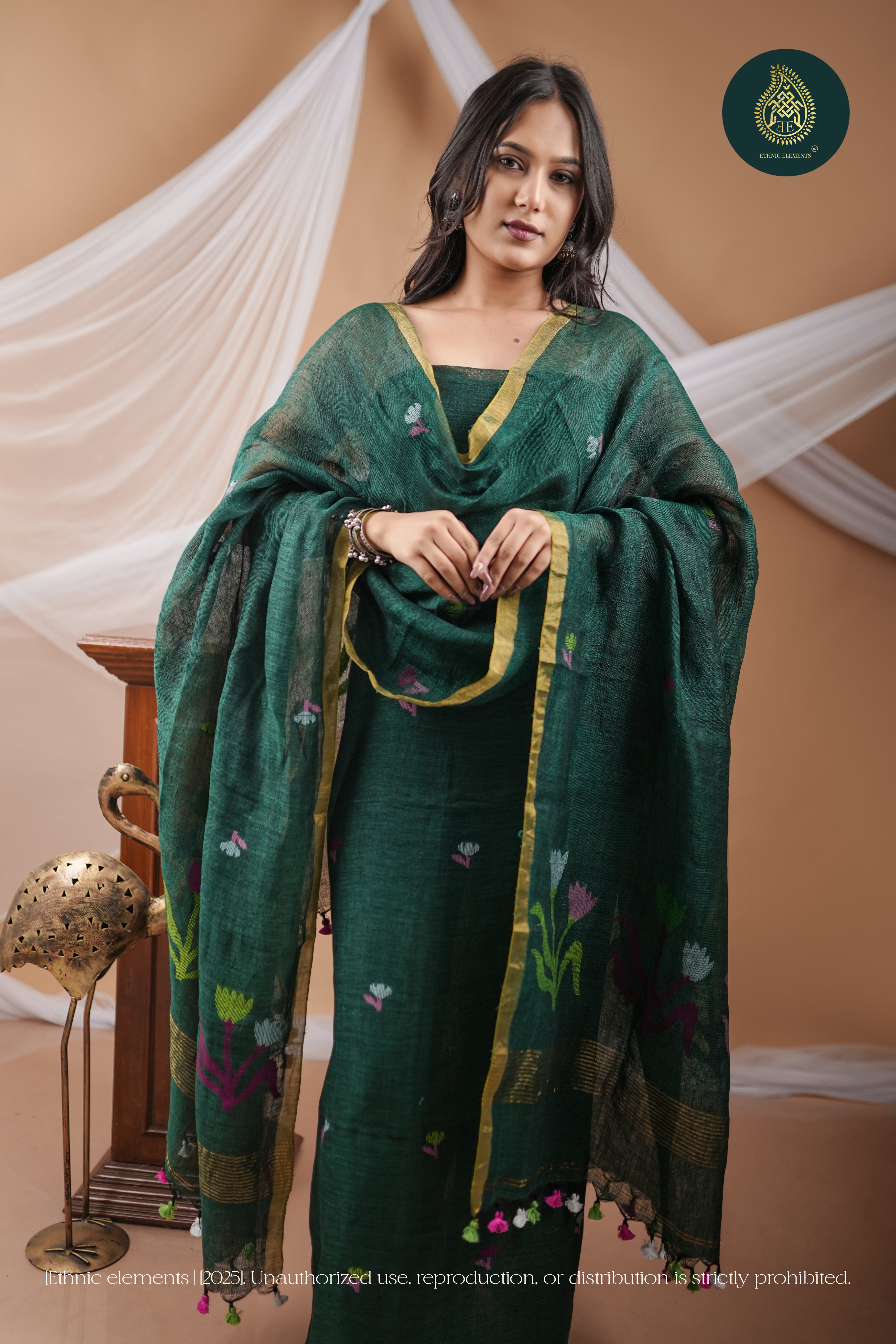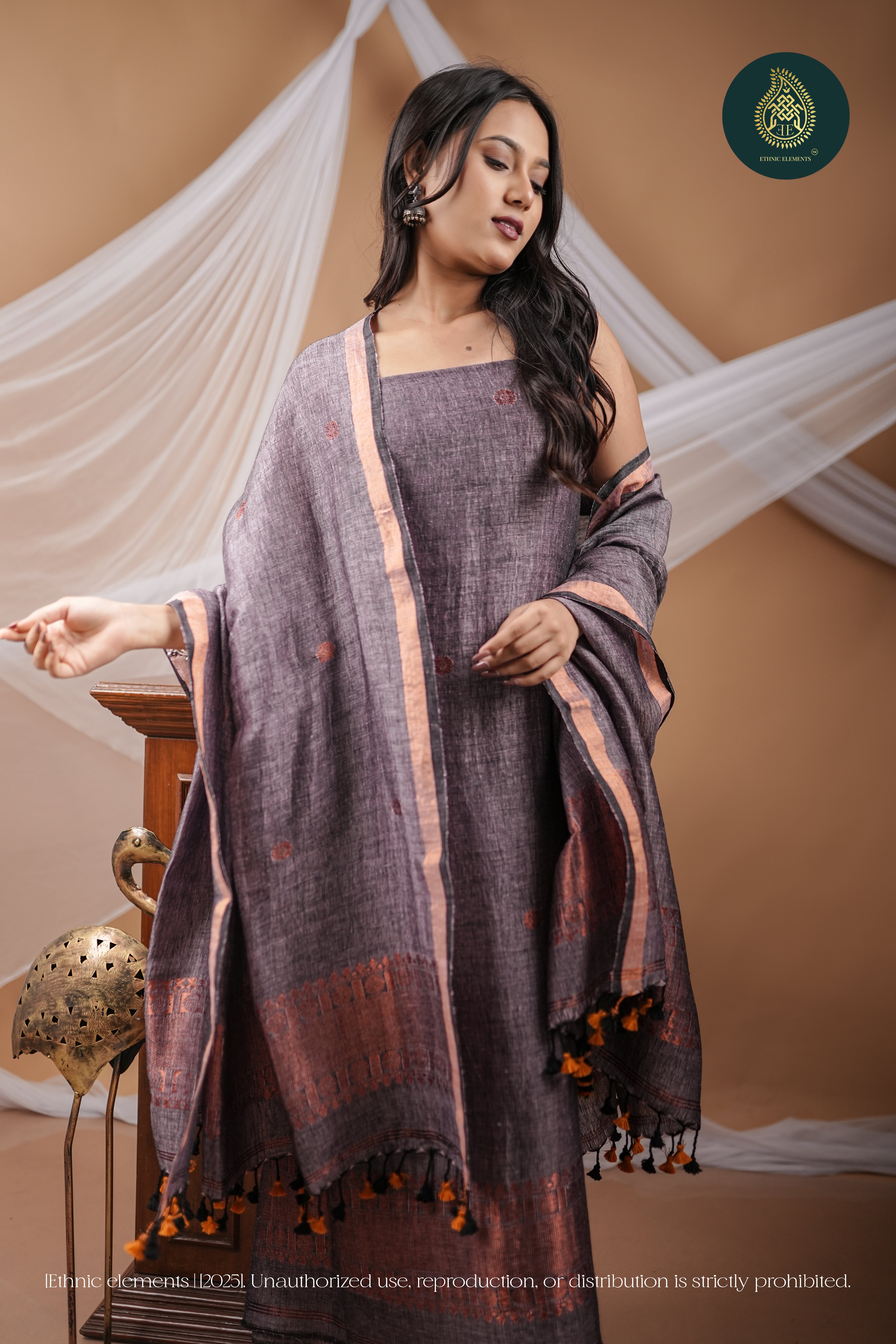 Woven from pure Bengal linen, our Jamdani suits are 100% handmade on traditional wooden looms by skilled artisans. Lightweight, breathable, and timeless — each piece is crafted with care using the finest linen threads, sourced authentically from Bengal’s weaving communities.