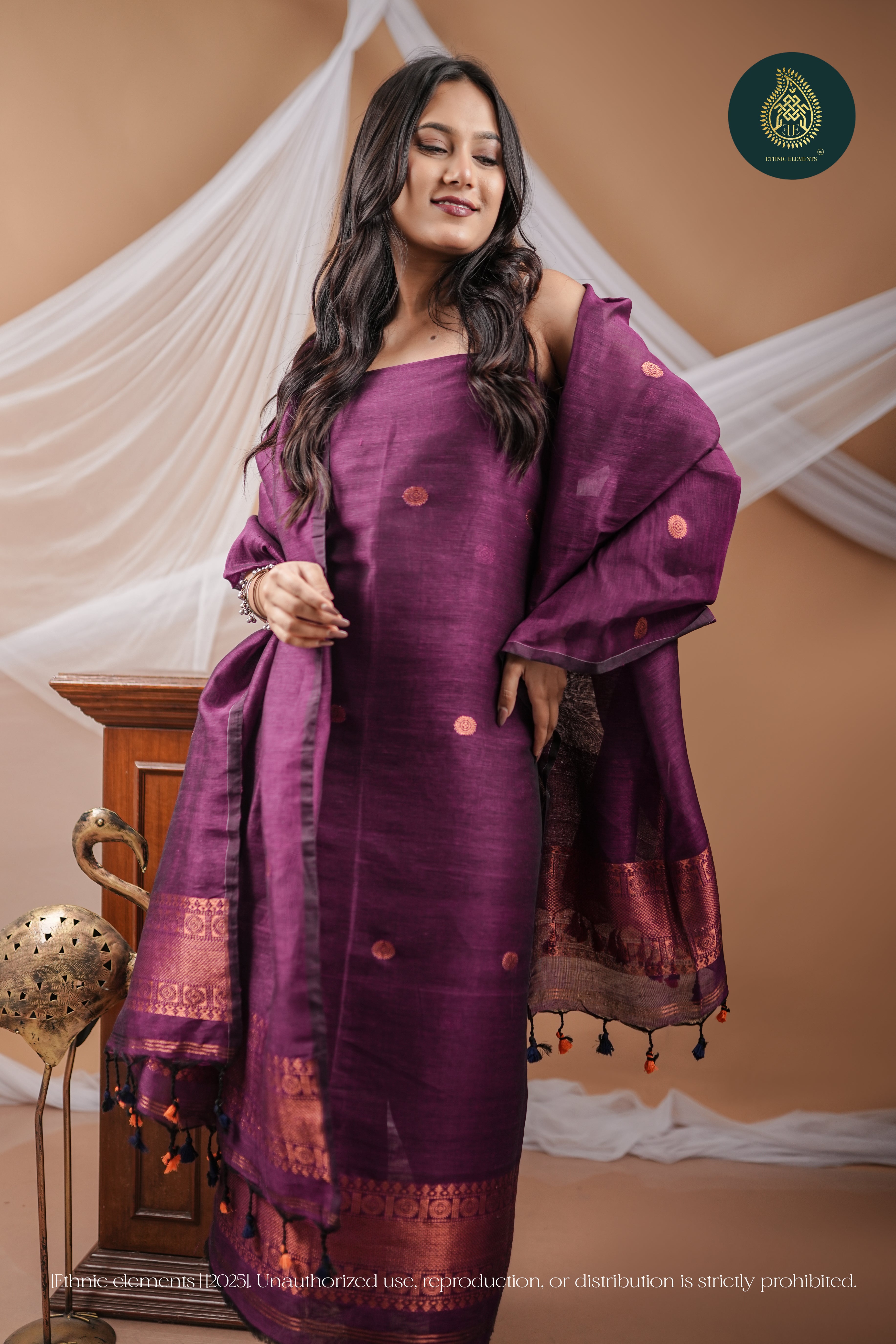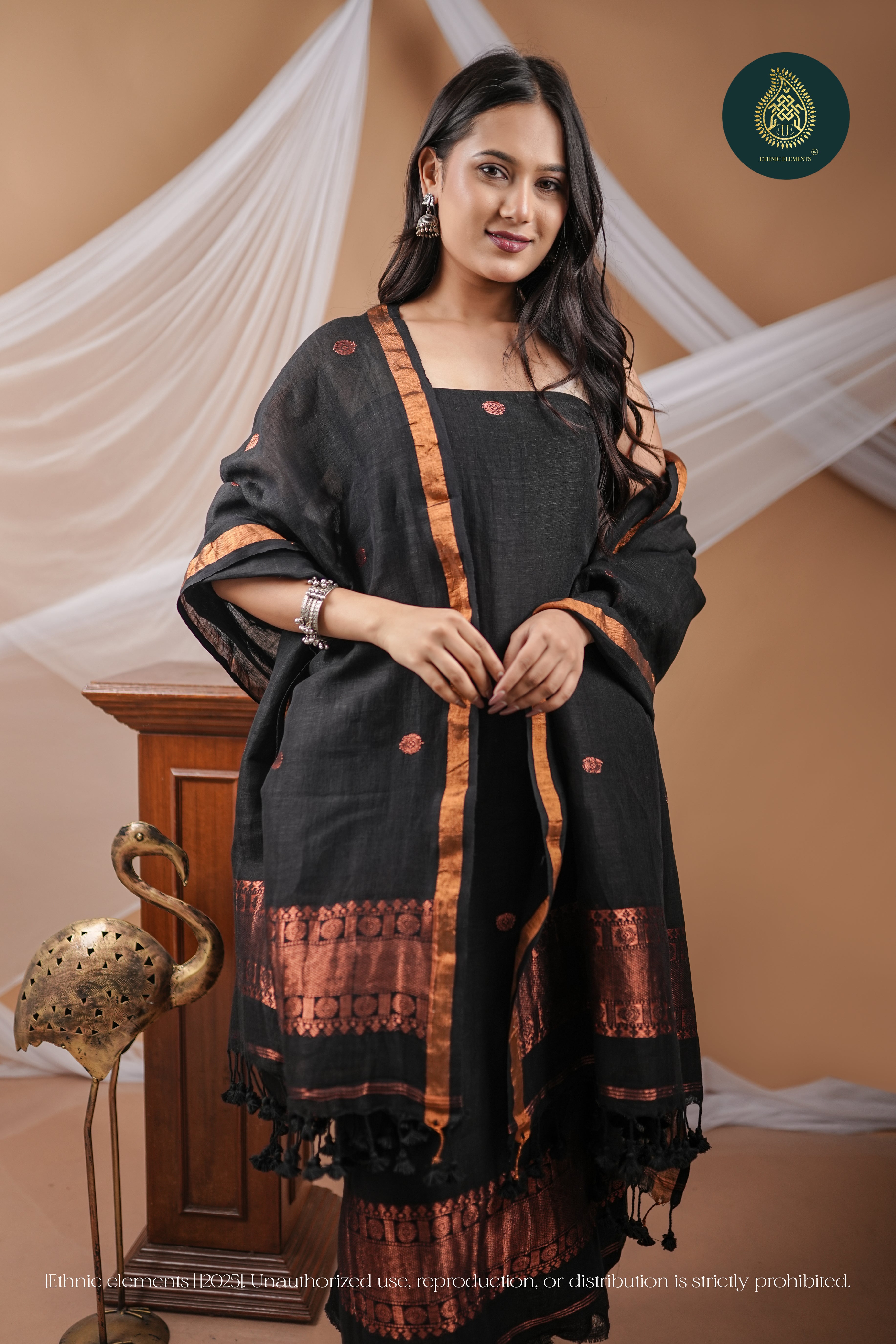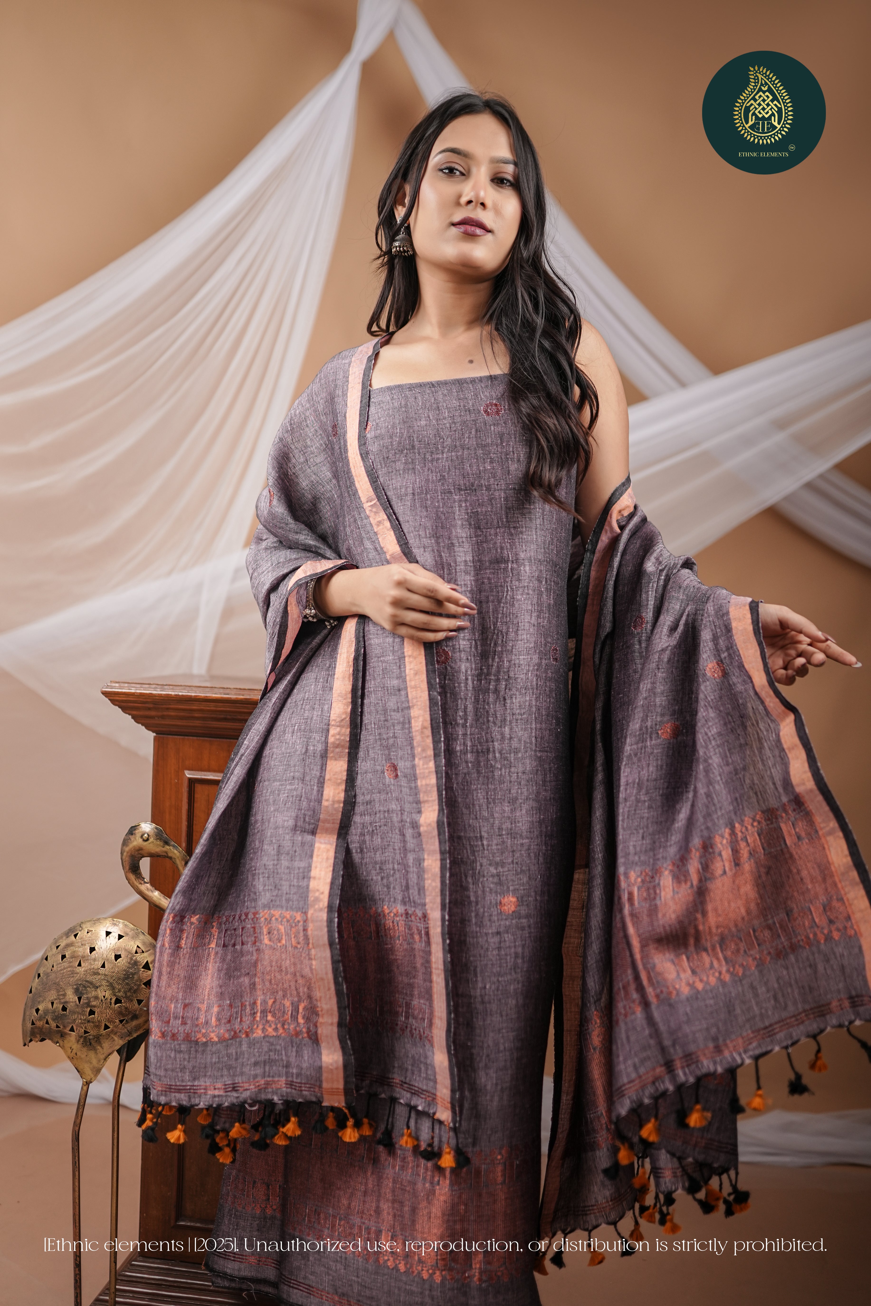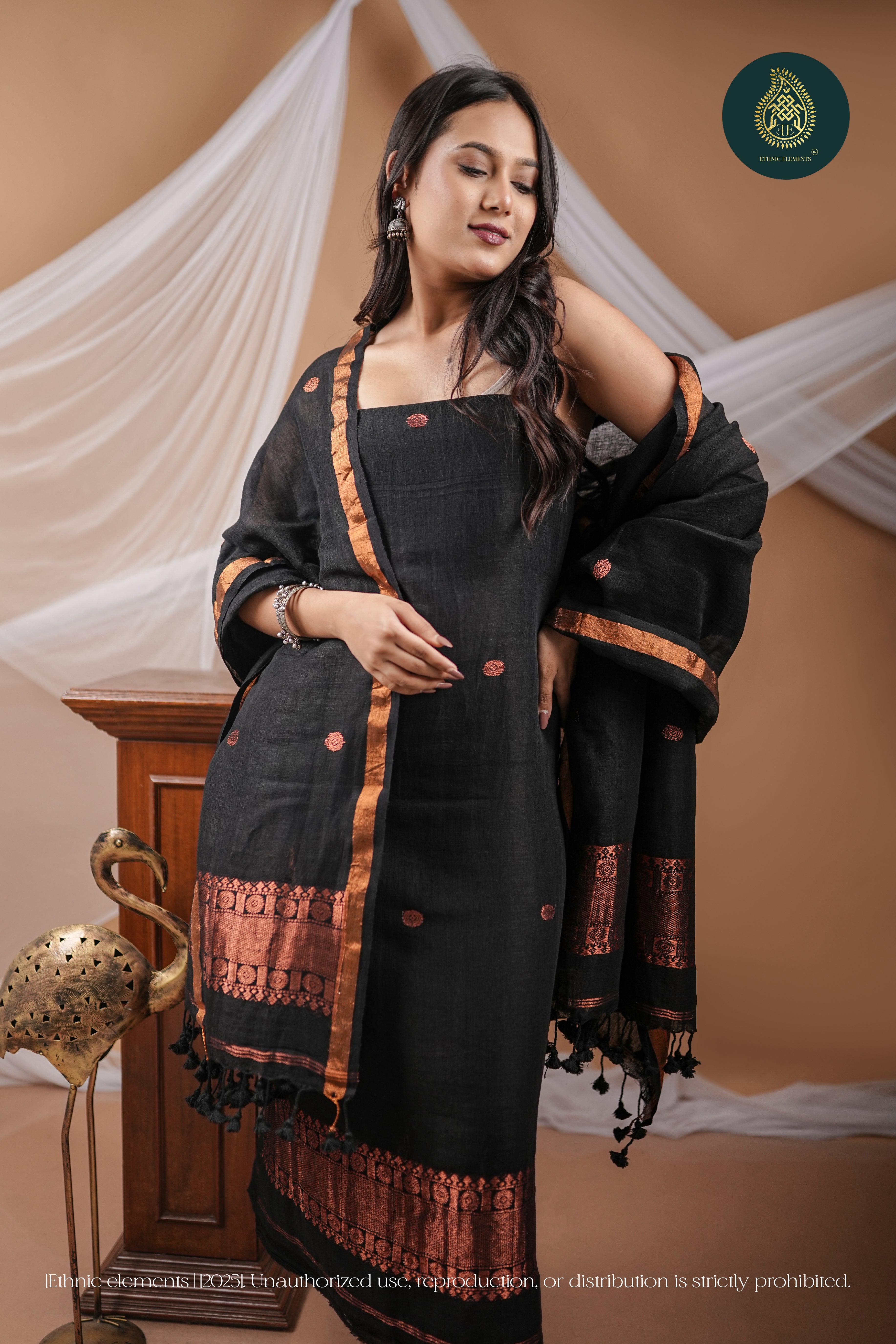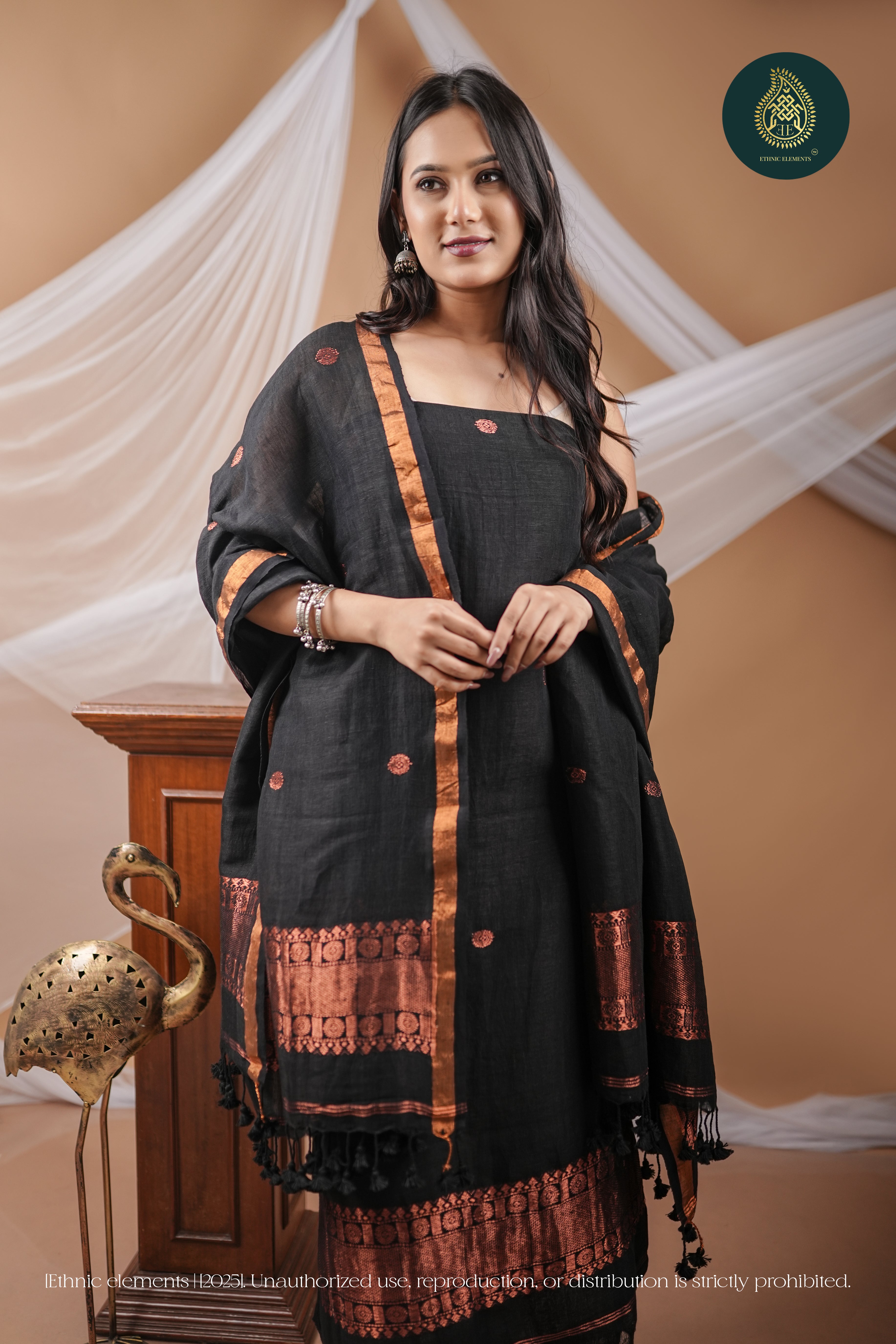 Woven from pure Bengal linen, our Jamdani suits are 100% handmade on traditional wooden looms by skilled artisans. Lightweight, breathable, and timeless — each piece is crafted with care using the finest linen threads, sourced authentically from Bengal’s weaving communities.