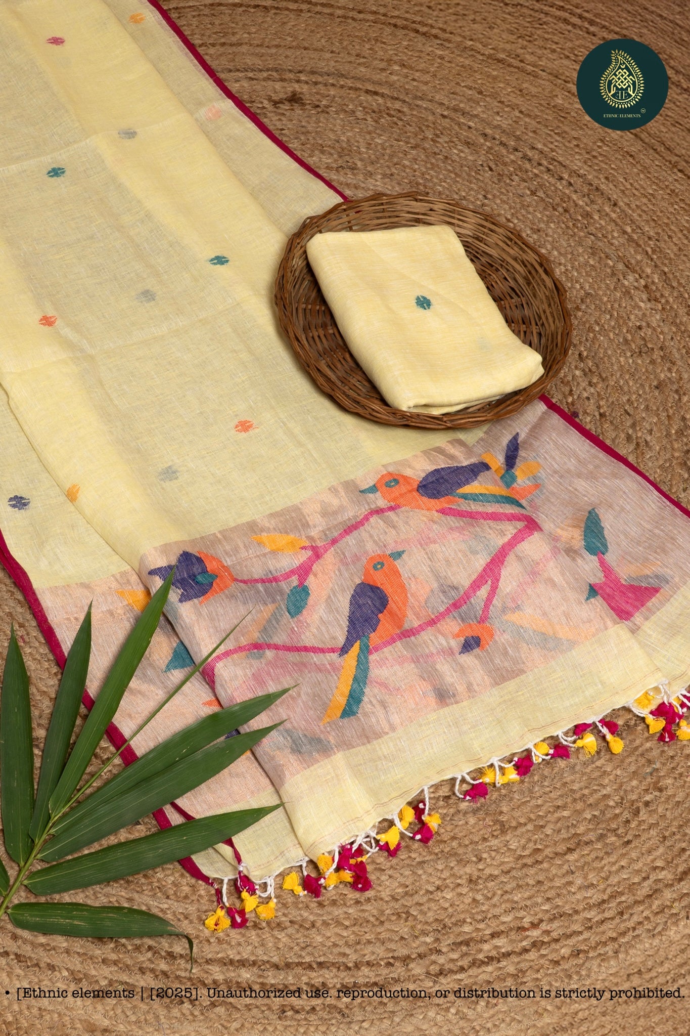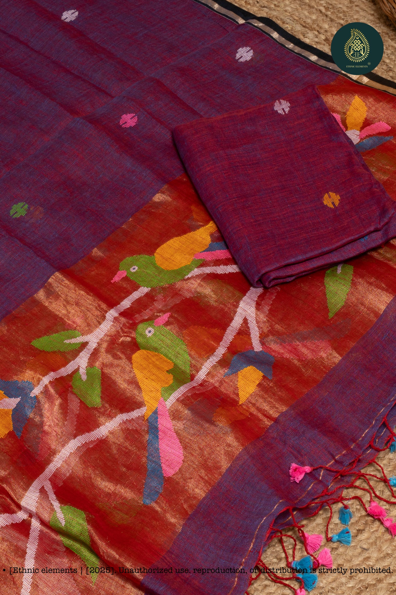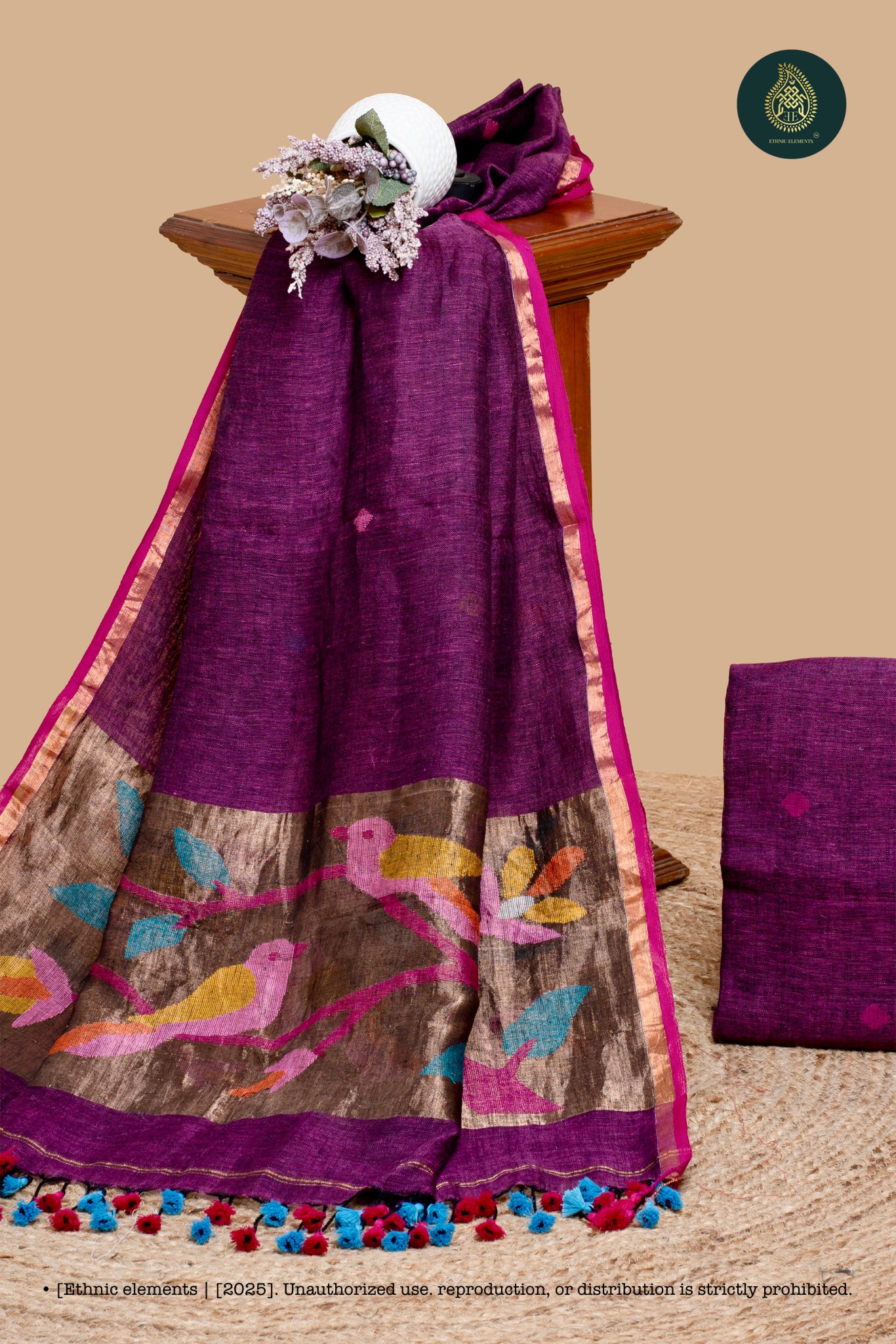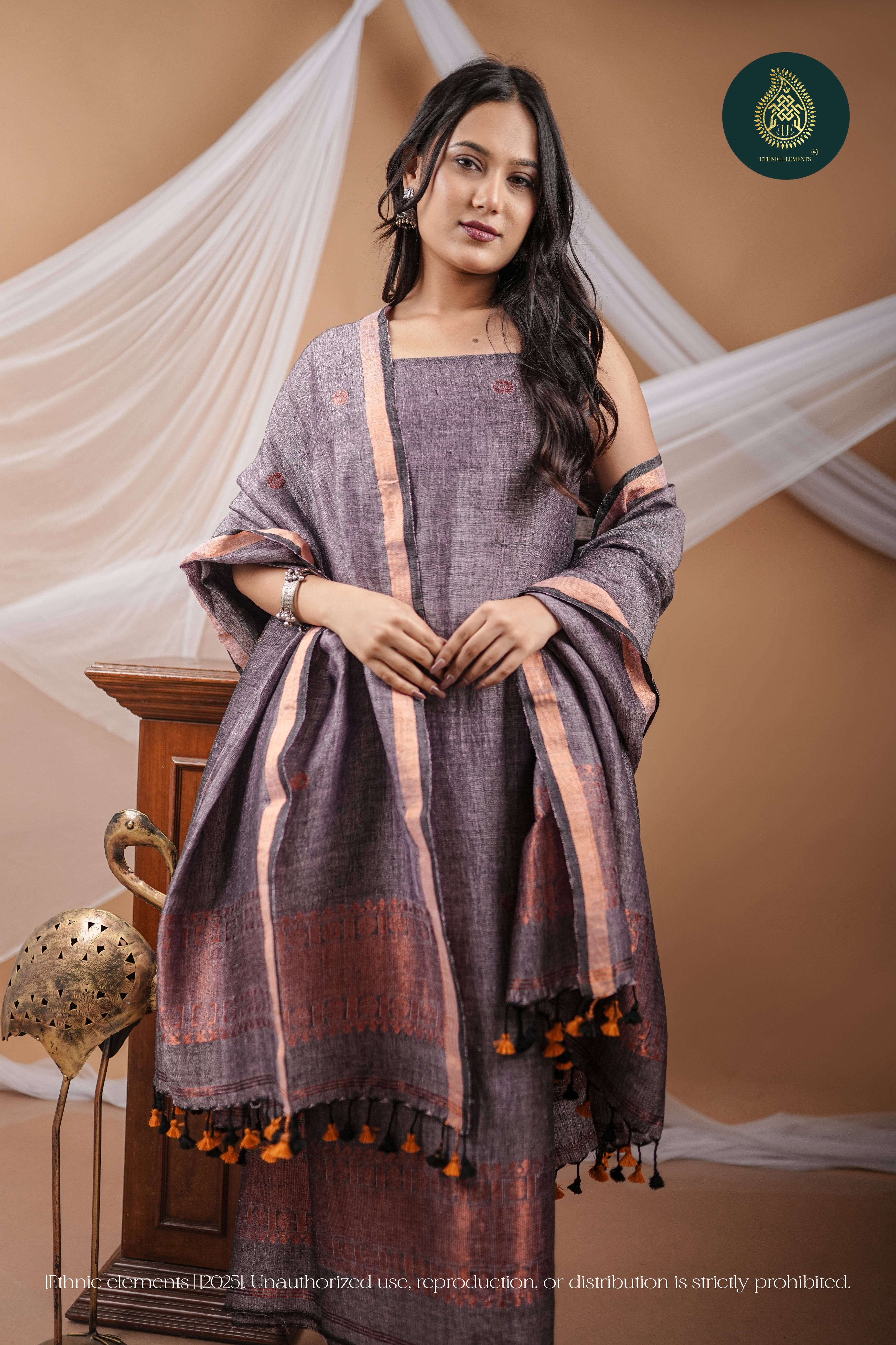Woven from pure Bengal linen, our Jamdani suits are 100% handmade on traditional wooden looms by skilled artisans. Lightweight, breathable, and timeless — each piece is crafted with care using the finest linen threads, sourced authentically from Bengal’s weaving communities.