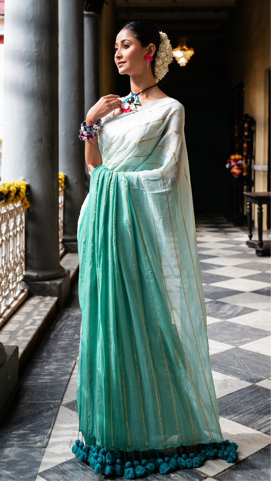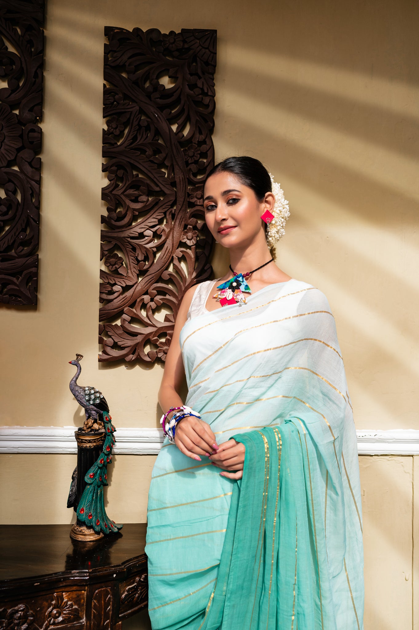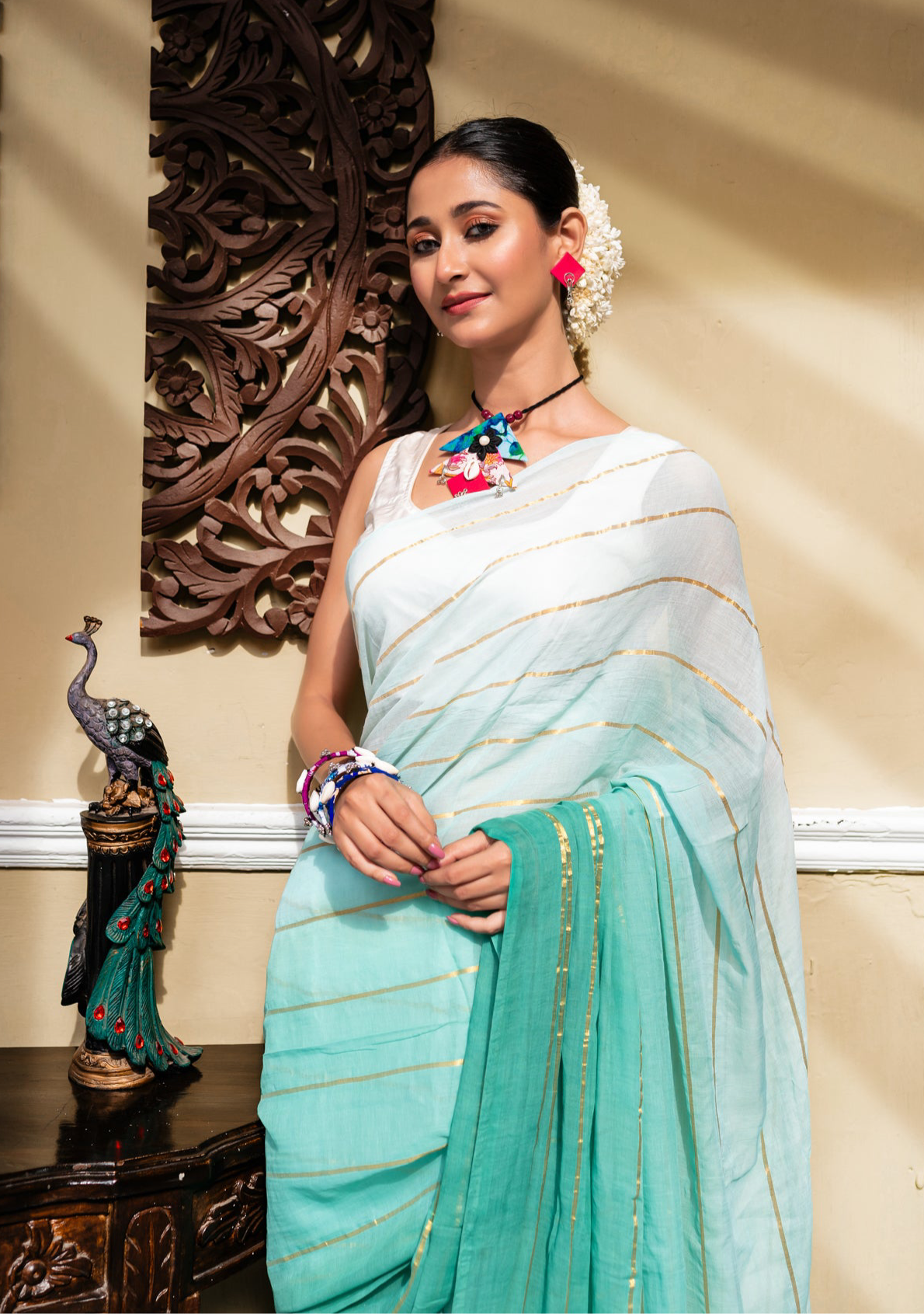 Mul Cotton saree with Zari strips in Green Ombre Tones