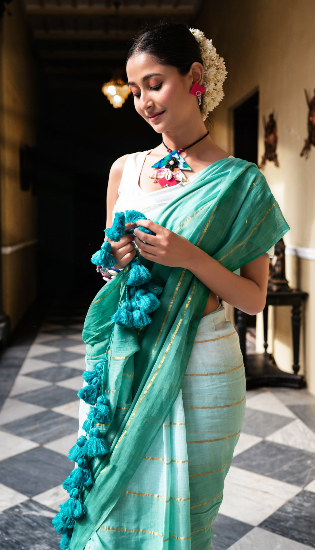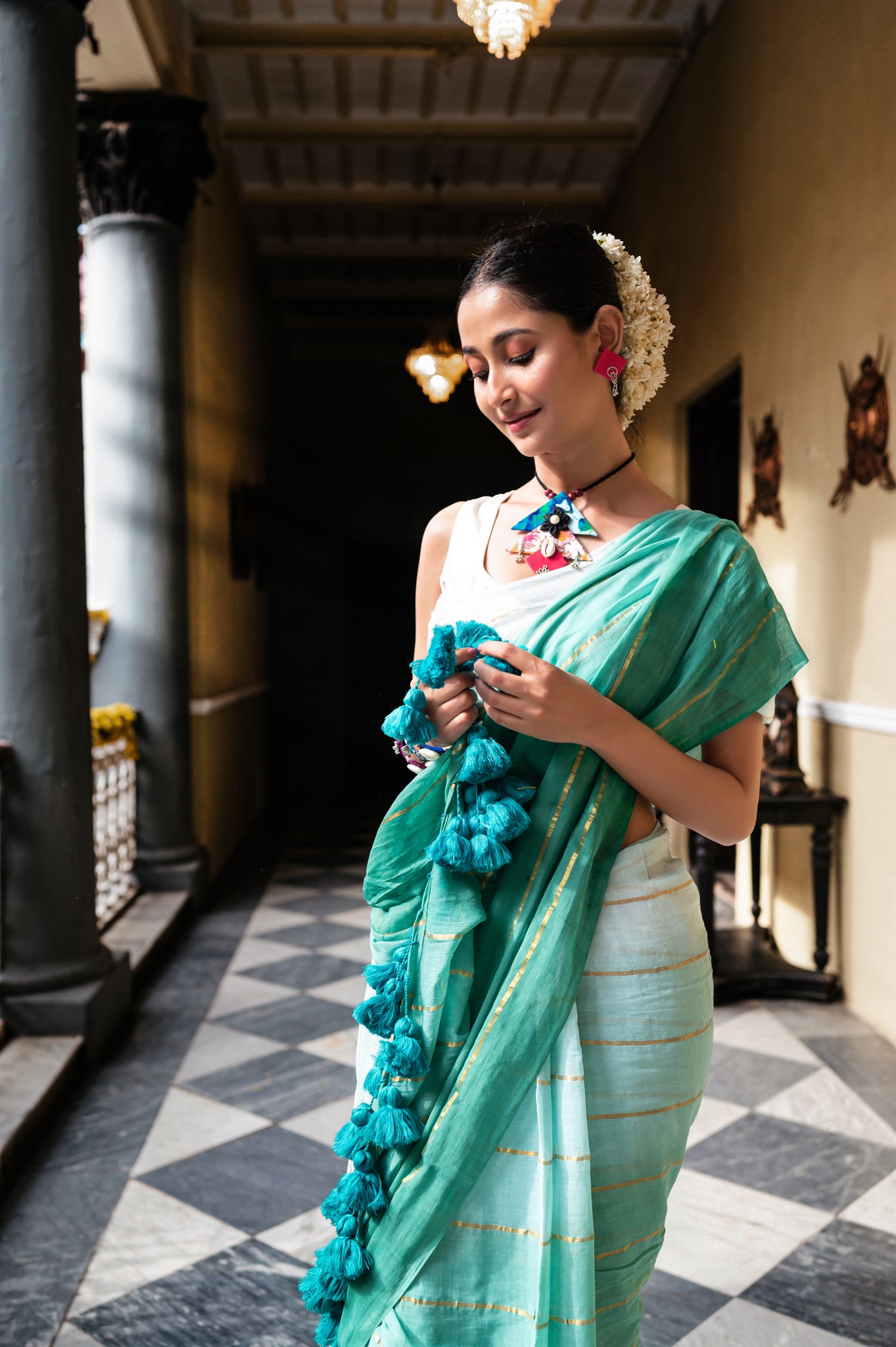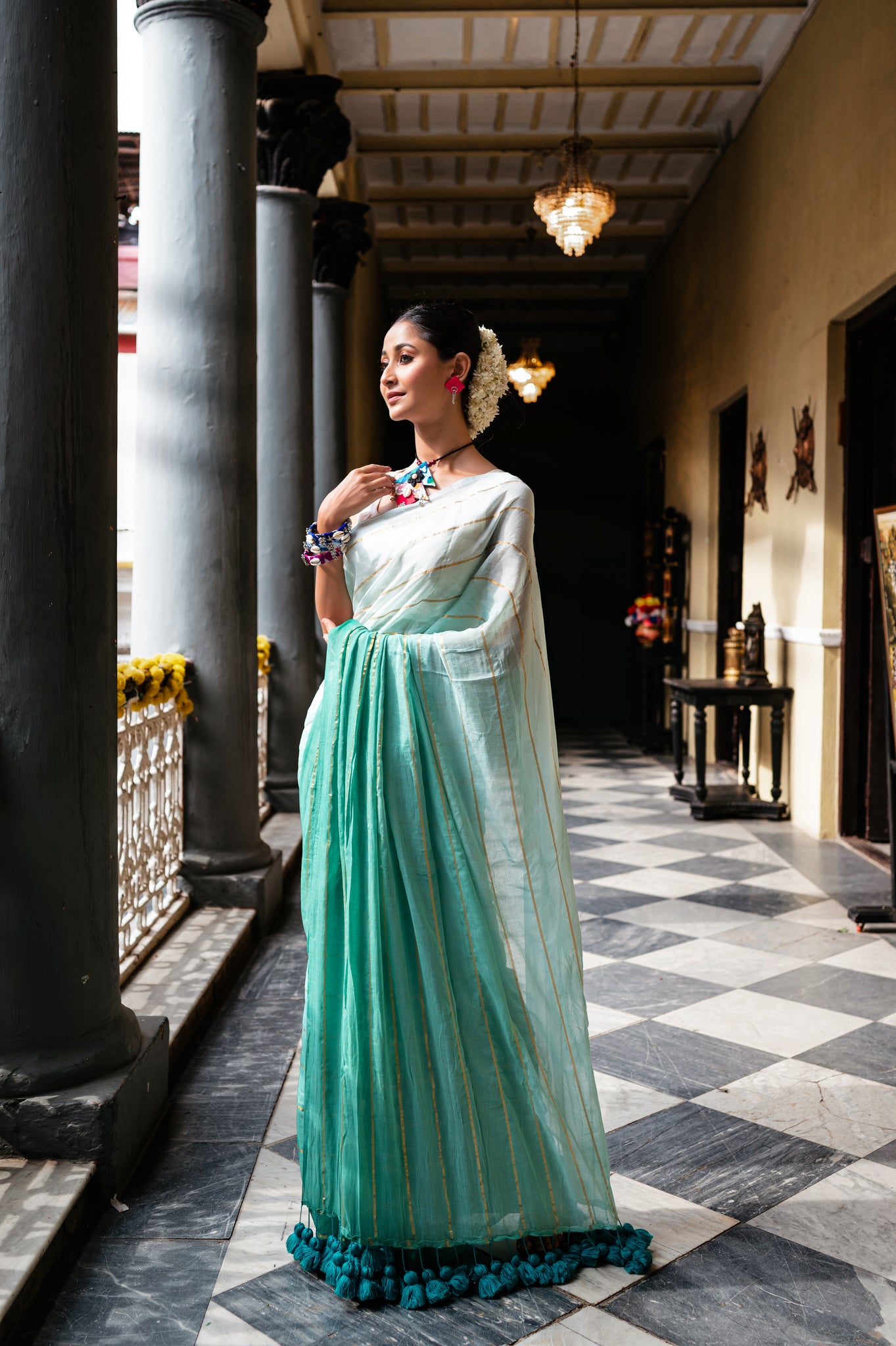 Mul Cotton saree with Zari strips in Green Ombre Tones