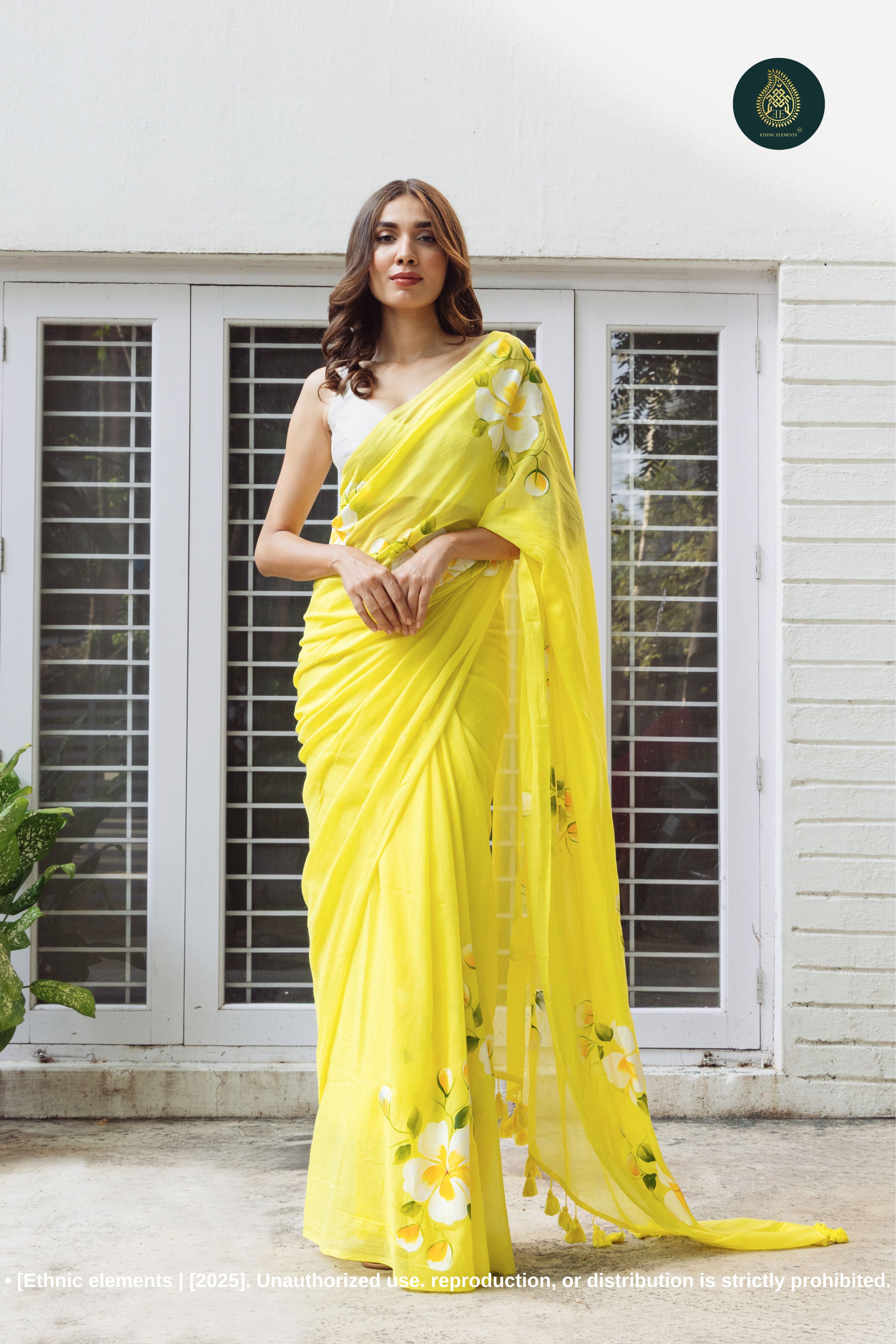 Chitramay - Handpainted Mul Cotton Saree - Butter Lemonade